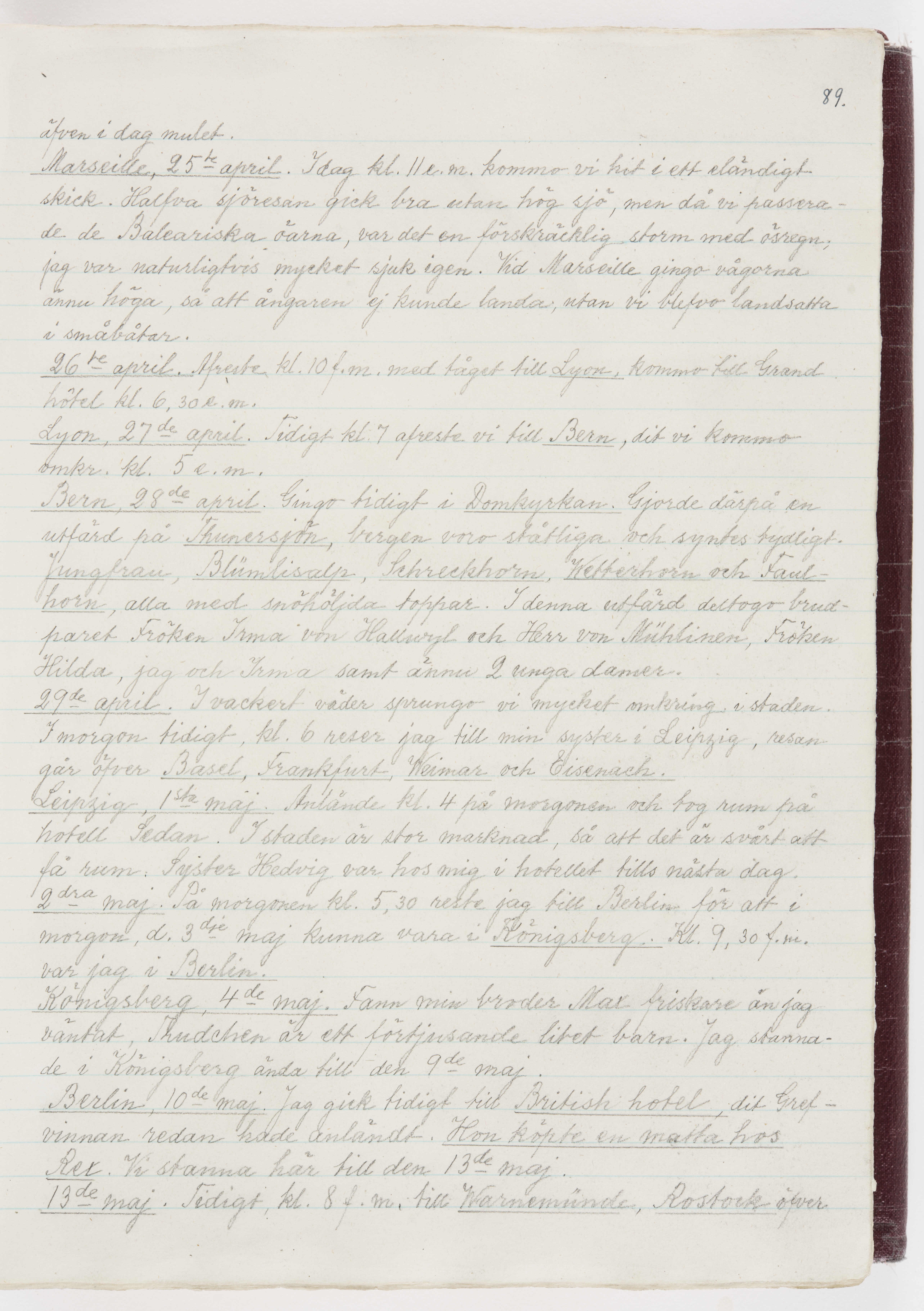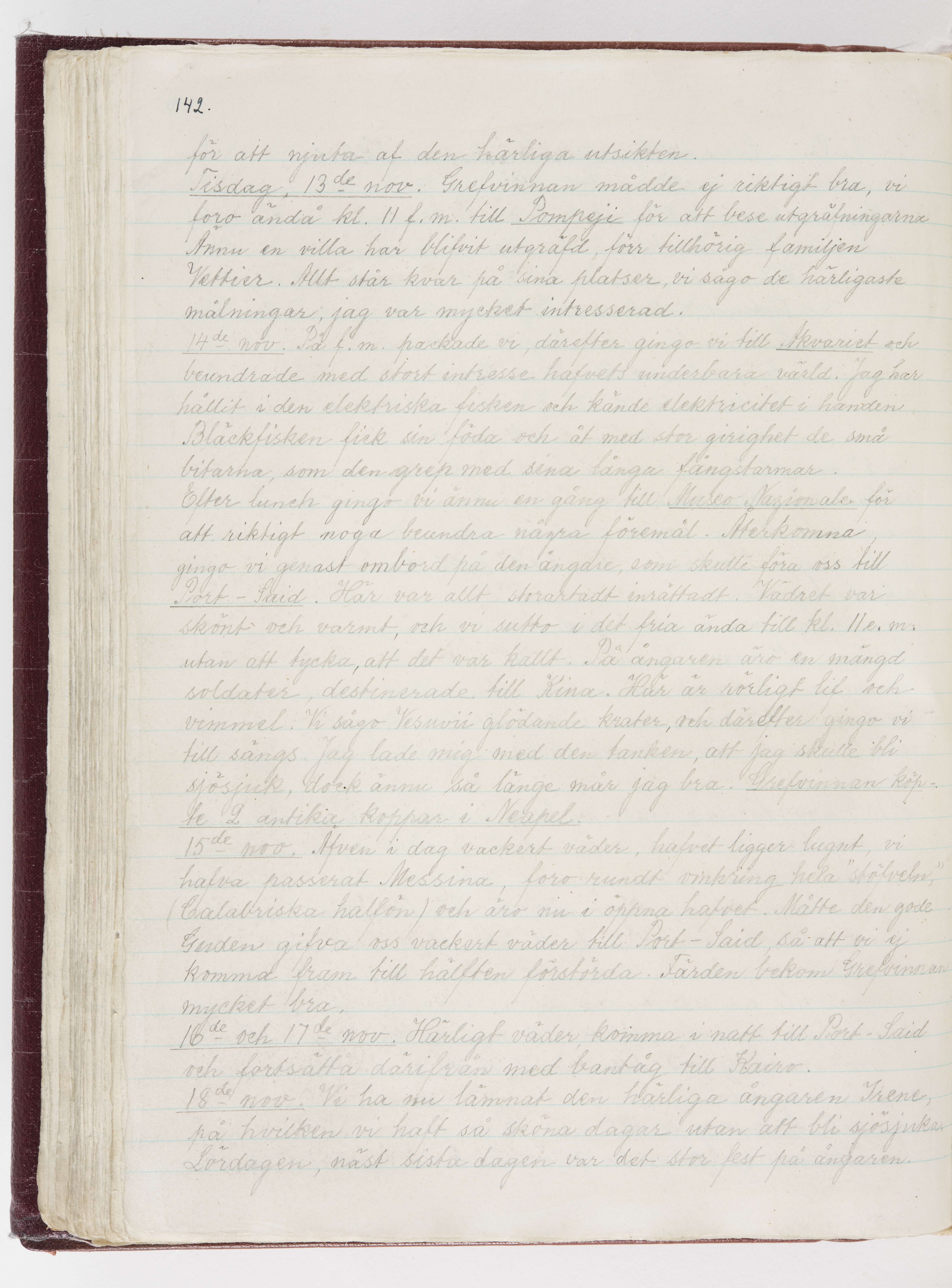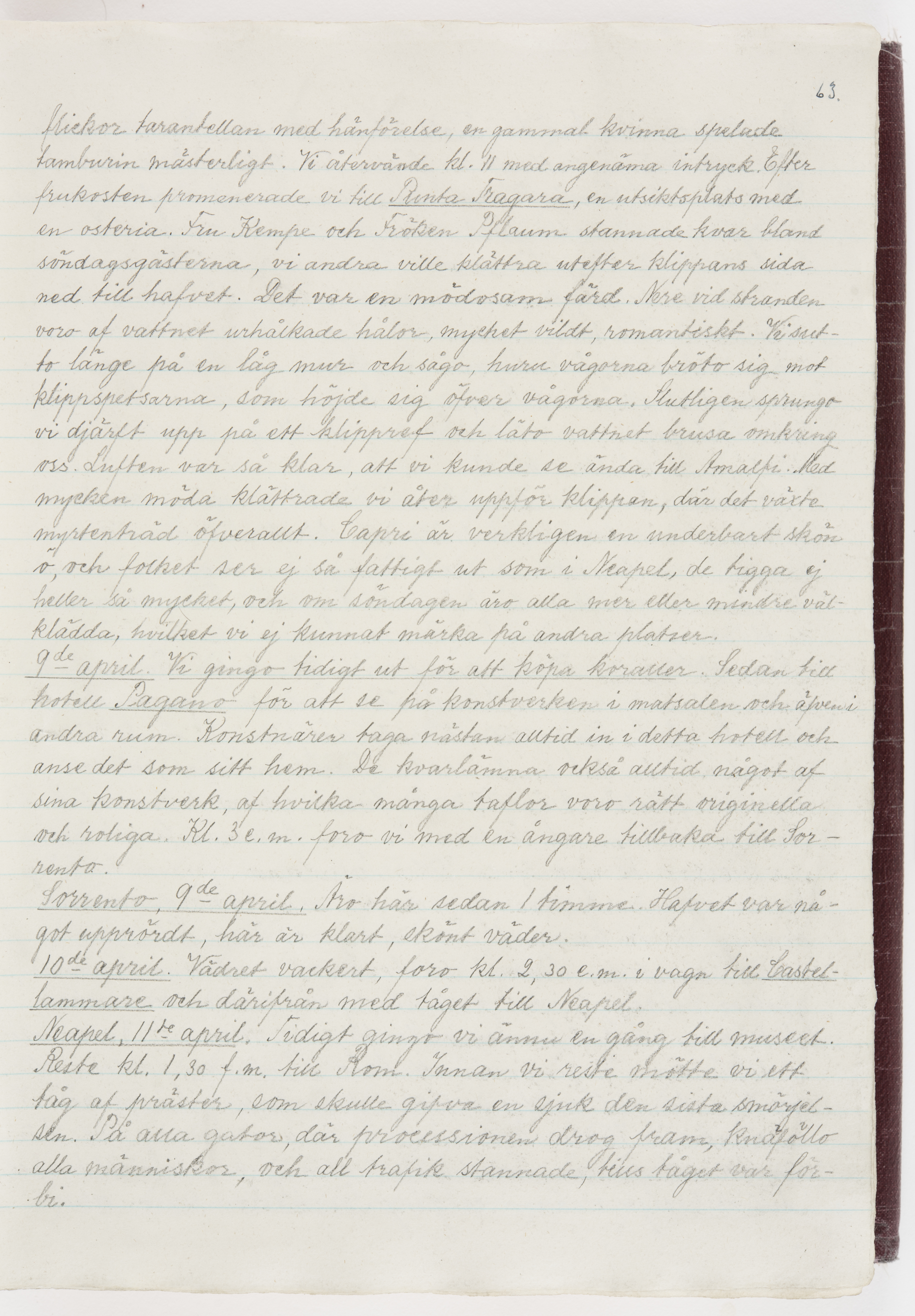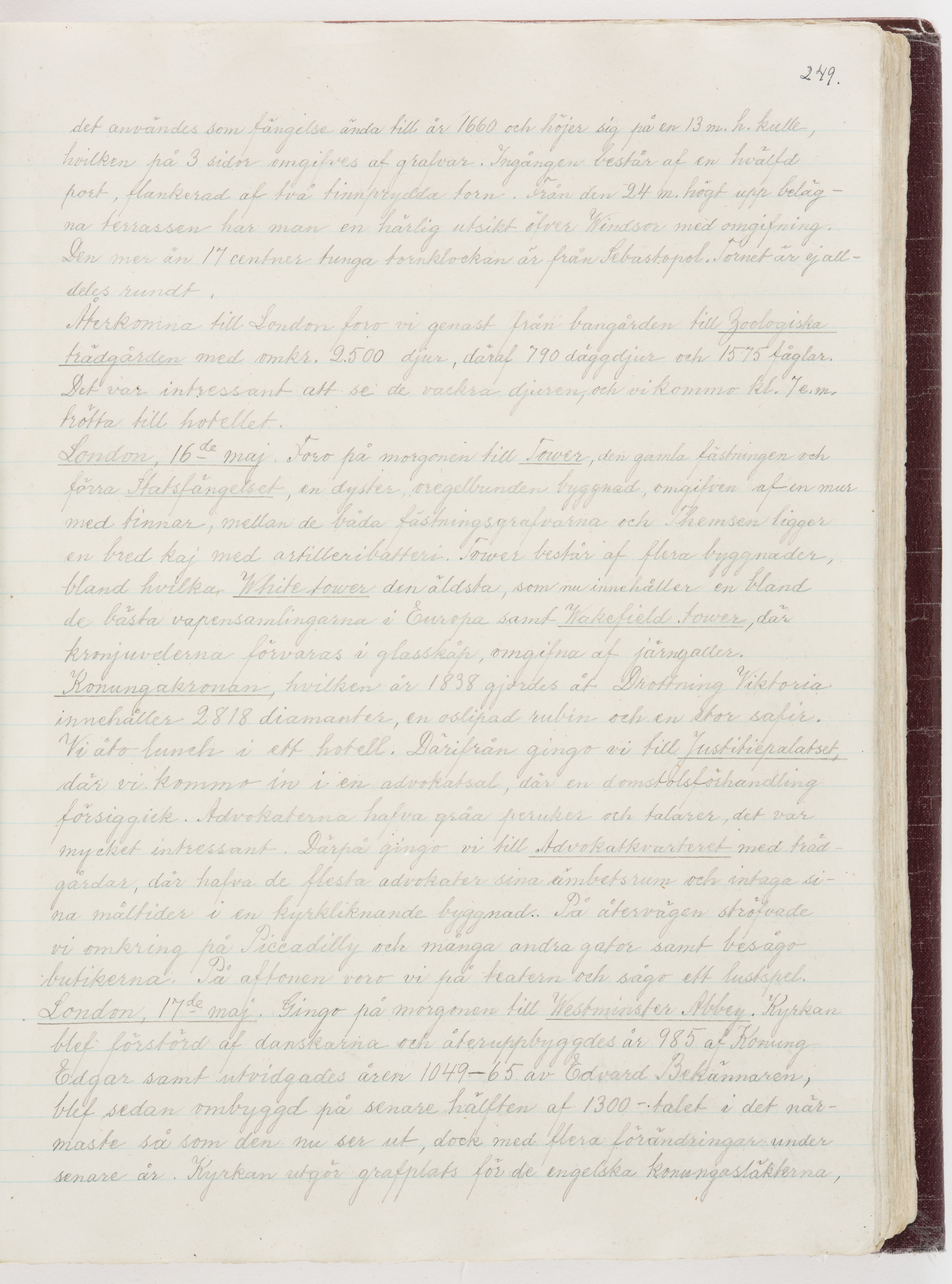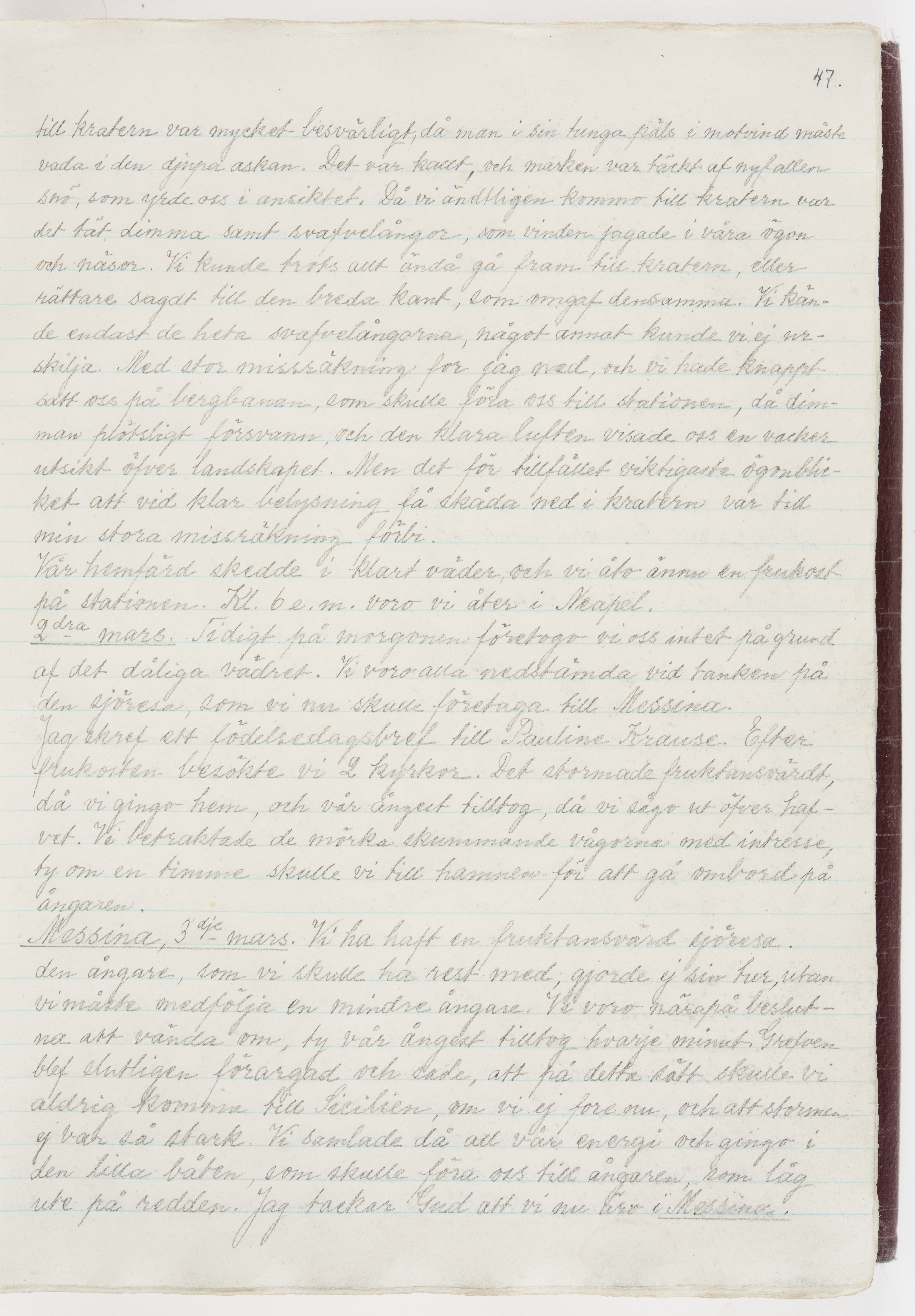 Översättning till svenska språket av dagbok skriven på tyska språket av Ida Uhse under resor tillsammans med Walther och Wilhelmina von Hallwyl åren 1880-1918 samt företeckning över fynd, gåvor och inköpta föremål under resorna åren 1881-1918. Av Signe Berglöf. 309 s. Skrivet med blyerts. Band (helt skinn-). Av brun >>oasis morocco>>, bundet med dubble ansättning och >>knäpprygg>>. Kapitäl av gult sämskskinn. Försättsblad av läderimitationspapper i brunt och svart. Fals av röd klot. 32*25*4,8 cm. Bundet av bokbindaren Otto Olsson.