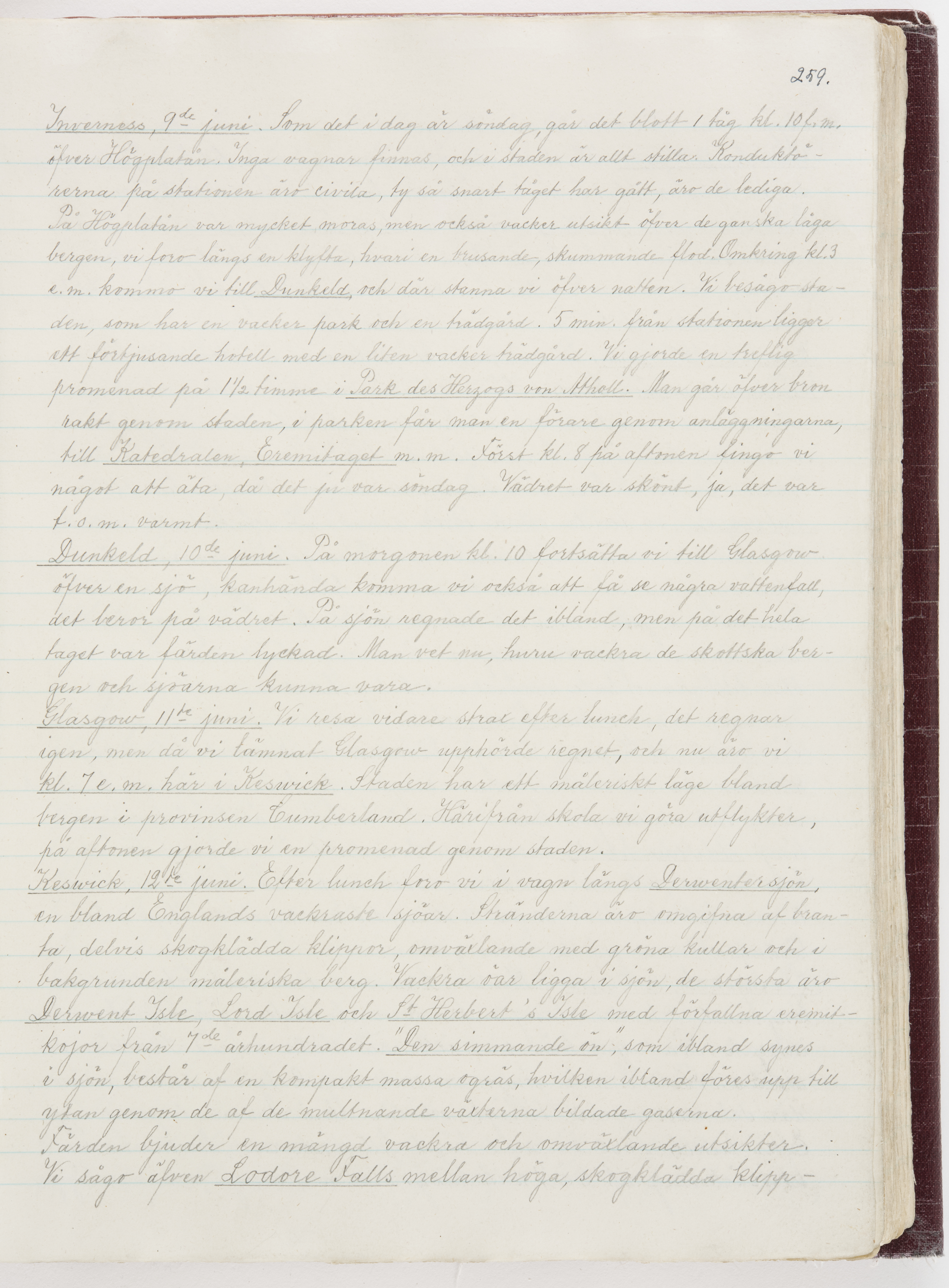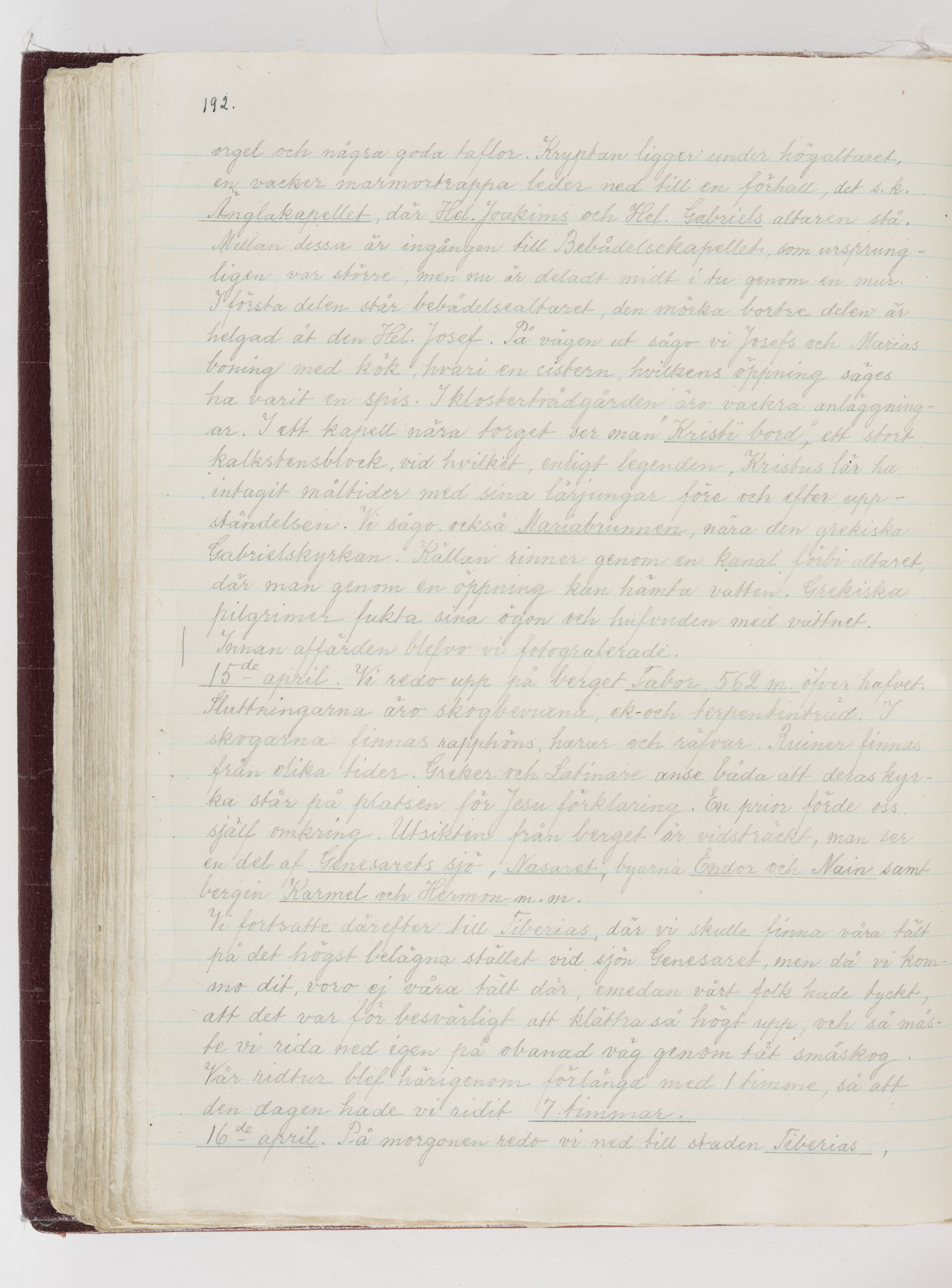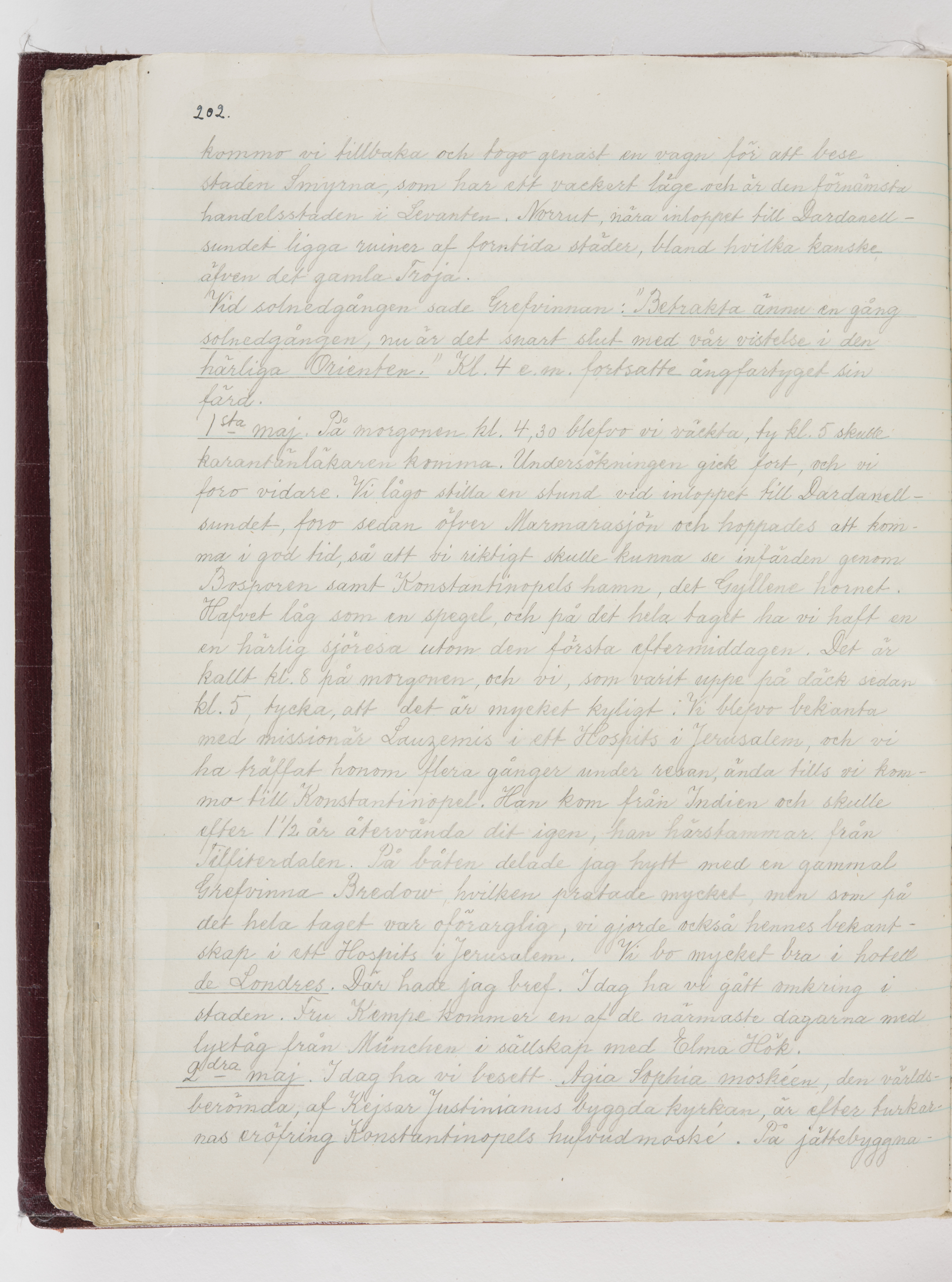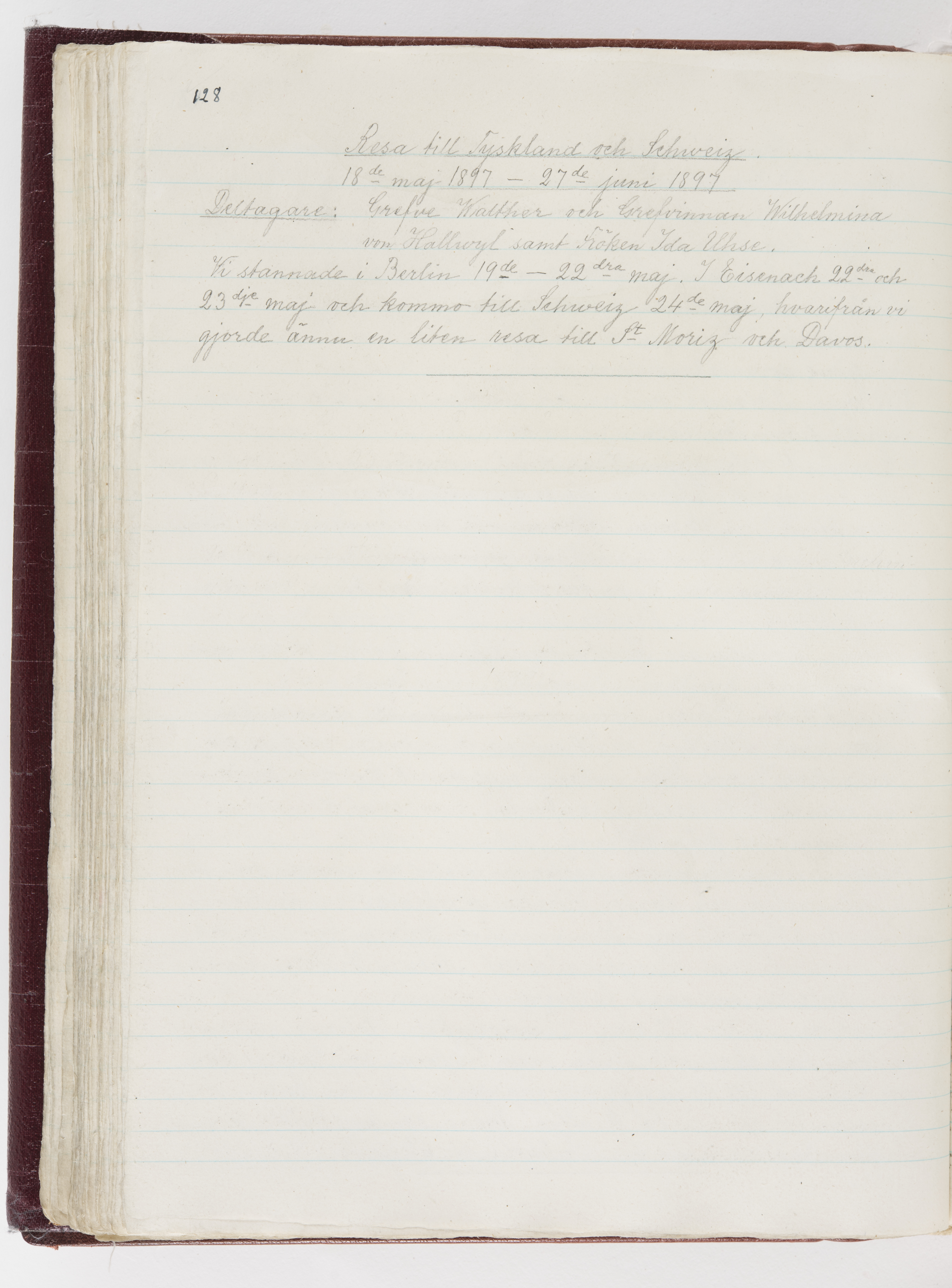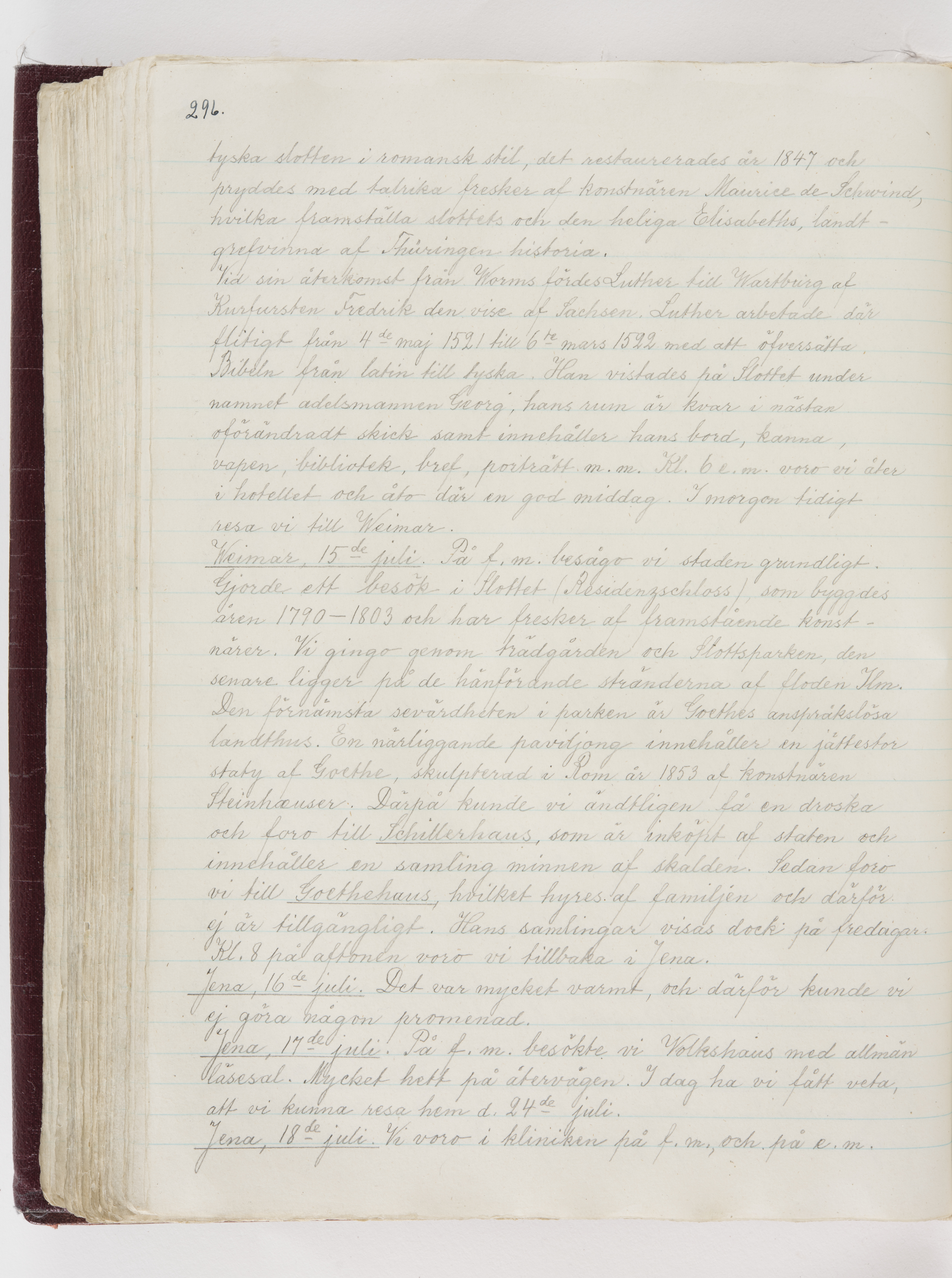 Översättning till svenska språket av dagbok skriven på tyska språket av Ida Uhse under resor tillsammans med Walther och Wilhelmina von Hallwyl åren 1880-1918 samt företeckning över fynd, gåvor och inköpta föremål under resorna åren 1881-1918. Av Signe Berglöf. 309 s. Skrivet med blyerts. Band (helt skinn-). Av brun >>oasis morocco>>, bundet med dubble ansättning och >>knäpprygg>>. Kapitäl av gult sämskskinn. Försättsblad av läderimitationspapper i brunt och svart. Fals av röd klot. 32*25*4,8 cm. Bundet av bokbindaren Otto Olsson.