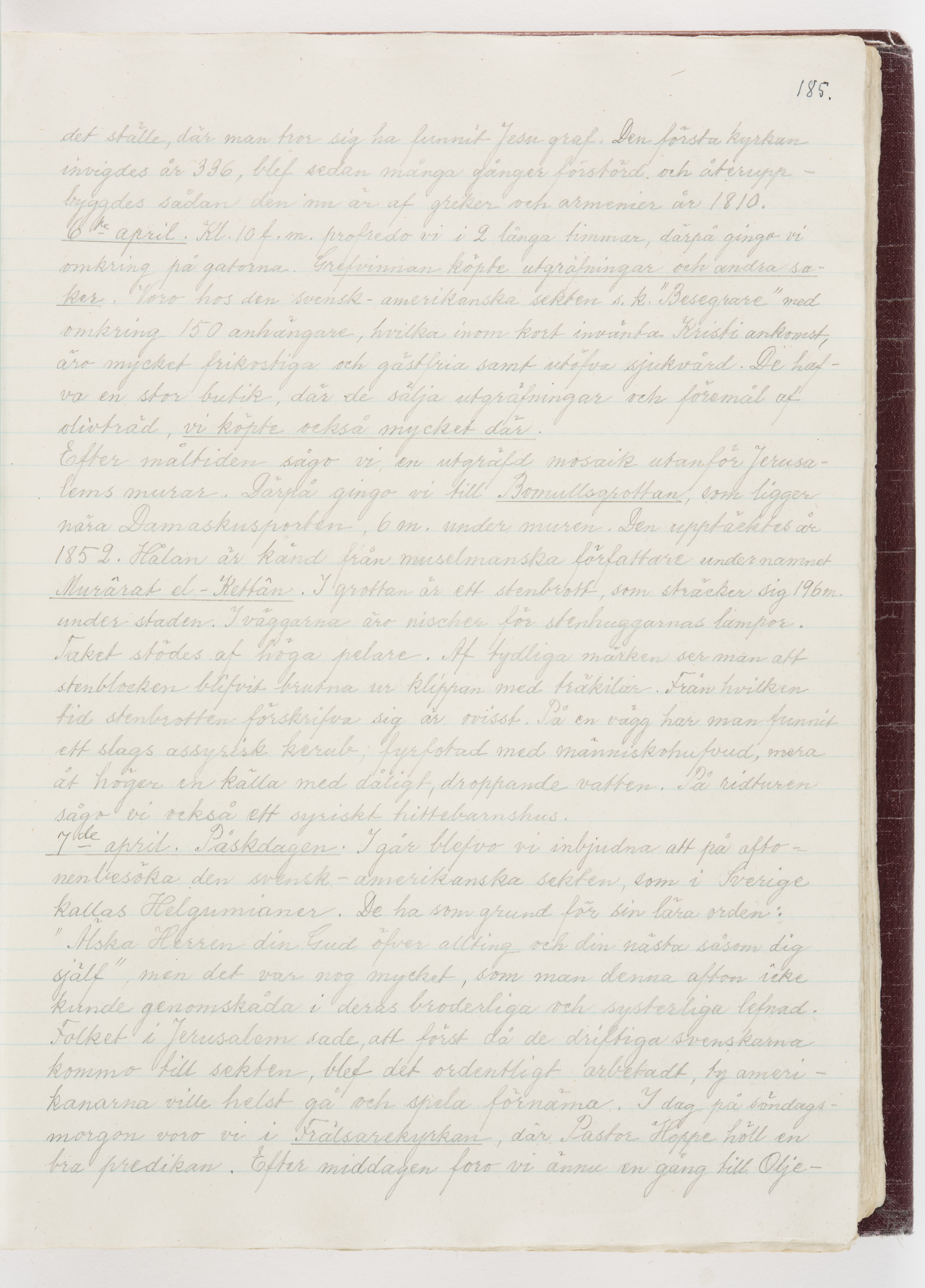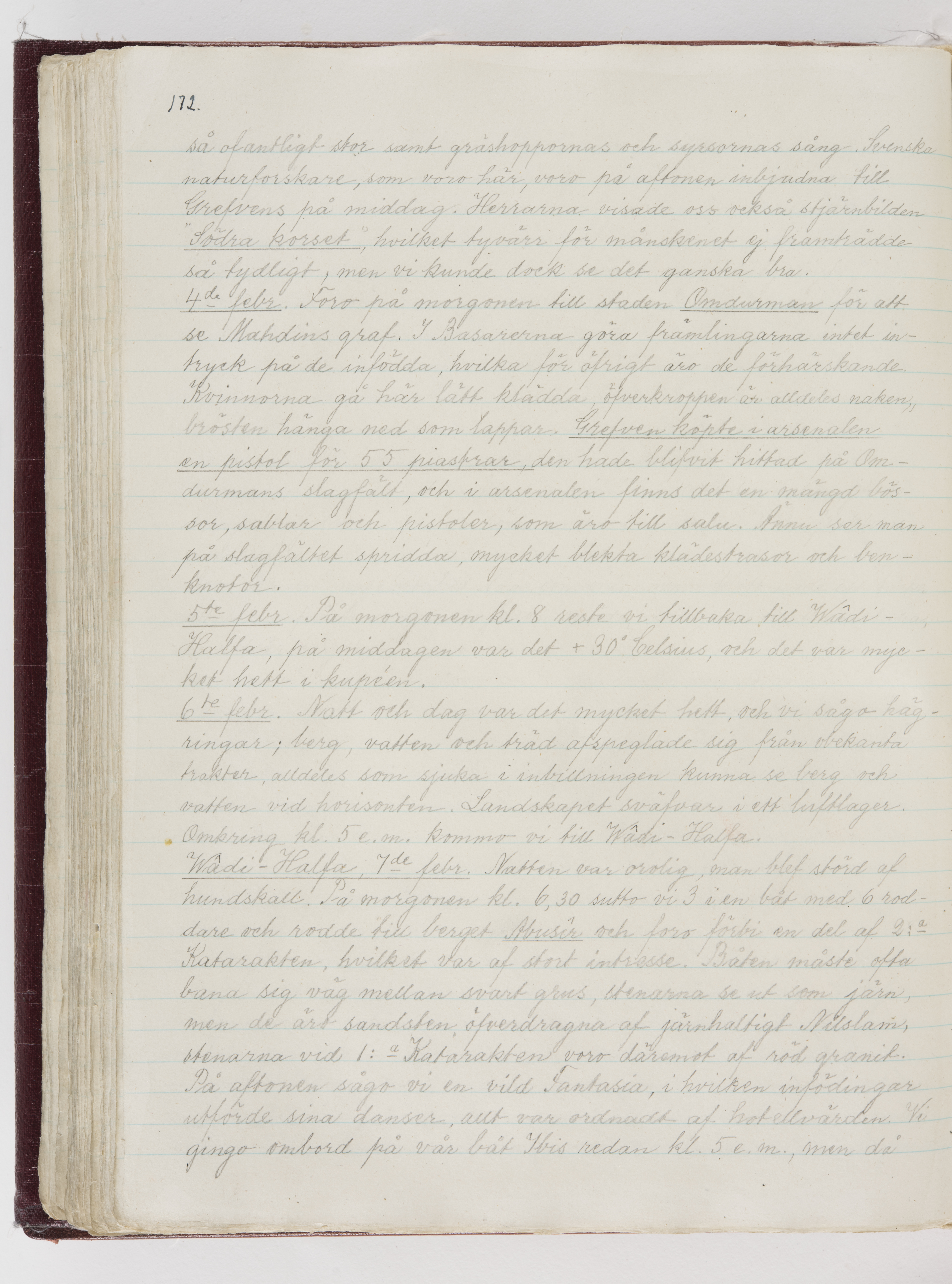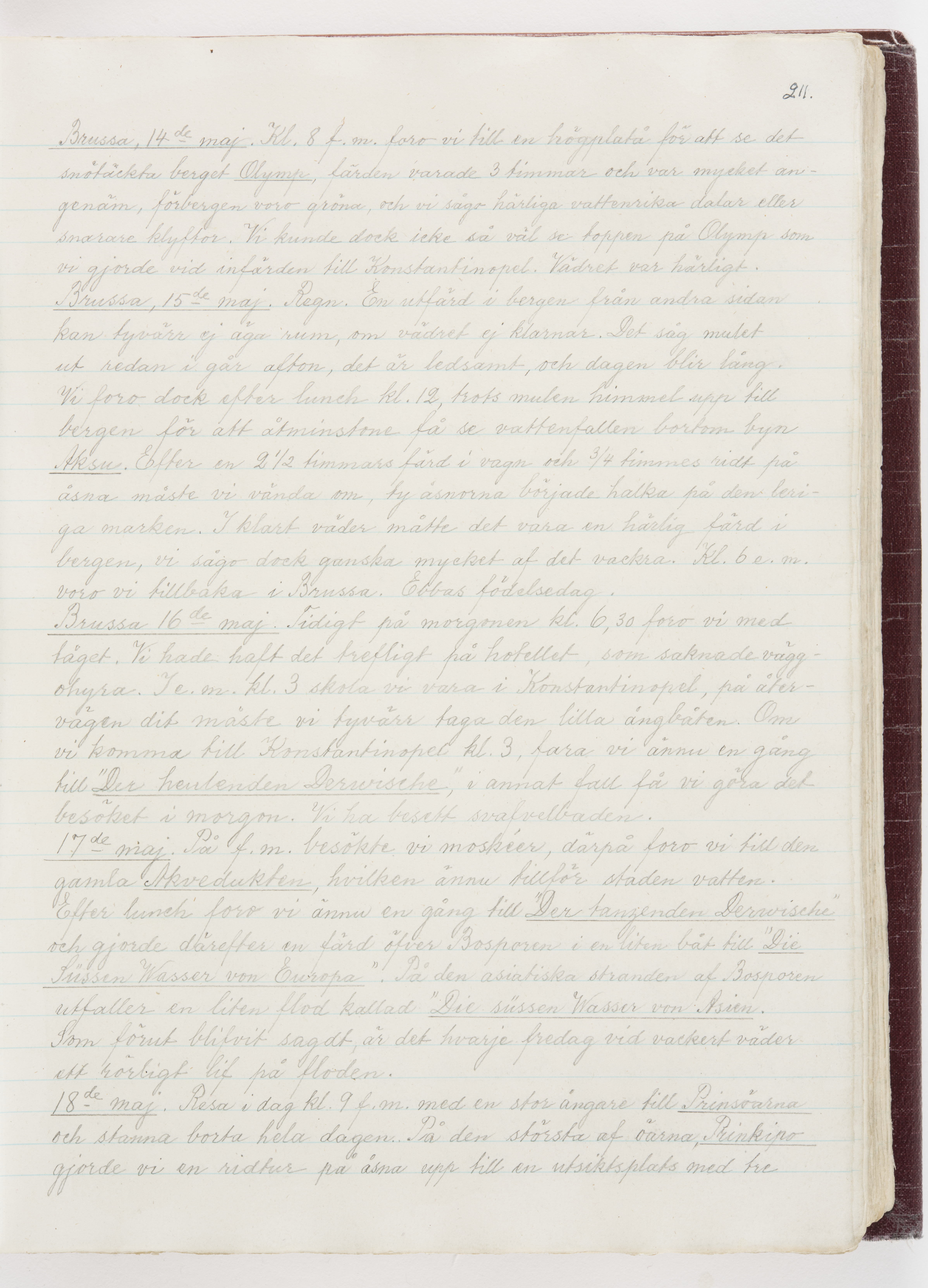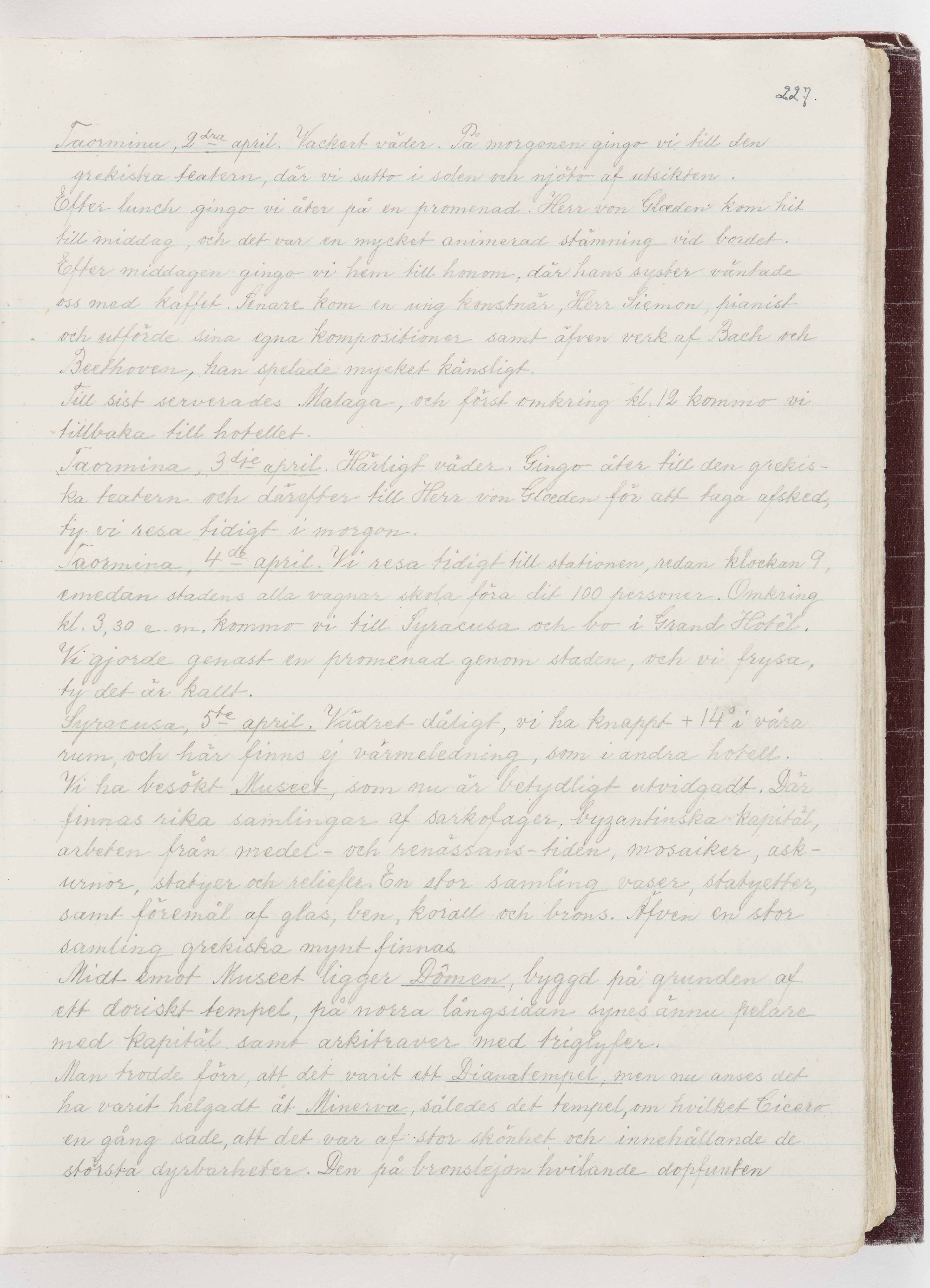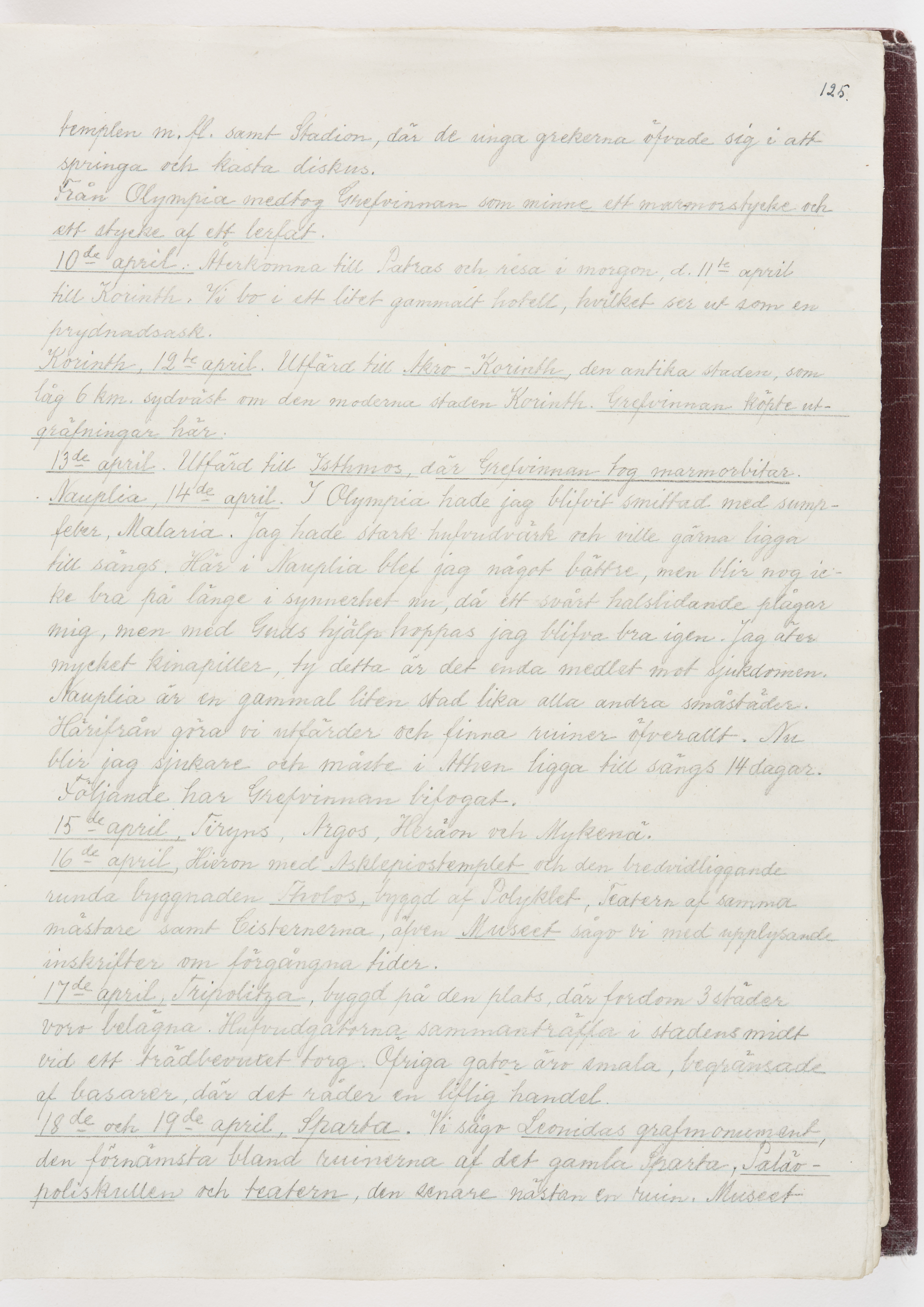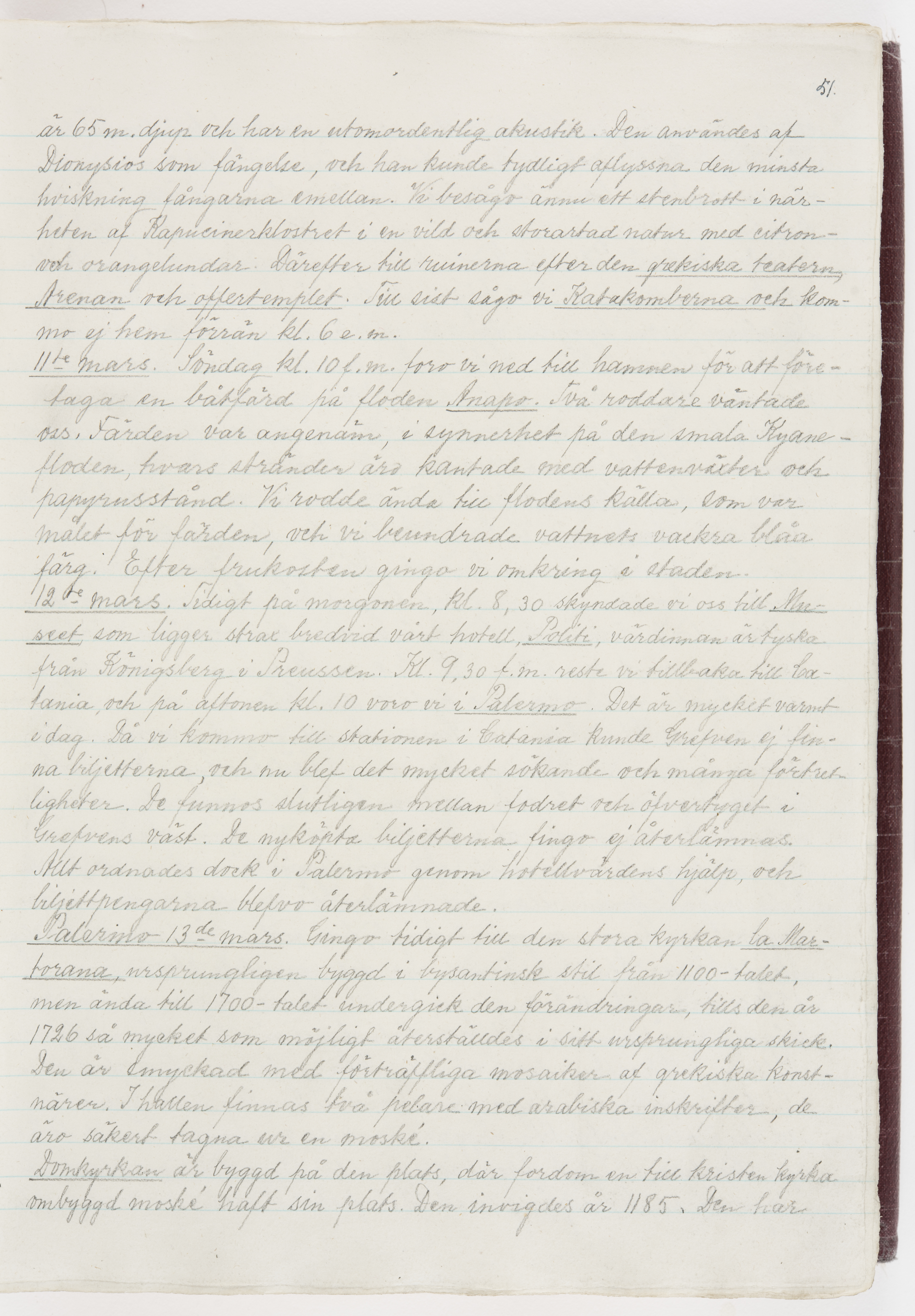 Översättning till svenska språket av dagbok skriven på tyska språket av Ida Uhse under resor tillsammans med Walther och Wilhelmina von Hallwyl åren 1880-1918 samt företeckning över fynd, gåvor och inköpta föremål under resorna åren 1881-1918. Av Signe Berglöf. 309 s. Skrivet med blyerts. Band (helt skinn-). Av brun >>oasis morocco>>, bundet med dubble ansättning och >>knäpprygg>>. Kapitäl av gult sämskskinn. Försättsblad av läderimitationspapper i brunt och svart. Fals av röd klot. 32*25*4,8 cm. Bundet av bokbindaren Otto Olsson.
