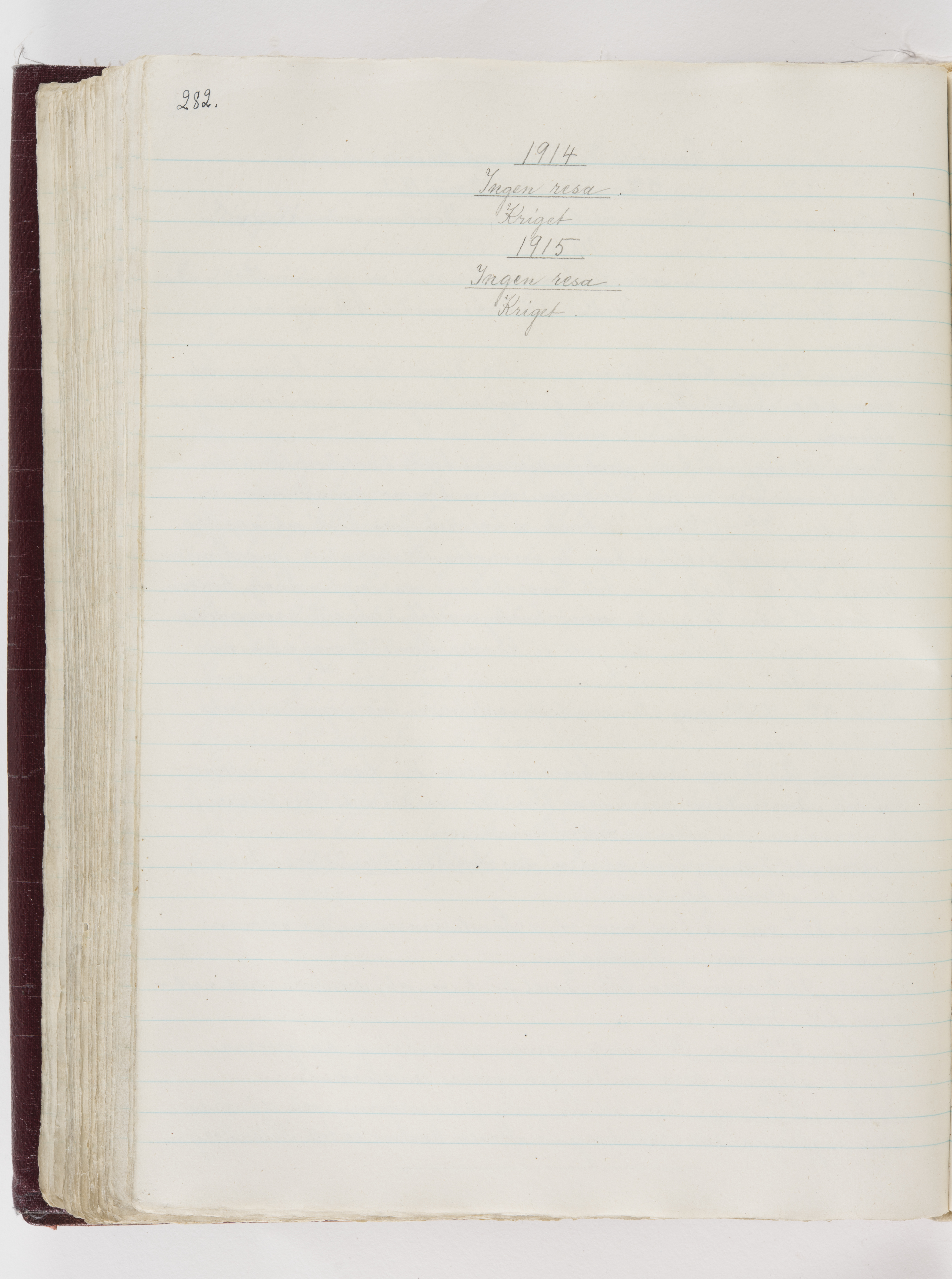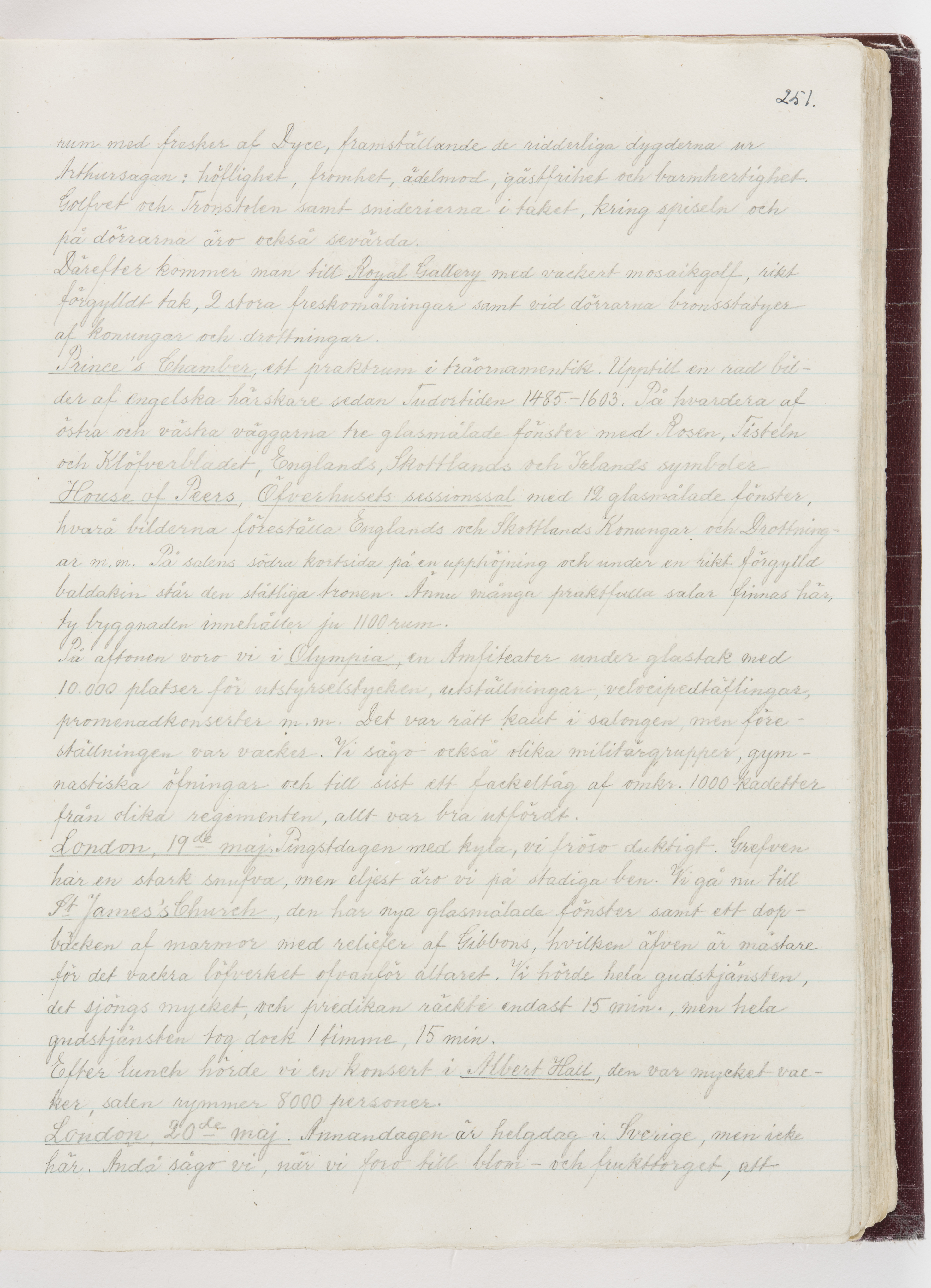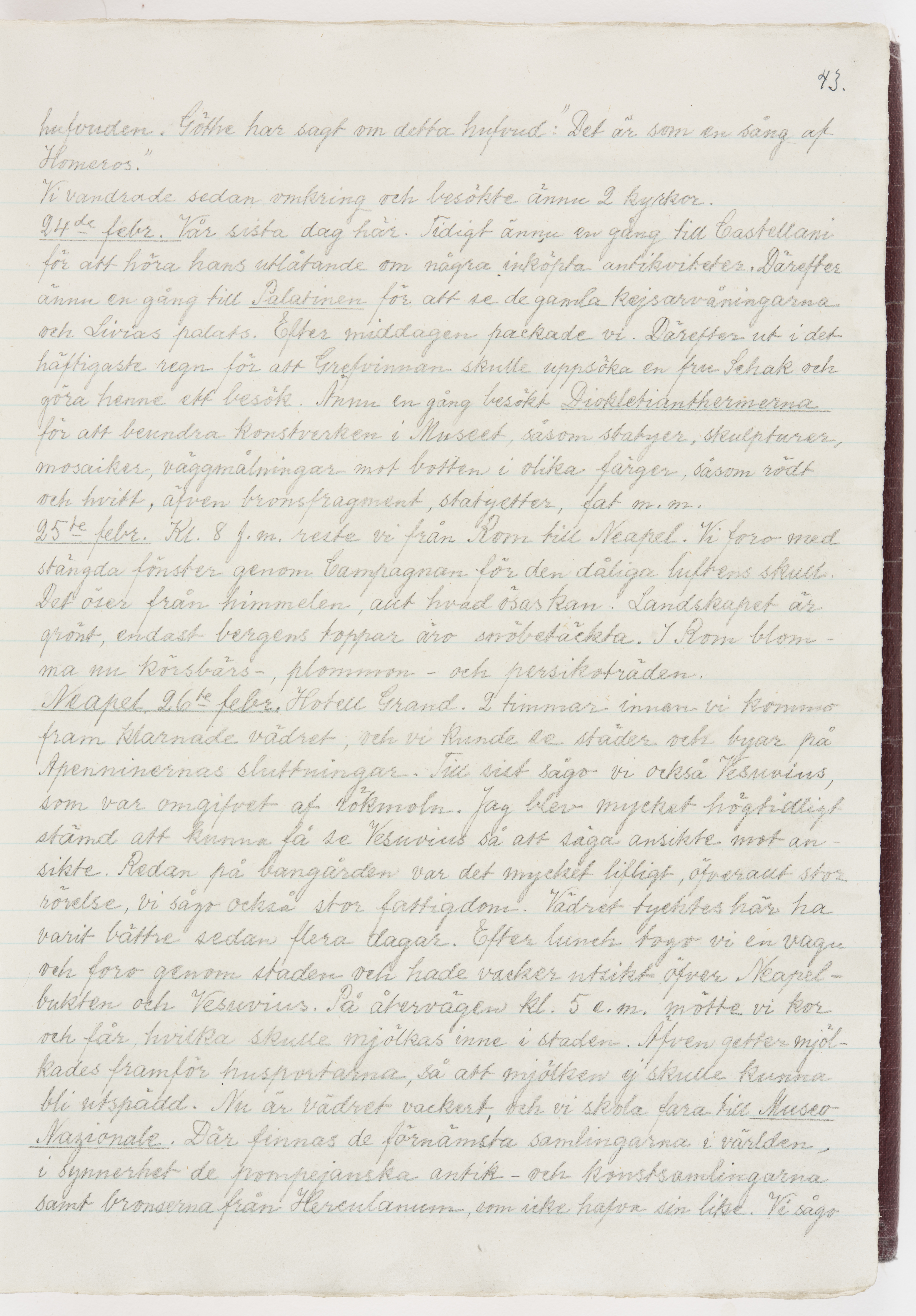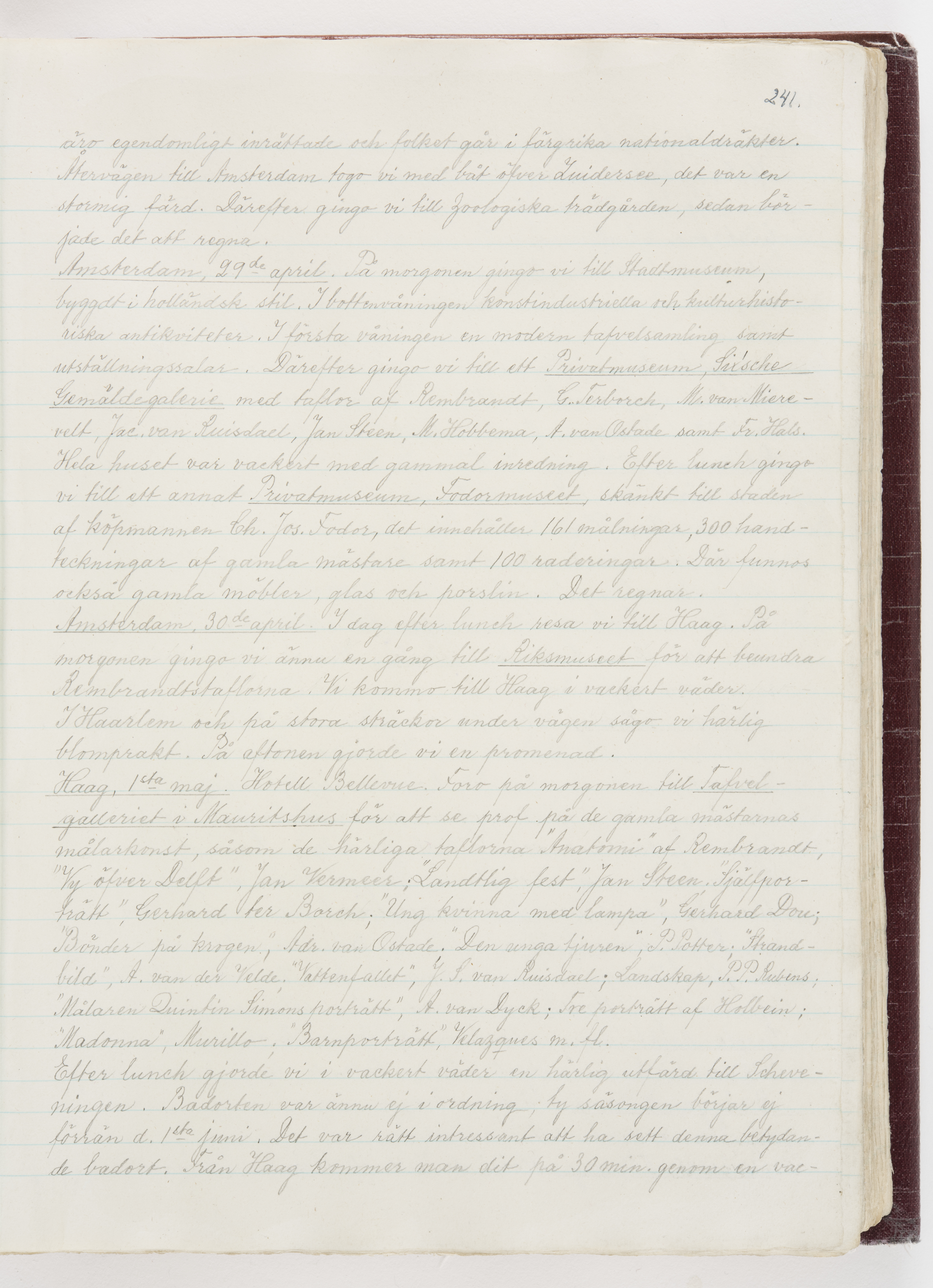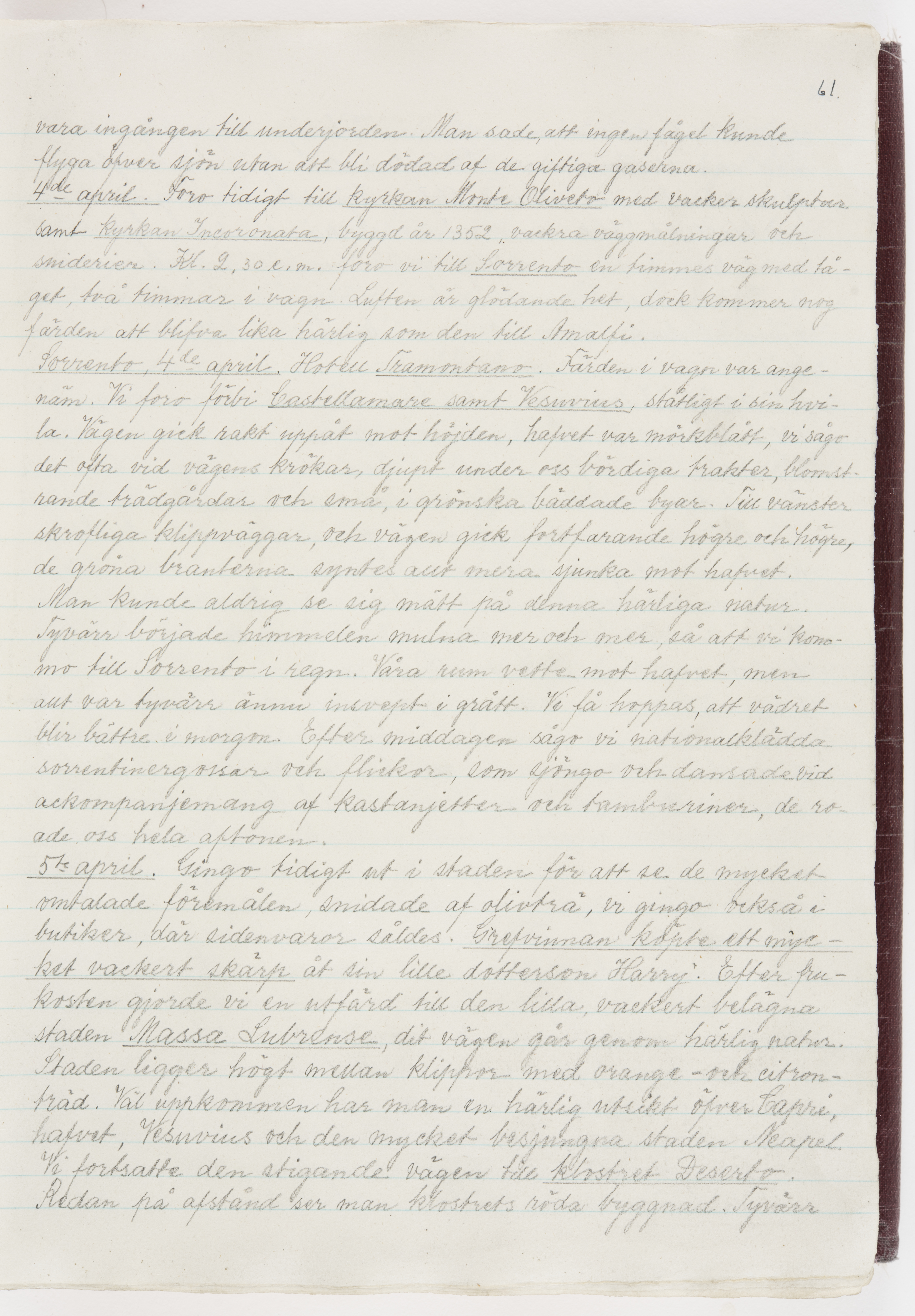 Översättning till svenska språket av dagbok skriven på tyska språket av Ida Uhse under resor tillsammans med Walther och Wilhelmina von Hallwyl åren 1880-1918 samt företeckning över fynd, gåvor och inköpta föremål under resorna åren 1881-1918. Av Signe Berglöf. 309 s. Skrivet med blyerts. Band (helt skinn-). Av brun >>oasis morocco>>, bundet med dubble ansättning och >>knäpprygg>>. Kapitäl av gult sämskskinn. Försättsblad av läderimitationspapper i brunt och svart. Fals av röd klot. 32*25*4,8 cm. Bundet av bokbindaren Otto Olsson.