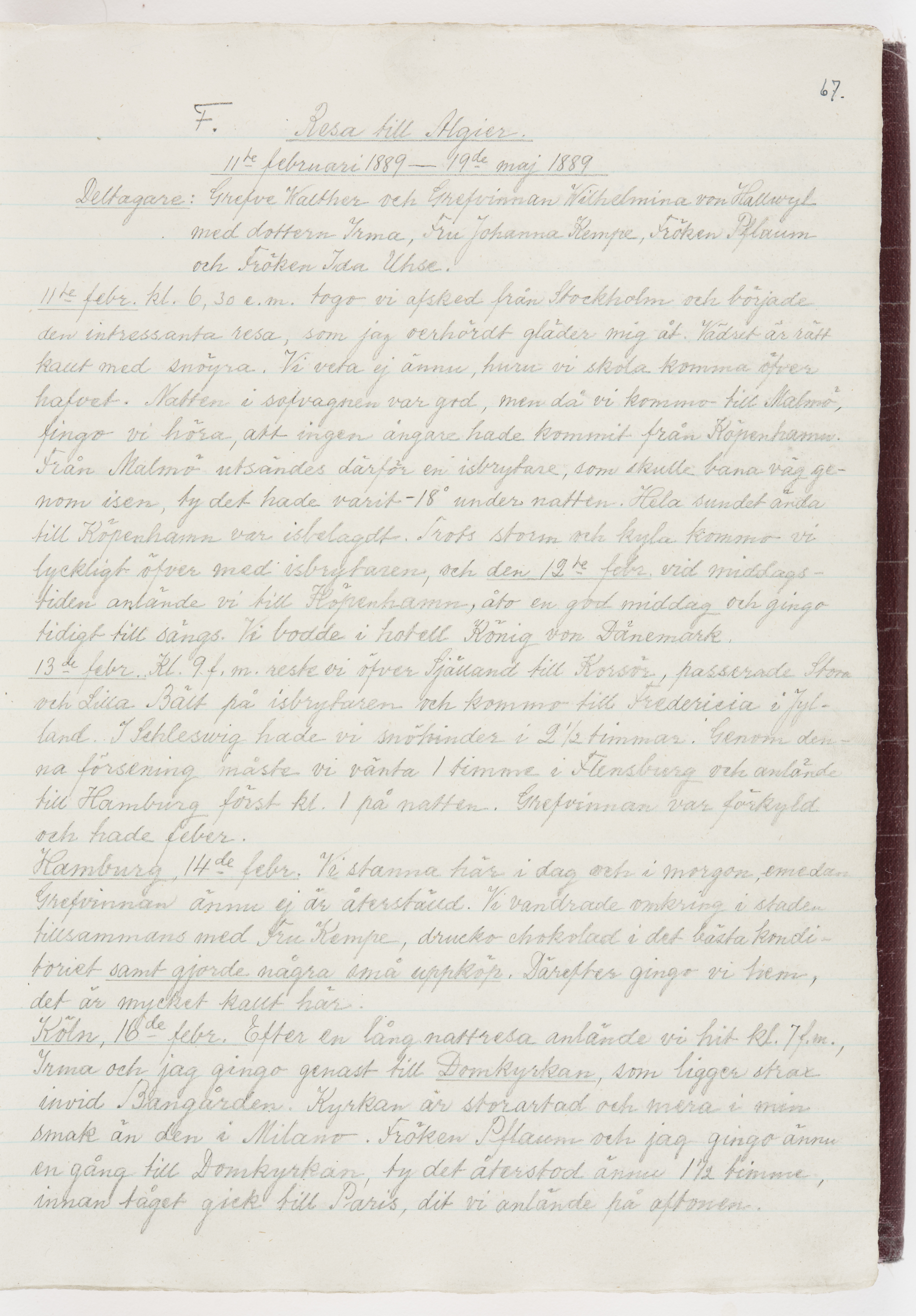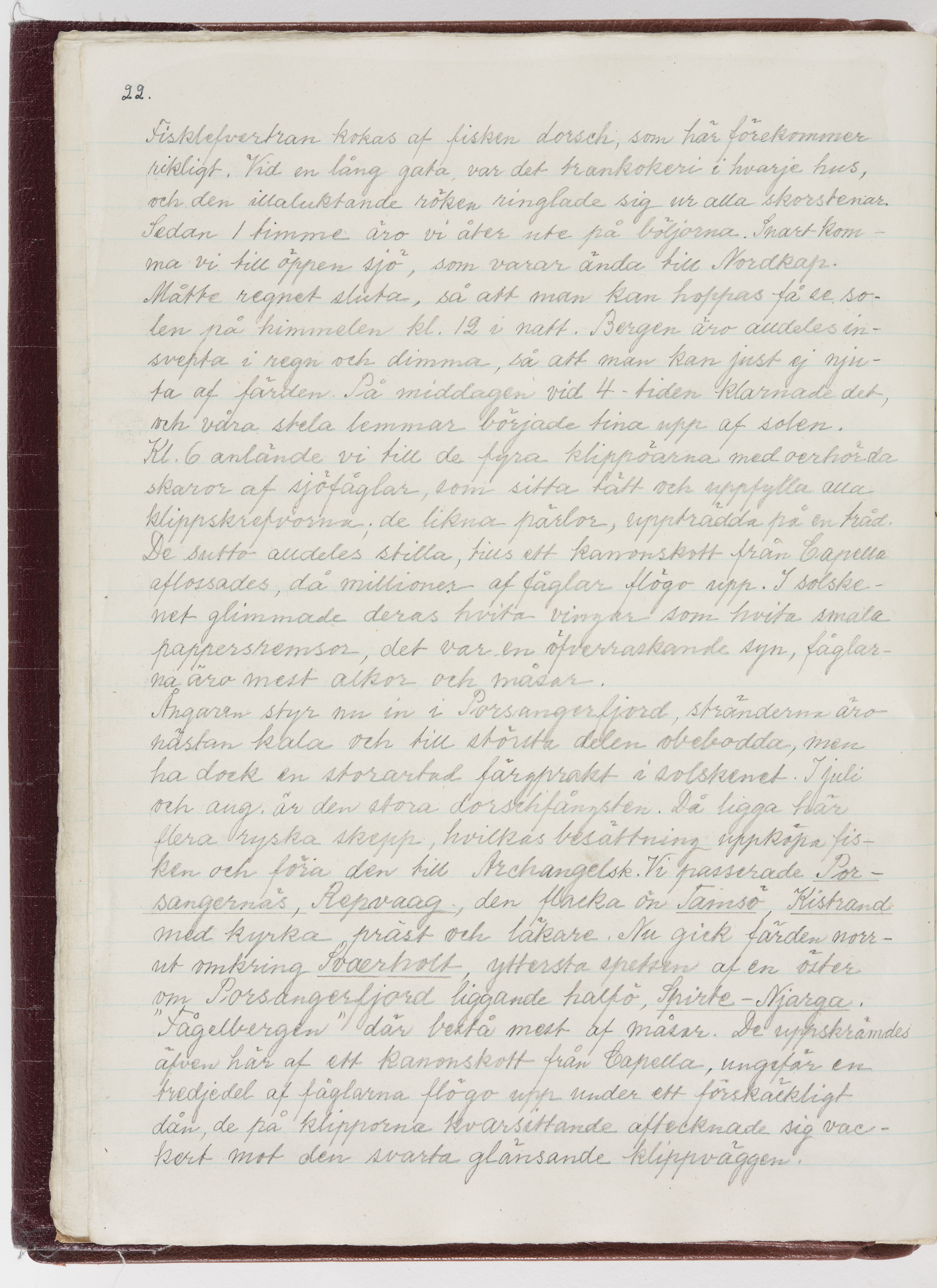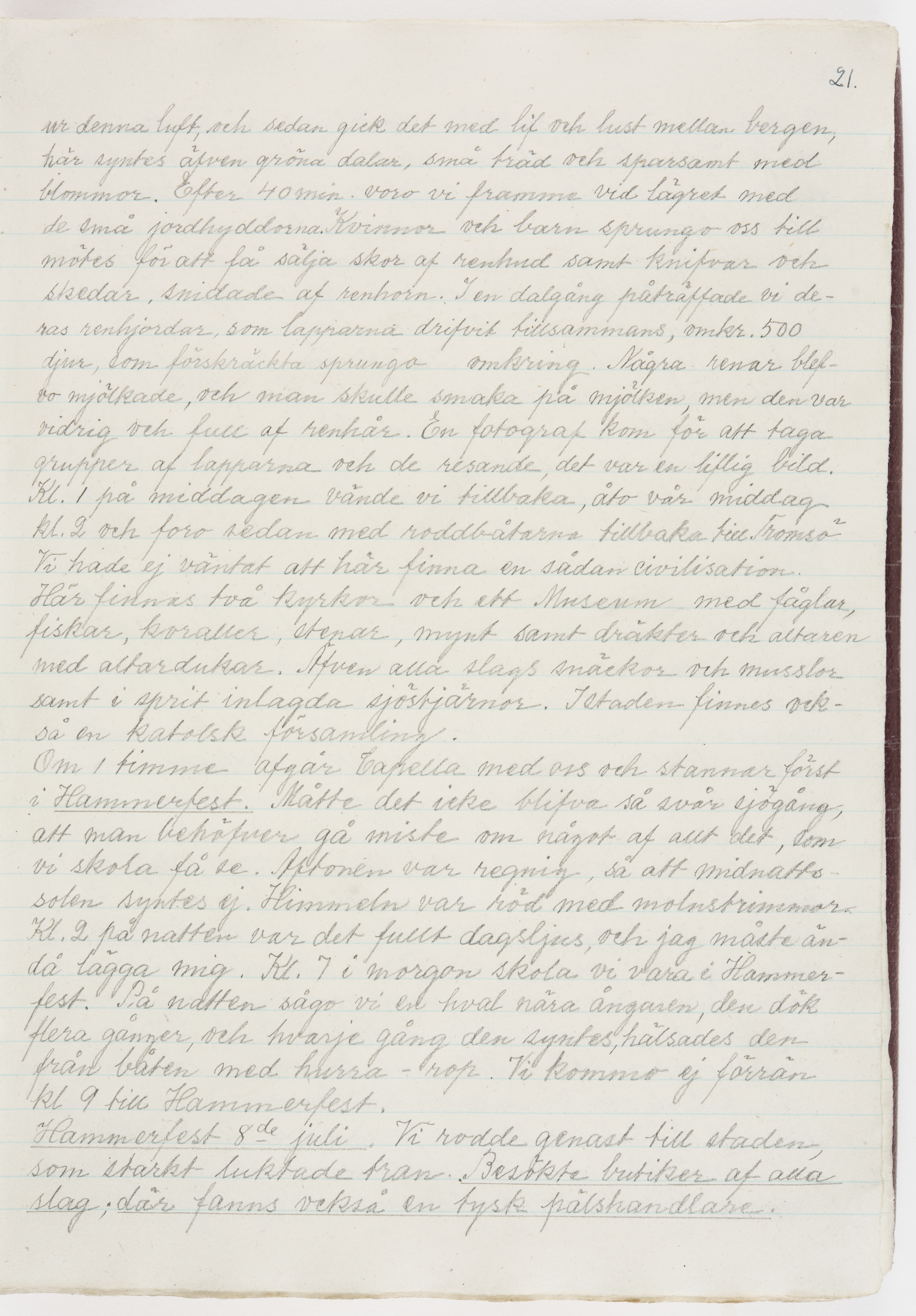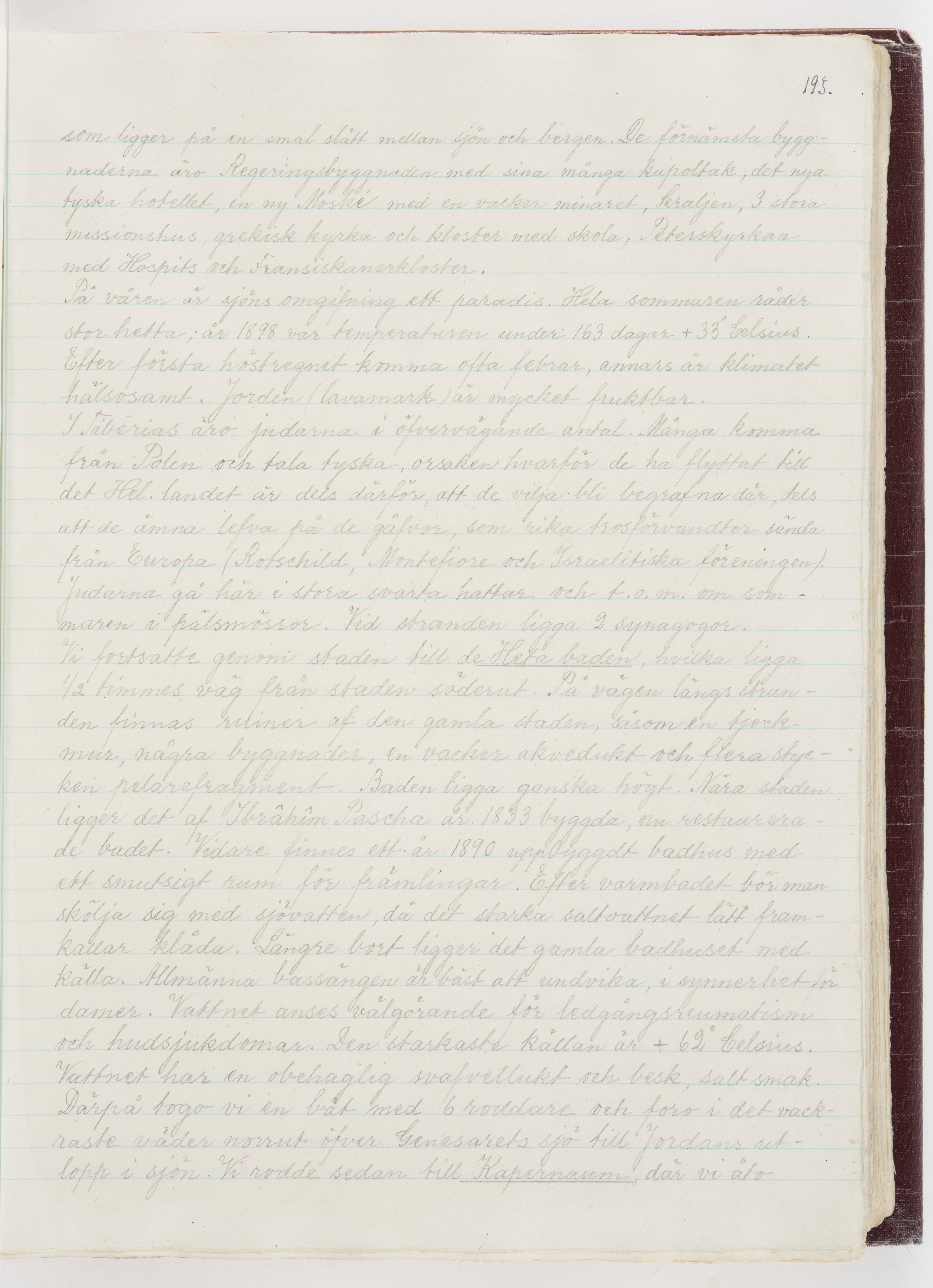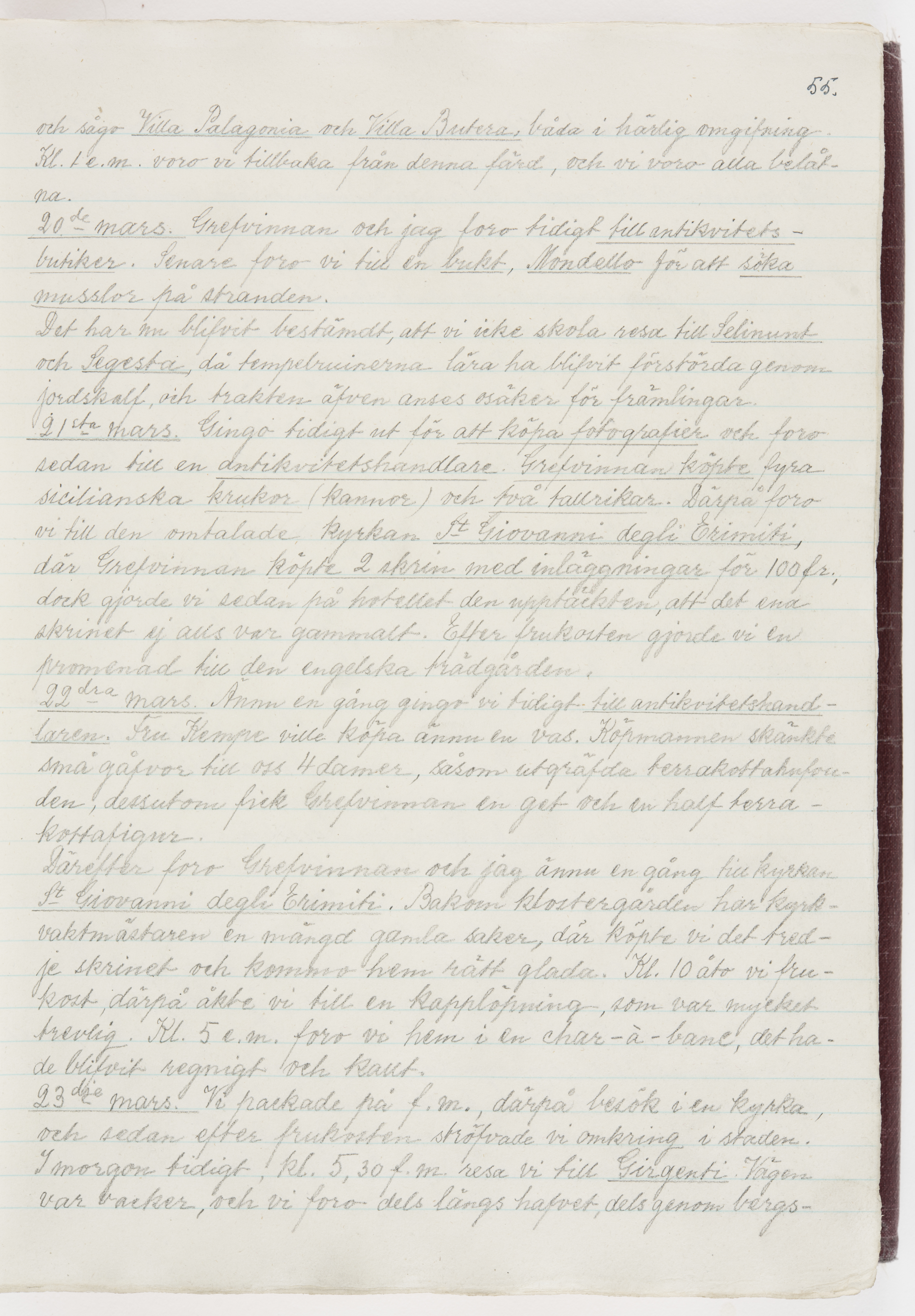 Översättning till svenska språket av dagbok skriven på tyska språket av Ida Uhse under resor tillsammans med Walther och Wilhelmina von Hallwyl åren 1880-1918 samt företeckning över fynd, gåvor och inköpta föremål under resorna åren 1881-1918. Av Signe Berglöf. 309 s. Skrivet med blyerts. Band (helt skinn-). Av brun >>oasis morocco>>, bundet med dubble ansättning och >>knäpprygg>>. Kapitäl av gult sämskskinn. Försättsblad av läderimitationspapper i brunt och svart. Fals av röd klot. 32*25*4,8 cm. Bundet av bokbindaren Otto Olsson.
