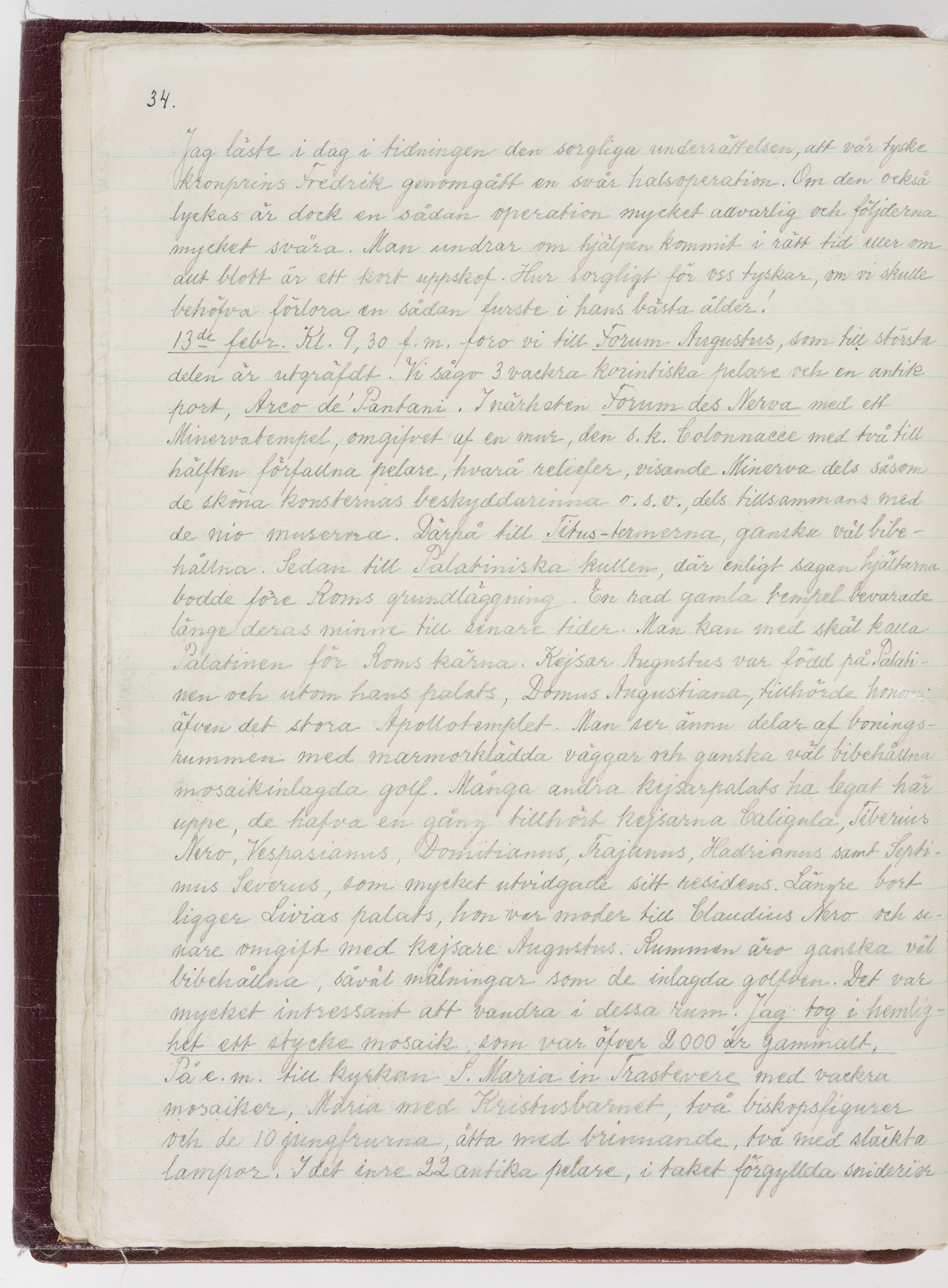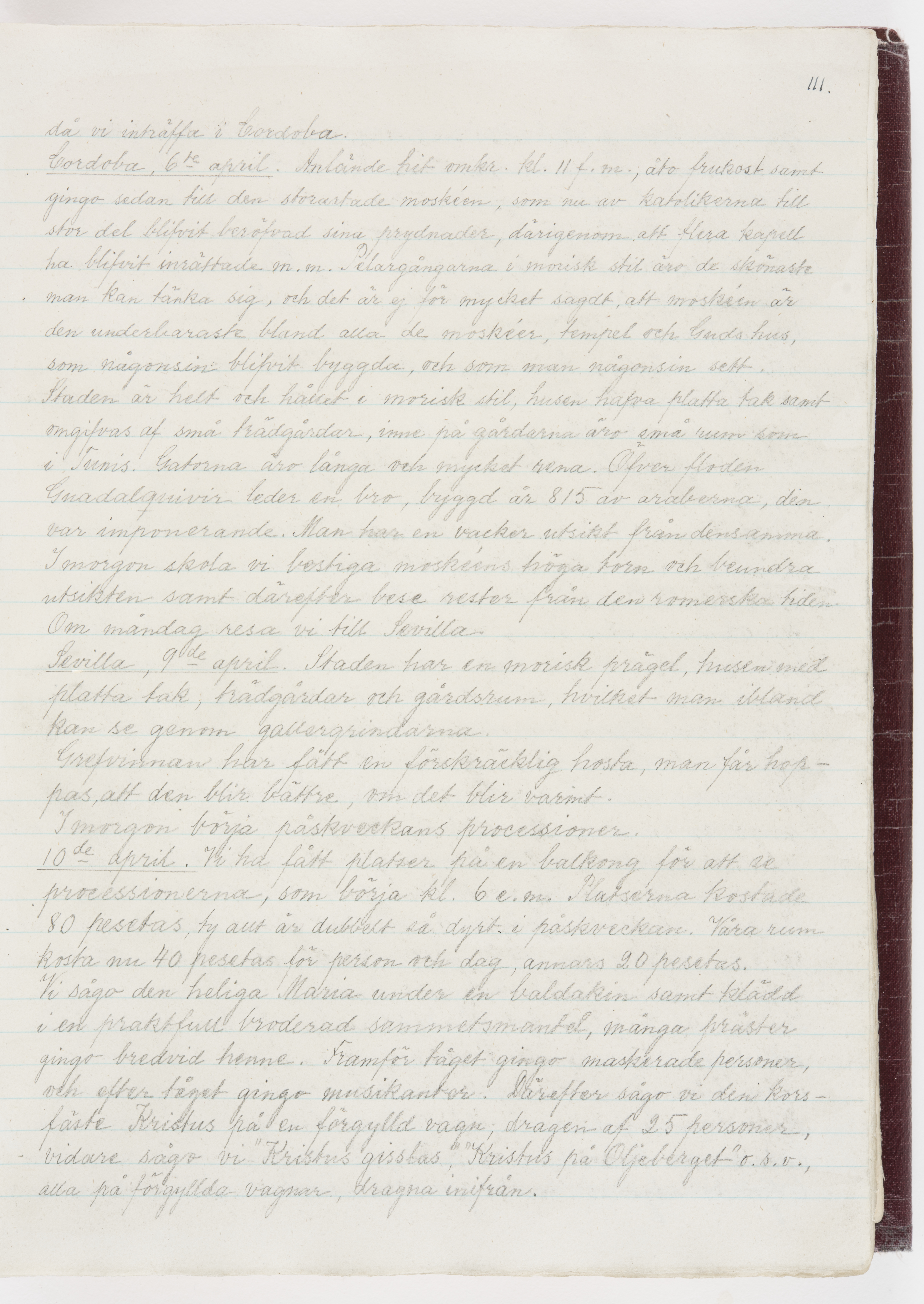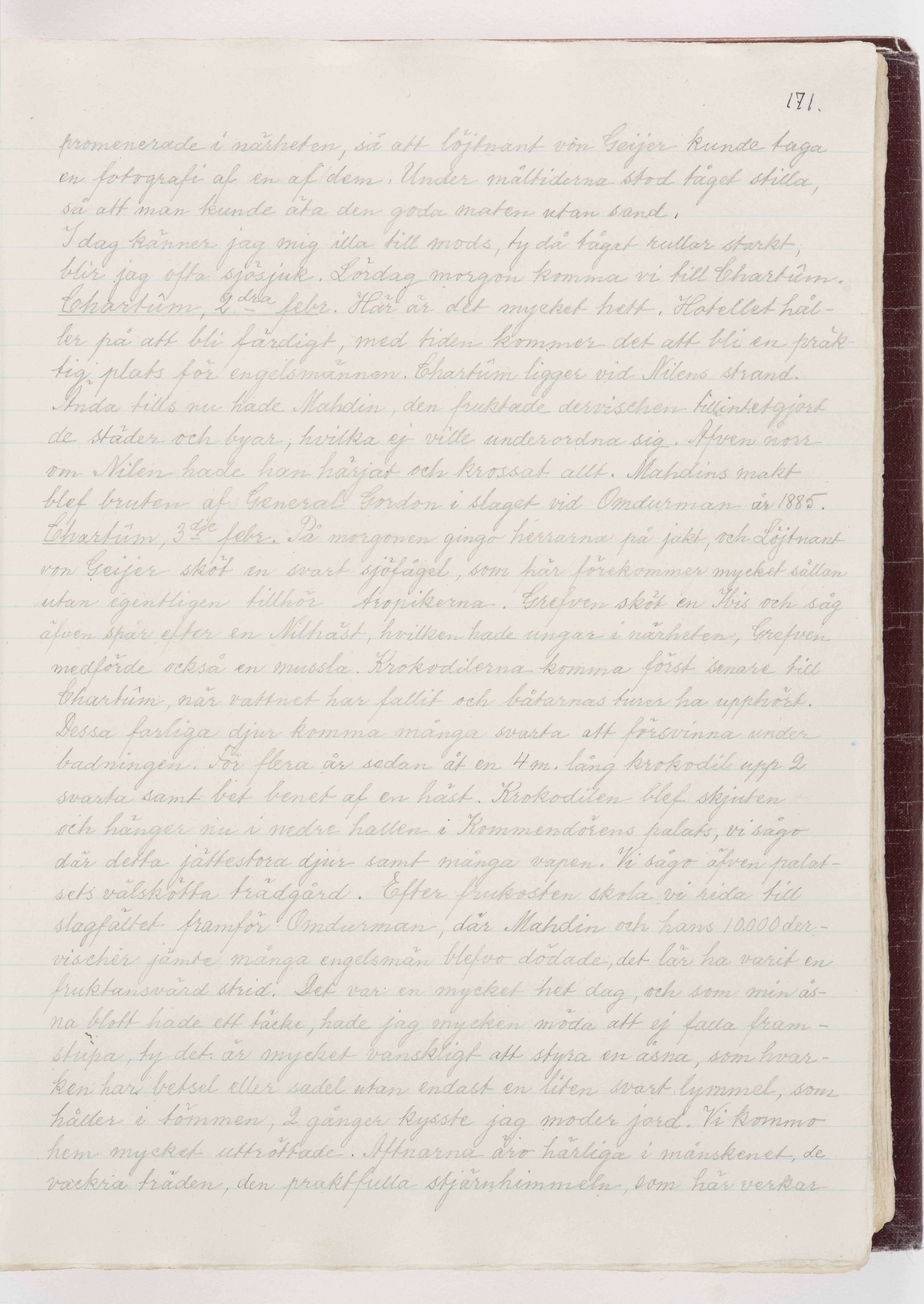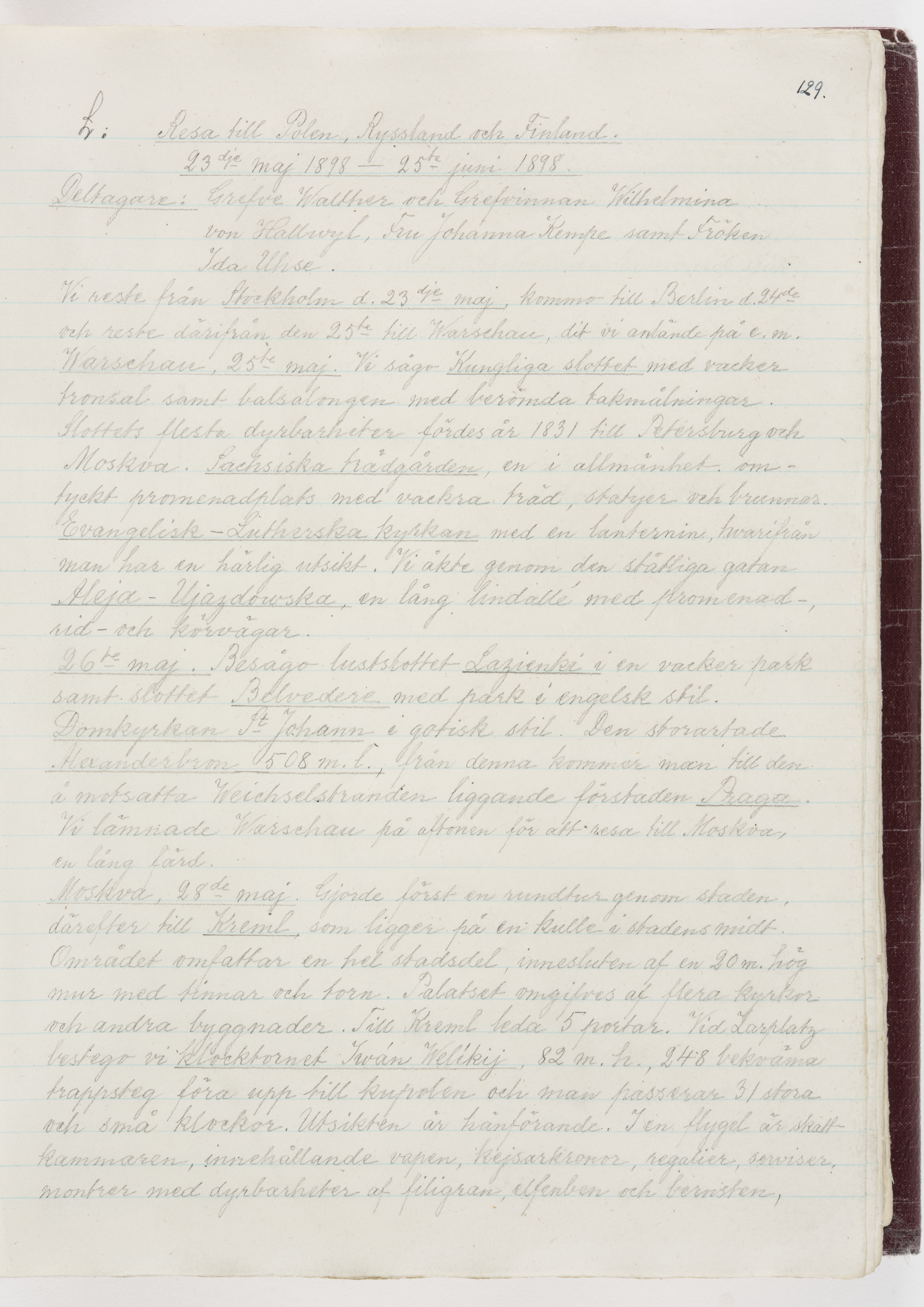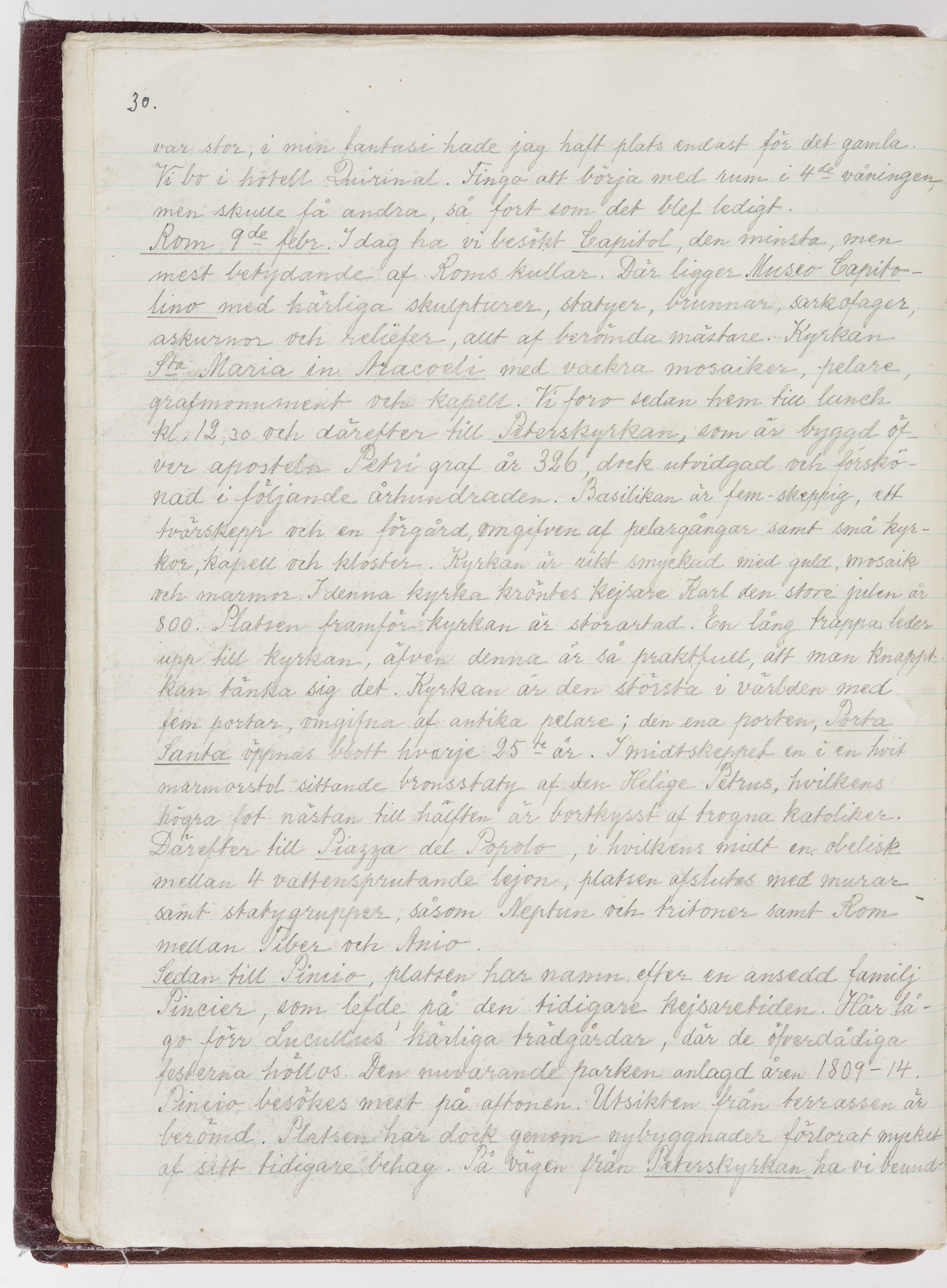 Översättning till svenska språket av dagbok skriven på tyska språket av Ida Uhse under resor tillsammans med Walther och Wilhelmina von Hallwyl åren 1880-1918 samt företeckning över fynd, gåvor och inköpta föremål under resorna åren 1881-1918. Av Signe Berglöf. 309 s. Skrivet med blyerts. Band (helt skinn-). Av brun >>oasis morocco>>, bundet med dubble ansättning och >>knäpprygg>>. Kapitäl av gult sämskskinn. Försättsblad av läderimitationspapper i brunt och svart. Fals av röd klot. 32*25*4,8 cm. Bundet av bokbindaren Otto Olsson.