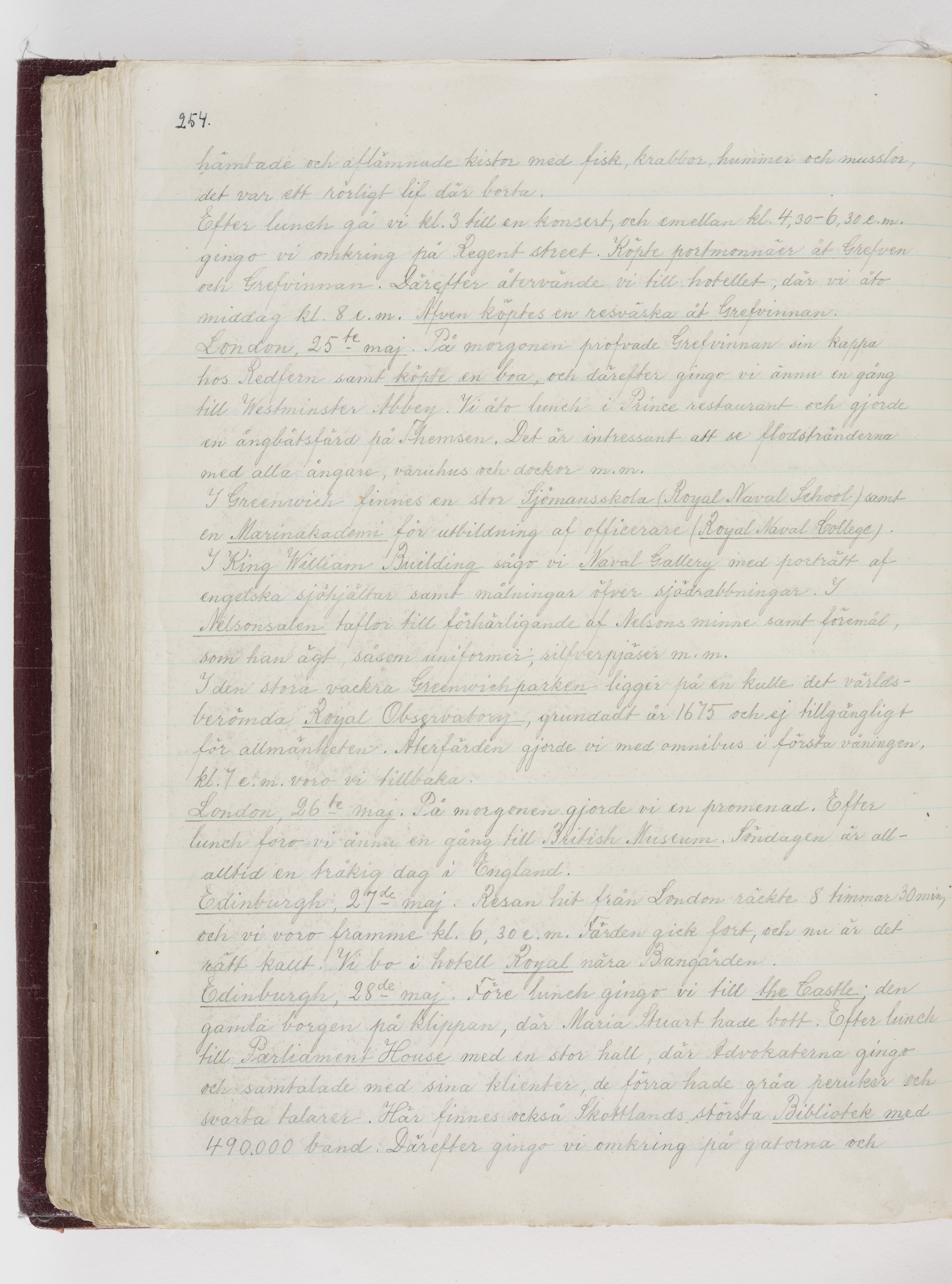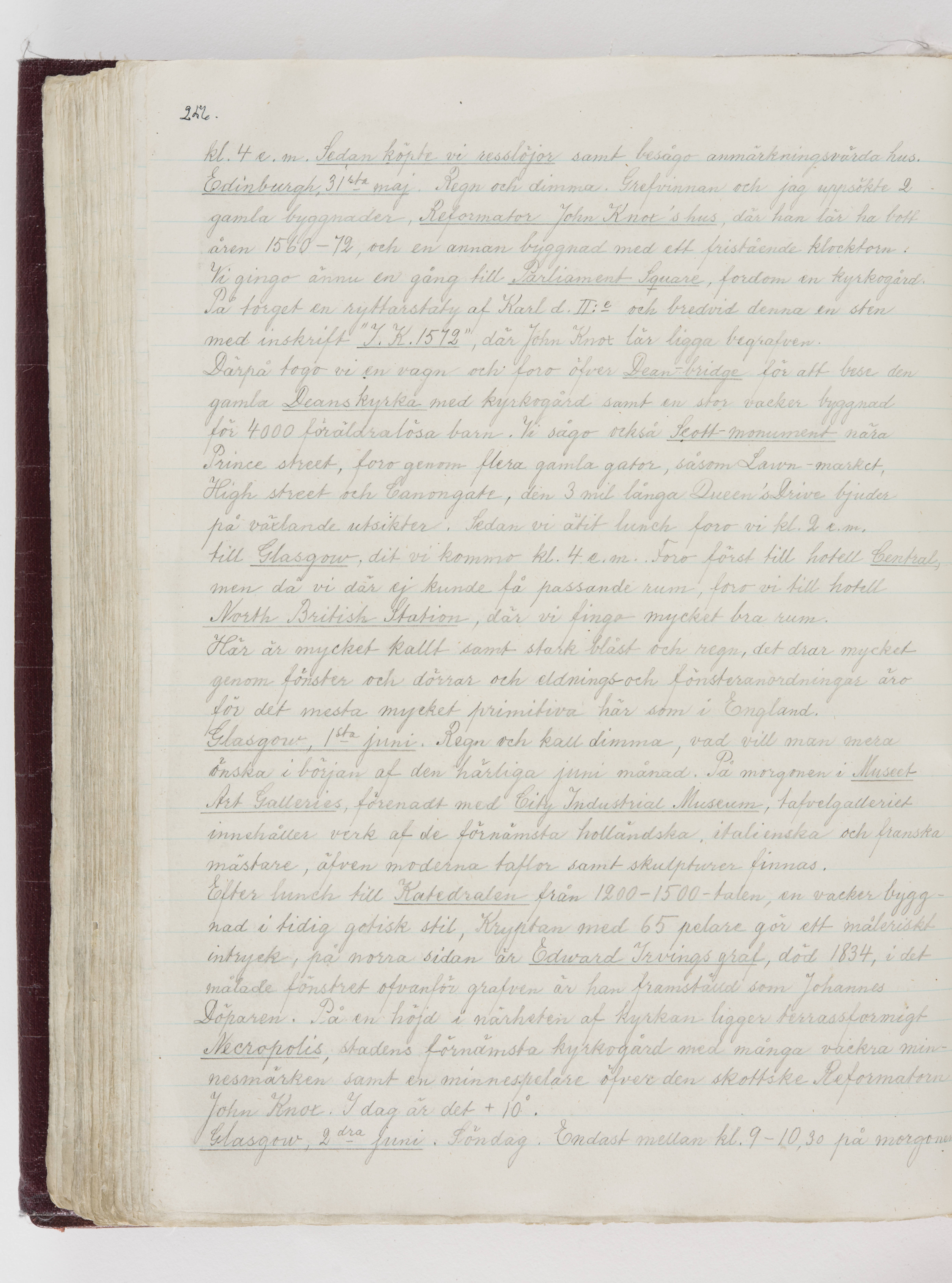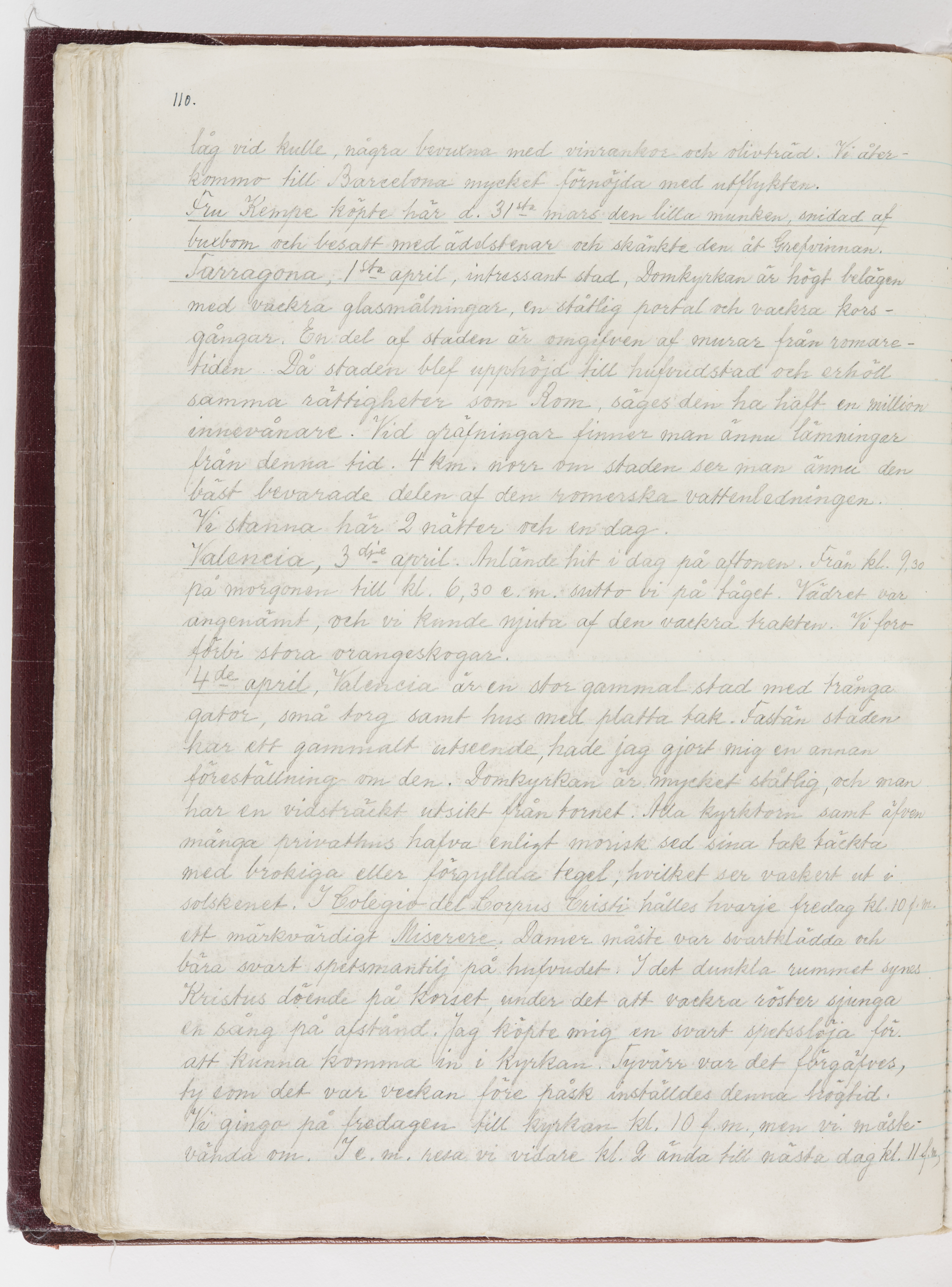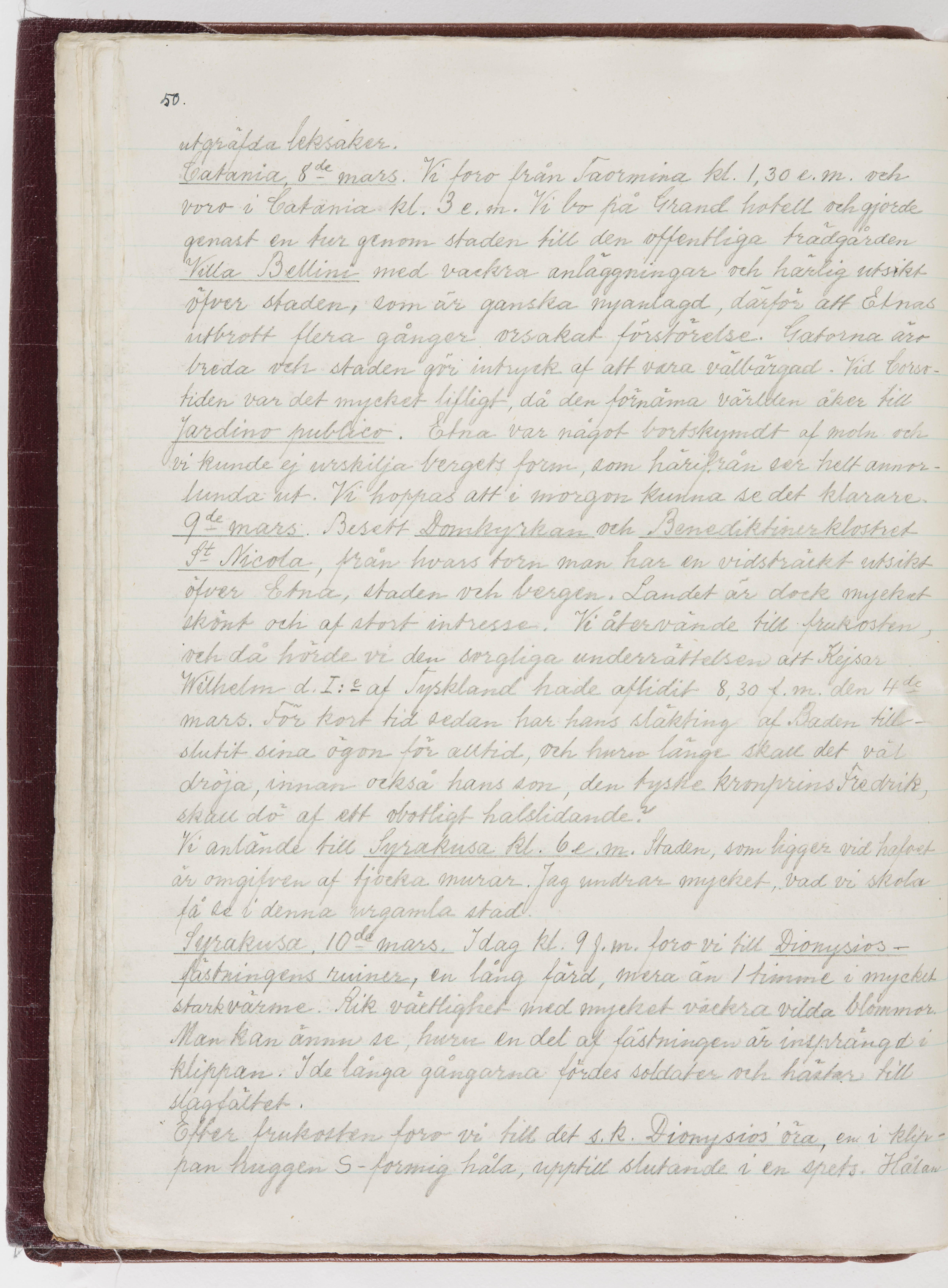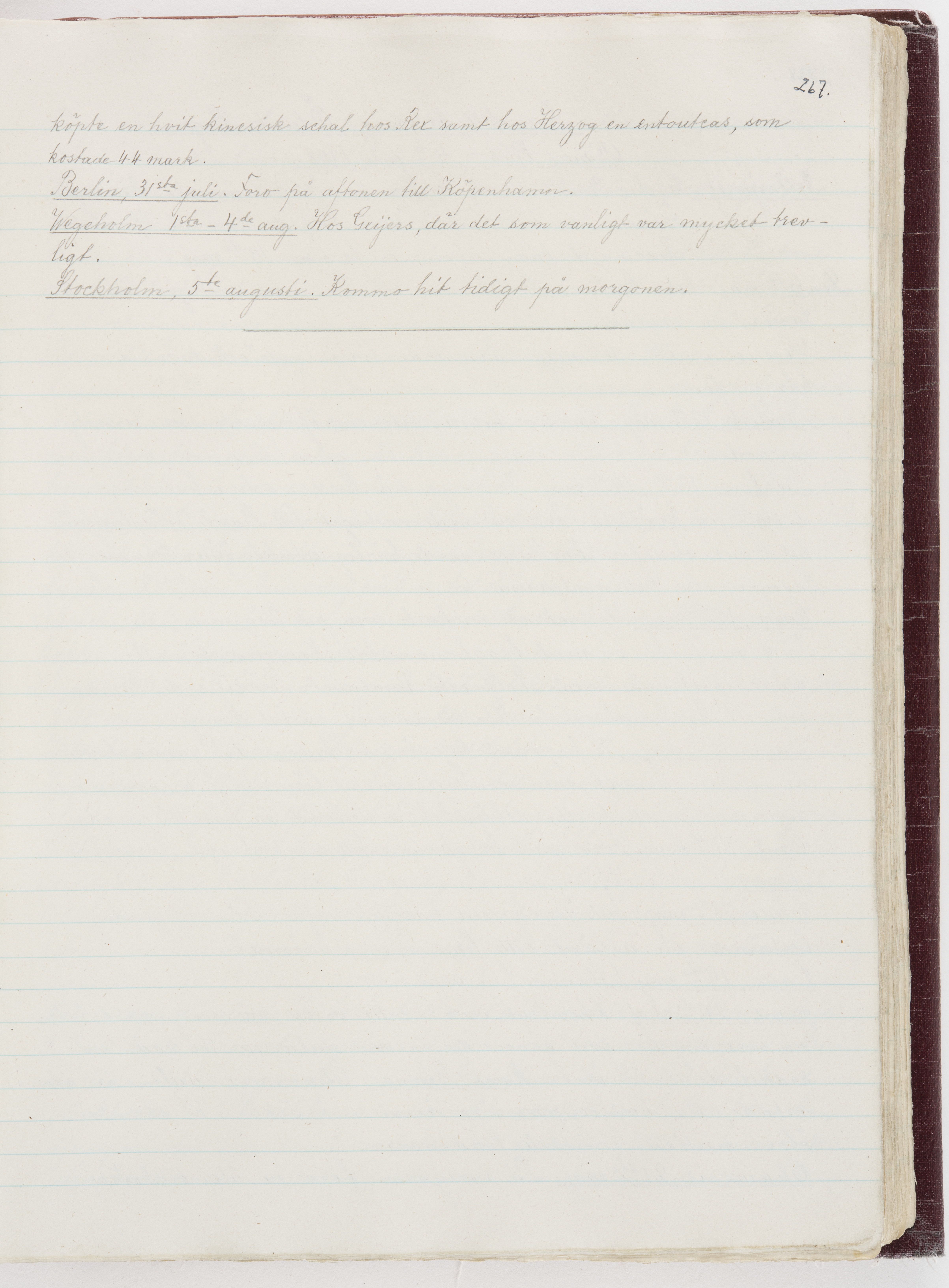 Översättning till svenska språket av dagbok skriven på tyska språket av Ida Uhse under resor tillsammans med Walther och Wilhelmina von Hallwyl åren 1880-1918 samt företeckning över fynd, gåvor och inköpta föremål under resorna åren 1881-1918. Av Signe Berglöf. 309 s. Skrivet med blyerts. Band (helt skinn-). Av brun >>oasis morocco>>, bundet med dubble ansättning och >>knäpprygg>>. Kapitäl av gult sämskskinn. Försättsblad av läderimitationspapper i brunt och svart. Fals av röd klot. 32*25*4,8 cm. Bundet av bokbindaren Otto Olsson.