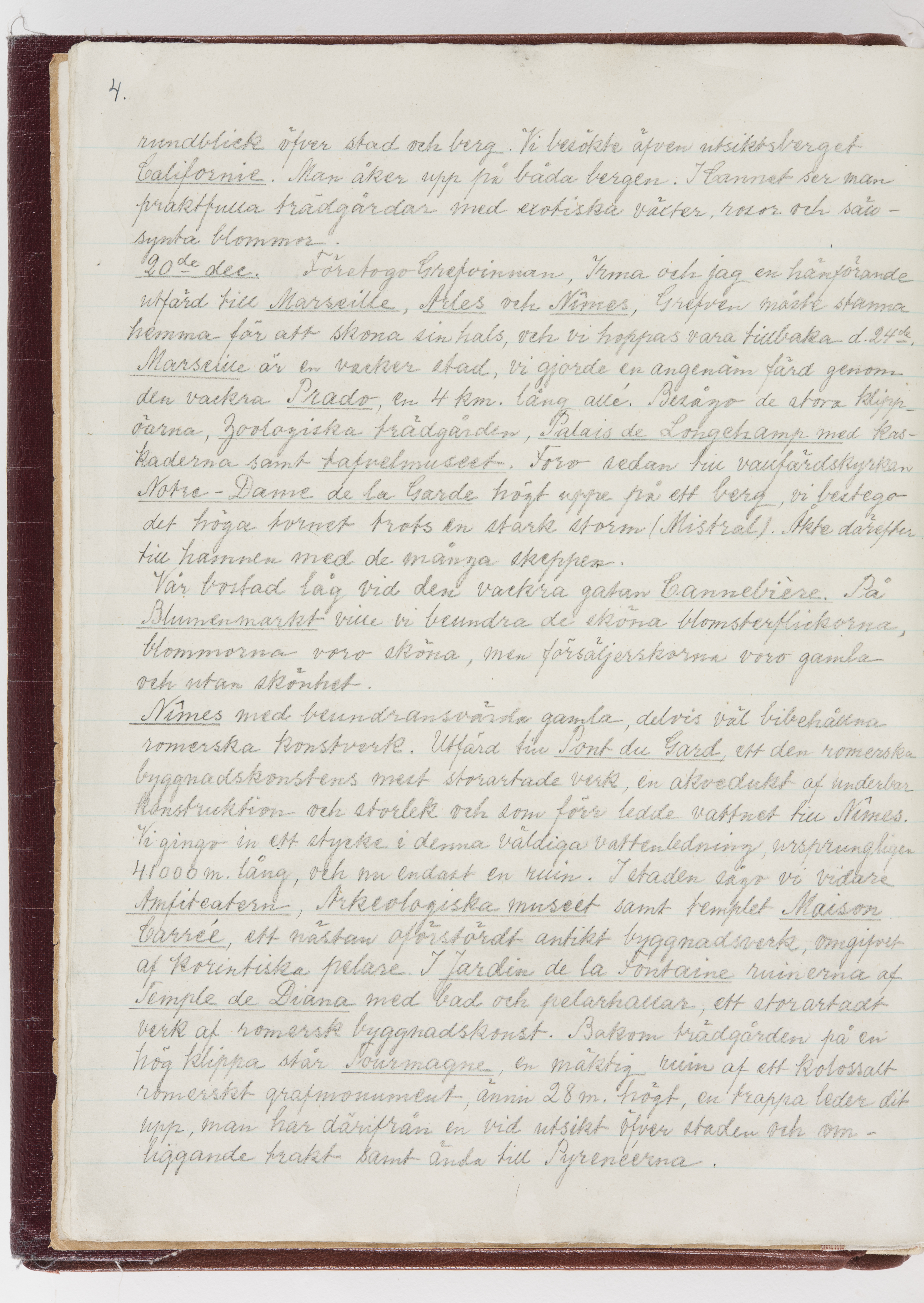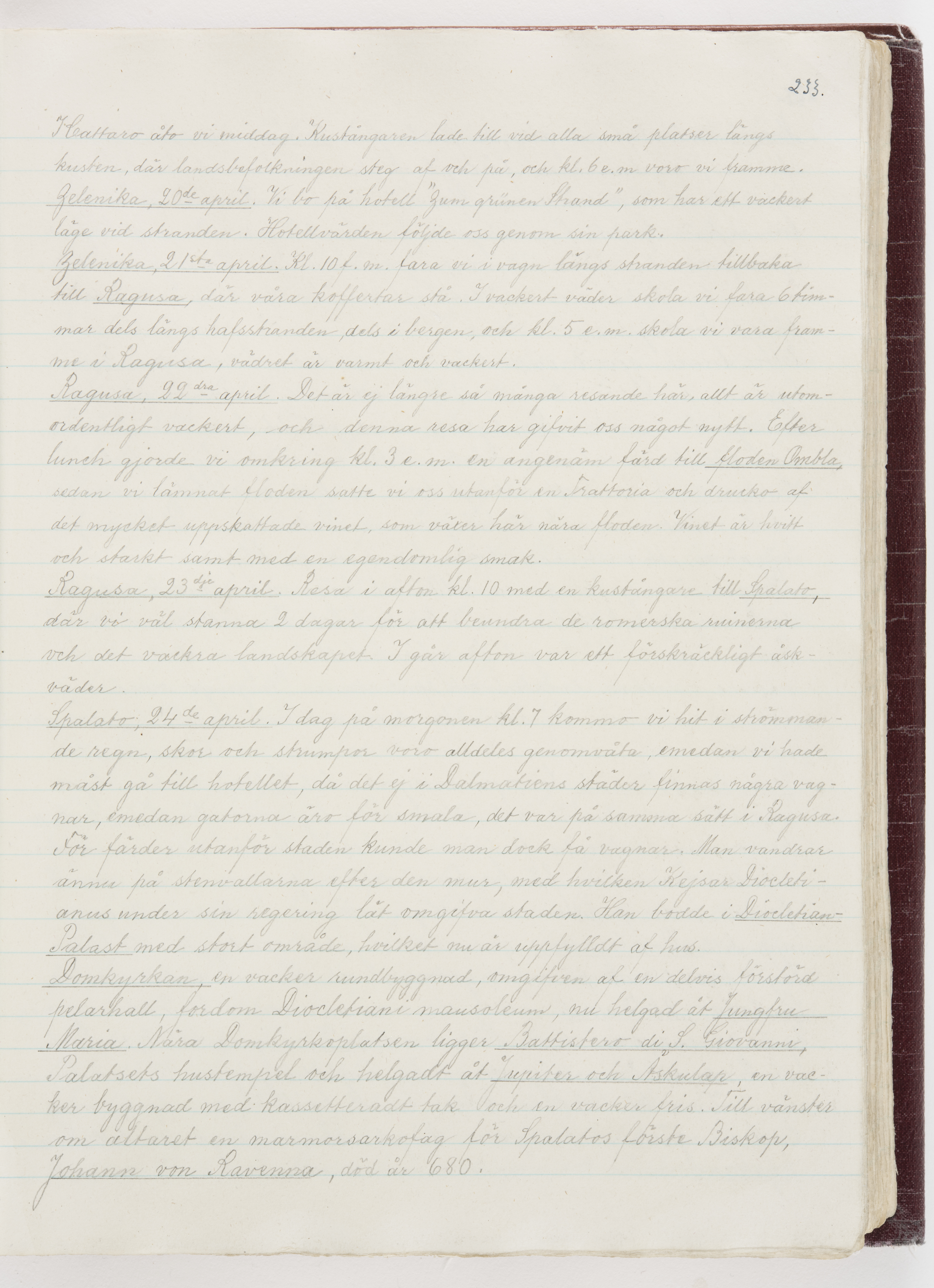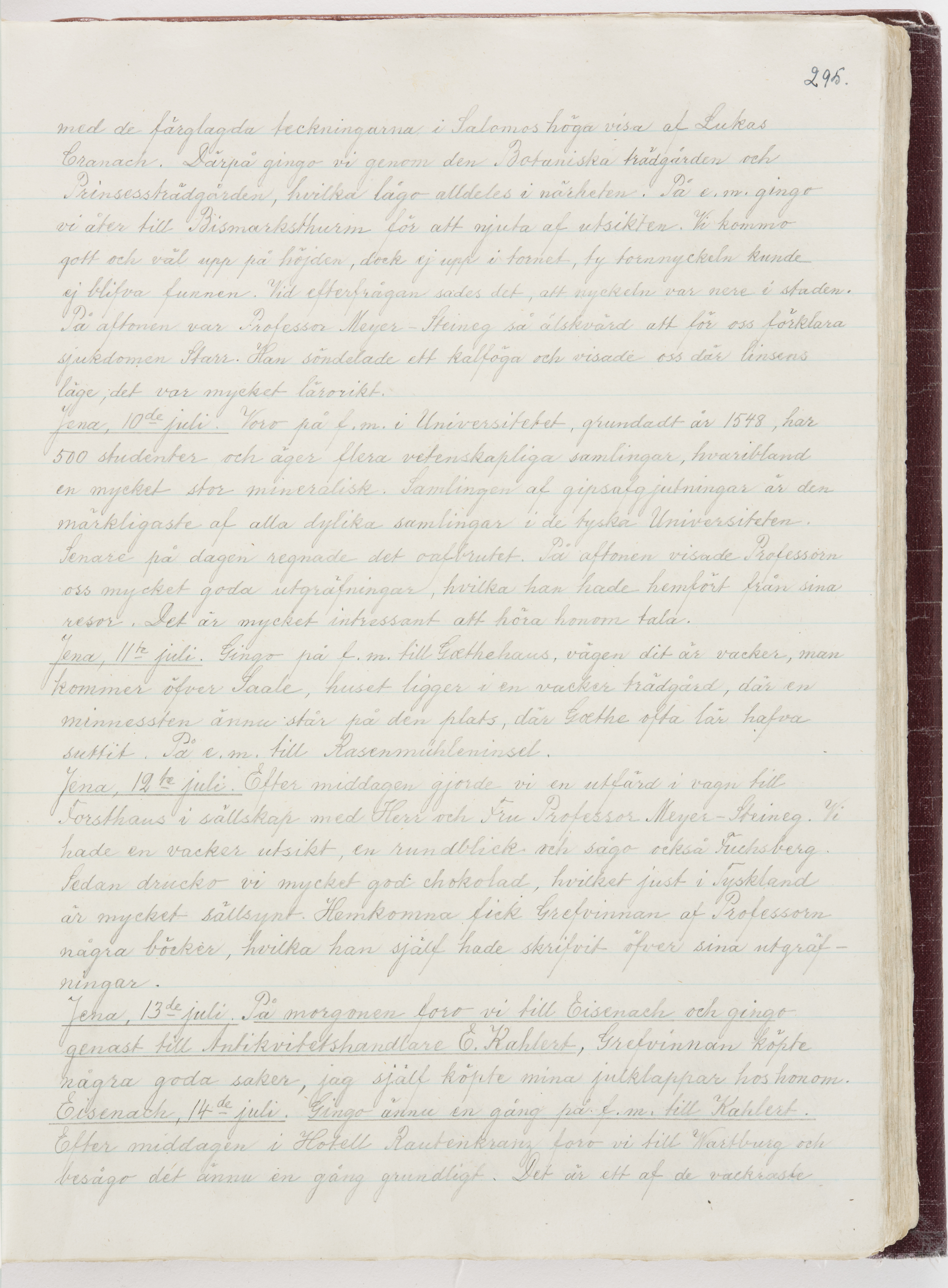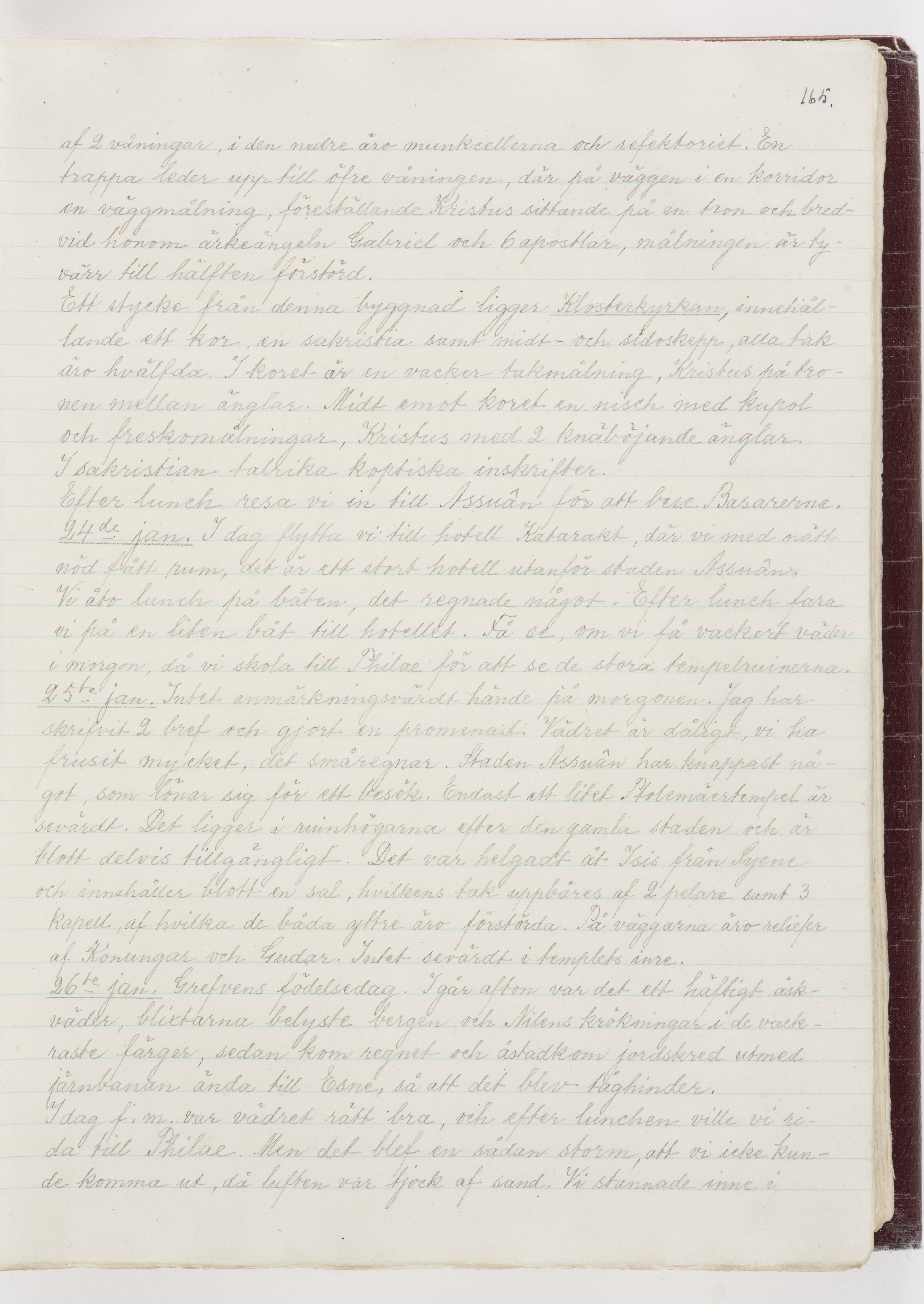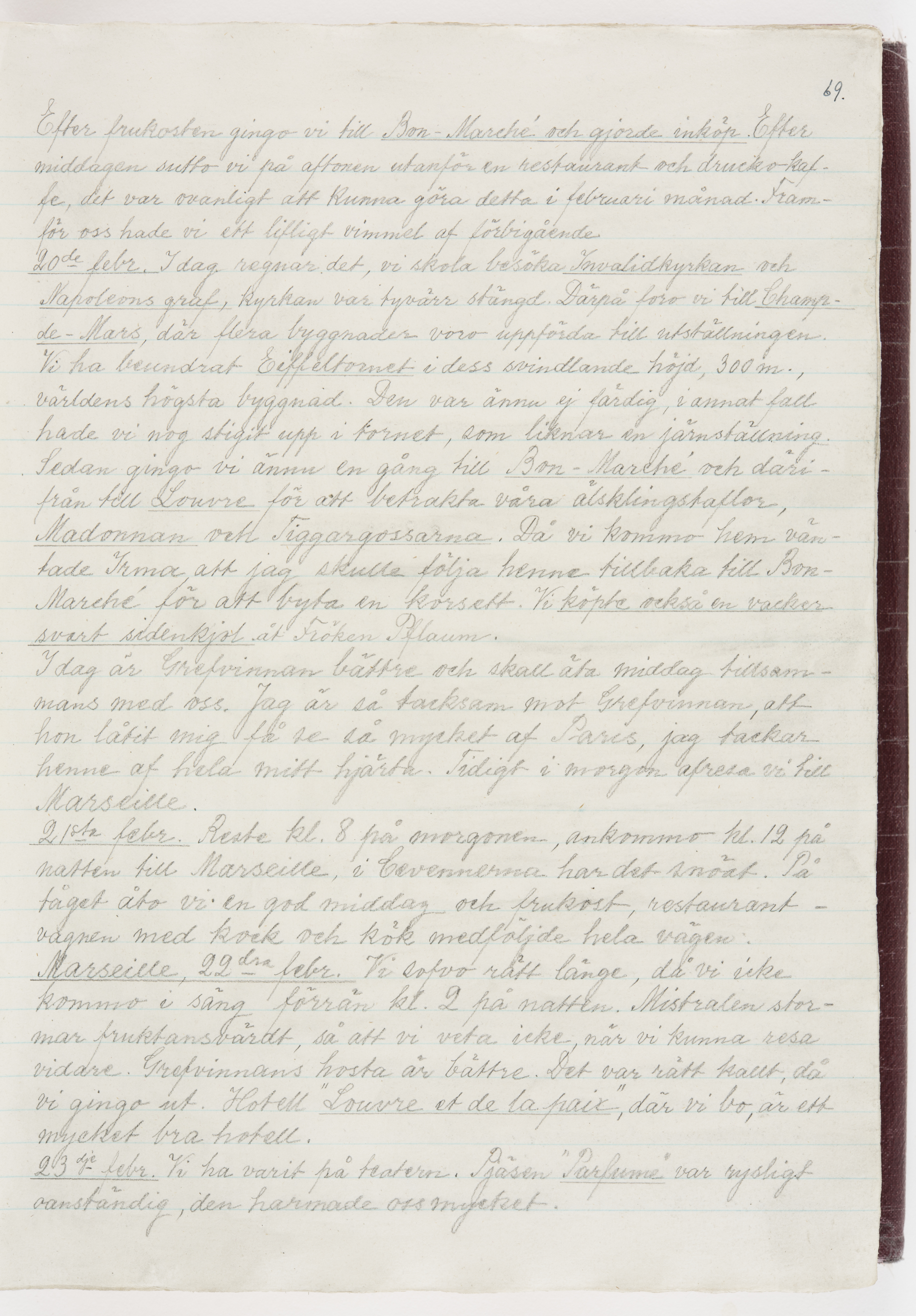 Översättning till svenska språket av dagbok skriven på tyska språket av Ida Uhse under resor tillsammans med Walther och Wilhelmina von Hallwyl åren 1880-1918 samt företeckning över fynd, gåvor och inköpta föremål under resorna åren 1881-1918. Av Signe Berglöf. 309 s. Skrivet med blyerts. Band (helt skinn-). Av brun >>oasis morocco>>, bundet med dubble ansättning och >>knäpprygg>>. Kapitäl av gult sämskskinn. Försättsblad av läderimitationspapper i brunt och svart. Fals av röd klot. 32*25*4,8 cm. Bundet av bokbindaren Otto Olsson.