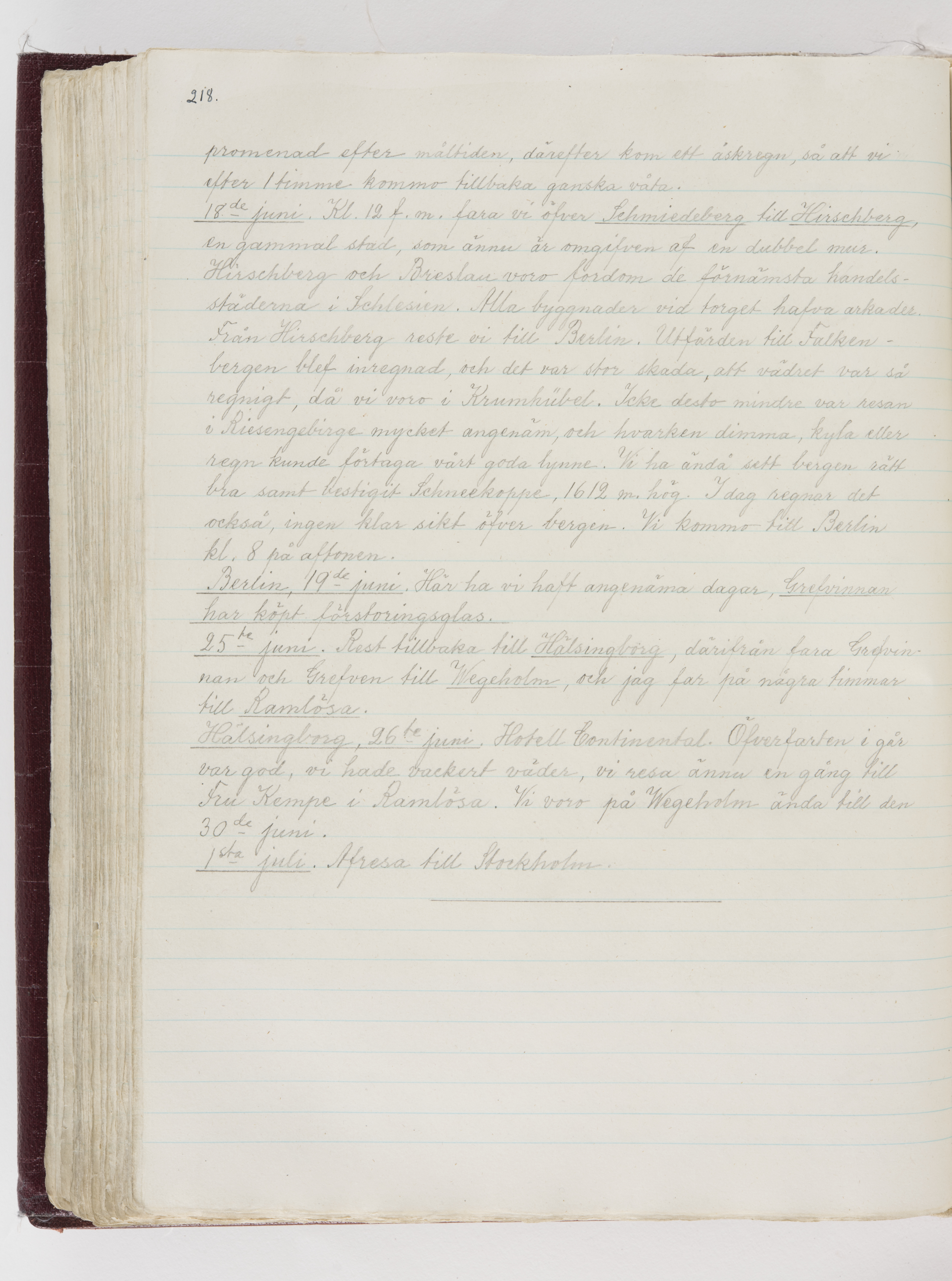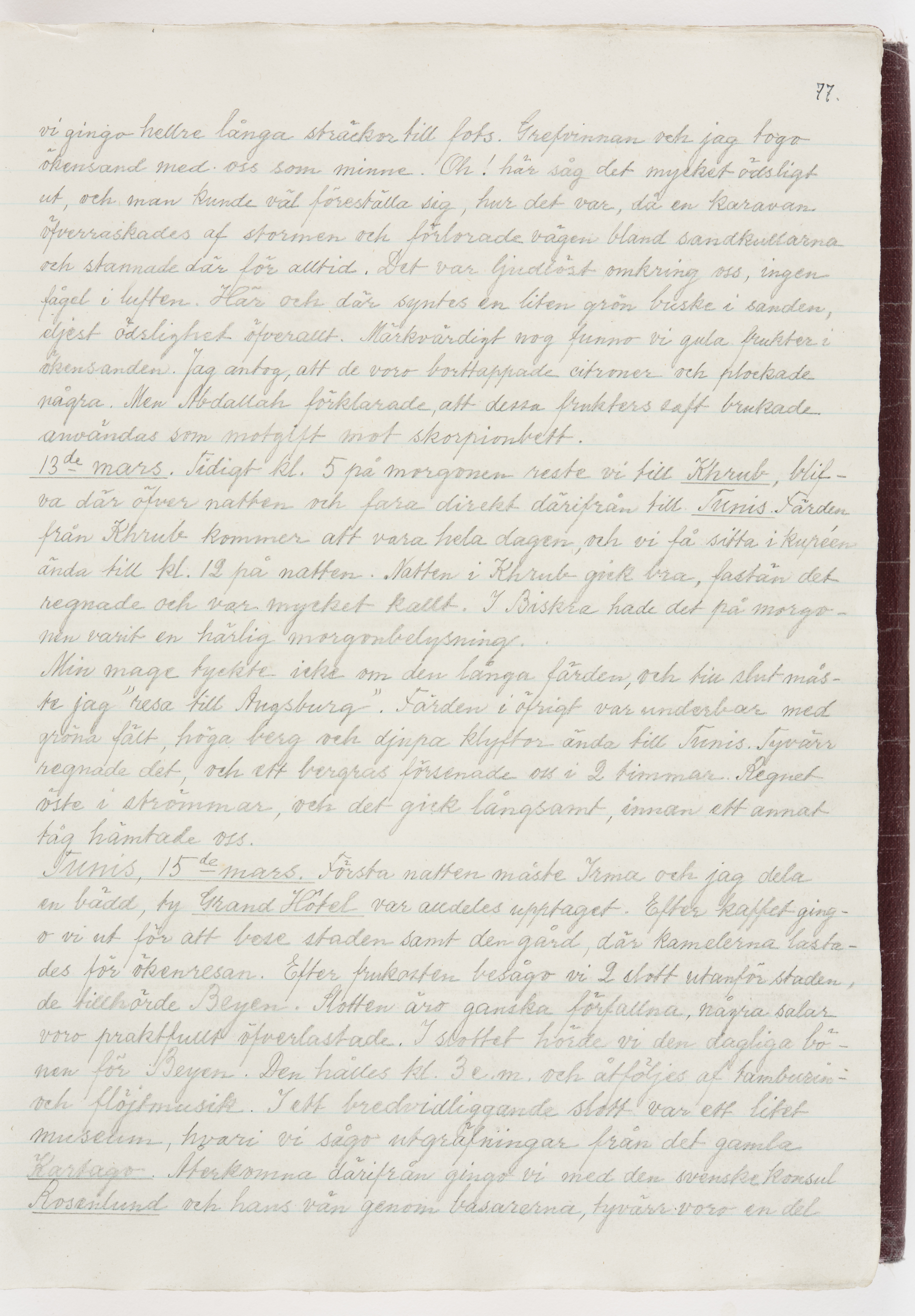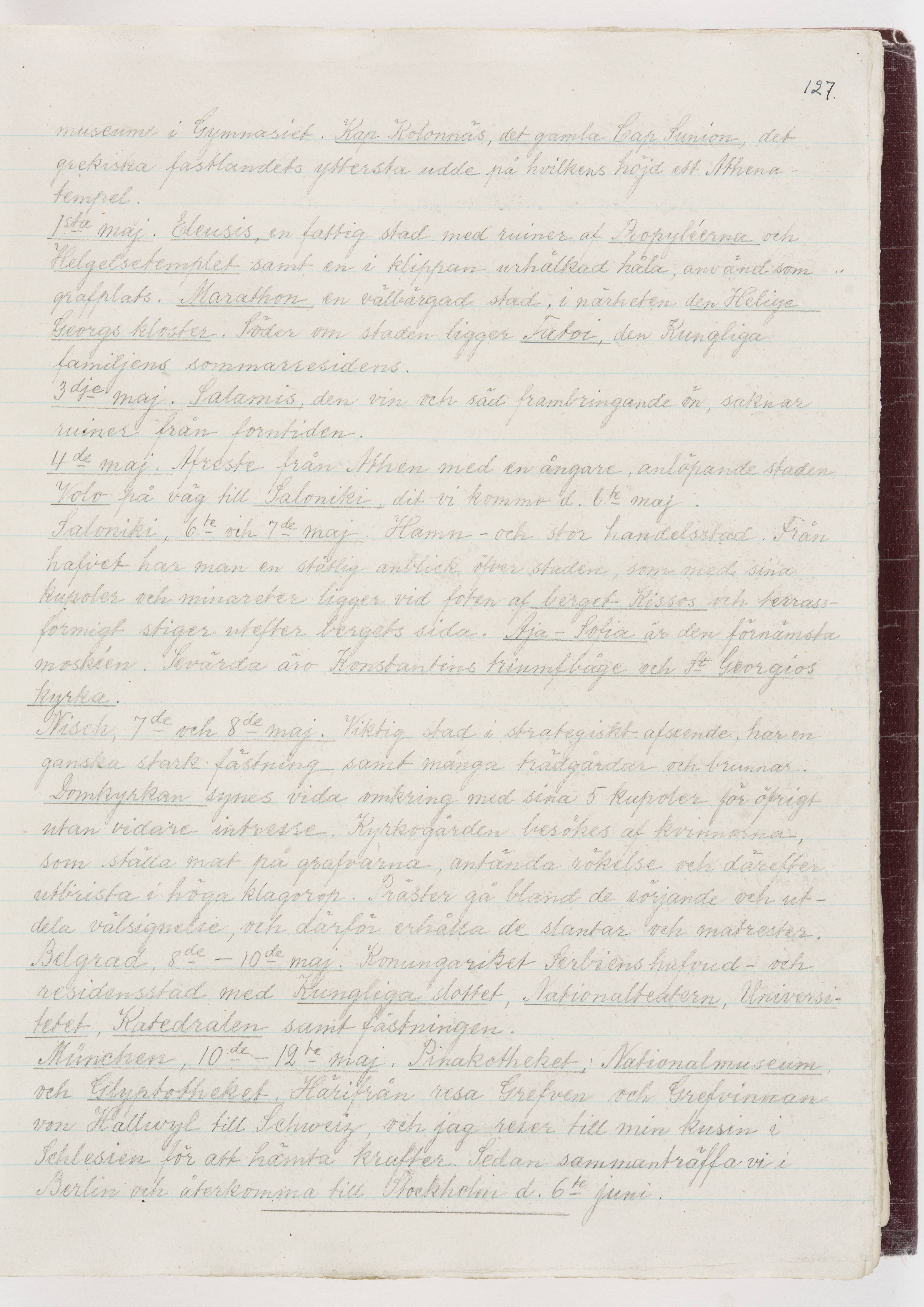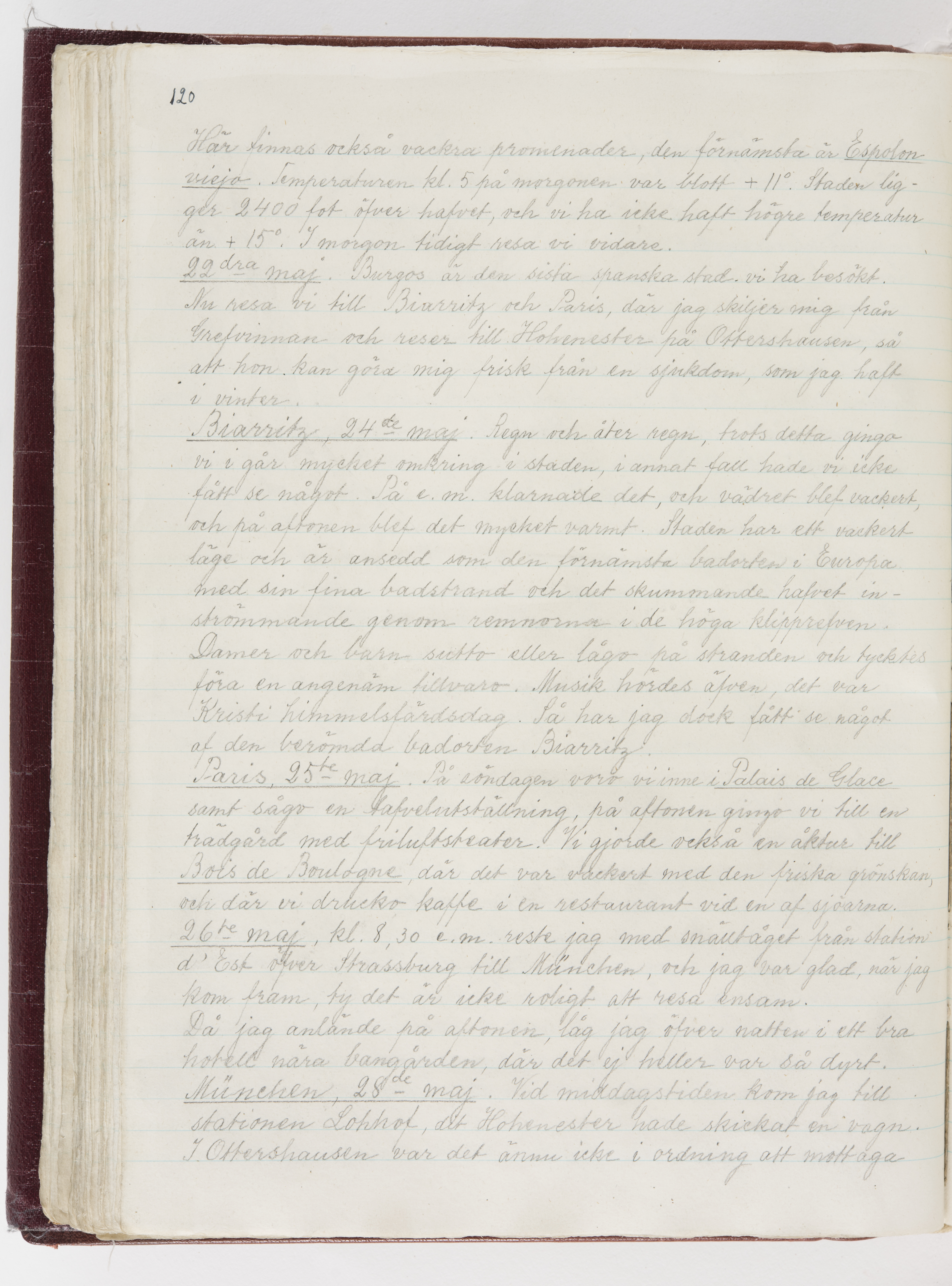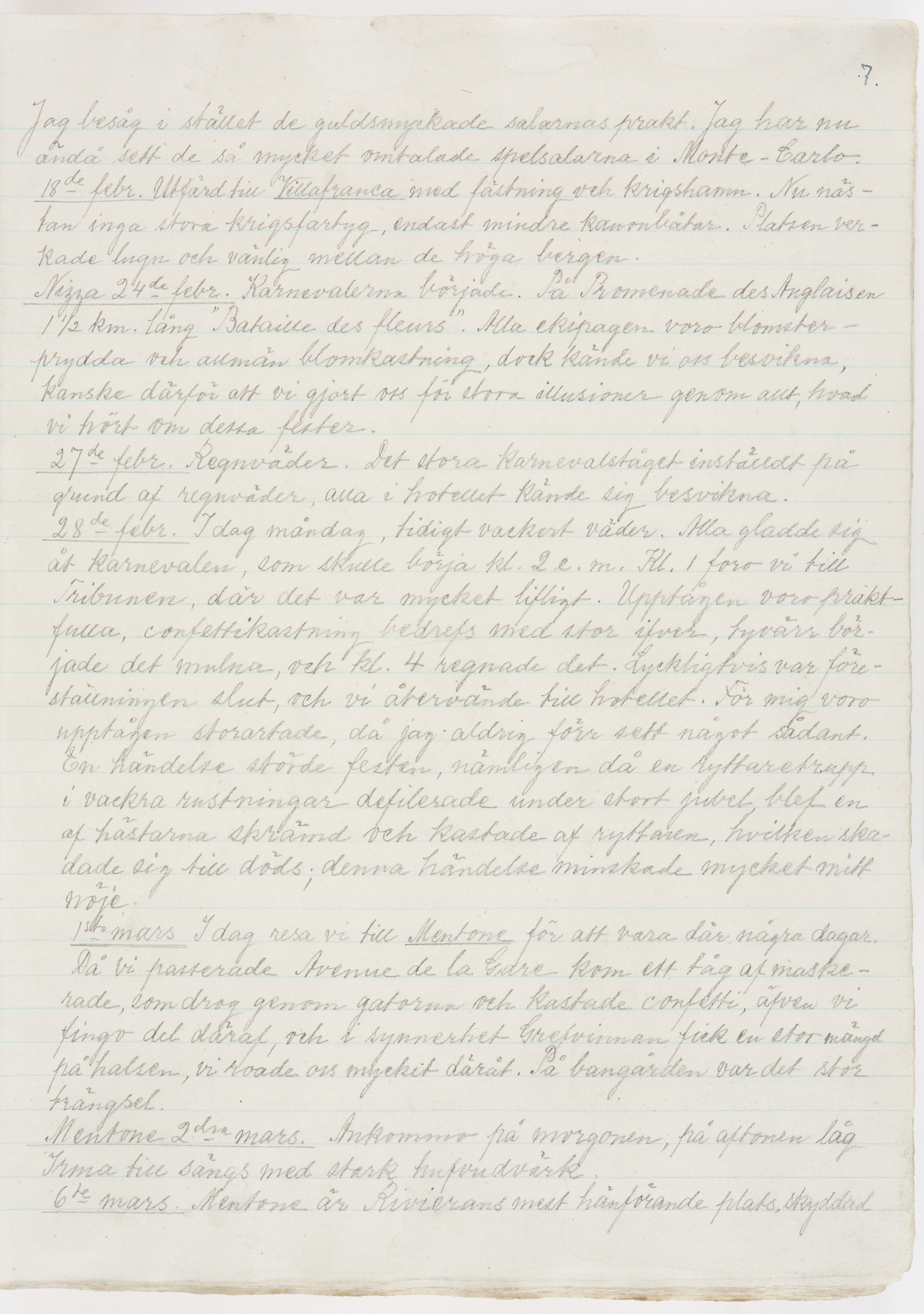 Översättning till svenska språket av dagbok skriven på tyska språket av Ida Uhse under resor tillsammans med Walther och Wilhelmina von Hallwyl åren 1880-1918 samt företeckning över fynd, gåvor och inköpta föremål under resorna åren 1881-1918. Av Signe Berglöf. 309 s. Skrivet med blyerts. Band (helt skinn-). Av brun >>oasis morocco>>, bundet med dubble ansättning och >>knäpprygg>>. Kapitäl av gult sämskskinn. Försättsblad av läderimitationspapper i brunt och svart. Fals av röd klot. 32*25*4,8 cm. Bundet av bokbindaren Otto Olsson.