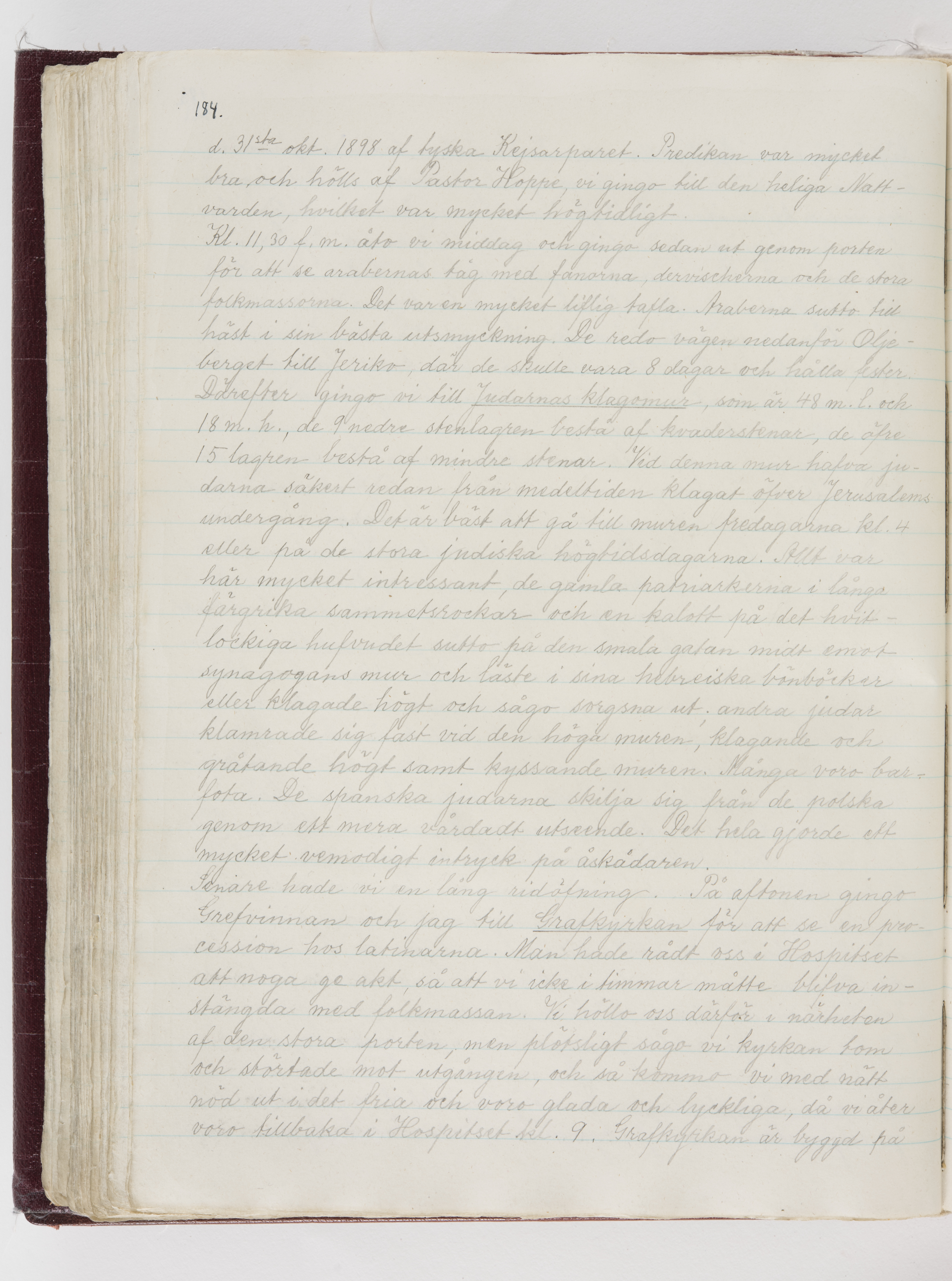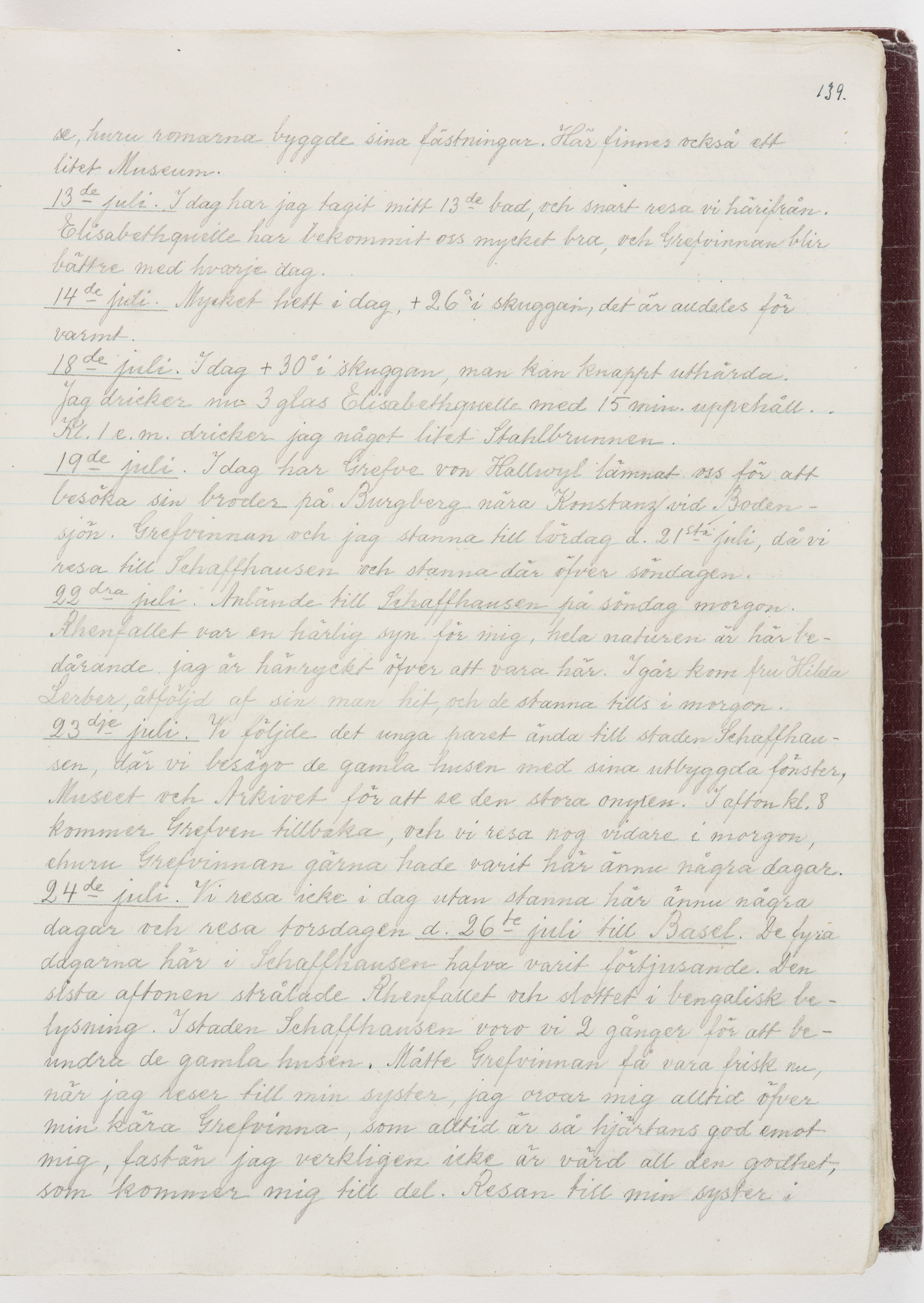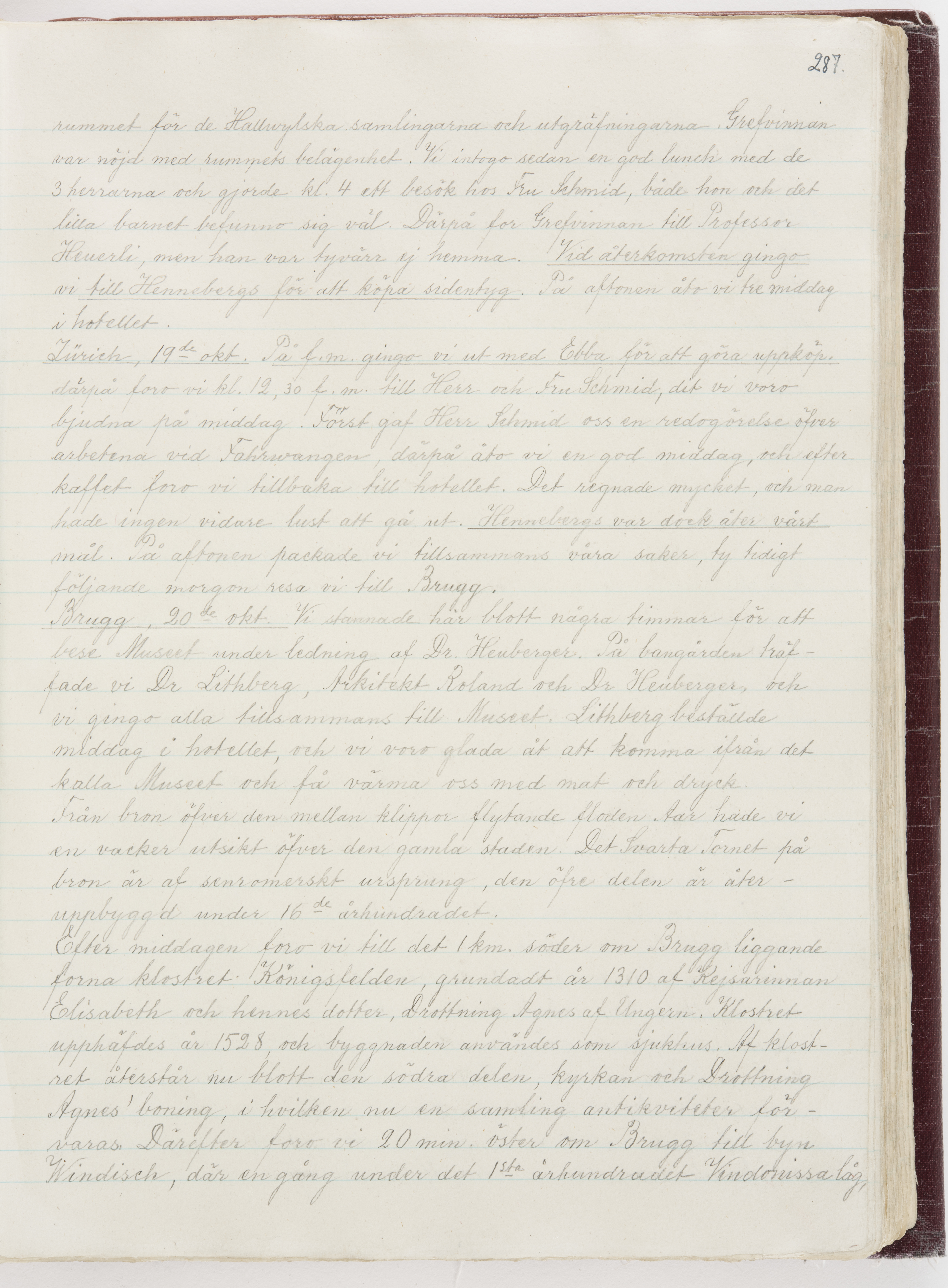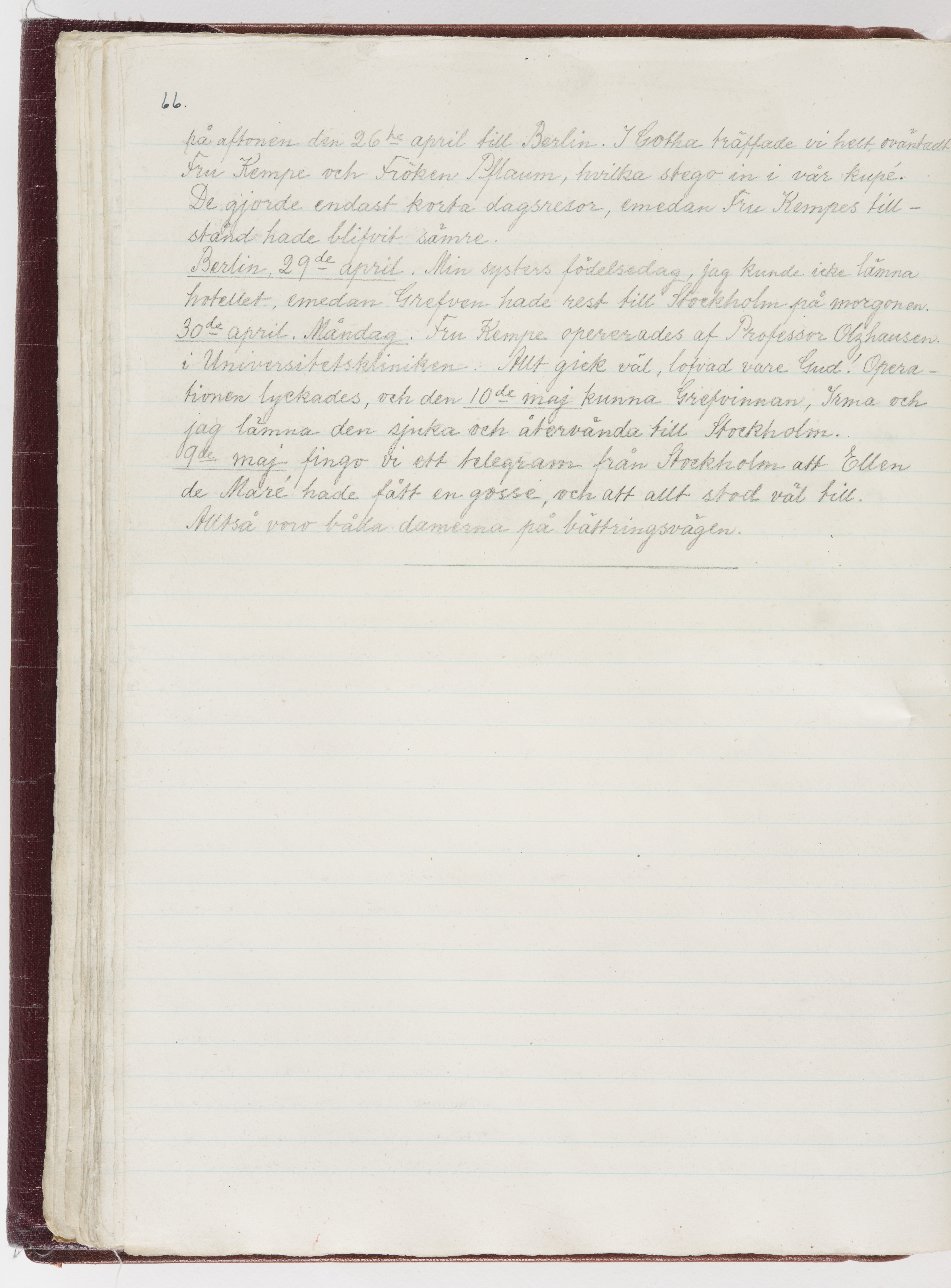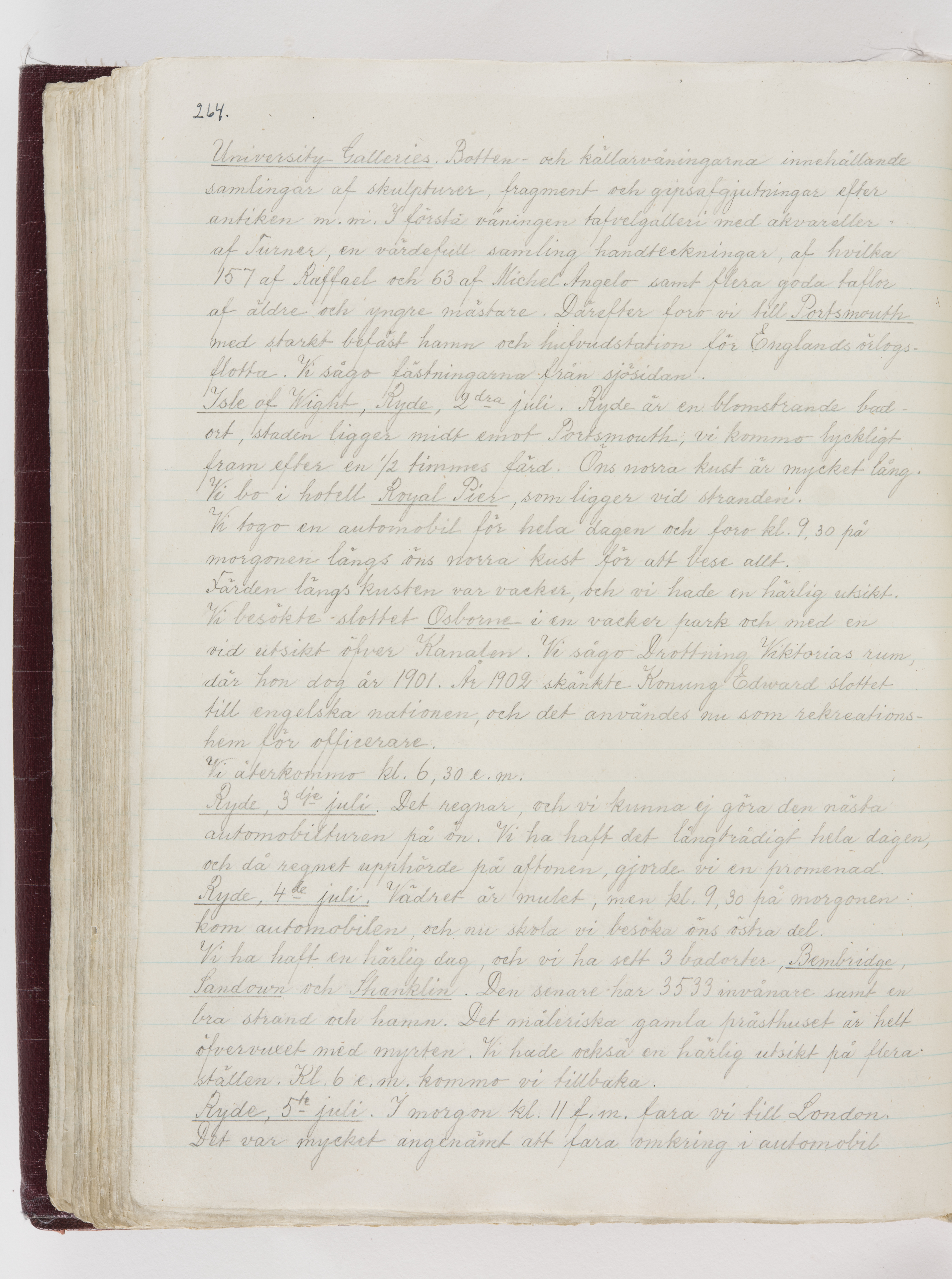 Översättning till svenska språket av dagbok skriven på tyska språket av Ida Uhse under resor tillsammans med Walther och Wilhelmina von Hallwyl åren 1880-1918 samt företeckning över fynd, gåvor och inköpta föremål under resorna åren 1881-1918. Av Signe Berglöf. 309 s. Skrivet med blyerts. Band (helt skinn-). Av brun >>oasis morocco>>, bundet med dubble ansättning och >>knäpprygg>>. Kapitäl av gult sämskskinn. Försättsblad av läderimitationspapper i brunt och svart. Fals av röd klot. 32*25*4,8 cm. Bundet av bokbindaren Otto Olsson.