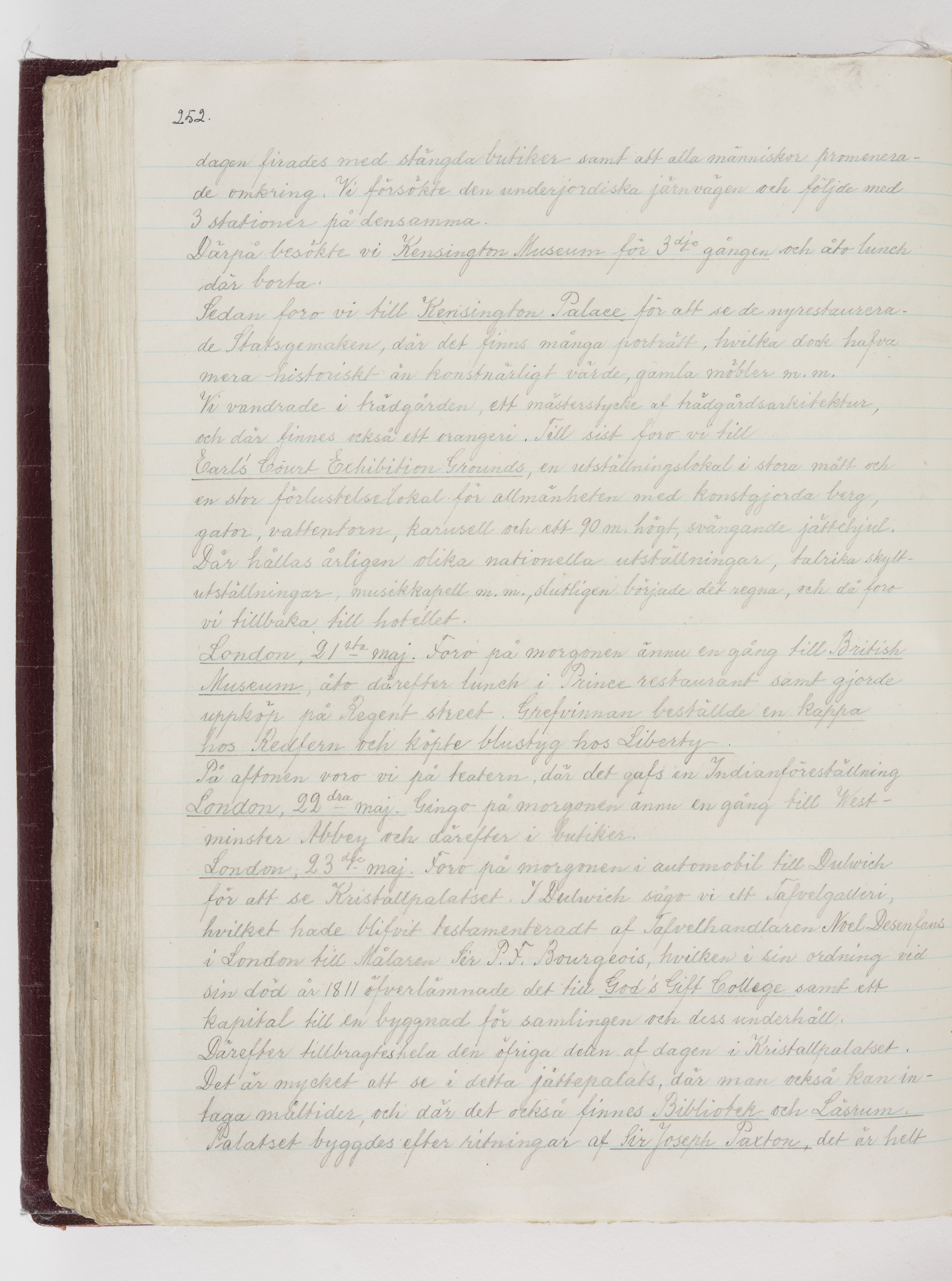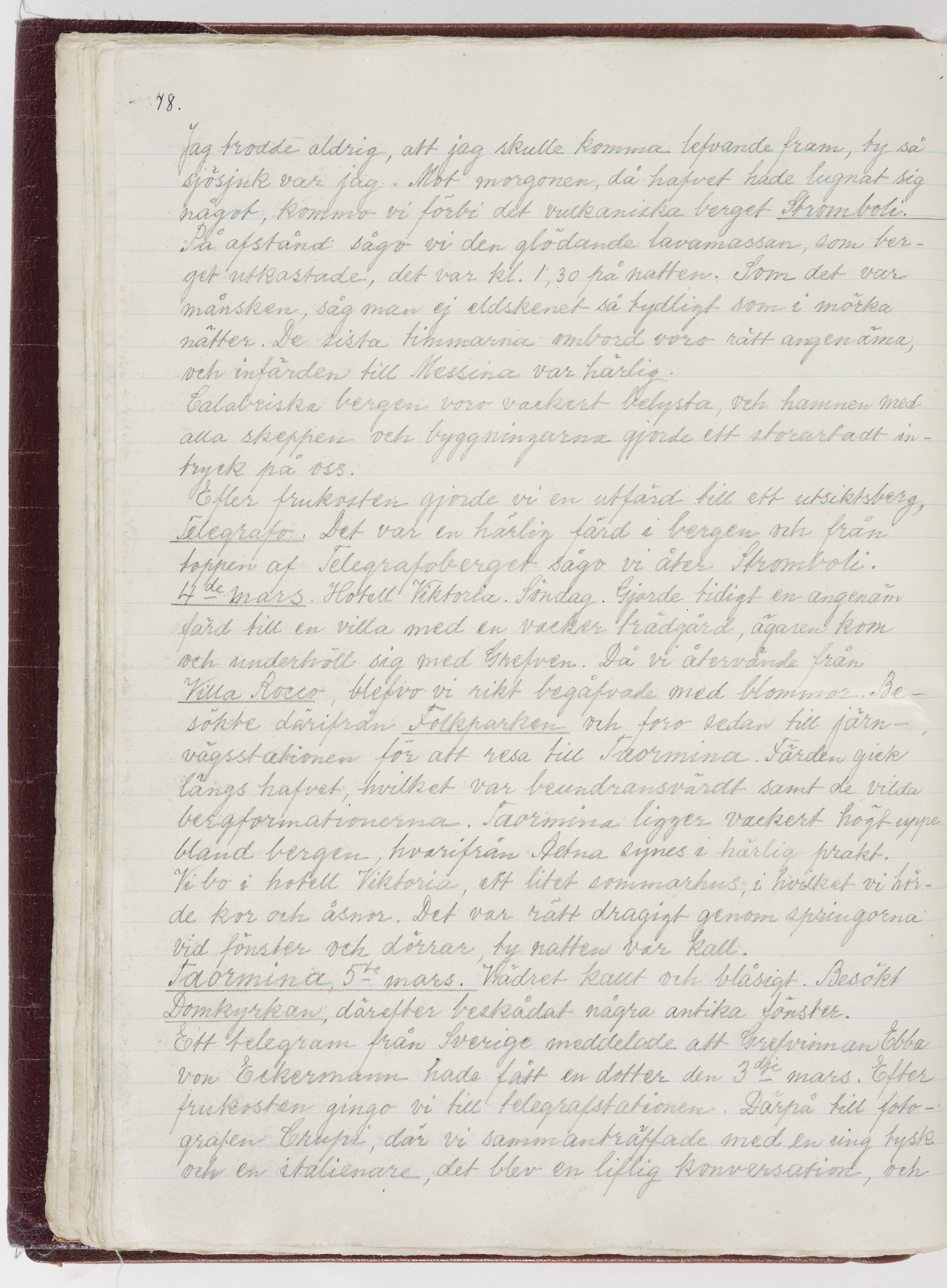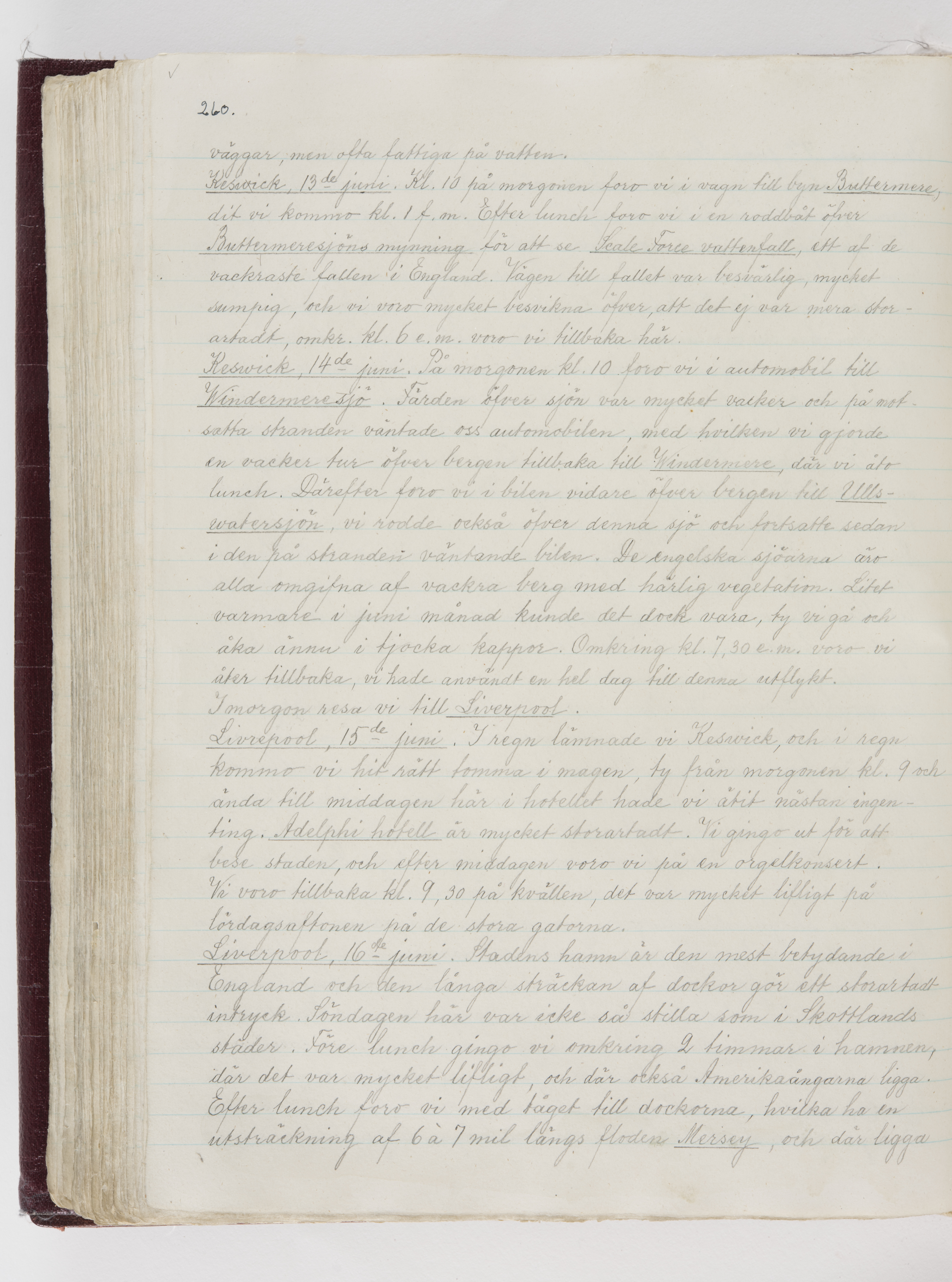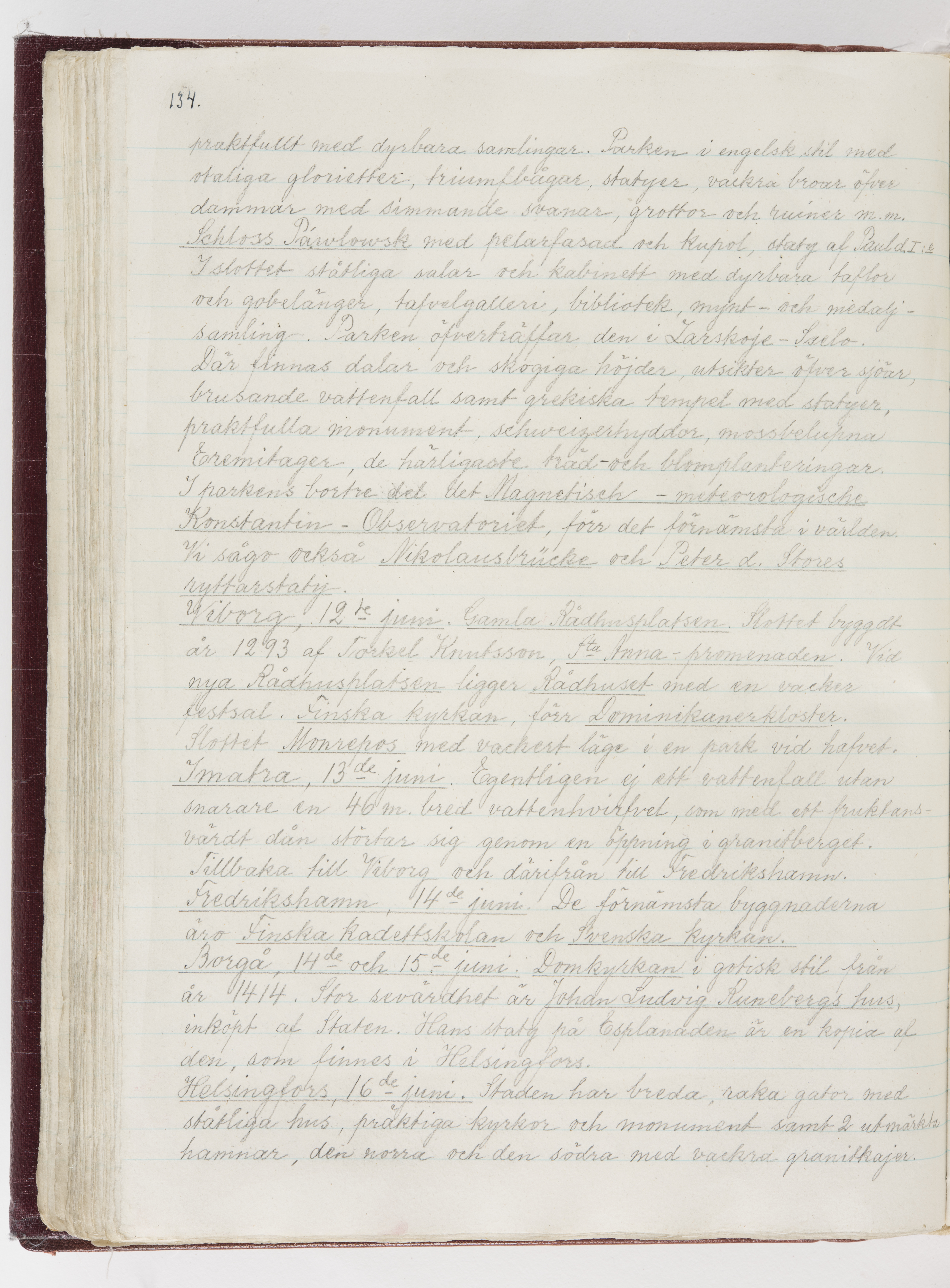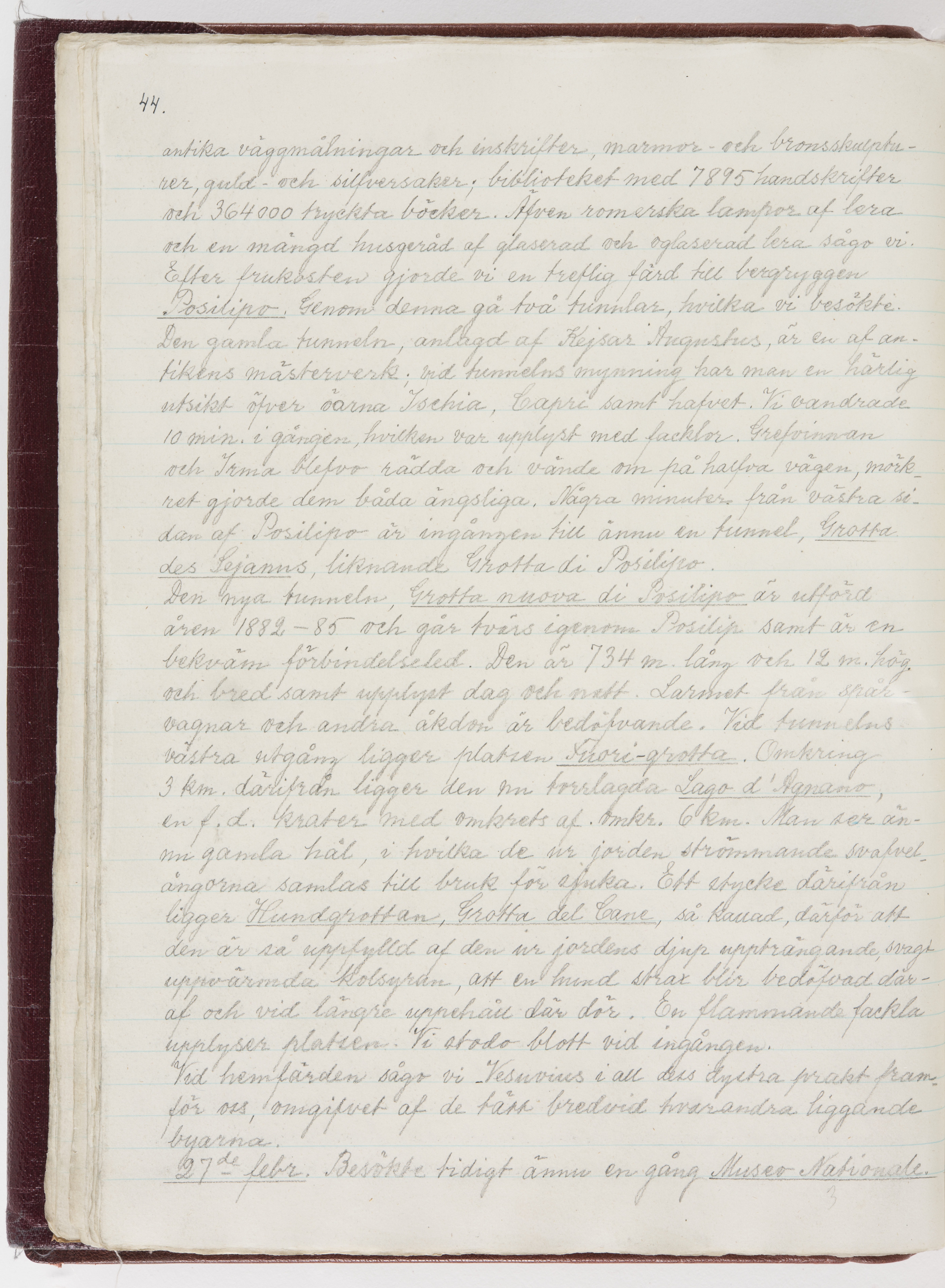 Översättning till svenska språket av dagbok skriven på tyska språket av Ida Uhse under resor tillsammans med Walther och Wilhelmina von Hallwyl åren 1880-1918 samt företeckning över fynd, gåvor och inköpta föremål under resorna åren 1881-1918. Av Signe Berglöf. 309 s. Skrivet med blyerts. Band (helt skinn-). Av brun >>oasis morocco>>, bundet med dubble ansättning och >>knäpprygg>>. Kapitäl av gult sämskskinn. Försättsblad av läderimitationspapper i brunt och svart. Fals av röd klot. 32*25*4,8 cm. Bundet av bokbindaren Otto Olsson.