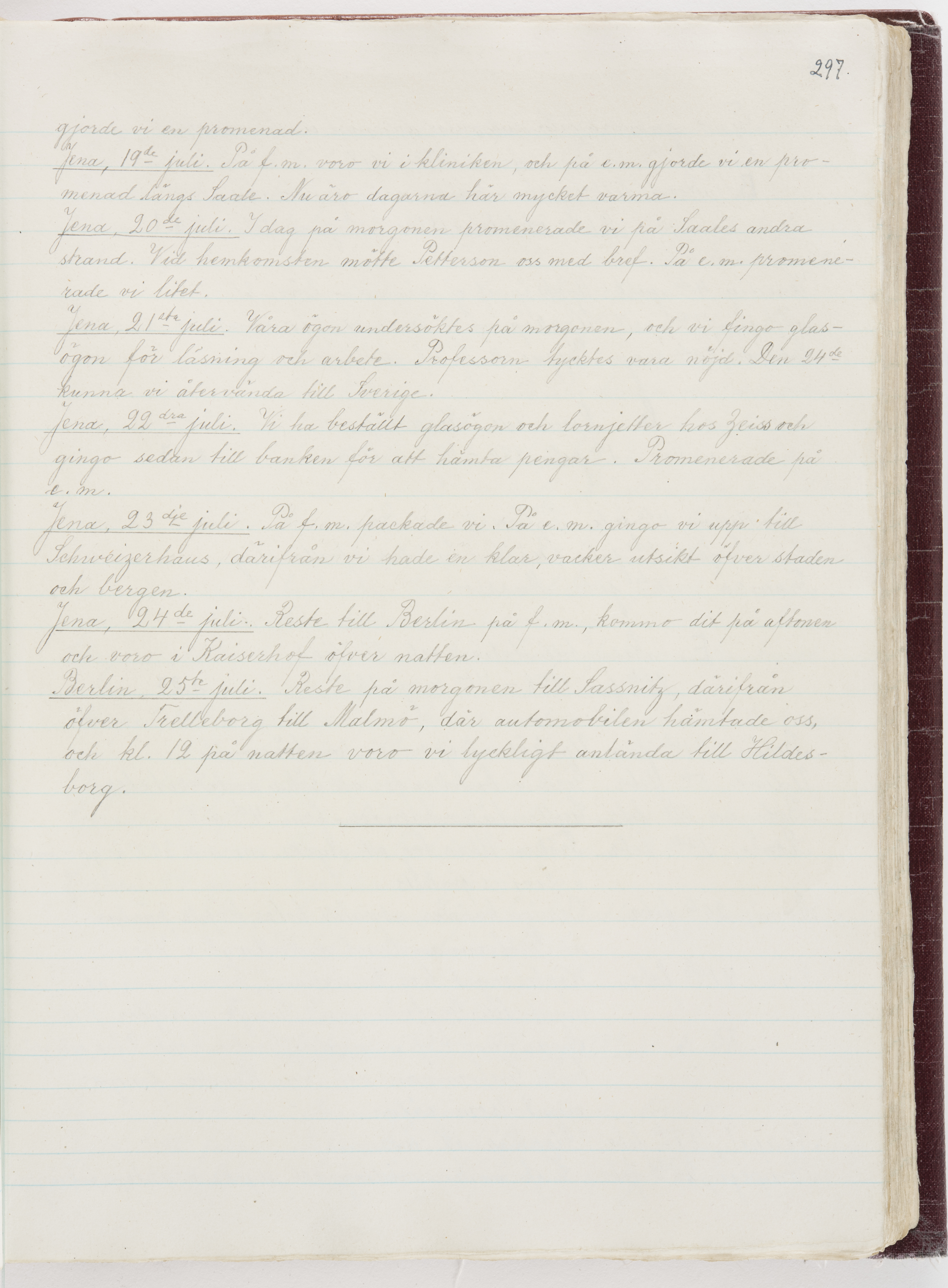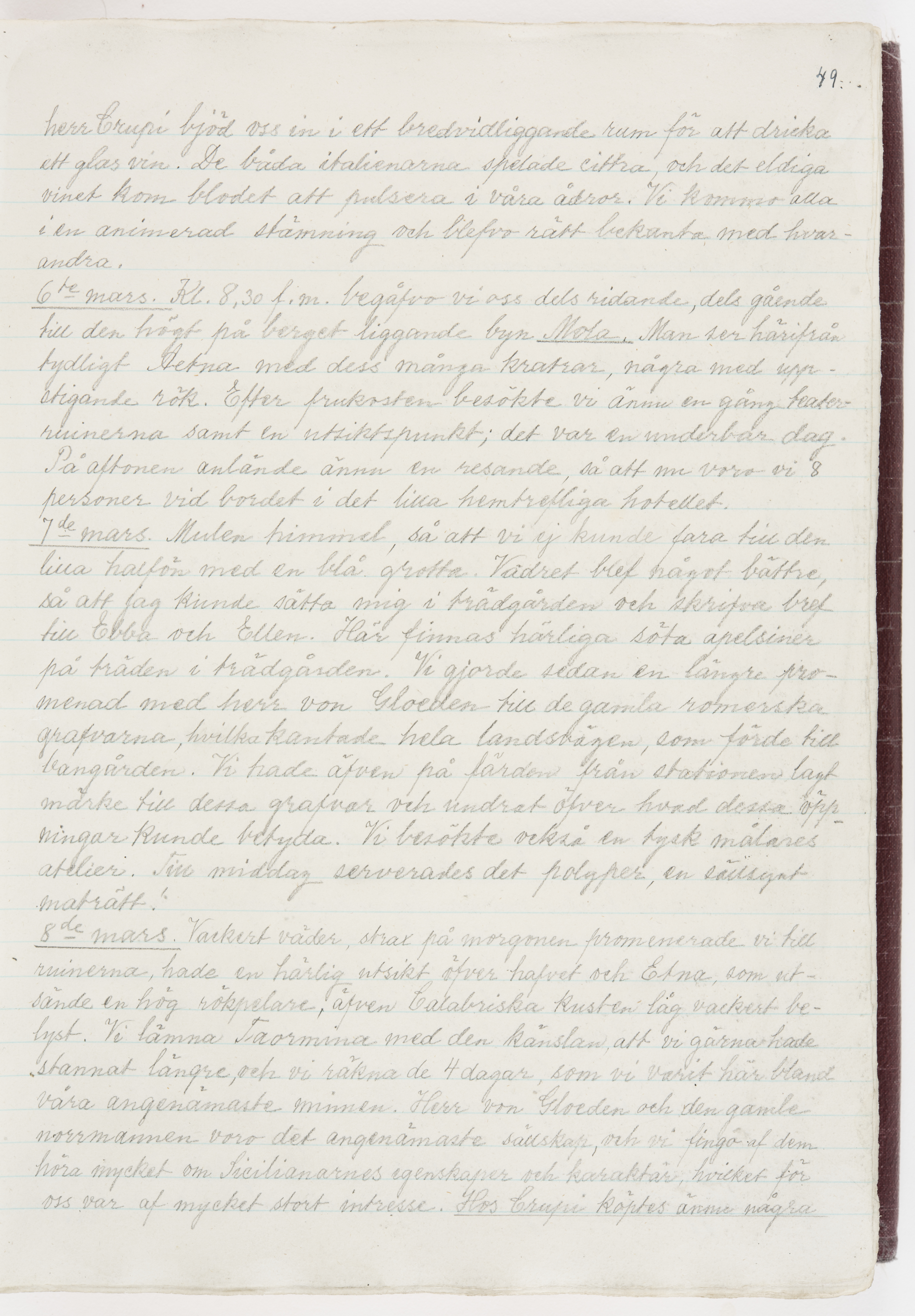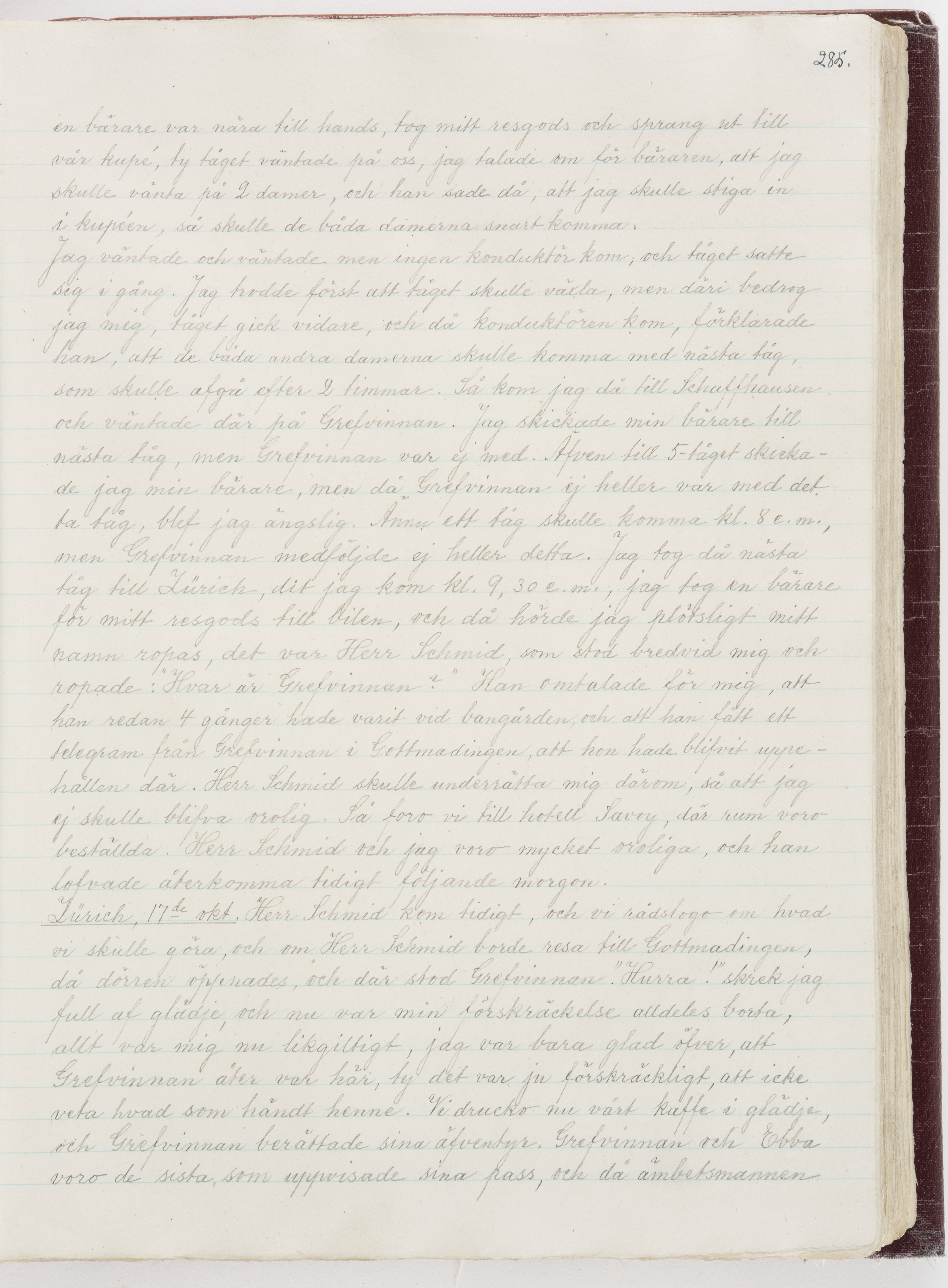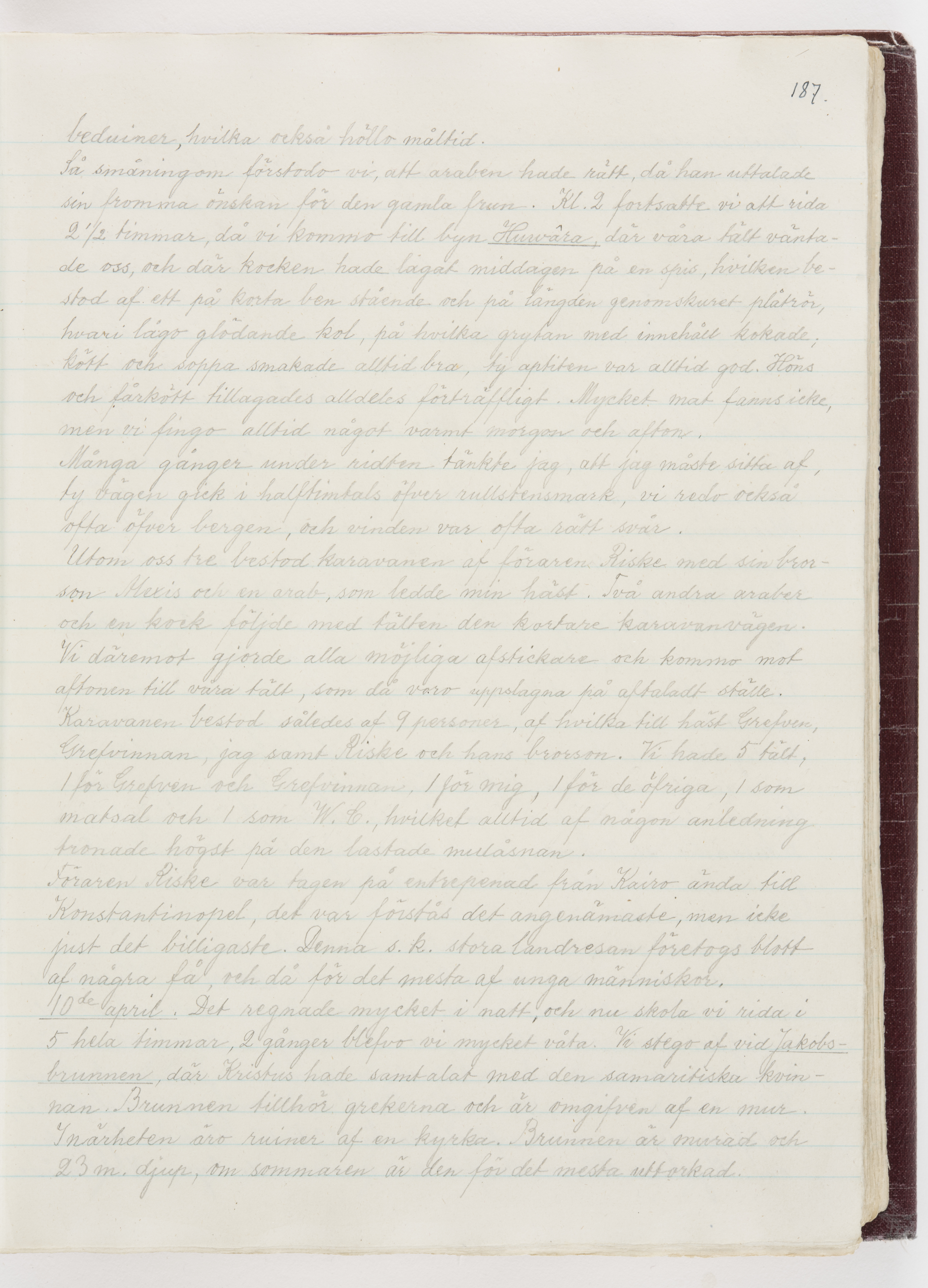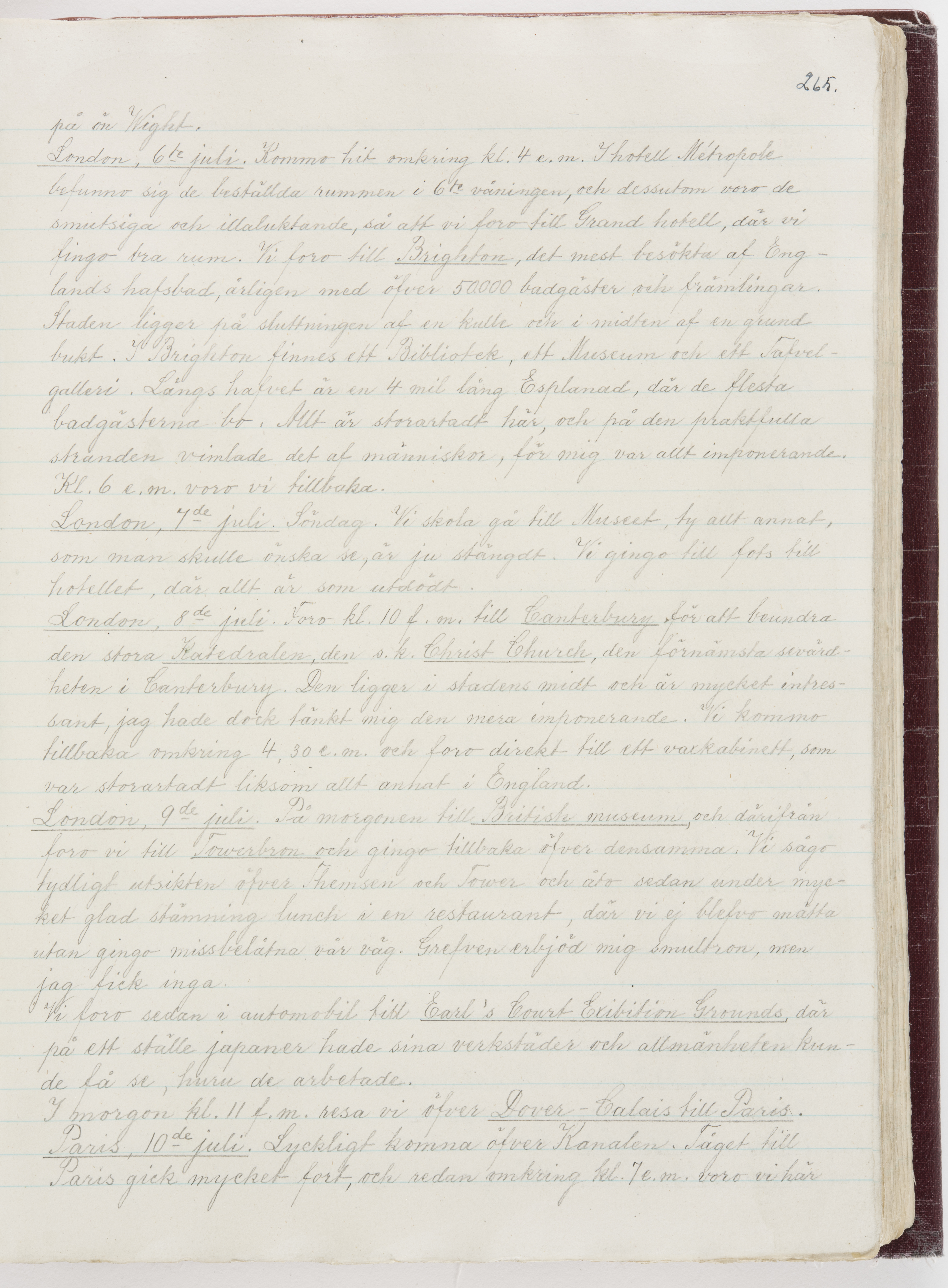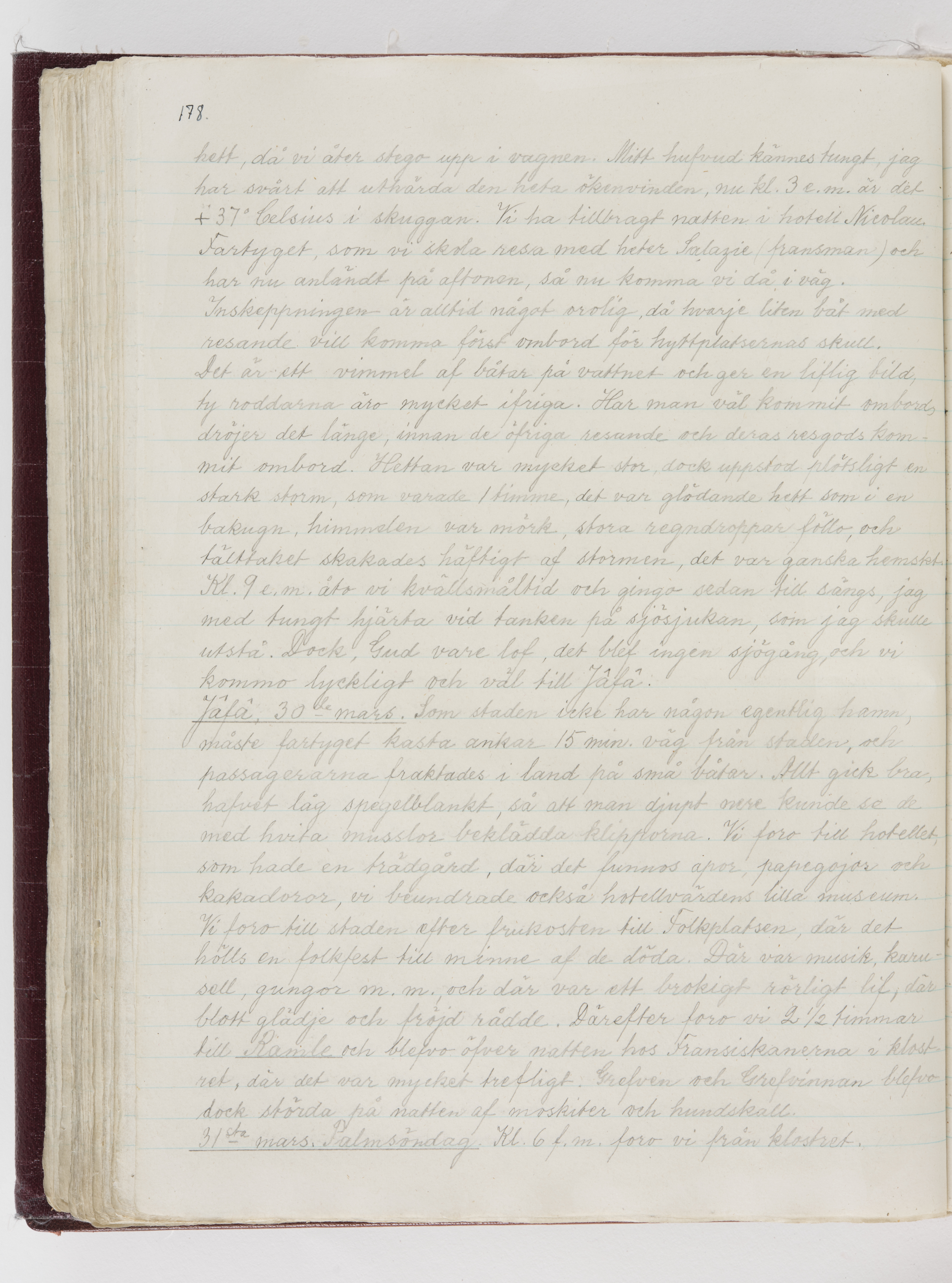 Översättning till svenska språket av dagbok skriven på tyska språket av Ida Uhse under resor tillsammans med Walther och Wilhelmina von Hallwyl åren 1880-1918 samt företeckning över fynd, gåvor och inköpta föremål under resorna åren 1881-1918. Av Signe Berglöf. 309 s. Skrivet med blyerts. Band (helt skinn-). Av brun >>oasis morocco>>, bundet med dubble ansättning och >>knäpprygg>>. Kapitäl av gult sämskskinn. Försättsblad av läderimitationspapper i brunt och svart. Fals av röd klot. 32*25*4,8 cm. Bundet av bokbindaren Otto Olsson.