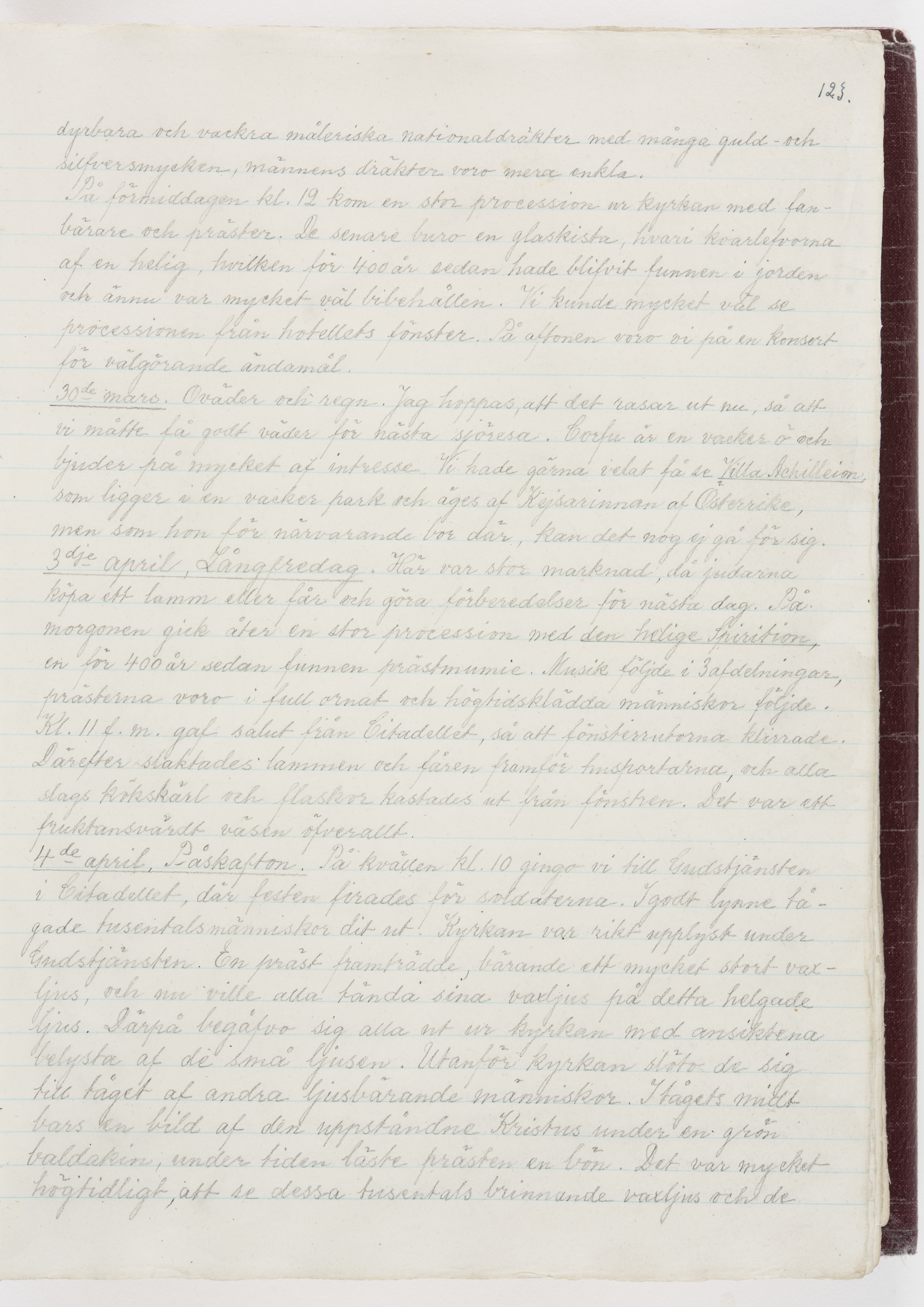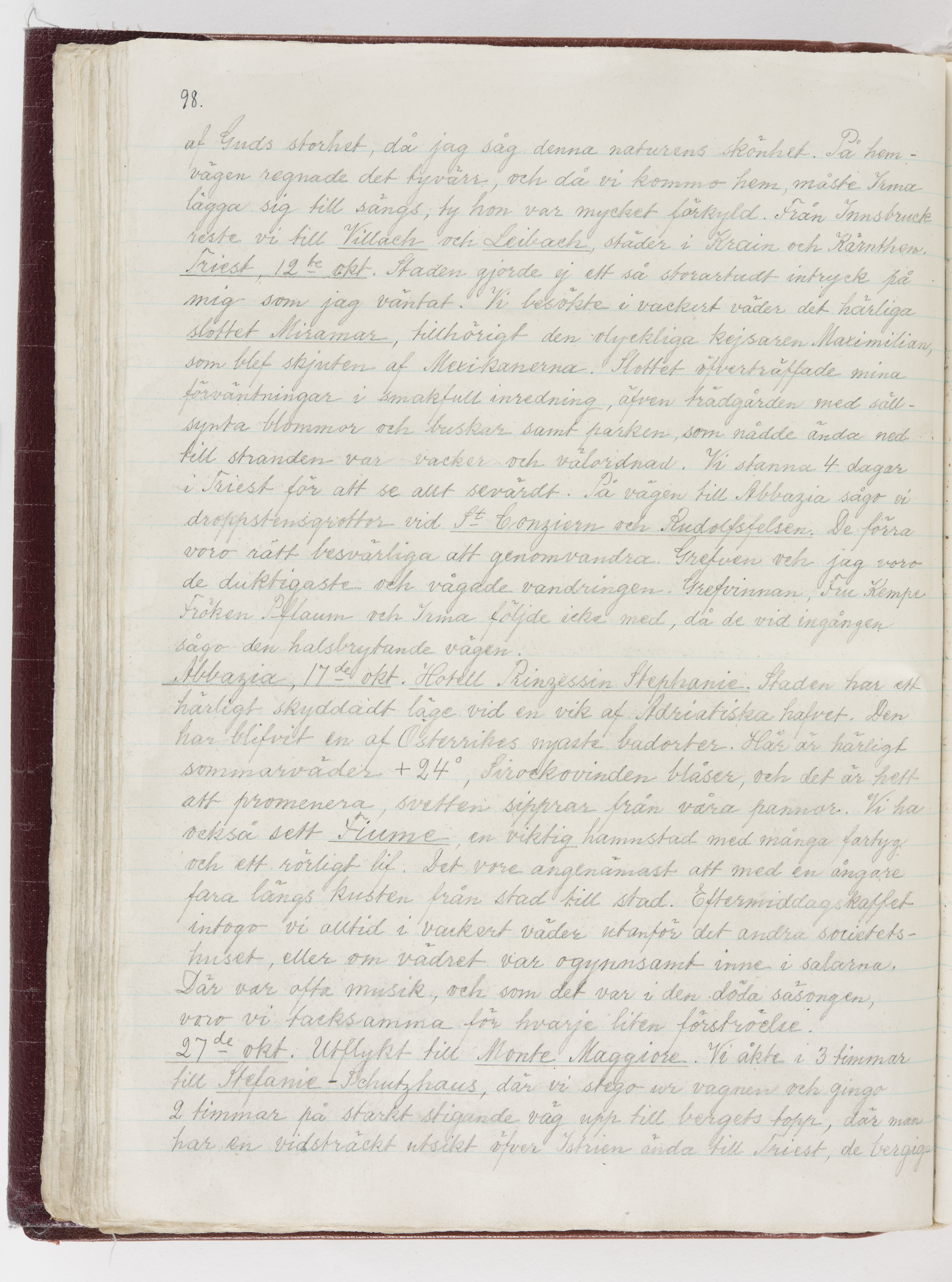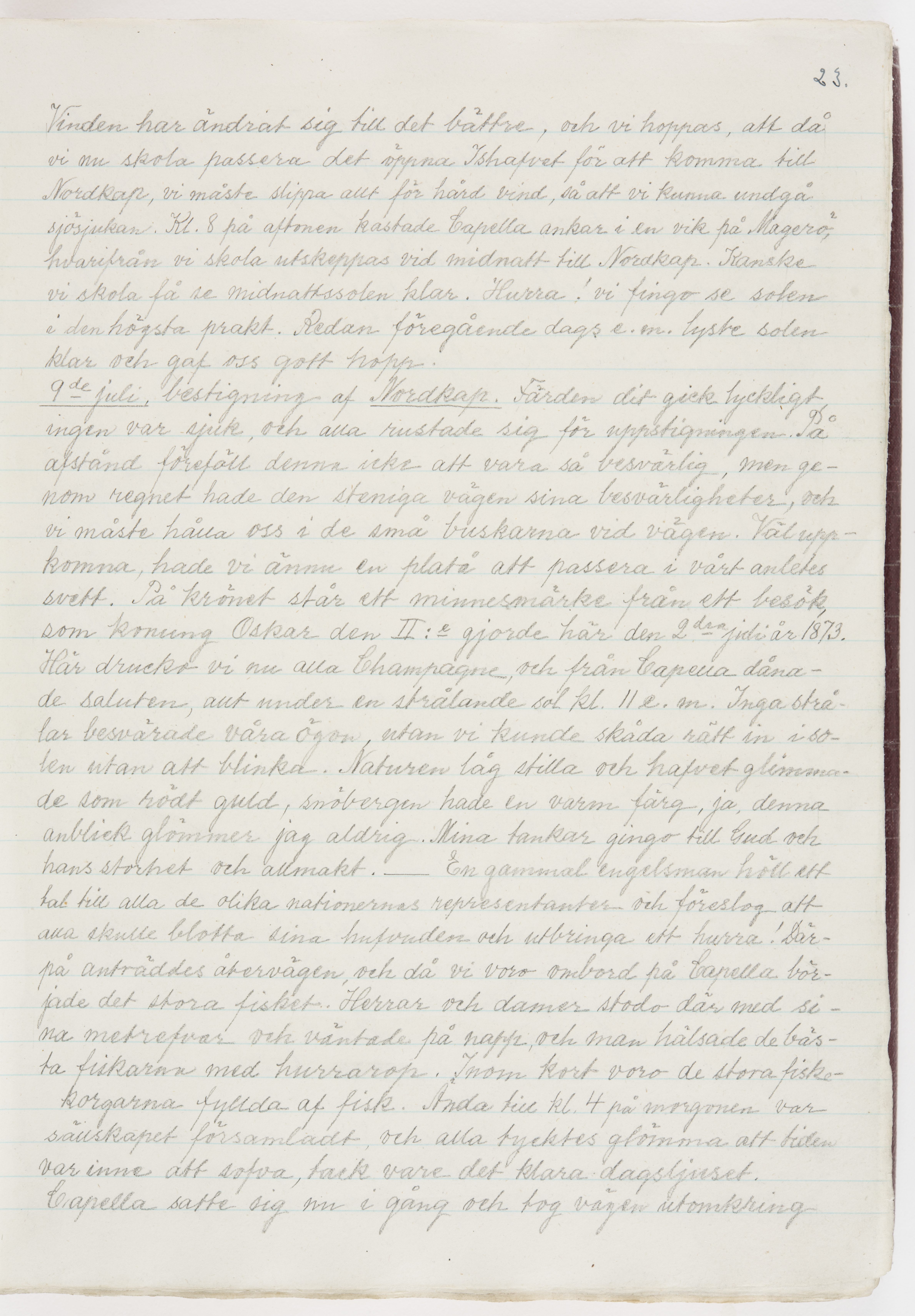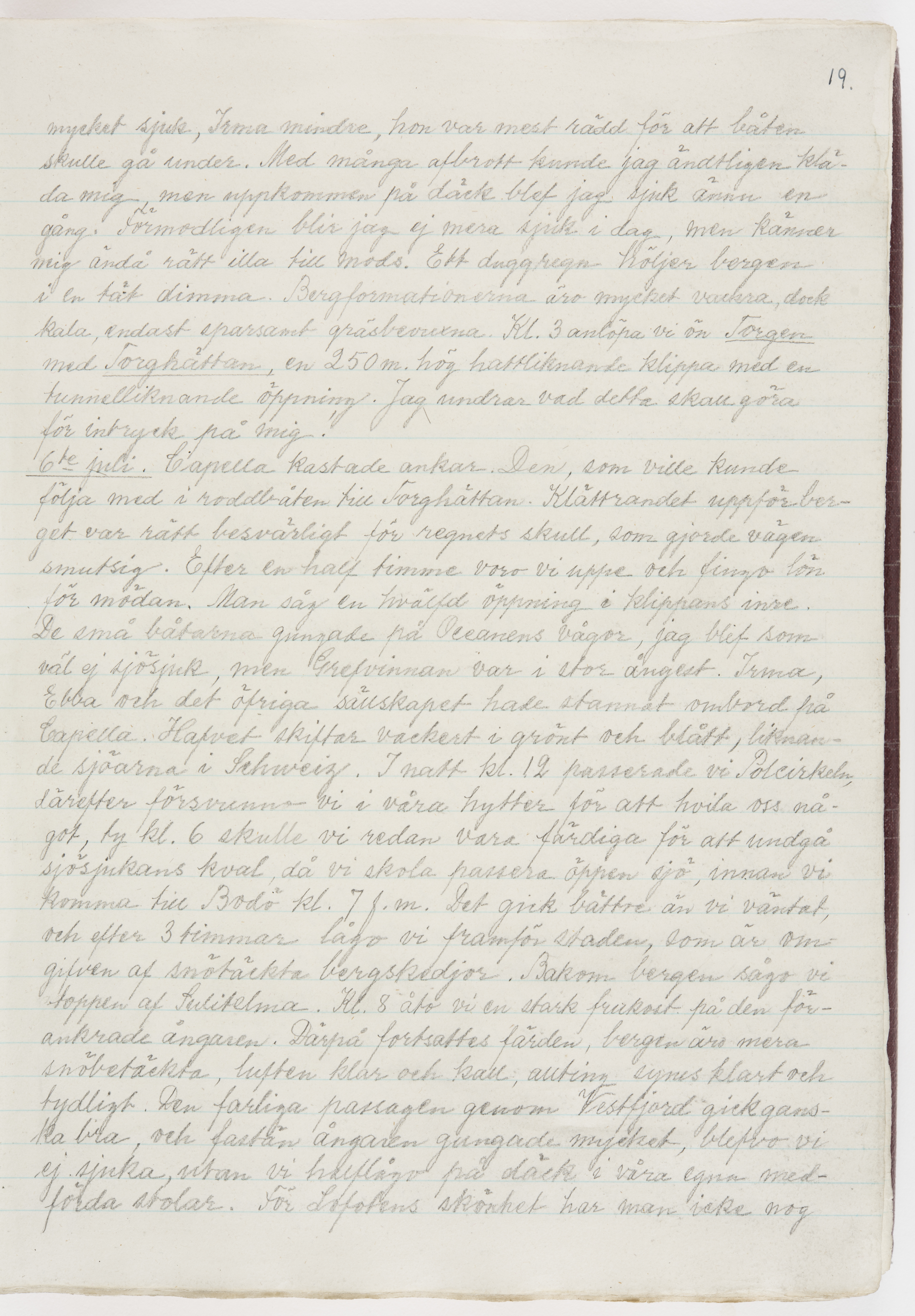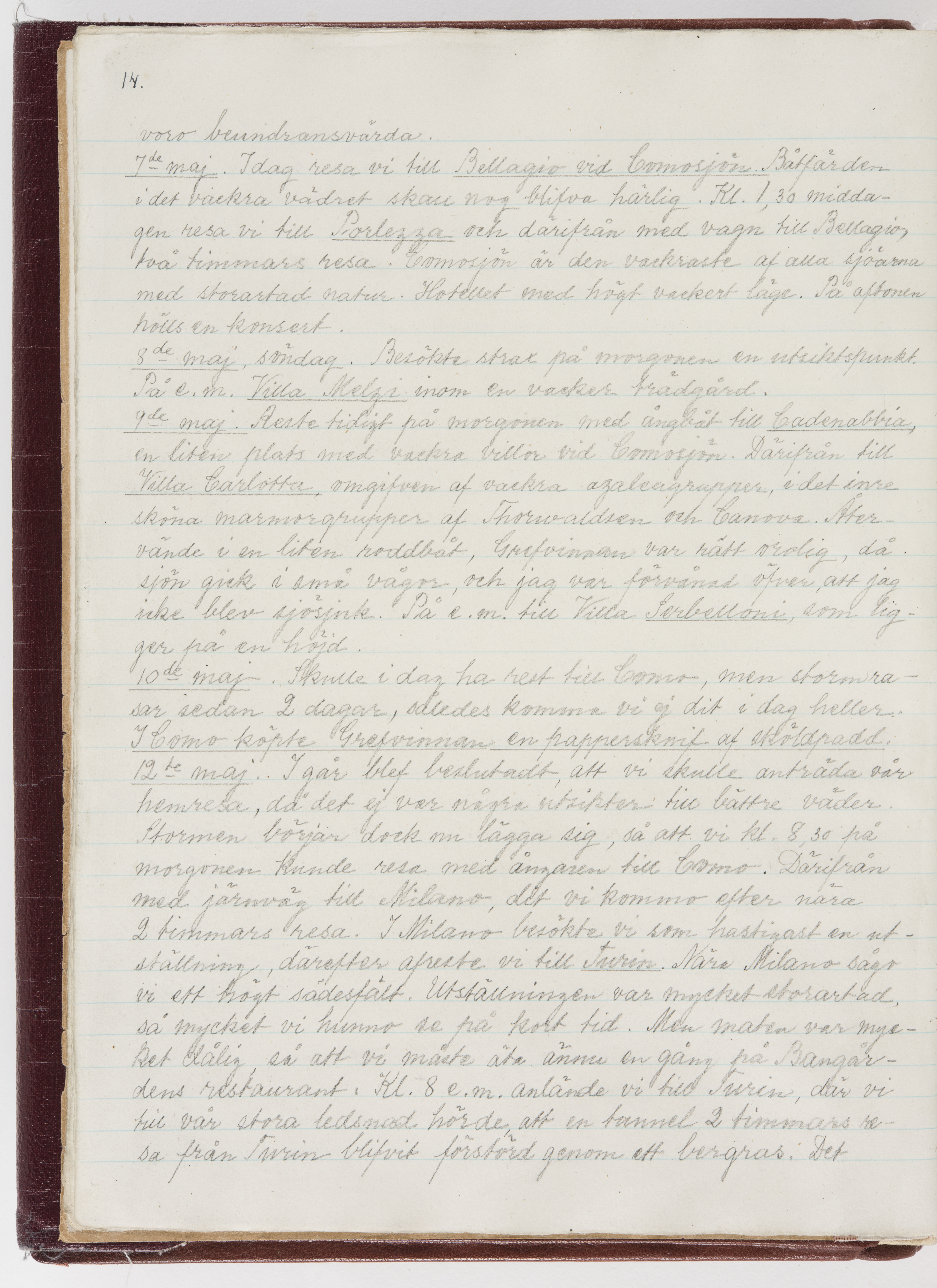 Översättning till svenska språket av dagbok skriven på tyska språket av Ida Uhse under resor tillsammans med Walther och Wilhelmina von Hallwyl åren 1880-1918 samt företeckning över fynd, gåvor och inköpta föremål under resorna åren 1881-1918. Av Signe Berglöf. 309 s. Skrivet med blyerts. Band (helt skinn-). Av brun >>oasis morocco>>, bundet med dubble ansättning och >>knäpprygg>>. Kapitäl av gult sämskskinn. Försättsblad av läderimitationspapper i brunt och svart. Fals av röd klot. 32*25*4,8 cm. Bundet av bokbindaren Otto Olsson.