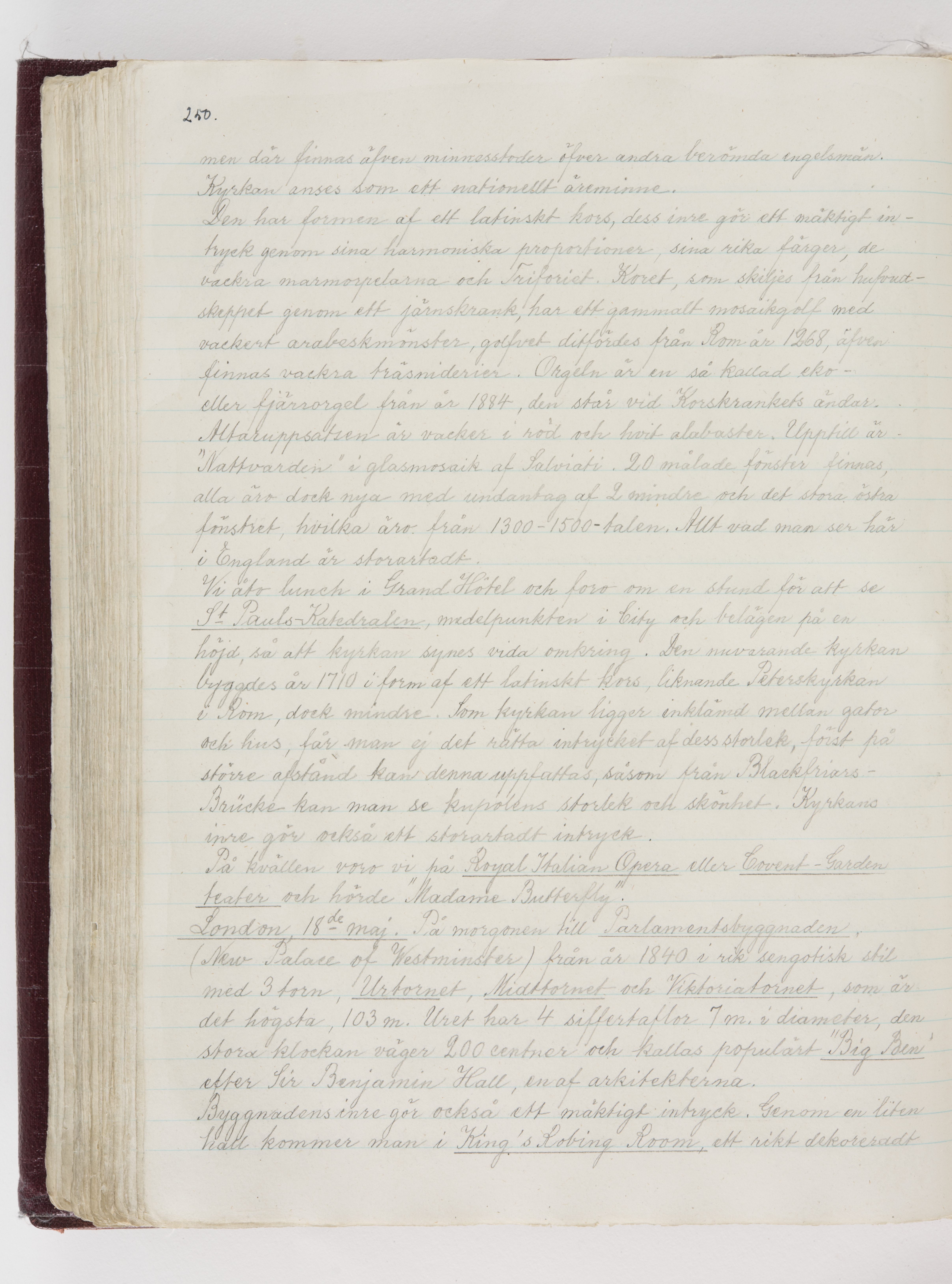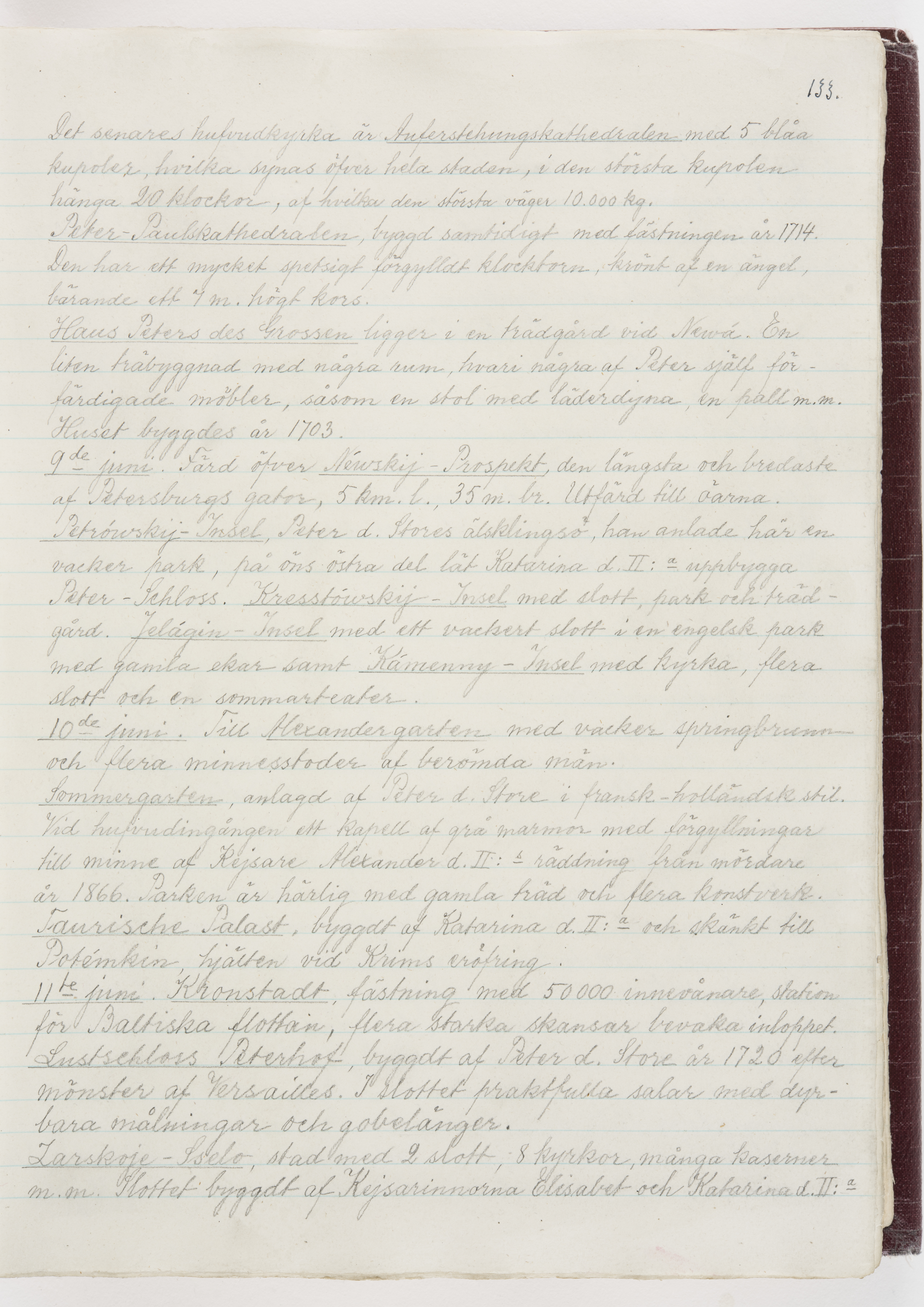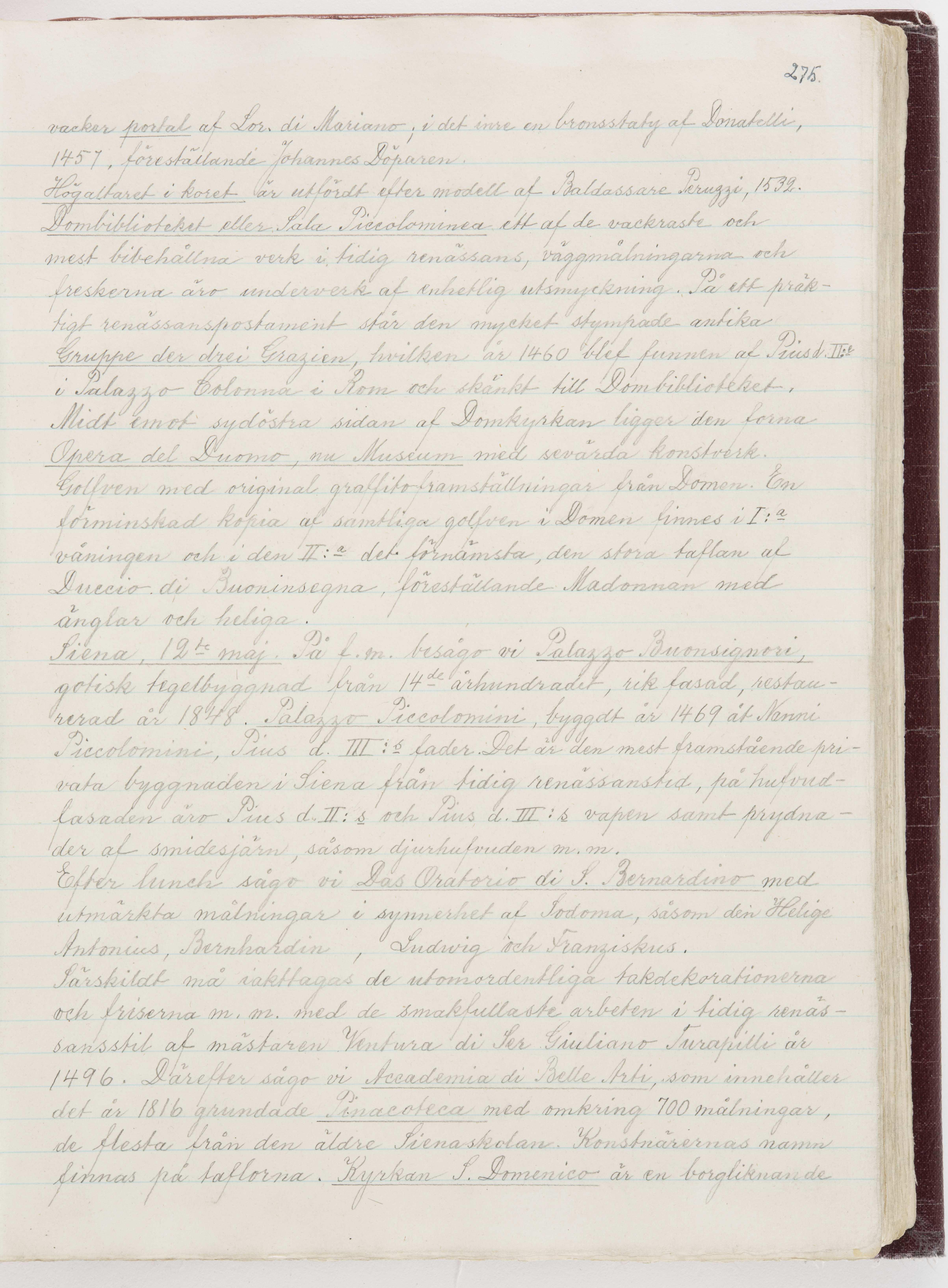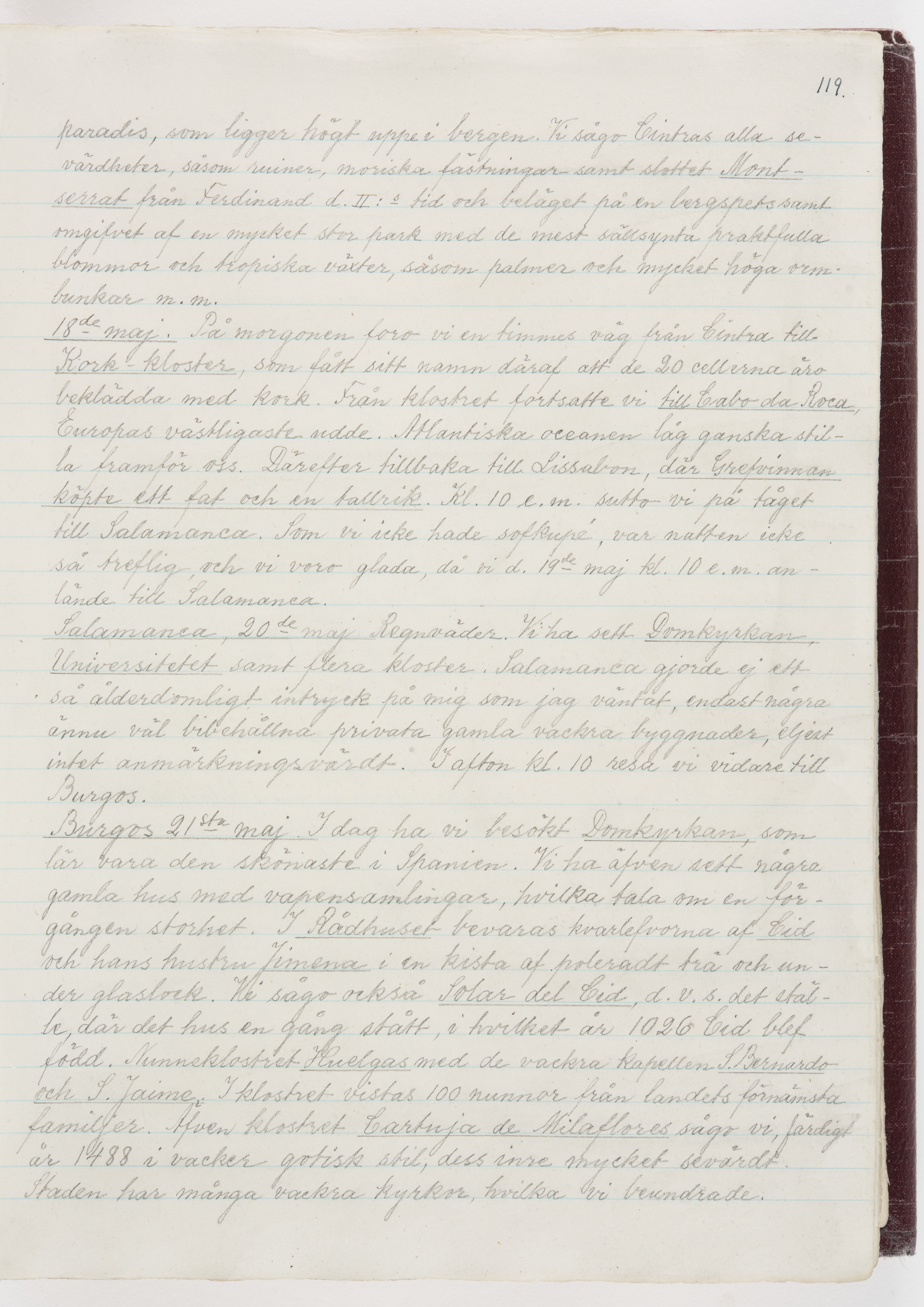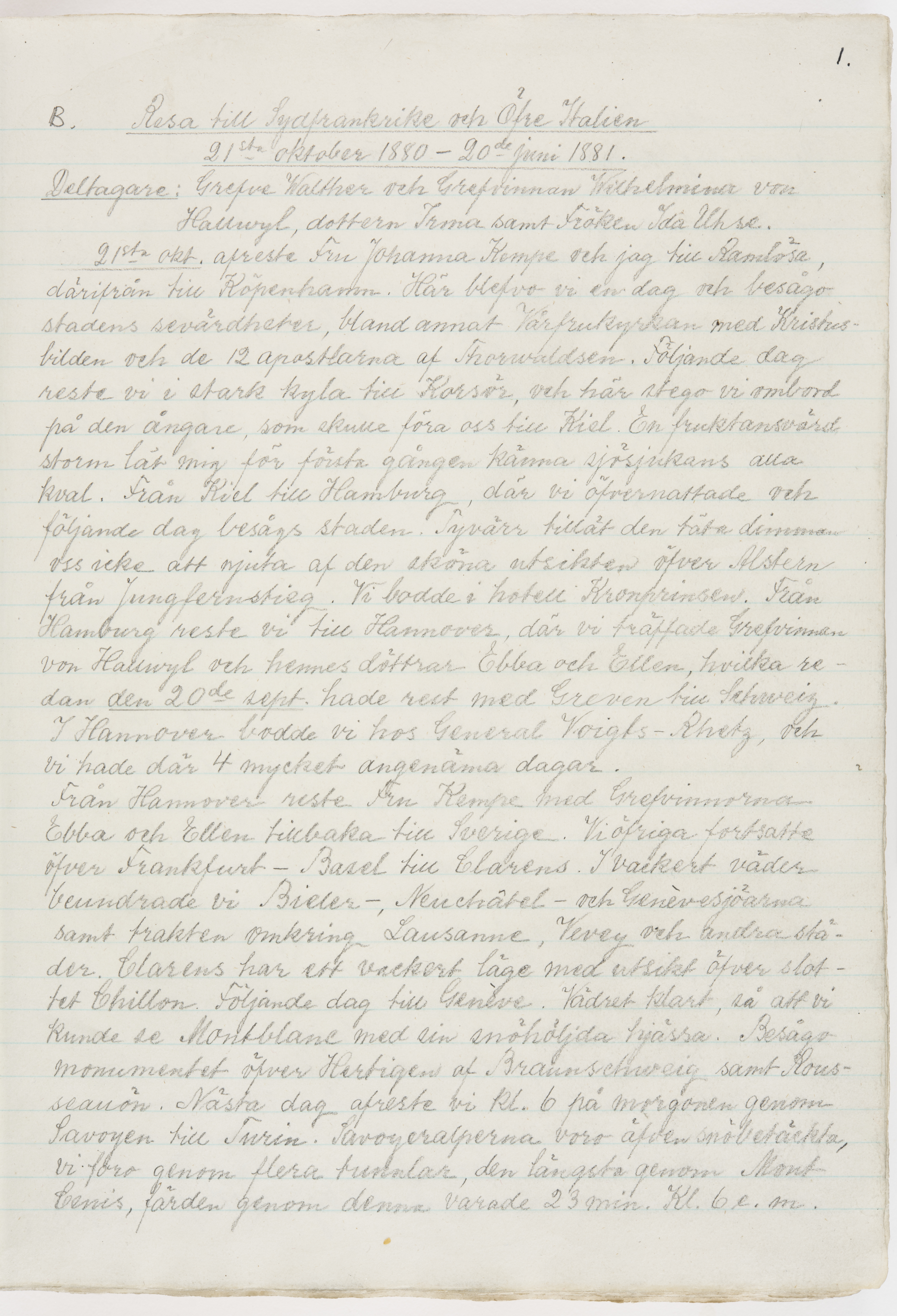 Översättning till svenska språket av dagbok skriven på tyska språket av Ida Uhse under resor tillsammans med Walther och Wilhelmina von Hallwyl åren 1880-1918 samt företeckning över fynd, gåvor och inköpta föremål under resorna åren 1881-1918. Av Signe Berglöf. 309 s. Skrivet med blyerts. Band (helt skinn-). Av brun >>oasis morocco>>, bundet med dubble ansättning och >>knäpprygg>>. Kapitäl av gult sämskskinn. Försättsblad av läderimitationspapper i brunt och svart. Fals av röd klot. 32*25*4,8 cm. Bundet av bokbindaren Otto Olsson.