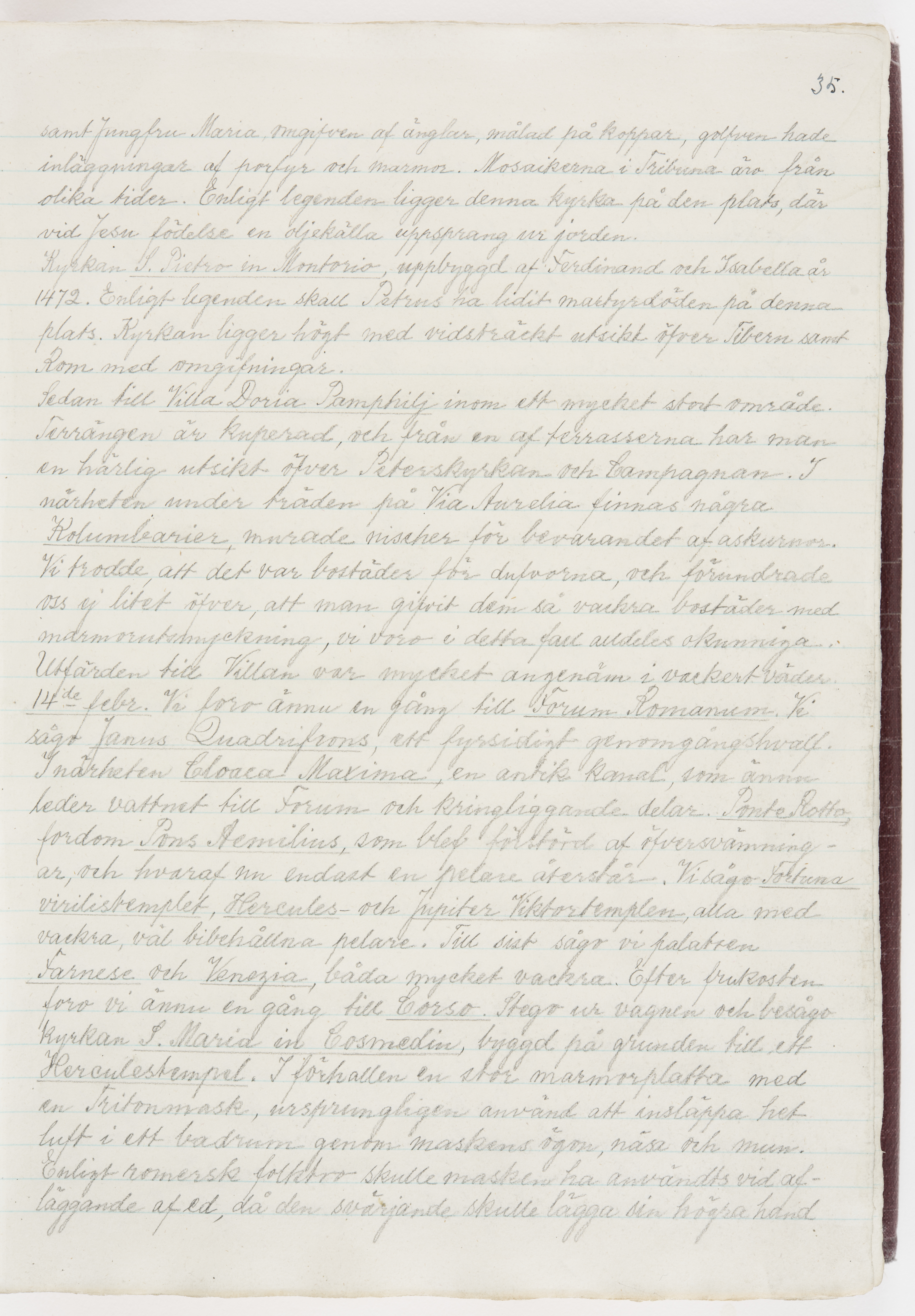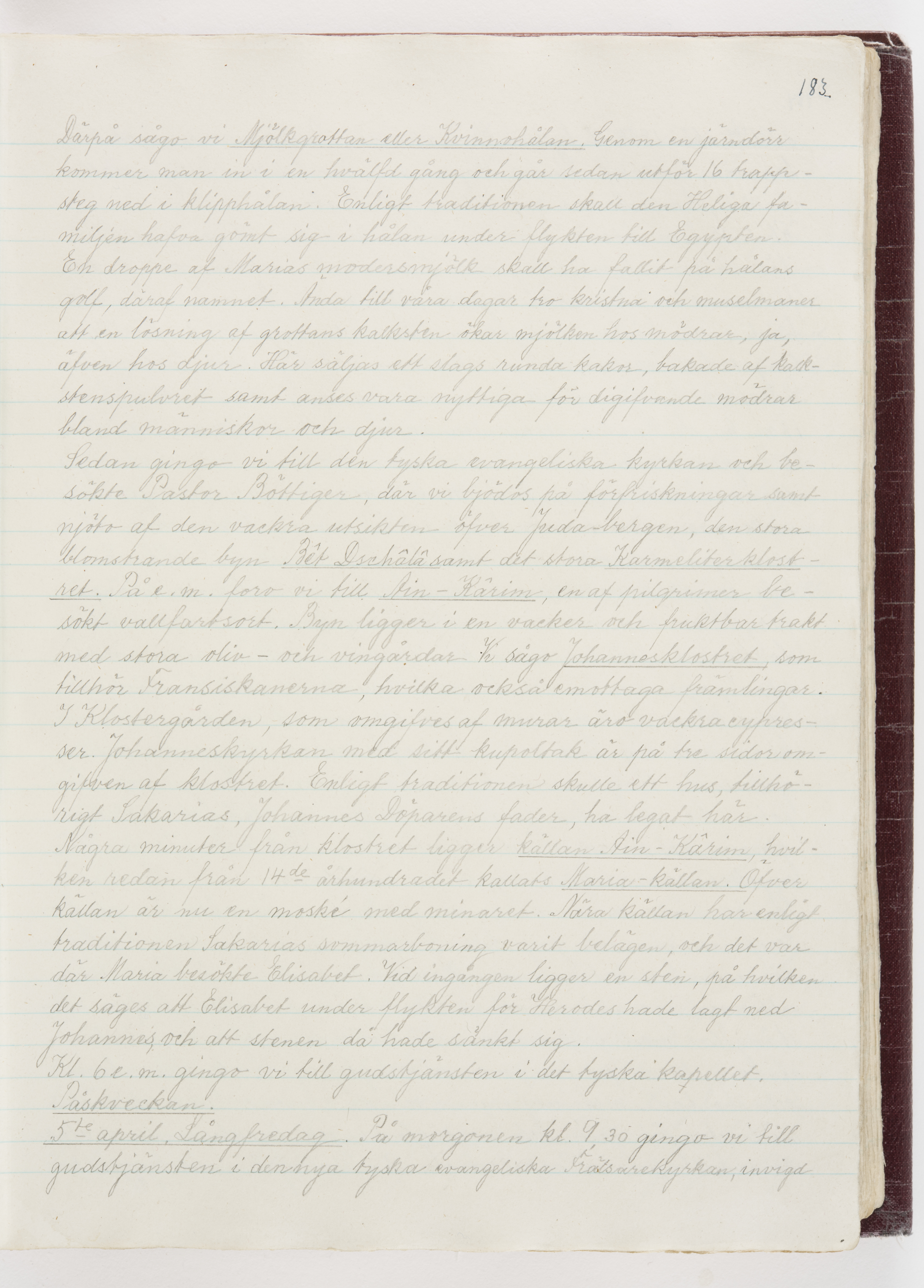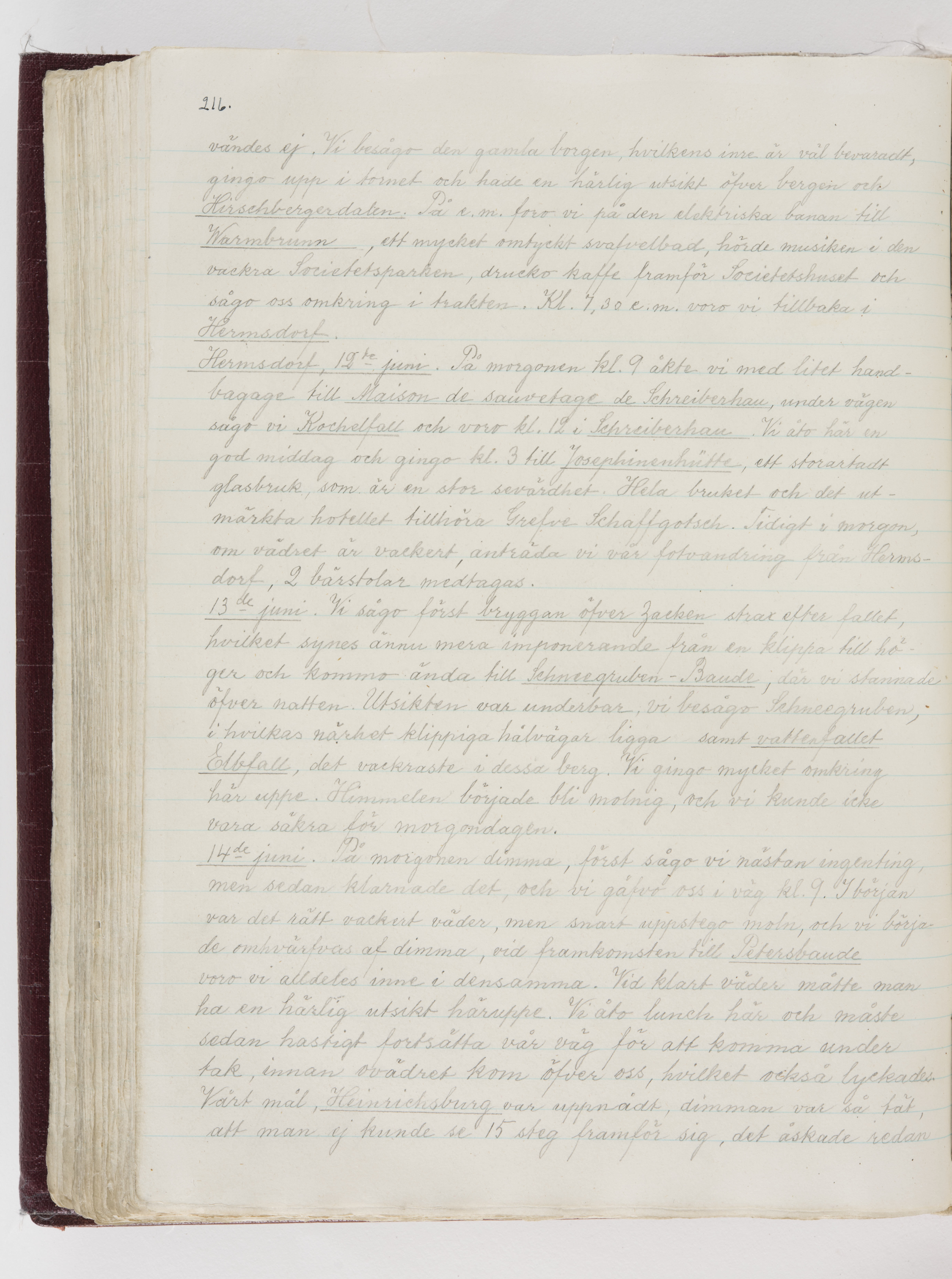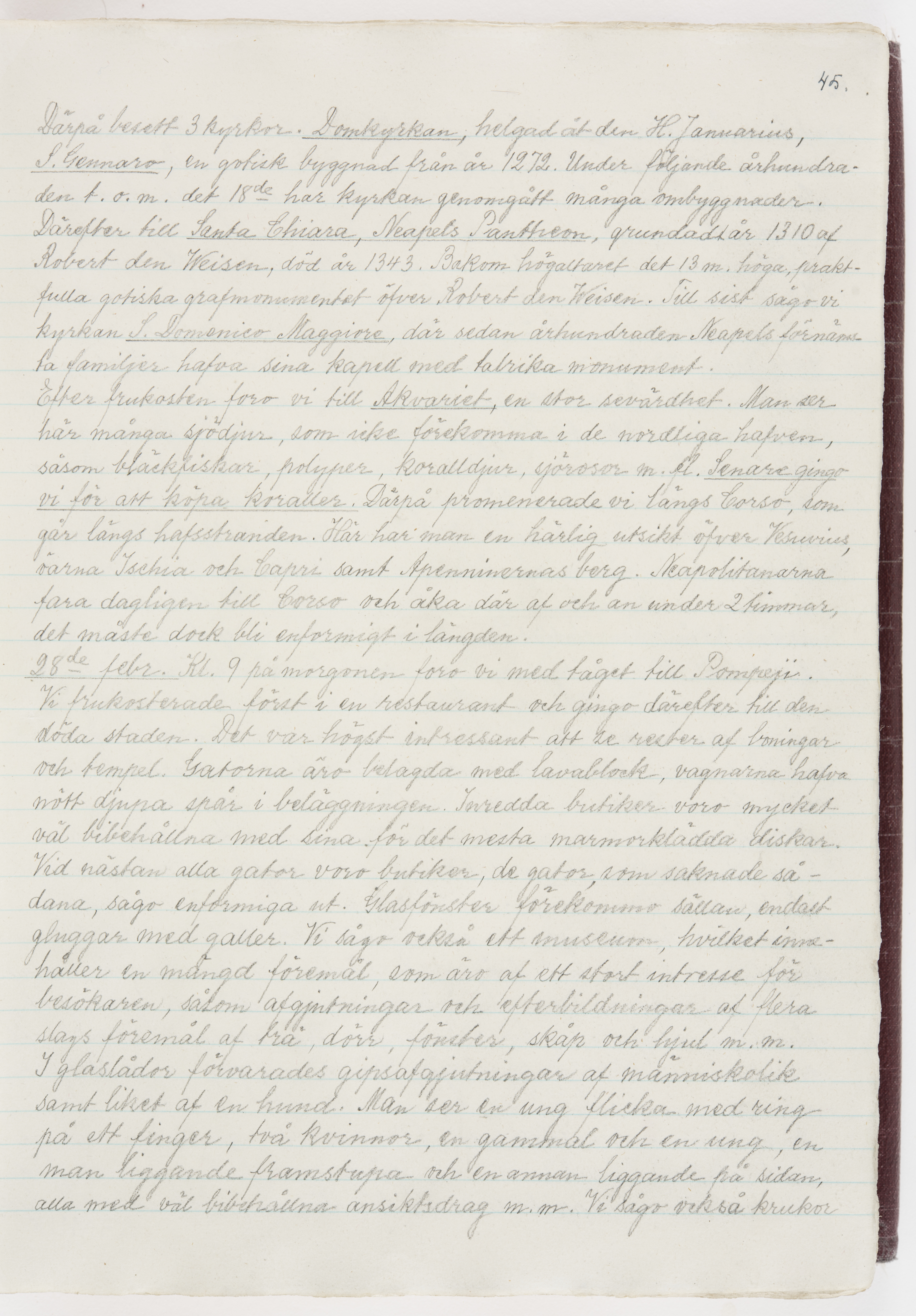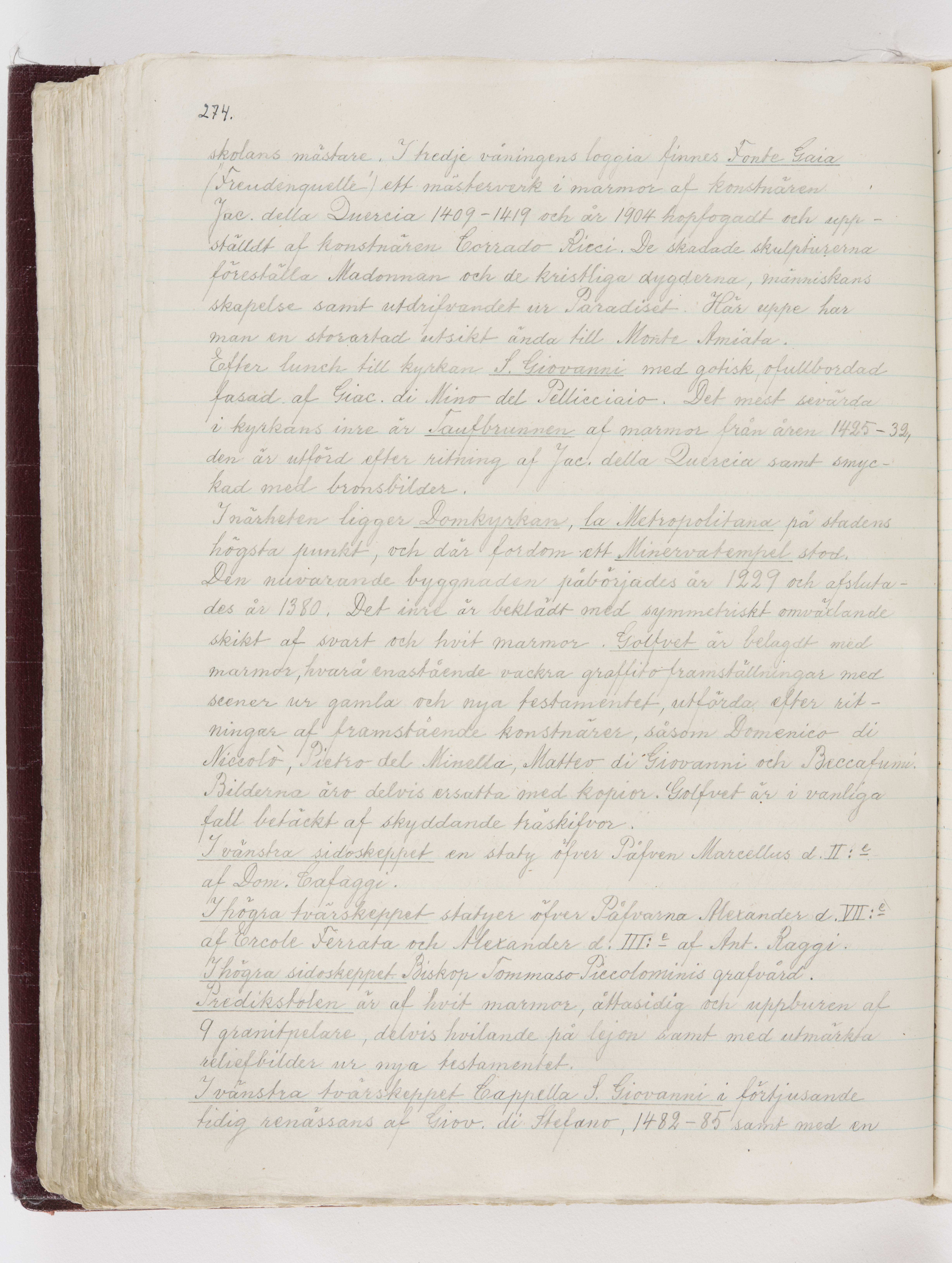 Översättning till svenska språket av dagbok skriven på tyska språket av Ida Uhse under resor tillsammans med Walther och Wilhelmina von Hallwyl åren 1880-1918 samt företeckning över fynd, gåvor och inköpta föremål under resorna åren 1881-1918. Av Signe Berglöf. 309 s. Skrivet med blyerts. Band (helt skinn-). Av brun >>oasis morocco>>, bundet med dubble ansättning och >>knäpprygg>>. Kapitäl av gult sämskskinn. Försättsblad av läderimitationspapper i brunt och svart. Fals av röd klot. 32*25*4,8 cm. Bundet av bokbindaren Otto Olsson.