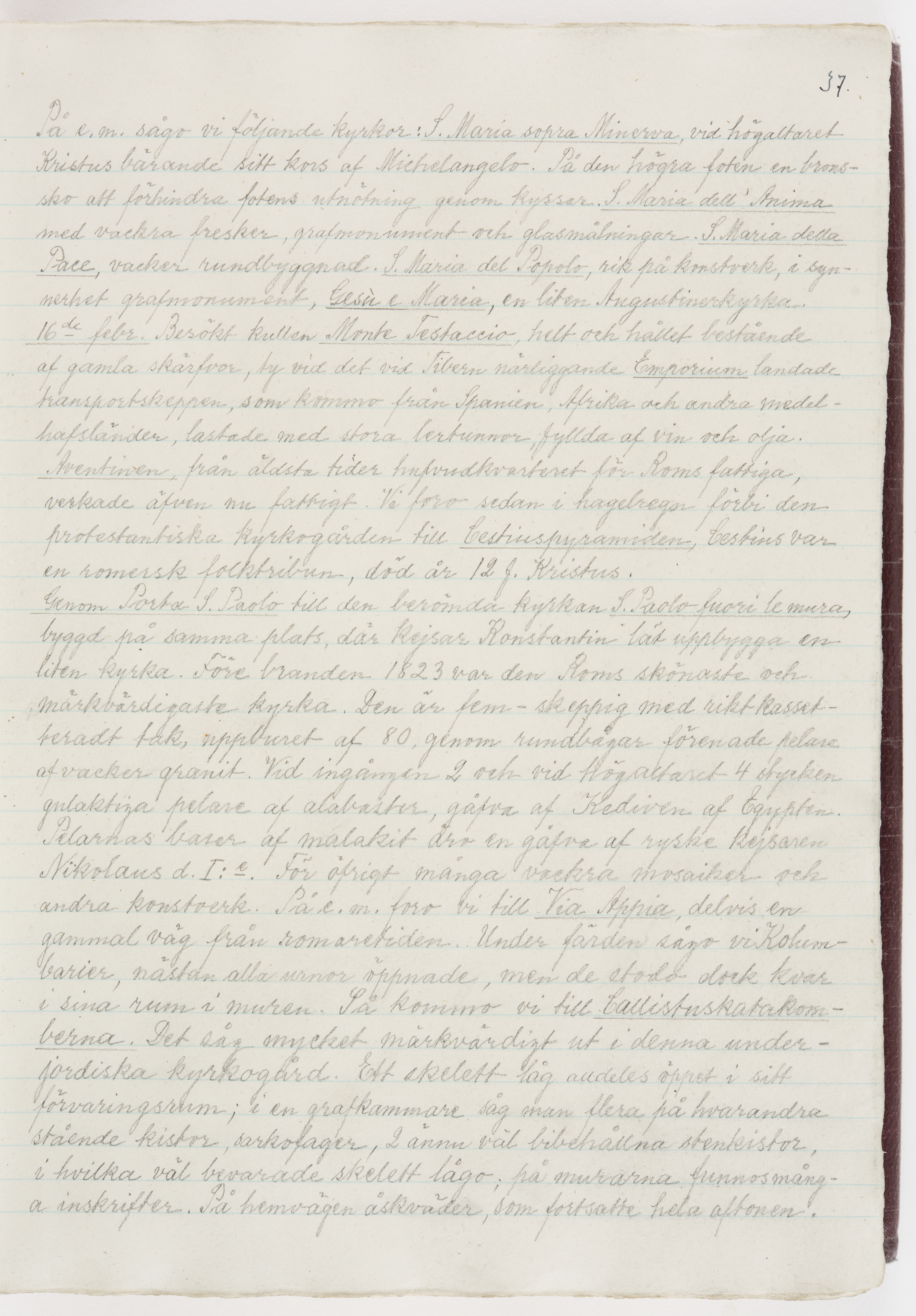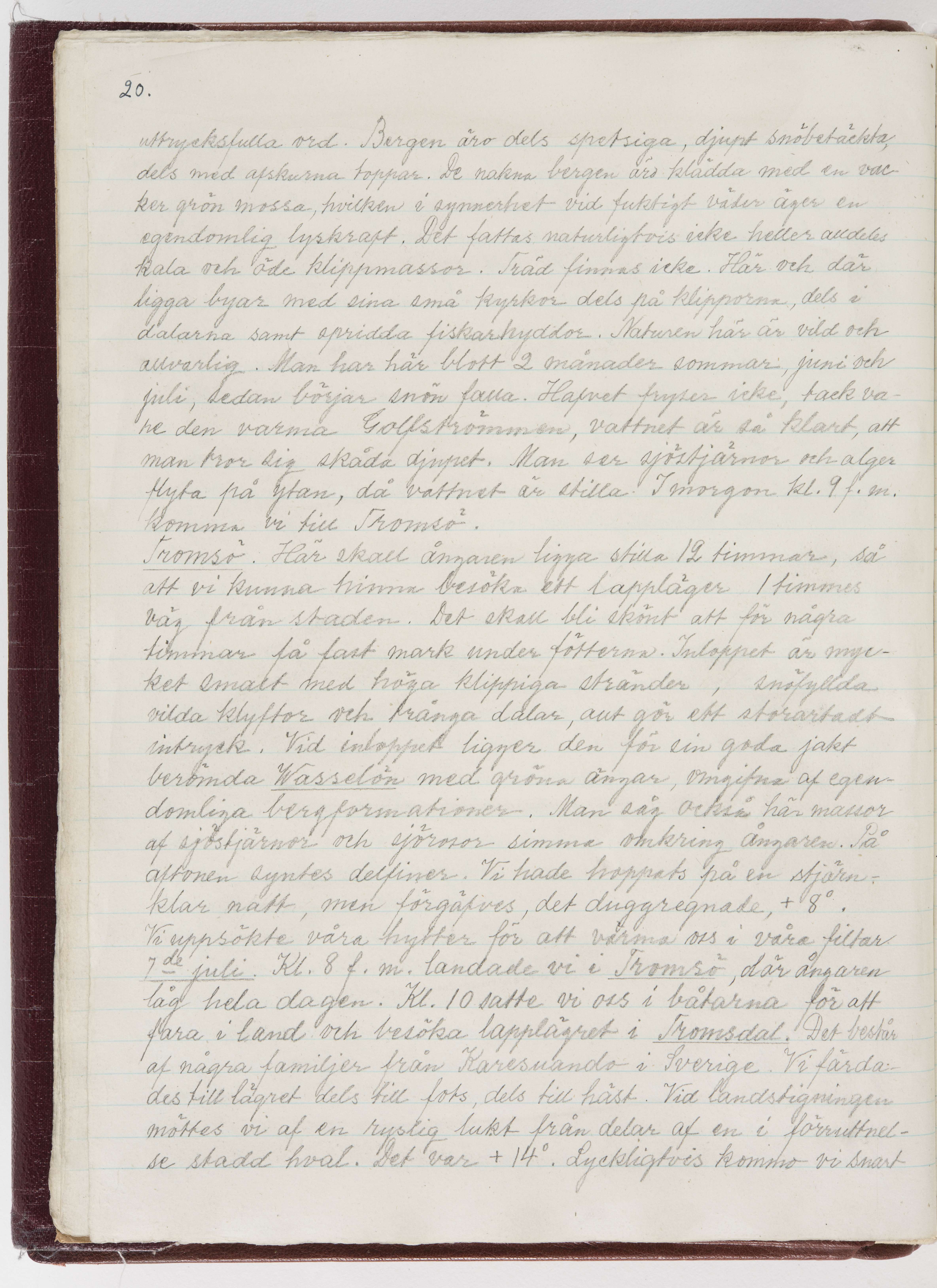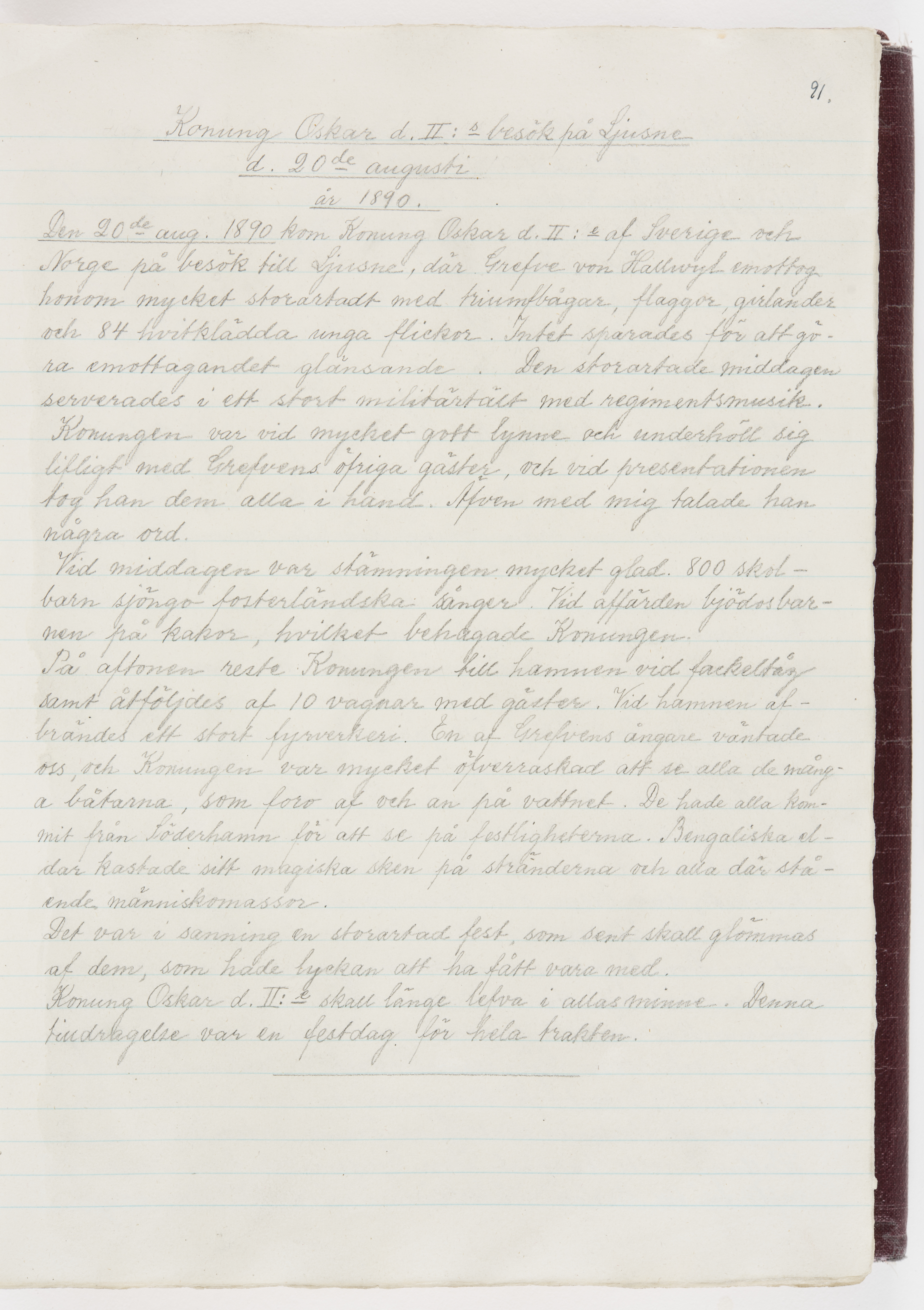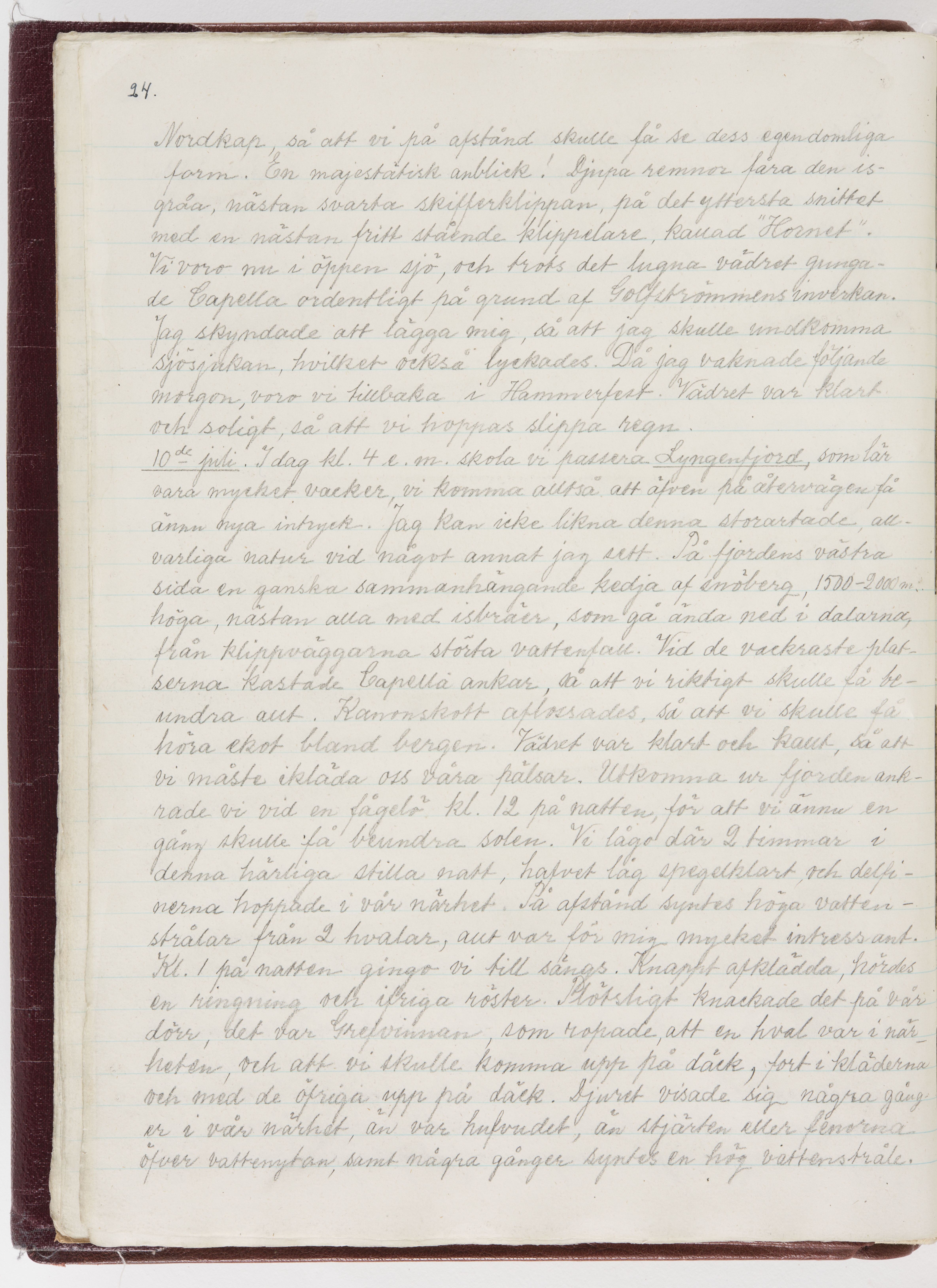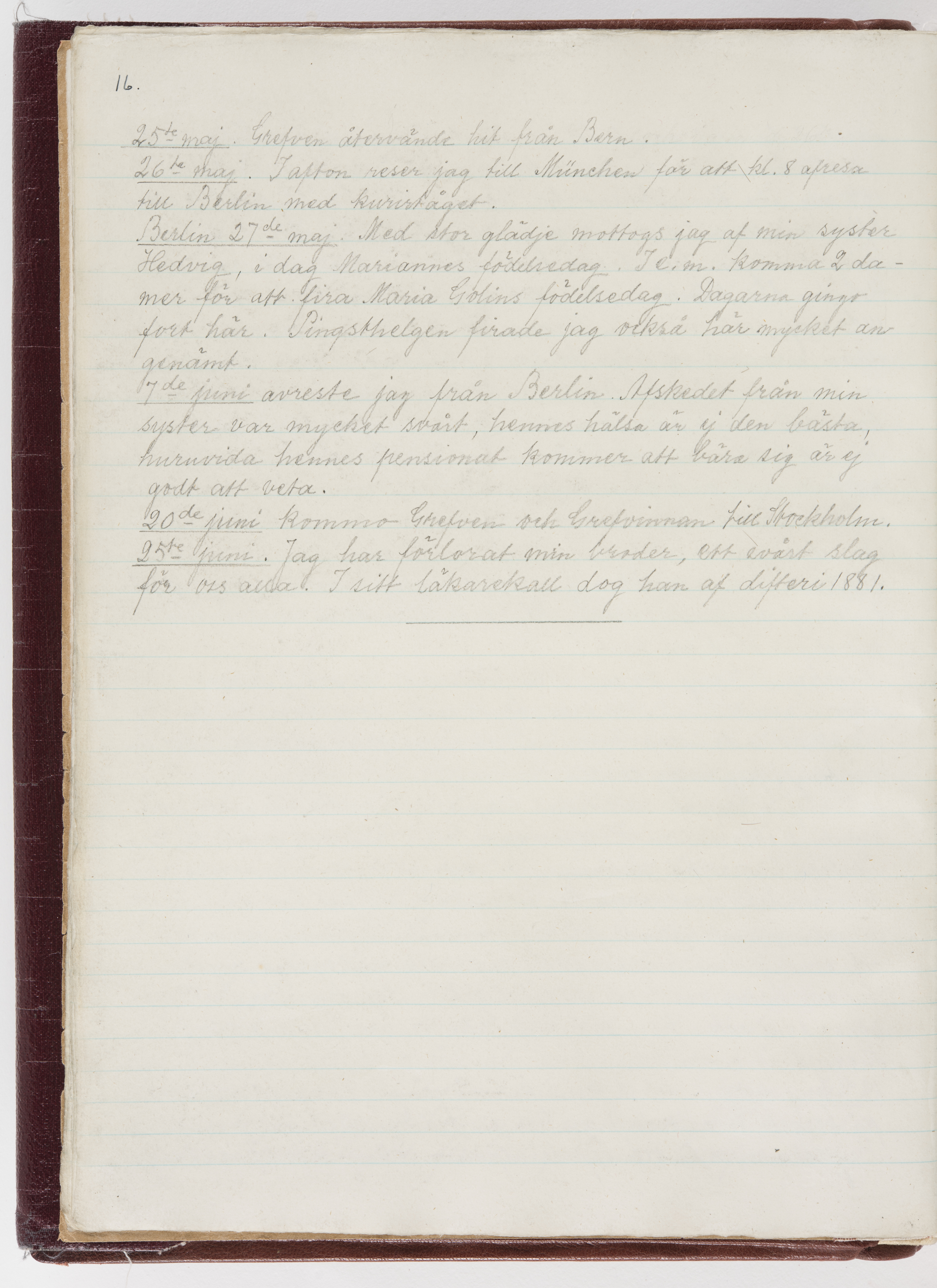 Översättning till svenska språket av dagbok skriven på tyska språket av Ida Uhse under resor tillsammans med Walther och Wilhelmina von Hallwyl åren 1880-1918 samt företeckning över fynd, gåvor och inköpta föremål under resorna åren 1881-1918. Av Signe Berglöf. 309 s. Skrivet med blyerts. Band (helt skinn-). Av brun >>oasis morocco>>, bundet med dubble ansättning och >>knäpprygg>>. Kapitäl av gult sämskskinn. Försättsblad av läderimitationspapper i brunt och svart. Fals av röd klot. 32*25*4,8 cm. Bundet av bokbindaren Otto Olsson.