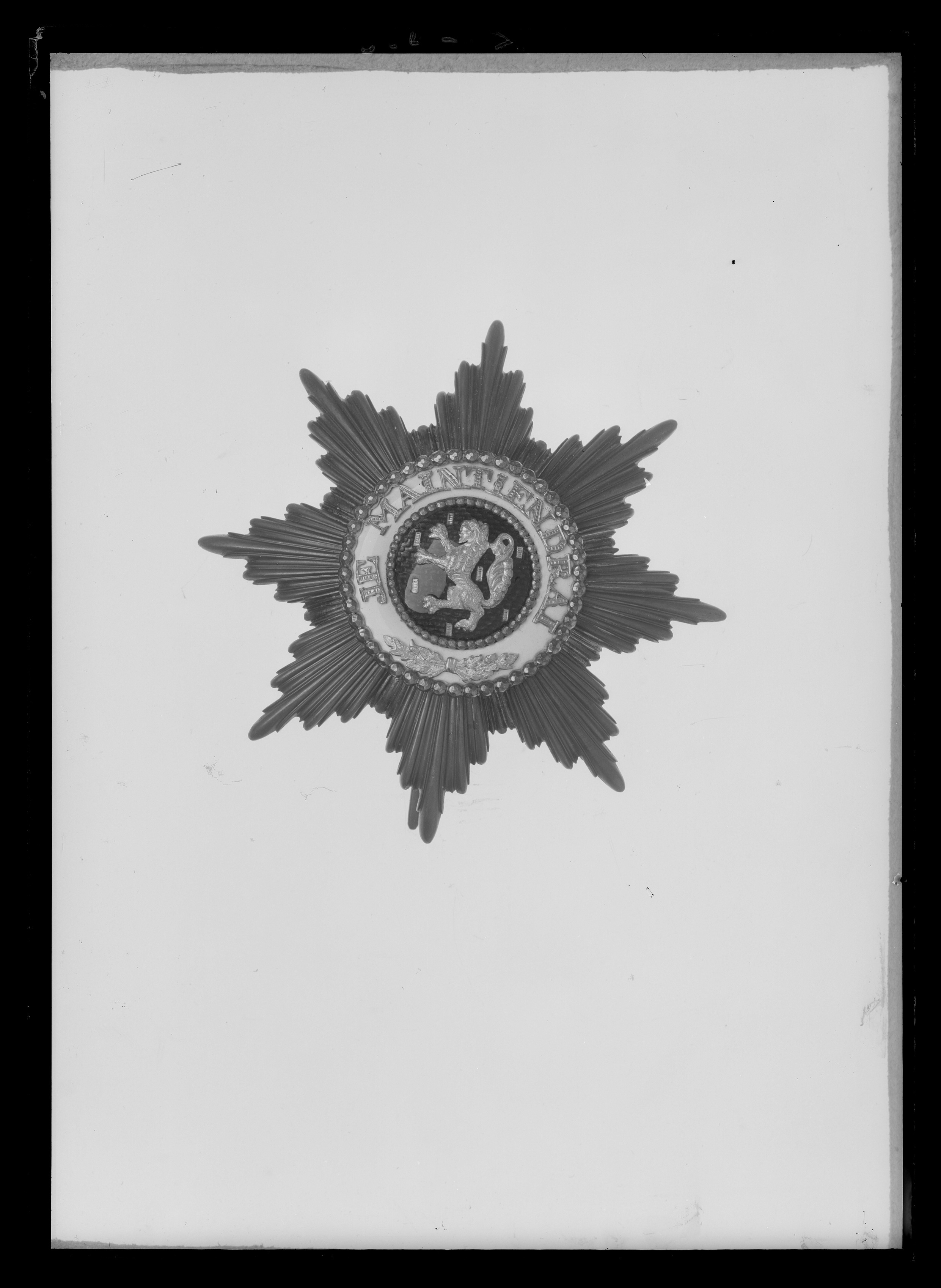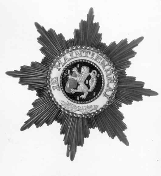 Åttauddig strålstjärna av silver, varannan stråle konvex, varannan konkav. Välvd medaljong täckt med blå emalj, därpå fäst ett lejon samt strödda biljetter av guld. Välvd vitemaljerad ring, därpå fäst guldtext: "JE // MAINTIENDRAI" samt två ekkvistar. Den vita ringen kantad av två ringar av fasetterade silverkulor. På frånsidan en oval silverplatta med relieftext: "C.M.WEISHAUPT // SÖHNE", vertikalt placerad säkerhetsnål, förstärkningar på stjärnans spetsar.