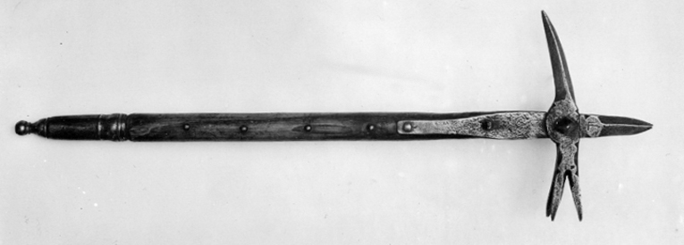 Huvud av stål med fyrsidigt mittparti, varifrån utgår kraftiga spetsar, en avbruten, en uppåtriktad ochen åt vardera sidan. Nacken utdragen i en ca 100 mm lång, svagt nedåböjd spets med fyrsidigt tvärsnitt.Den uppåtgående spetsen med stämpel i form av L. Skaft av ask, runt med en rad nitar av stål på vardera sidan. Rund, avsmalnande doppsko av stål,profilerad och avslutad i form av en kulformig knopp.