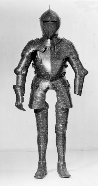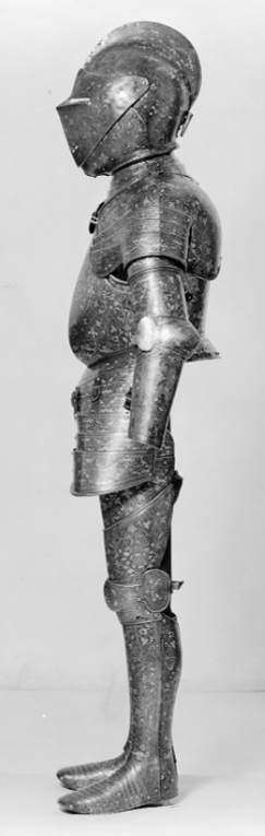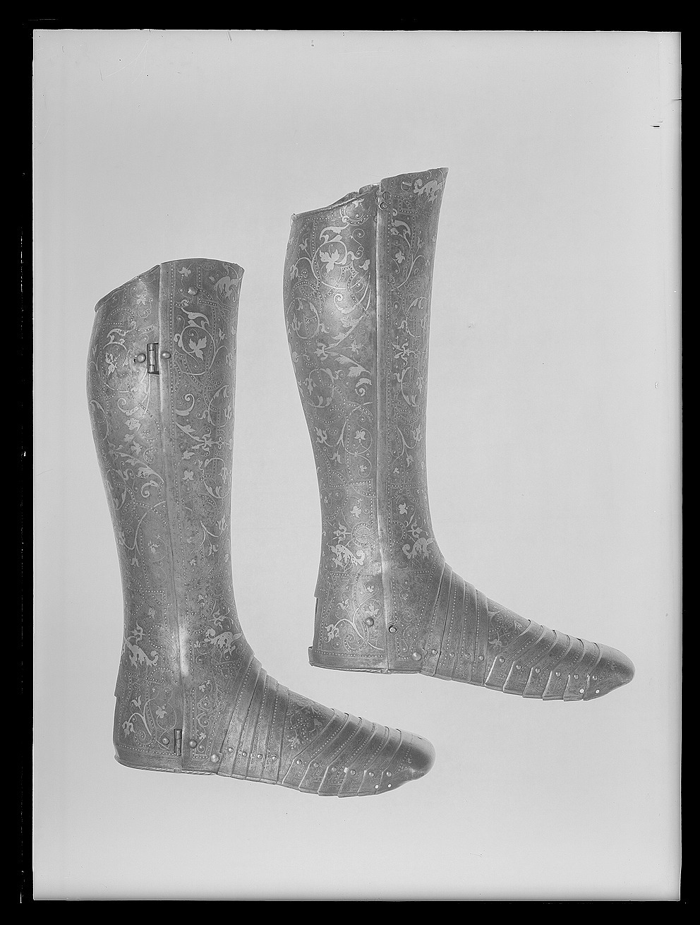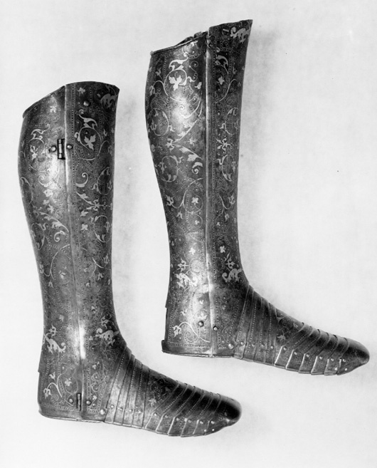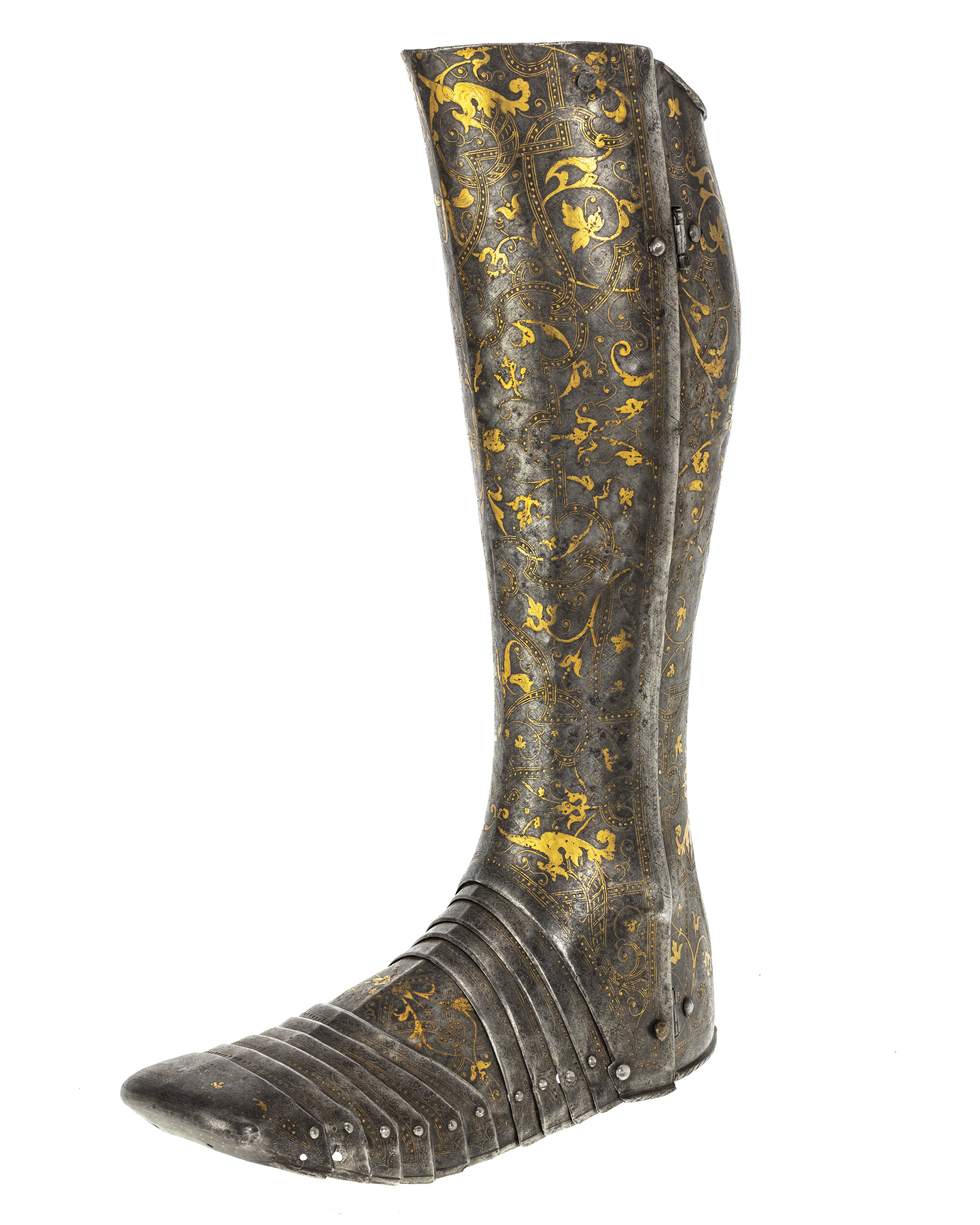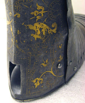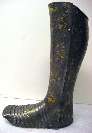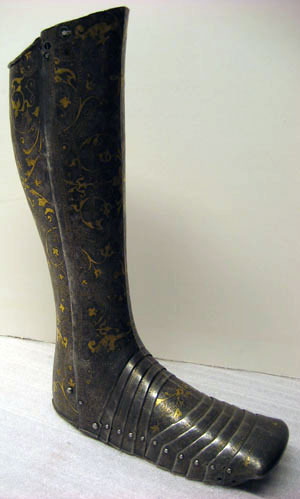 Driven stålplåt med på utsidan förgylld dekor mot mörk bakgrund. Insidan brunaktig med tydliga hammarslag. Sammanlagt 13 delar. Rörformig benskena bestående av två välvda halvor, drivna efter benets form med utbuktning över vaden, avsmalnande nedåt och bredare över foten. Bakre kanten vid knävecket snett avtagen och lutande utåt. Delarna fästade samman med mot utsidan två gångjärn och mot insidan upptill och nertill tapp genom hål. I hälen ett vertikalt ställt rektangulärt hål, 40 x 15 mm. På främre skenan skarp mittås, löpande från övre kant till skon. Sko av sammanlagt 11 välvda skenor lagda omlott och sammanfogade nertill med nitar. Fyra bakre och fem främre som möts över en oval mittenskena. Sedda från sidan är de bakre skenorna raka och de främre svängda framåt. Skon avslutas framtill över tårna av en större skena formad som en skyddande kappa med nervikta kanter. Skenornas nedre kanter ursprungligen omvikta, rundsmidda och med filade snedställda linjer. Nu syns detta endast baktill. Dekor: Hela ytan blånerad. Mot fint skrafferad yta ett slingrande rankmönster av påslaget guldbleck och prickpunsade kantlinjer. Dessutom ett oregelbundet mönster av 5 mm breda band längs kanterna och genom rankorna. Banden består av i mitten försänkta punkter fyllda med guld, på var sida två tunna linjer av påslaget guld med en yttre linje av punsade prickar. Kragen nertill förgylld.