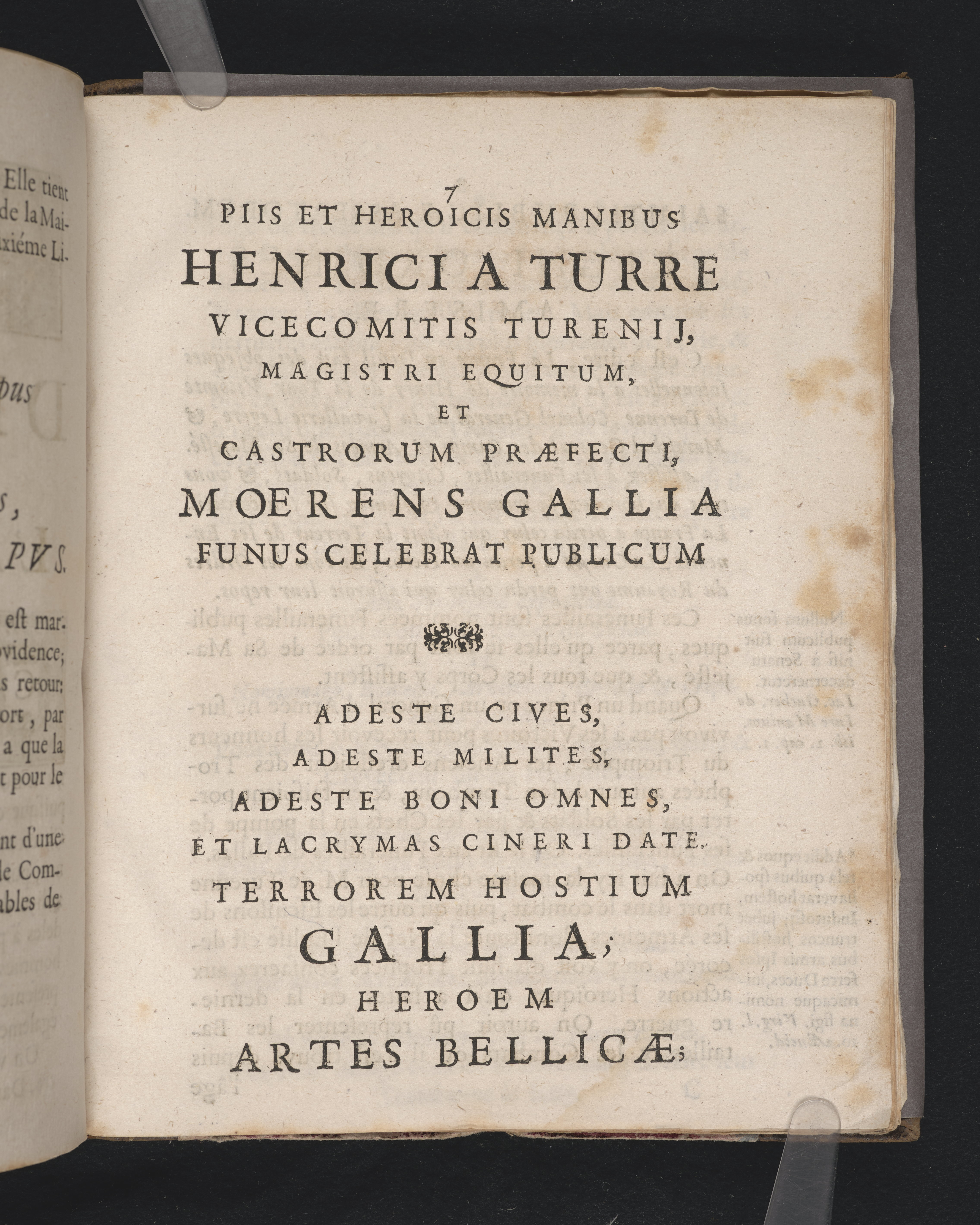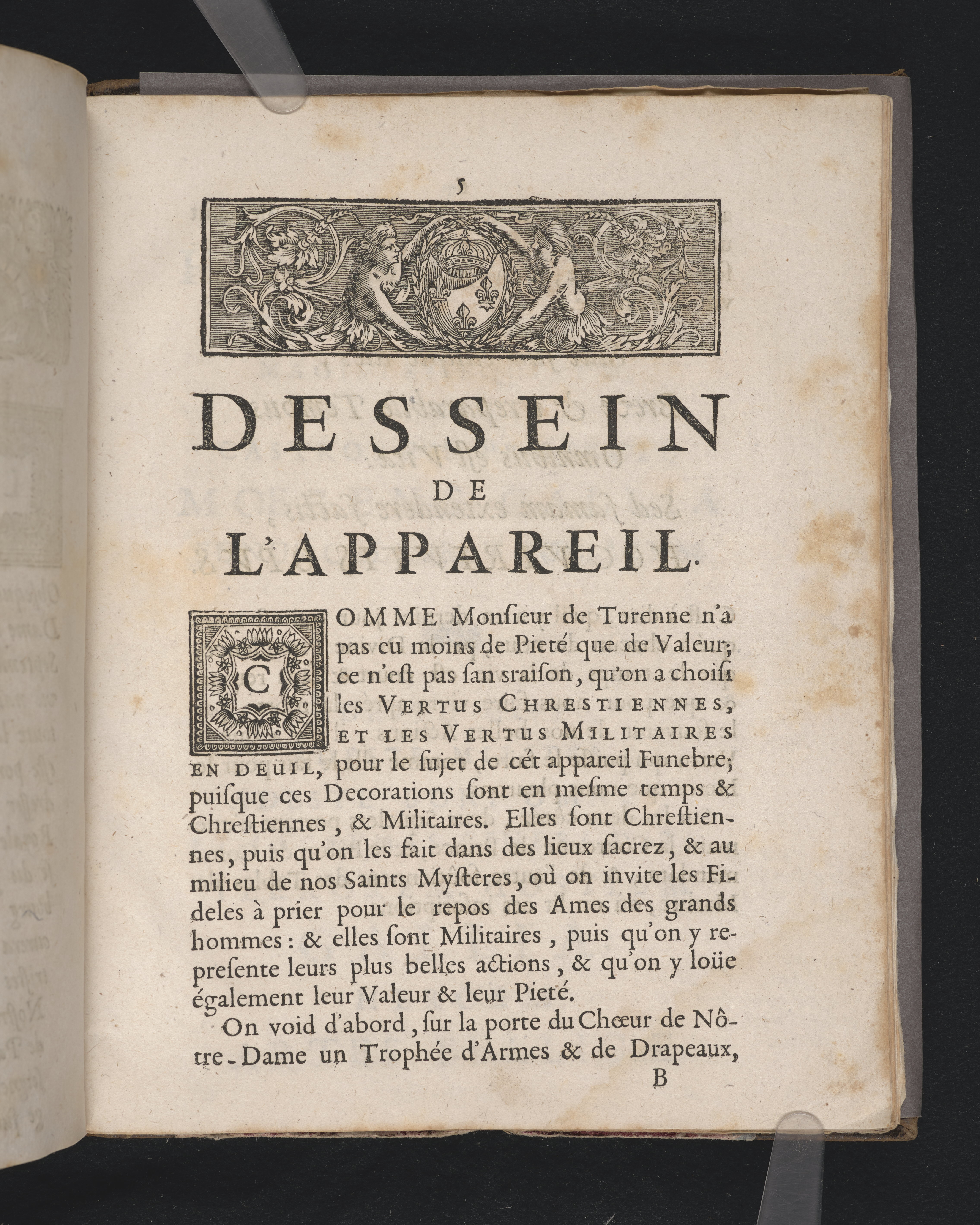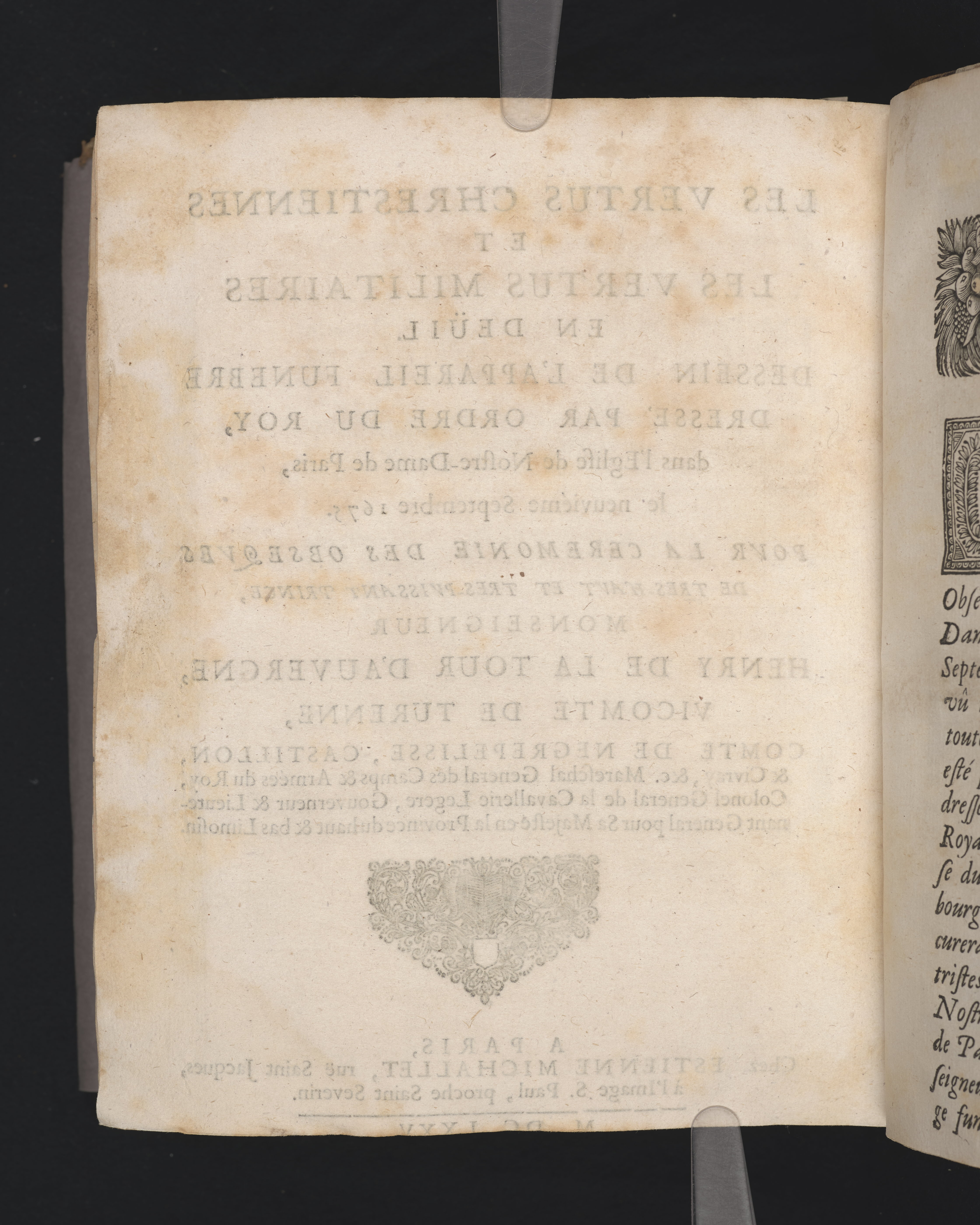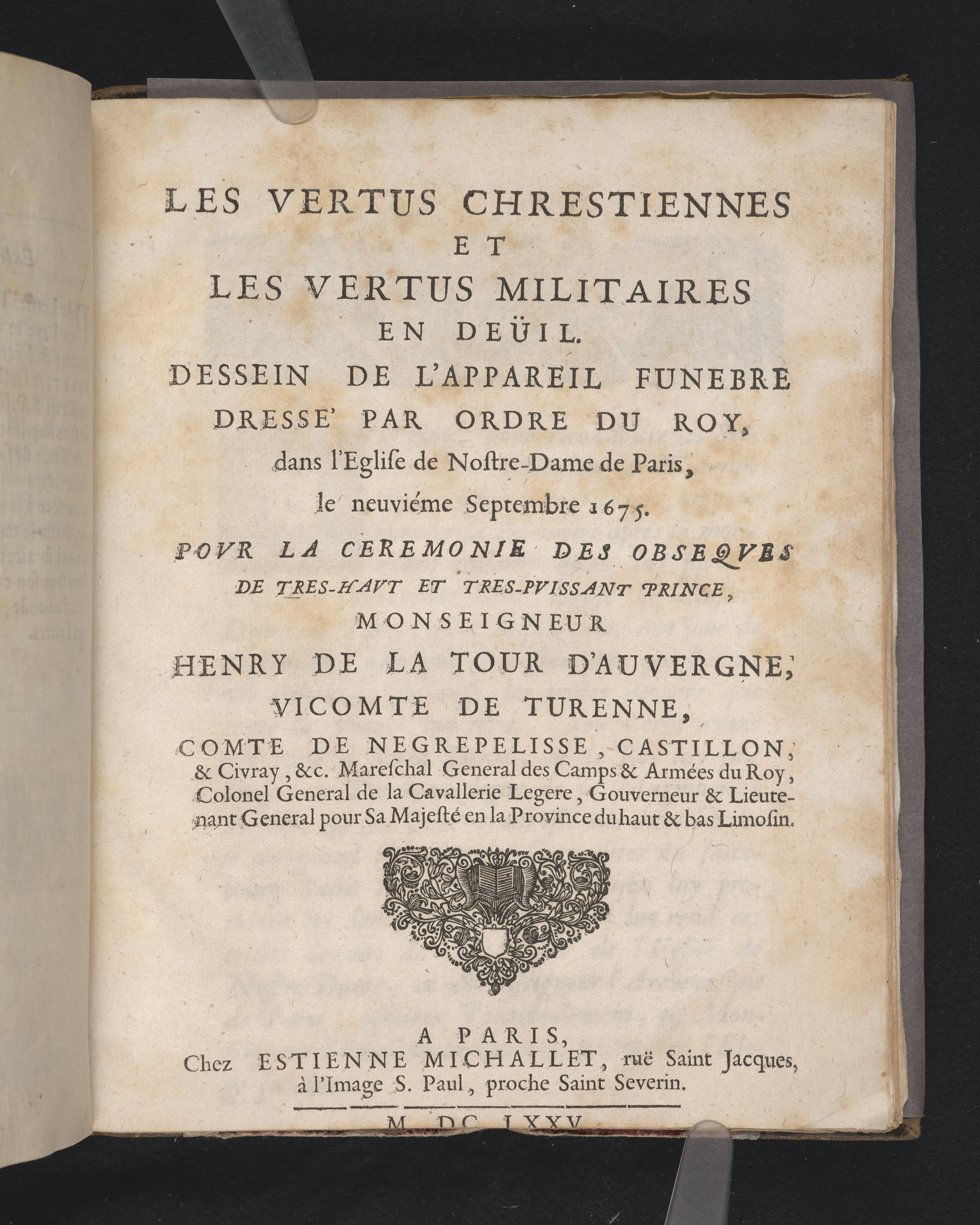 Les vertus chrestiennes et les vertus militaires en deüil. Dessein de l'appareil funebre ... dans l'eglise de Nostre-Dame de Paris, le neuviéme septembre 1675. Povr la ceremonie des obseqves de ... Henry de la Tour d'Auvergne, vicomte de Turenne ... A Paris, chez Estienne Michallet ... MDCLXXV.