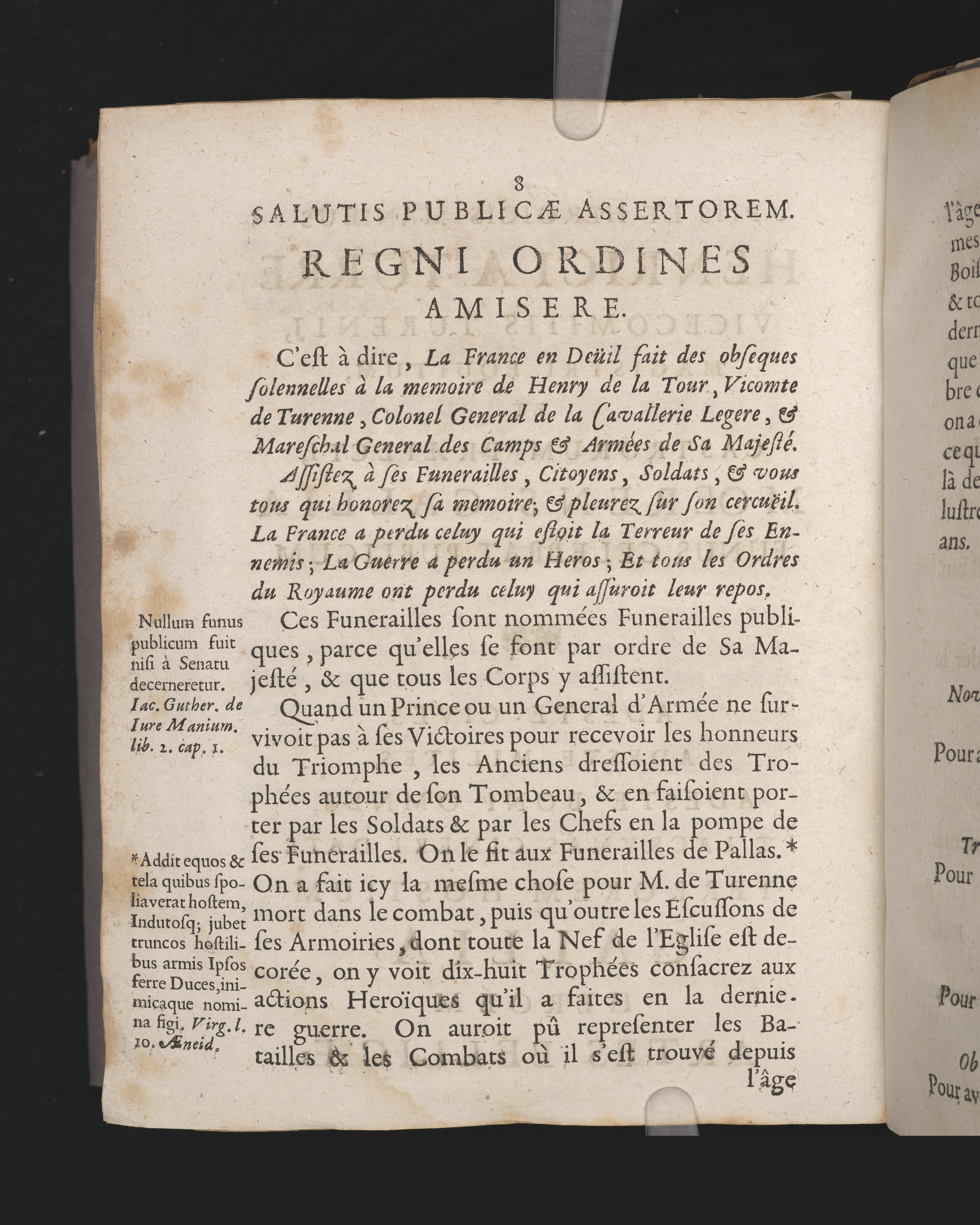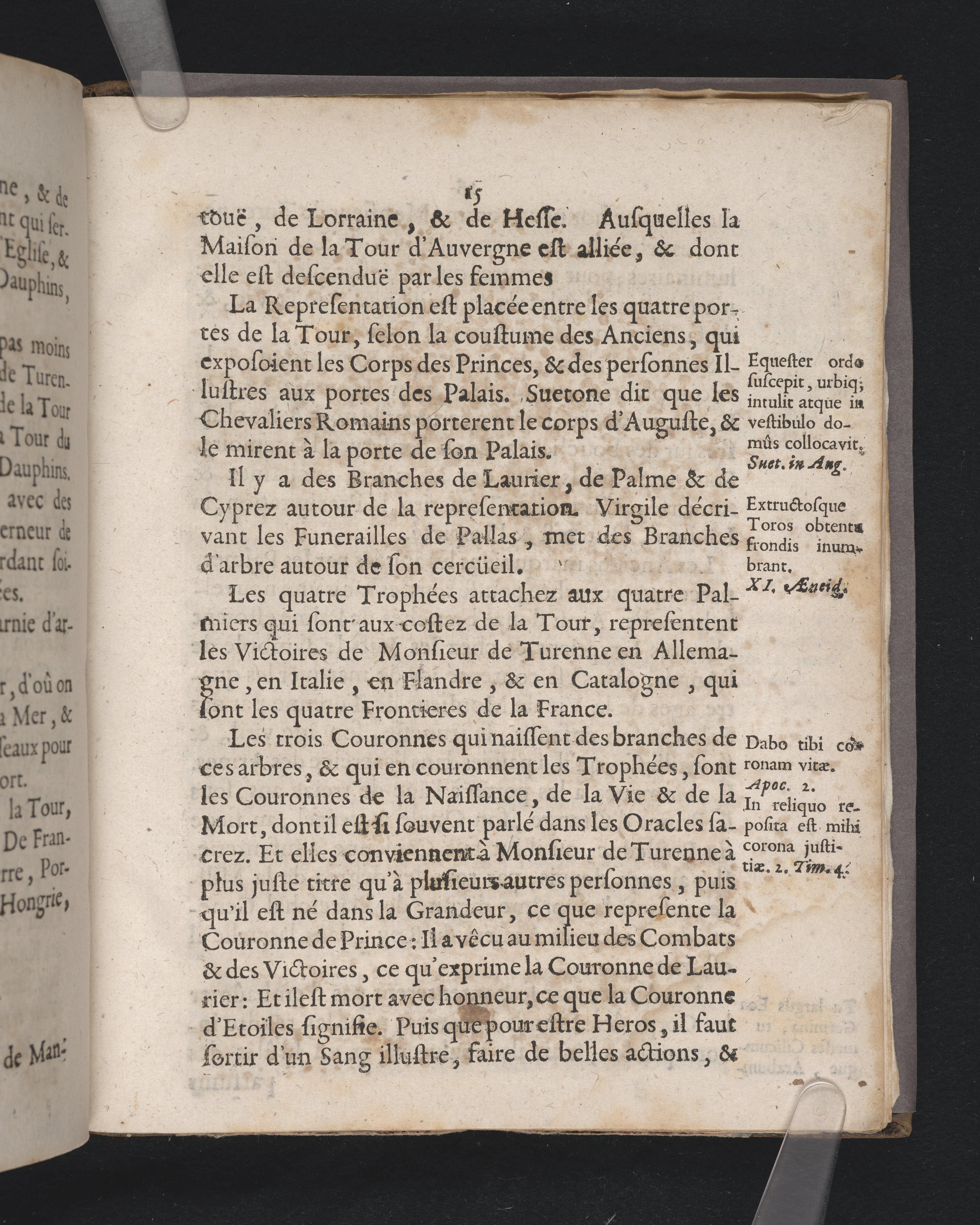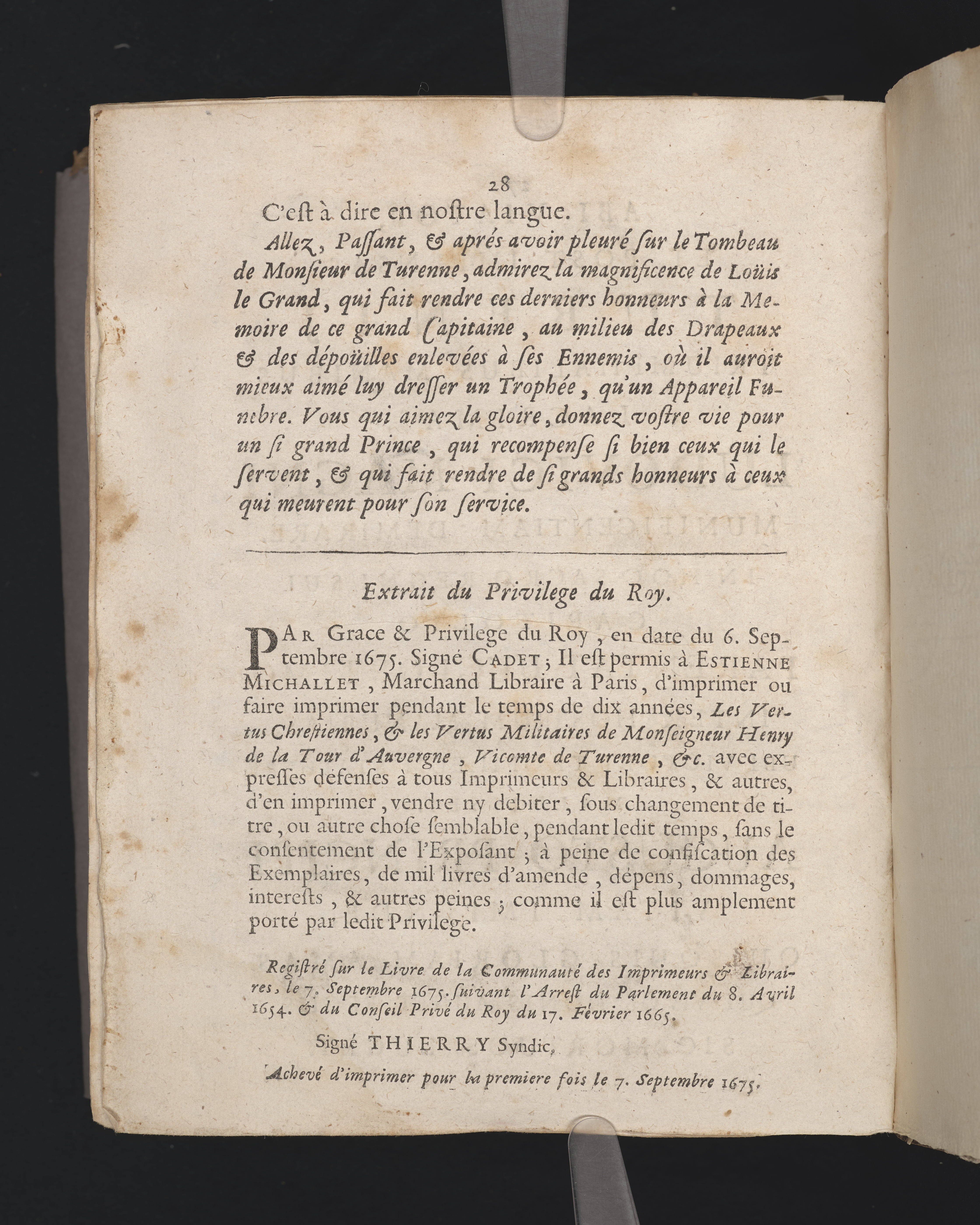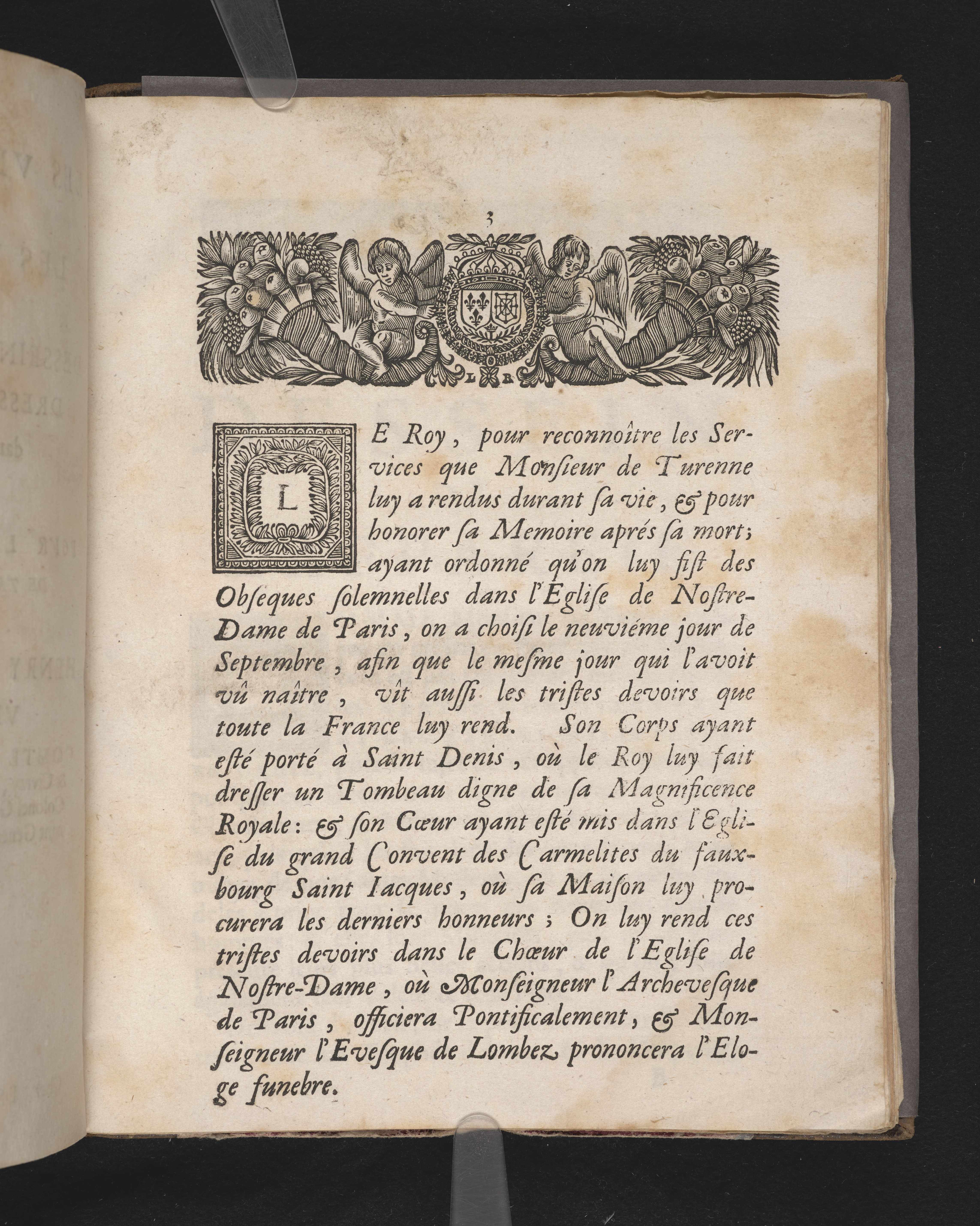 Les vertus chrestiennes et les vertus militaires en deüil. Dessein de l'appareil funebre ... dans l'eglise de Nostre-Dame de Paris, le neuviéme septembre 1675. Povr la ceremonie des obseqves de ... Henry de la Tour d'Auvergne, vicomte de Turenne ... A Paris, chez Estienne Michallet ... MDCLXXV.