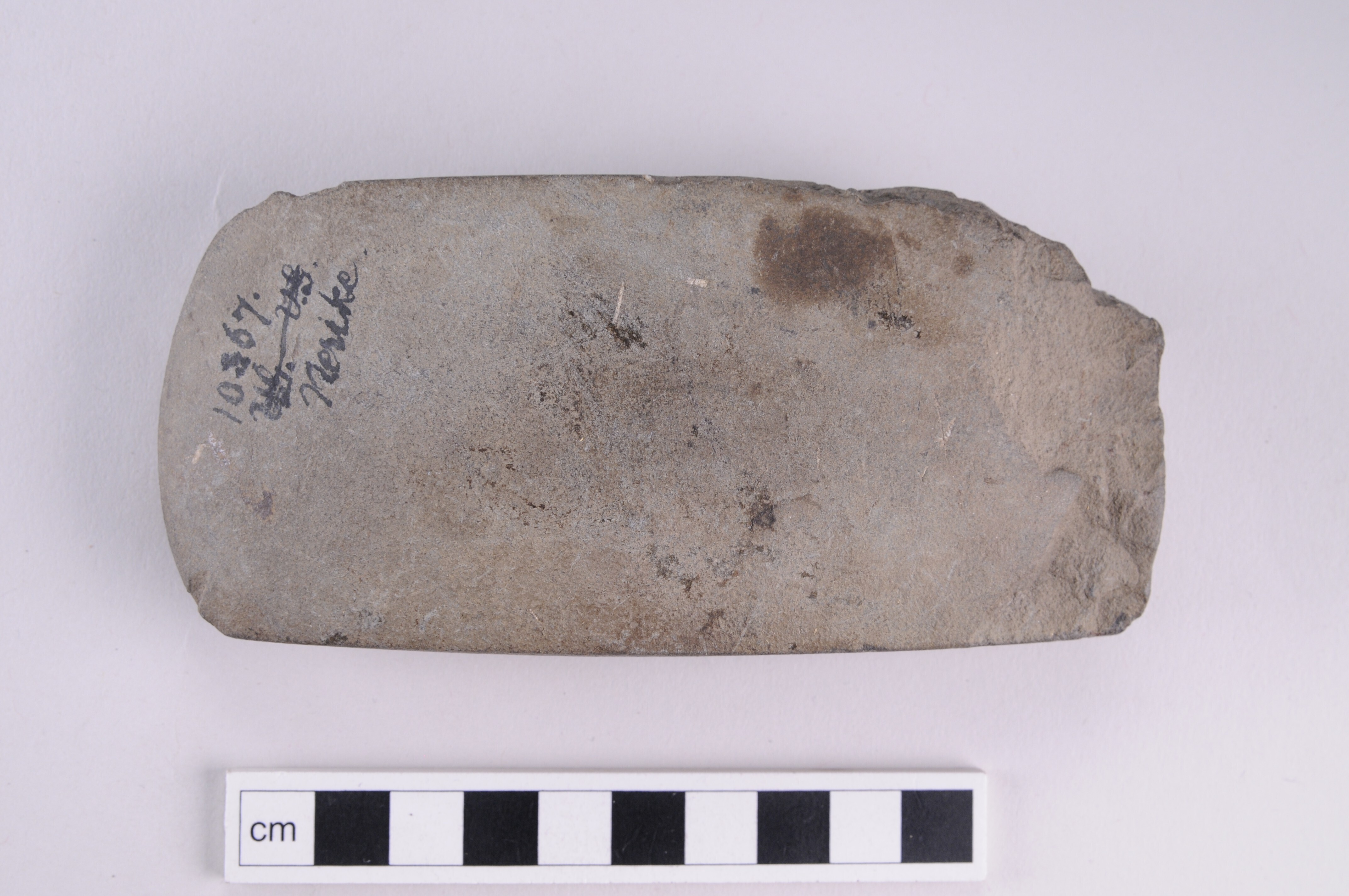 räteggad, helslipad yxa av gröngrå bergart. Avbrutet nackparti