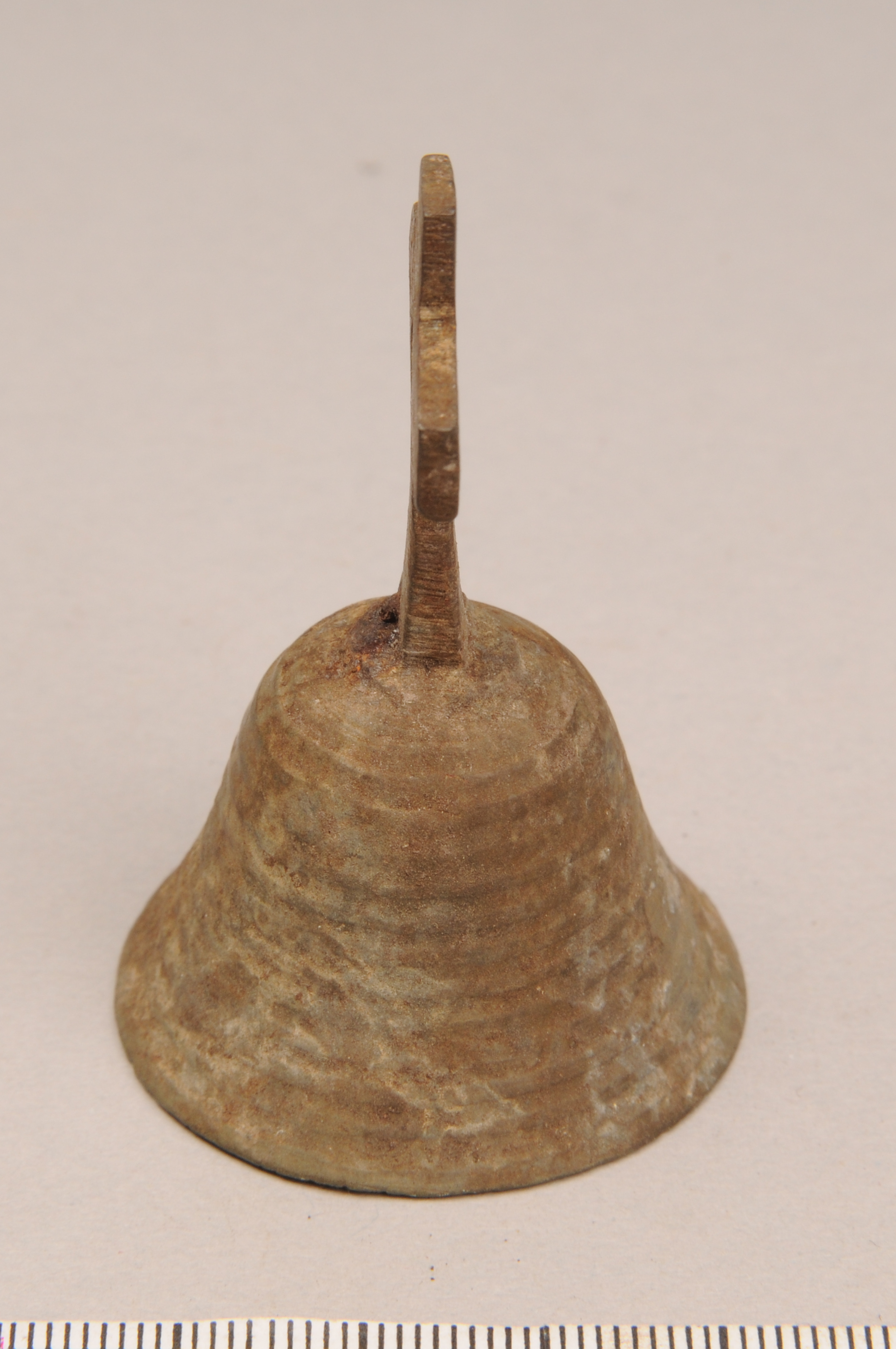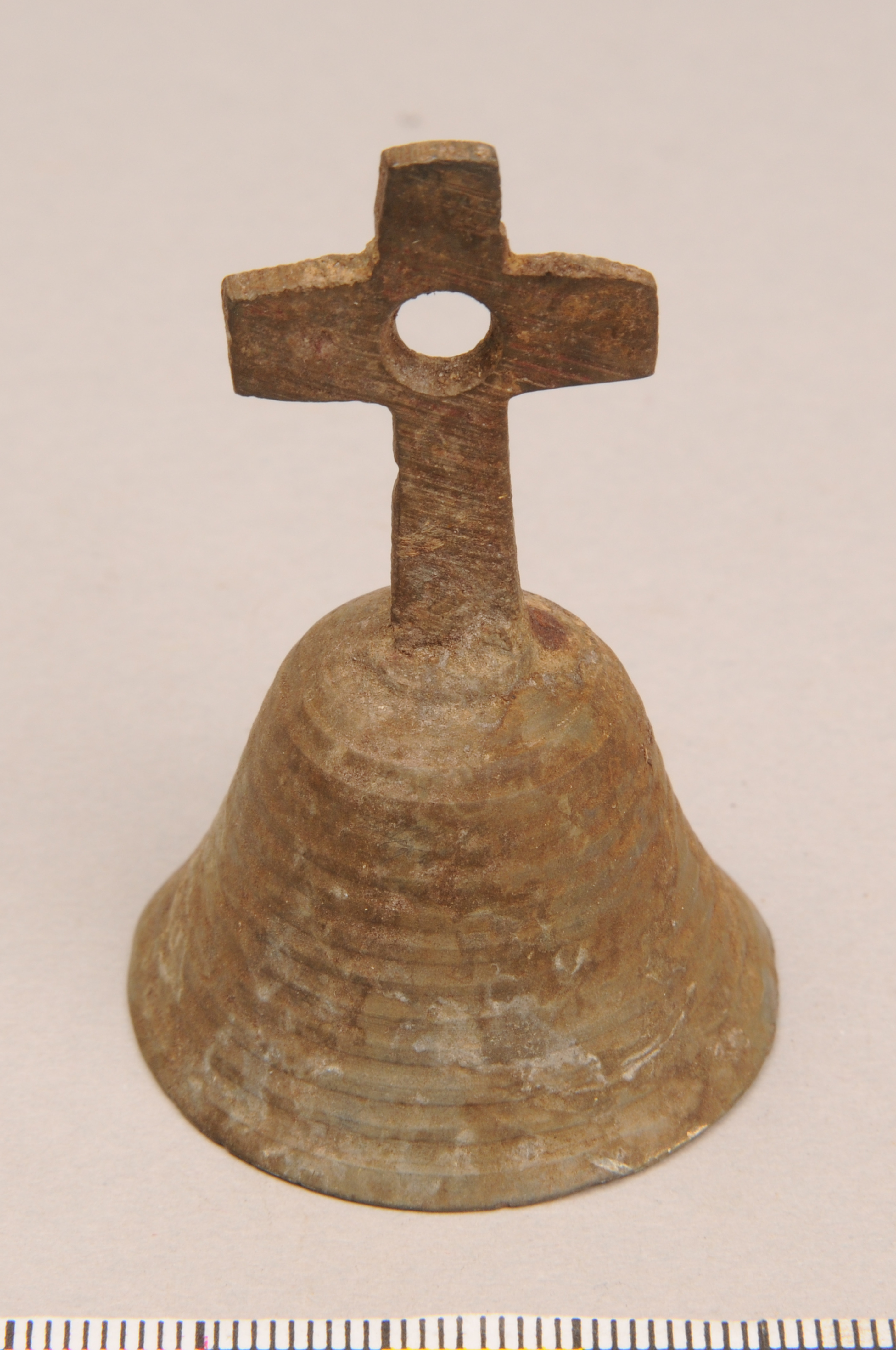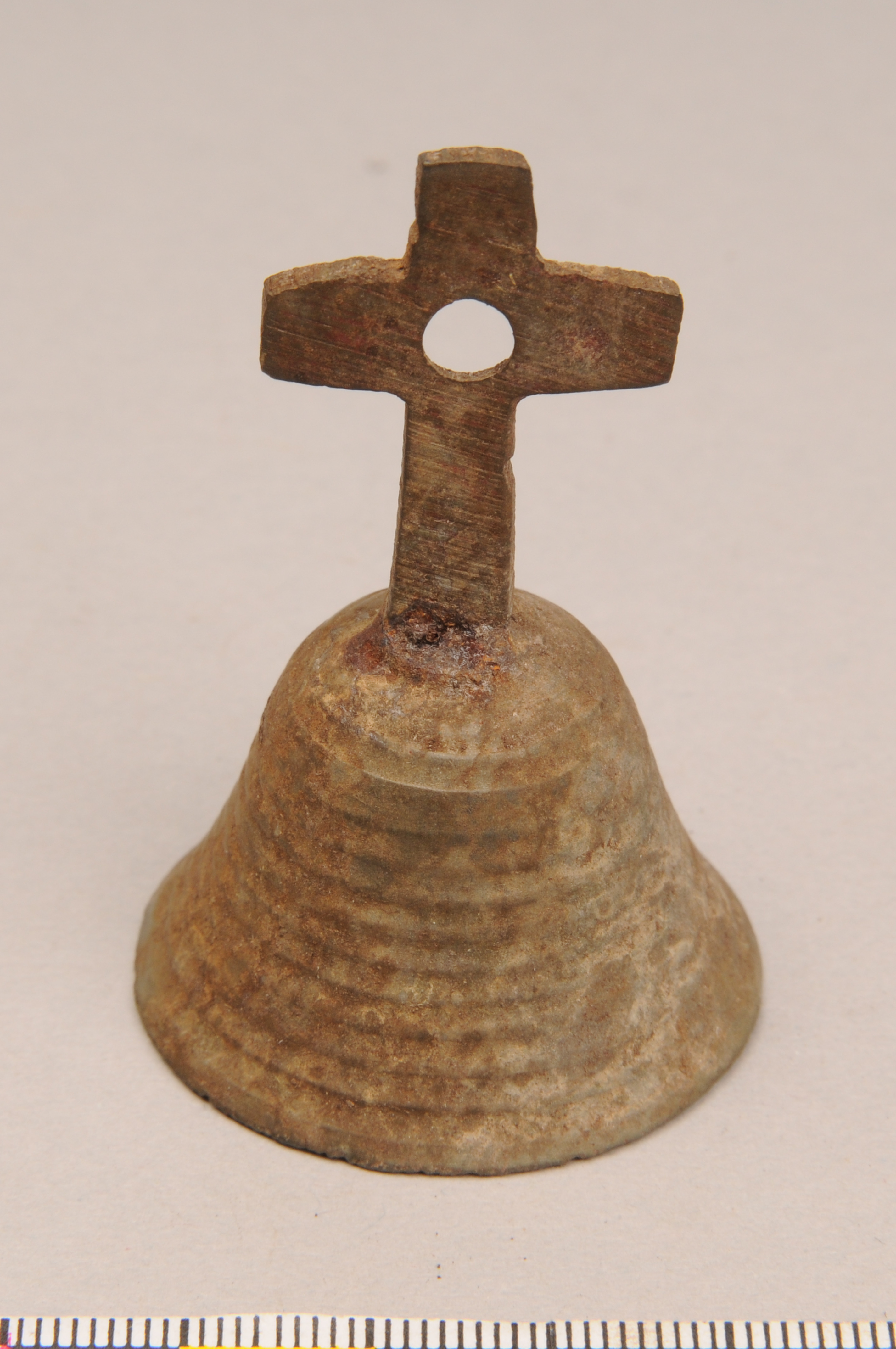 Gjuten i brons. Krönt av kors med runt hål i korsmitten. På korsets båda sidor syns filspår. Kläppen saknas, men kläppfästet är bevarat.