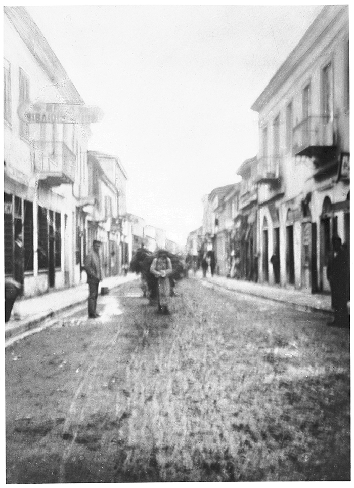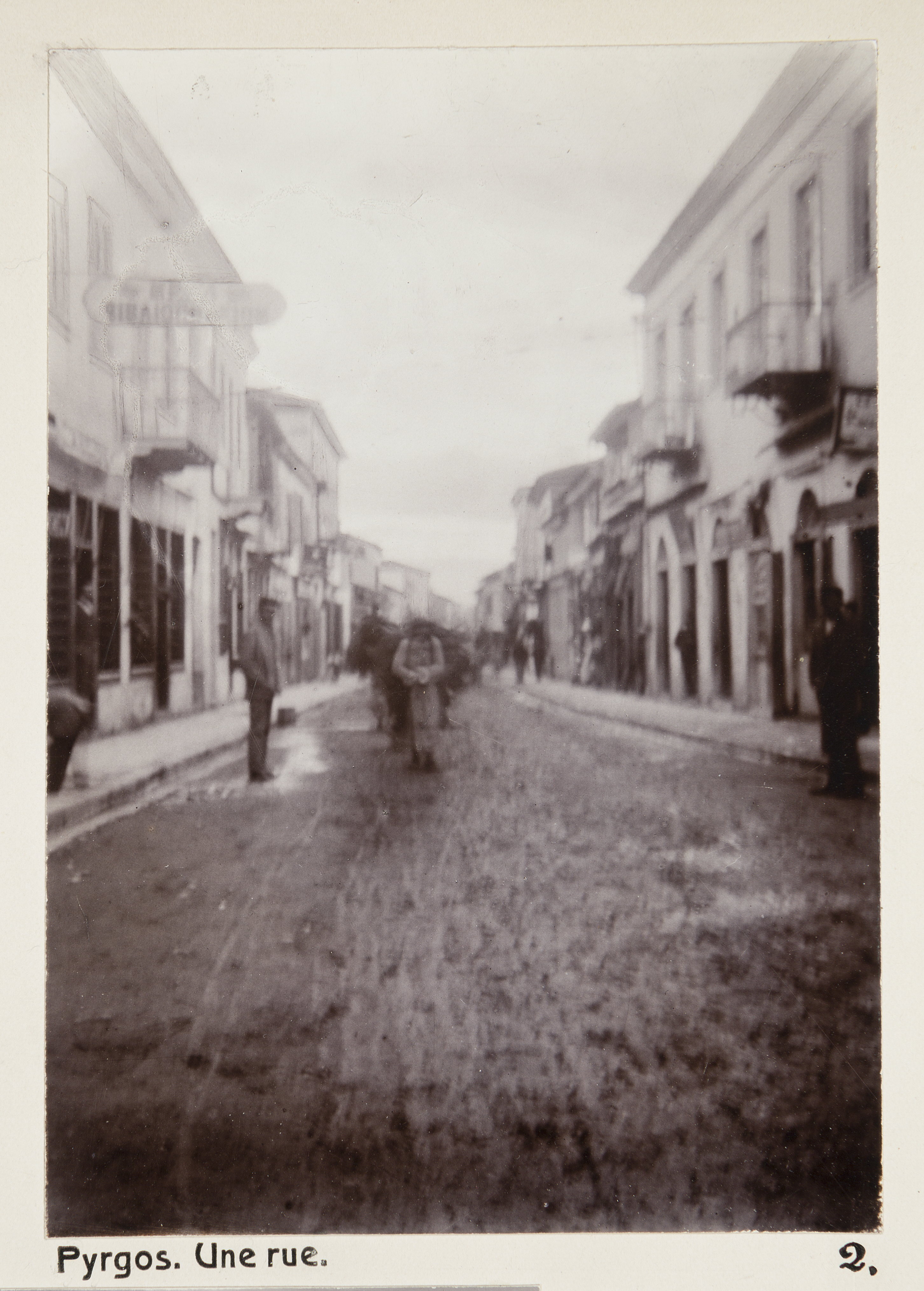 En gata i Pyrgos.Text på originalet: Pyrgos. Une rue. Foto från resa genom Grekland, Makedonien och Serbien, 15 mars-6 juni 1896. Fotografierna LXVI:K.01.-17. är tagna av Wilhelmina von Hallwyl, f. Kempe. Med på resan var maken Walther von Hallwyl och fröken Ida Uhse. Uppgifterna kommer från Ida Uhses reseanteckningar.