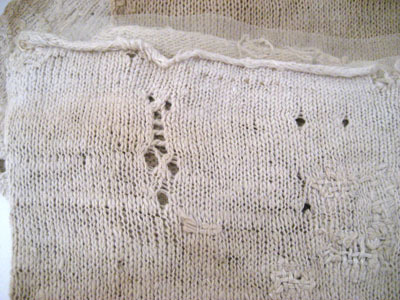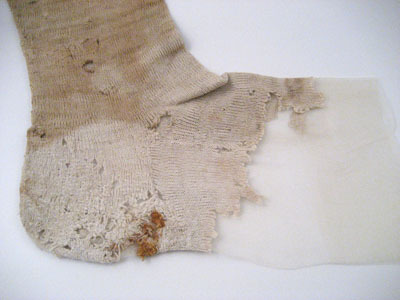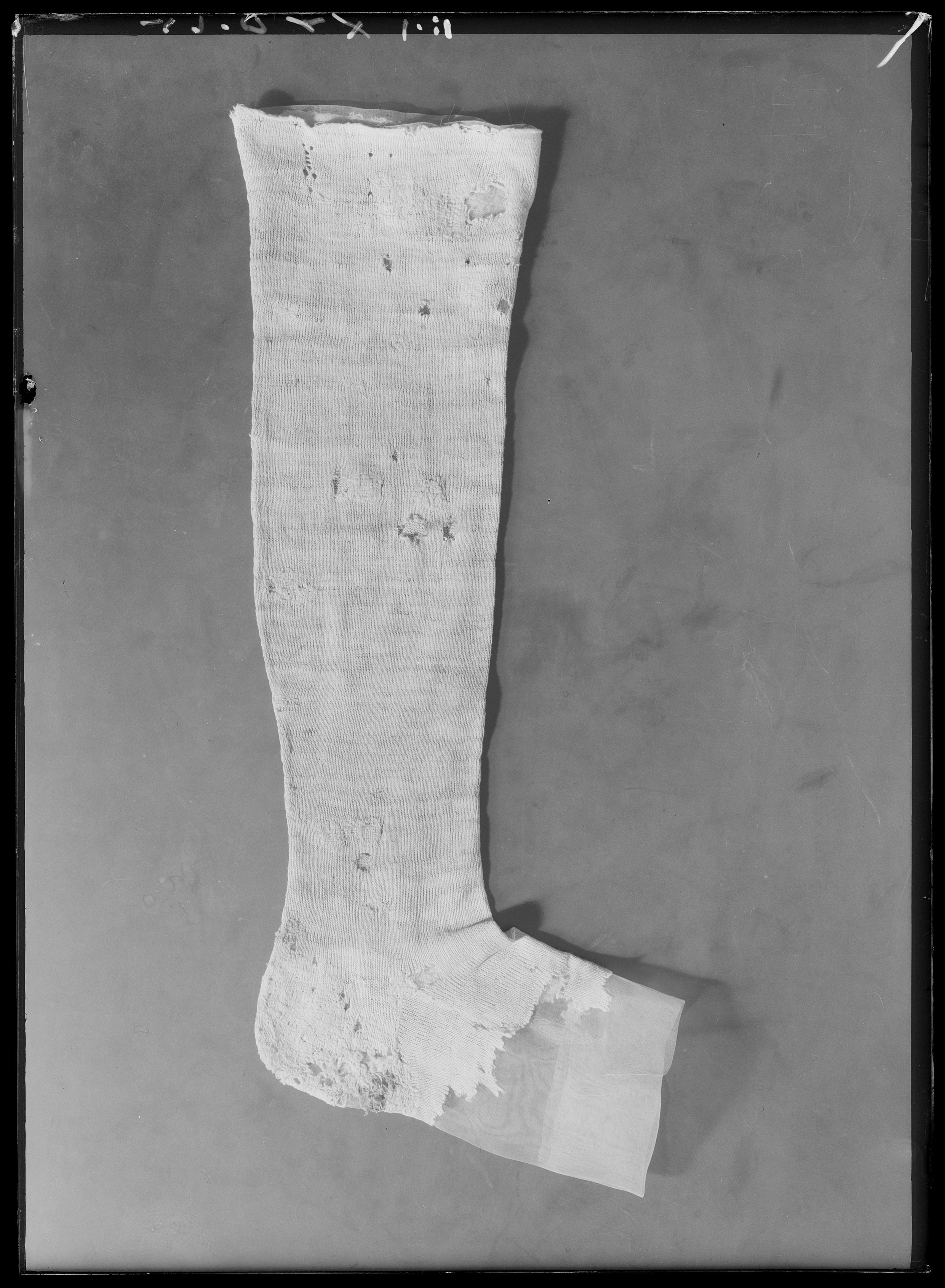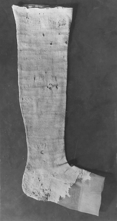 Strumpan är formstickad och har en söm mitt bak som löper ner under hälen. Hälsöm samt sidsöm längs foten. Strumpan är märkt längst upp med 8 hål i konststickning.
