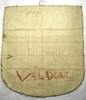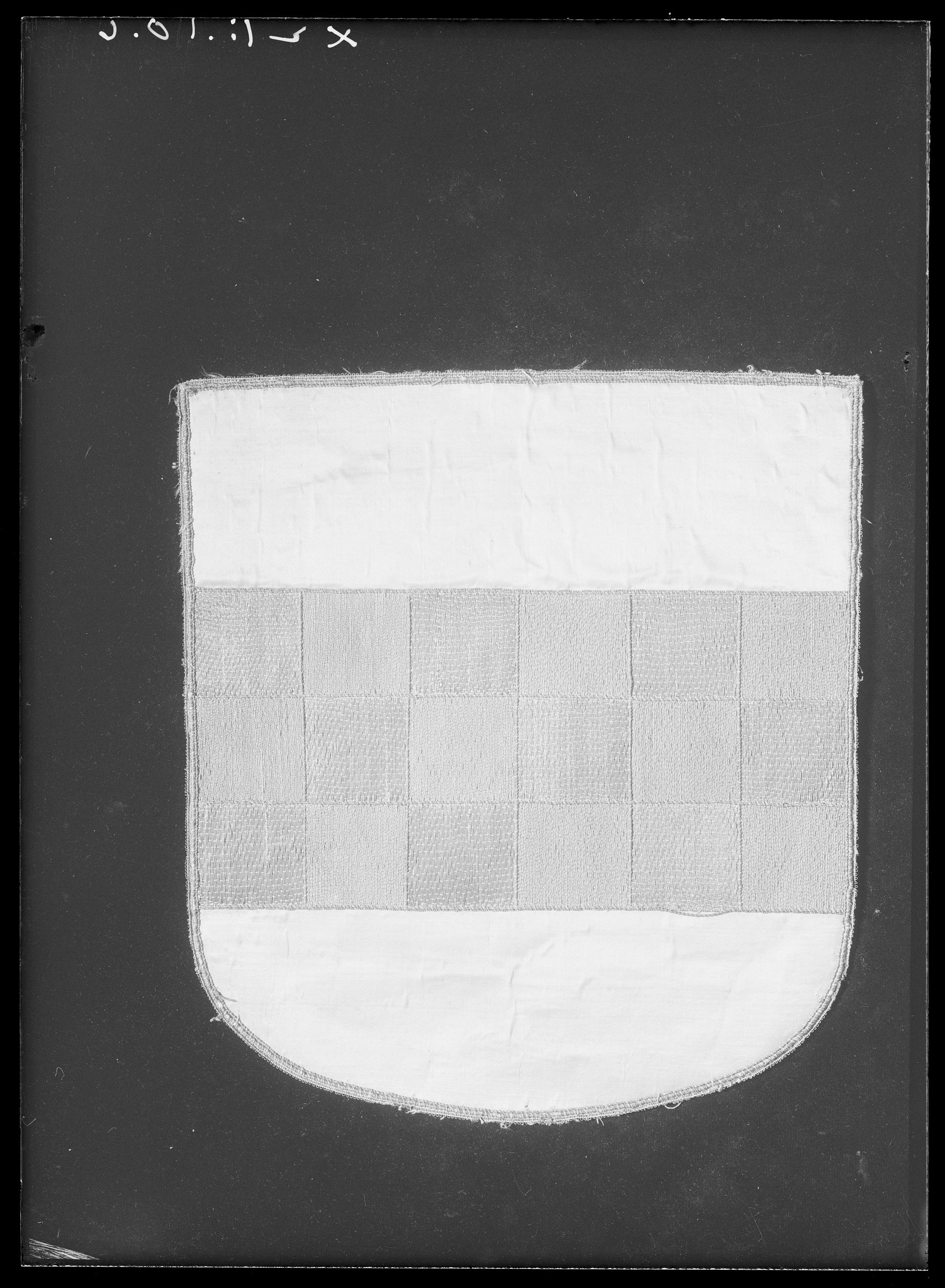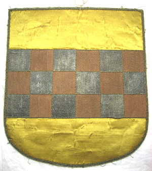Vapensköld av lejongul sidenatlas med en bred broderad balk i ett schackrutemönster i silver och brunt, av silvertråd och av brun silkestråd. Balken samt vardera ruta, sammanlagt 18 rutor, kantas av an smal snodd av silvertråd. Skölden kantas runtom av en tjockare och en smalare snodd av silvertråd ett smalt silverlan samt av vit silkestråd omvirat av silvertråd utdragen i små öglor. Vapet är fodrat med beige linnelärft och på baksidan klätt med ljus makulatur.