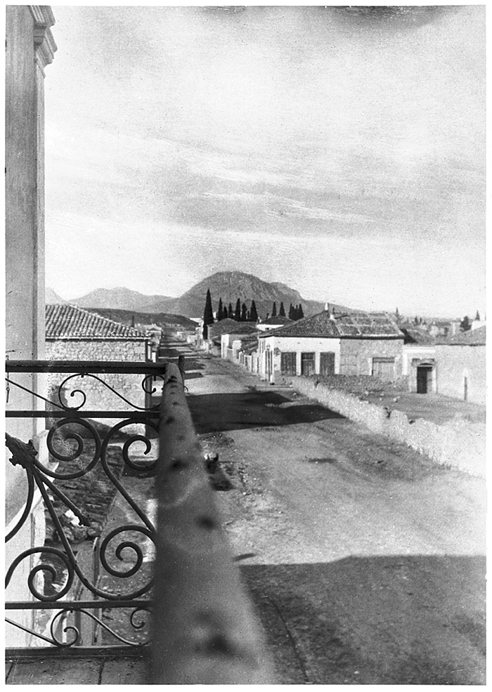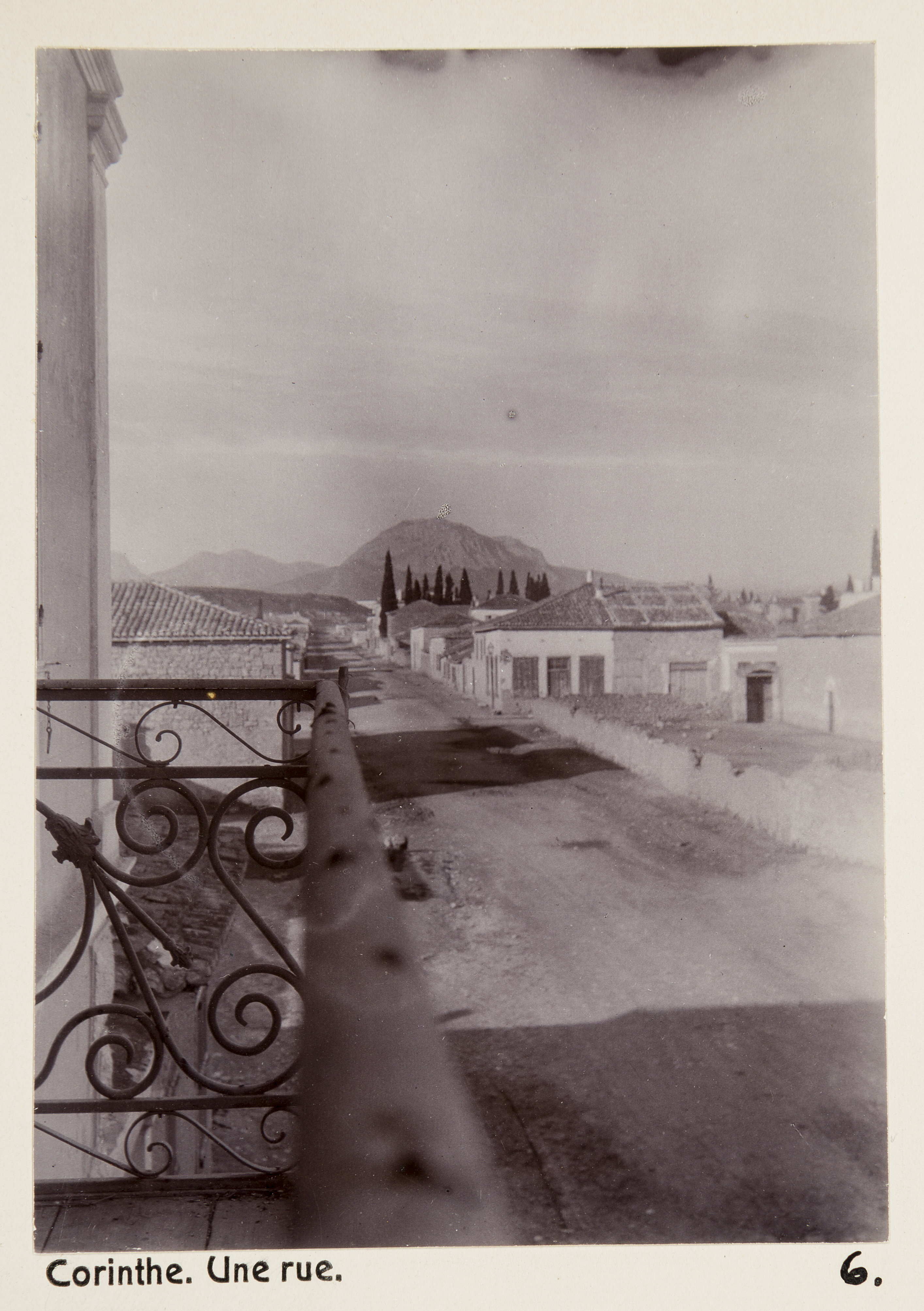 En gata i Korinth, Grekland. Text på originalet: Corinthe. Une rue. Foto från resa genom Grekland, Makedonien och Serbien, 15 mars-6 juni 1896. Fotografierna LXVI:K.01.-17. är tagna av Wilhelmina von Hallwyl, f. Kempe. Med på resan var maken Walther von Hallwyl och fröken Ida Uhse. Uppgifterna kommer från Ida Uhses reseanteckningar.