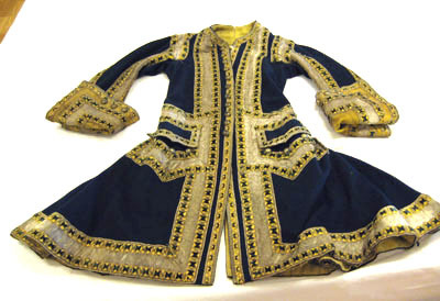 Ett Laquaj Krönings Livrée 1772 af Råck och väst; Råcken af morck blått kläde med blå och gula sametssnören med silf: Galoner, och gula Klädes uppslag fordrad med gult rask. VÄsten af gult kläde med galoner.