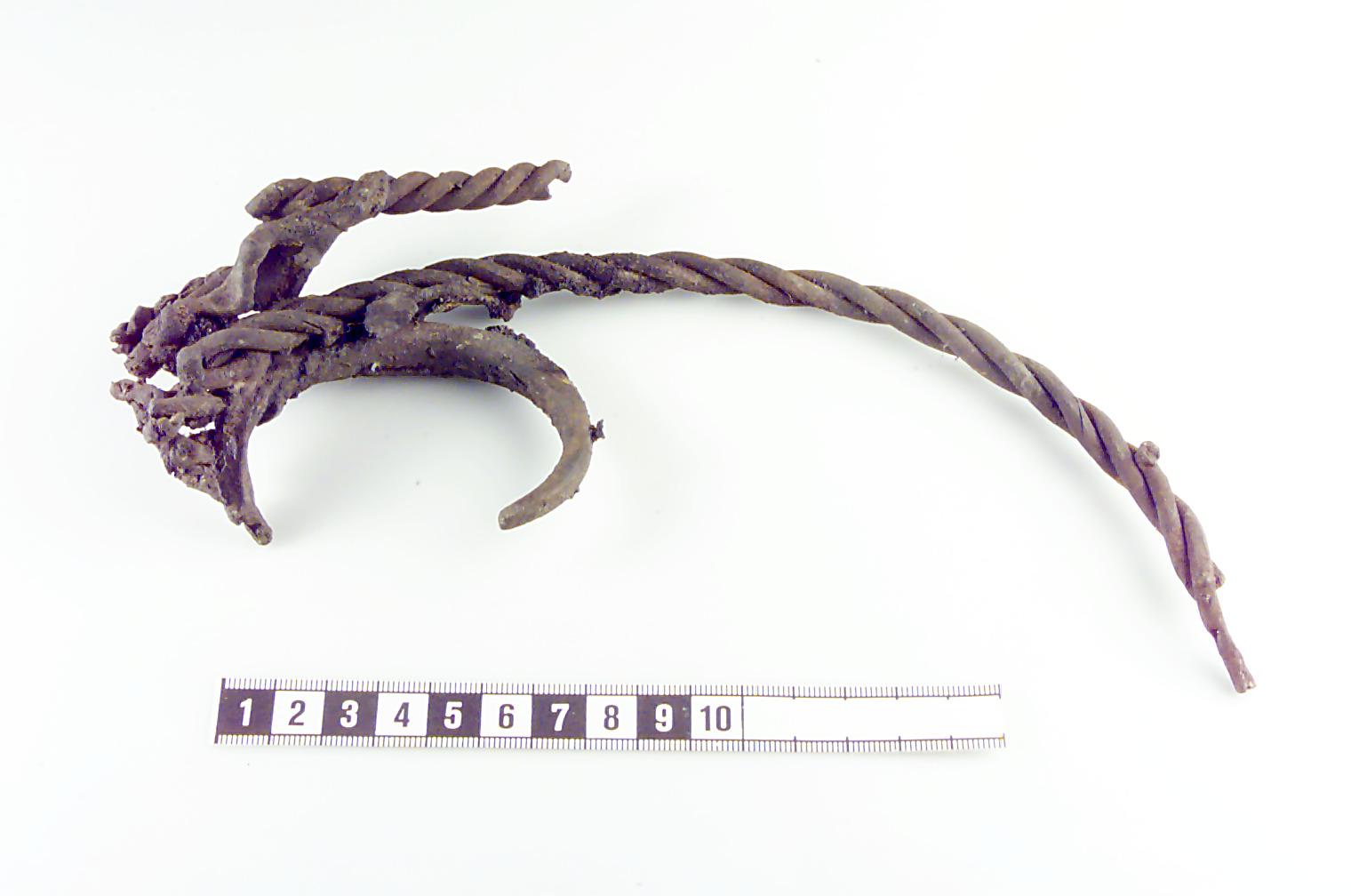 Besatående av bl. a tre vridna tenar (halsring) armbygel (i stort sett intakt) 3 släta tenar samt bleck.