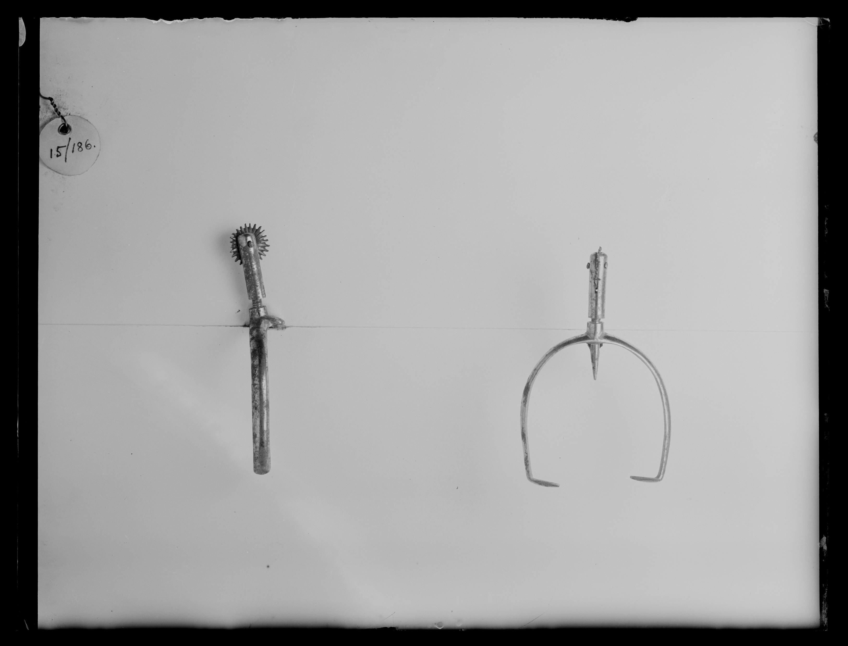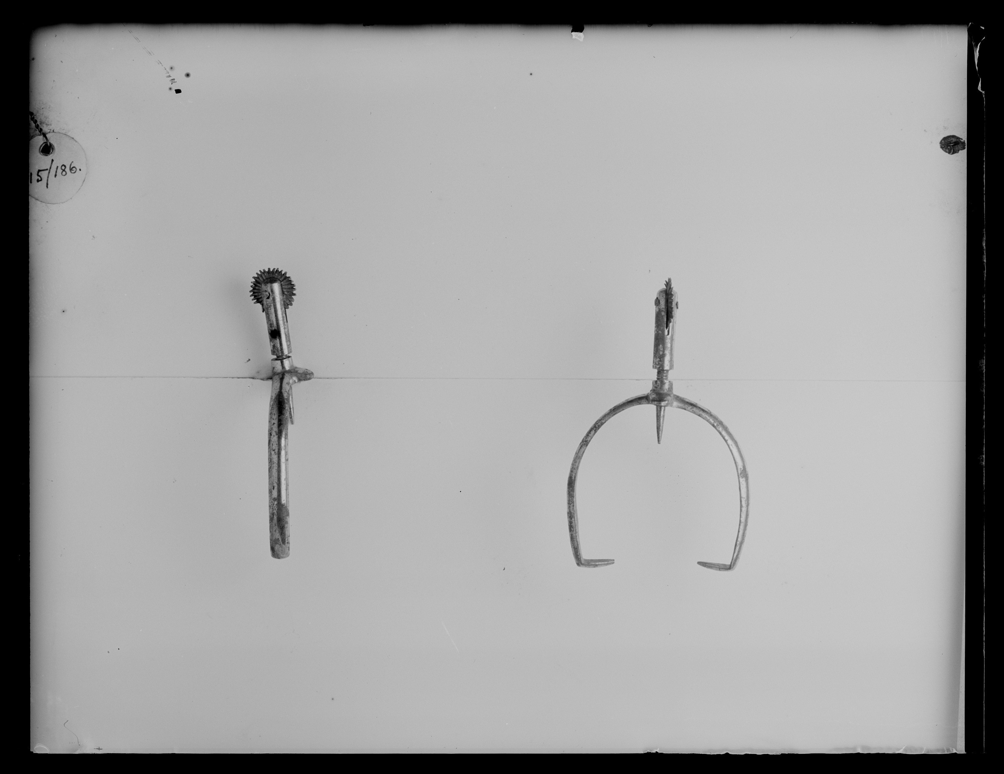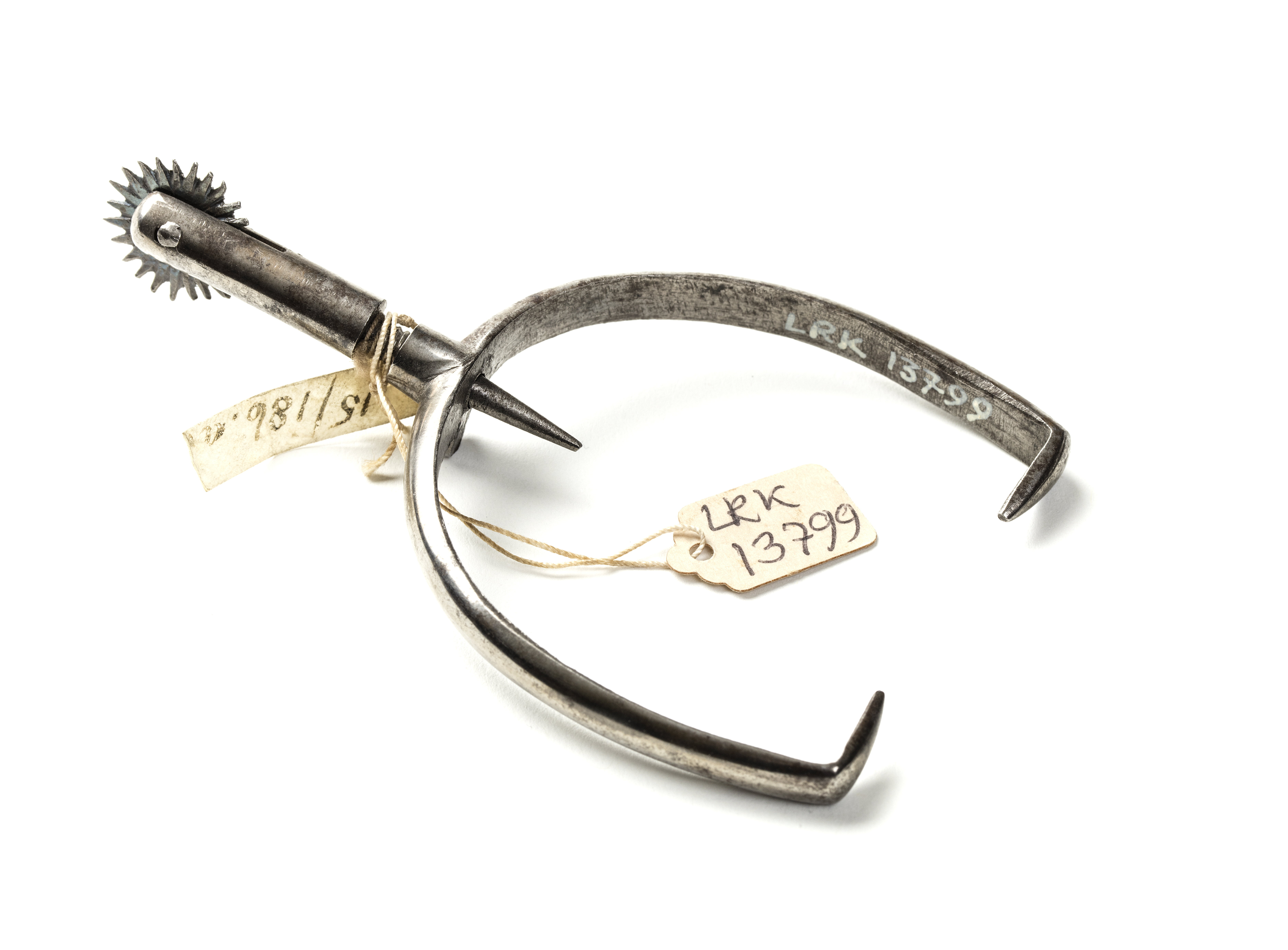 Sporre av stål. U-formade skänklar med konvex utsida. Skänklarnas ytterändar spetsiga och böjda inåti rät vinkel. Mitt bak ett gängat hål med utstående krage. I denna inskruvat en 52 mm lång halsvarav spetsen är 11 mm lång på insidan. Rund, fintandad klinga. Tureholm