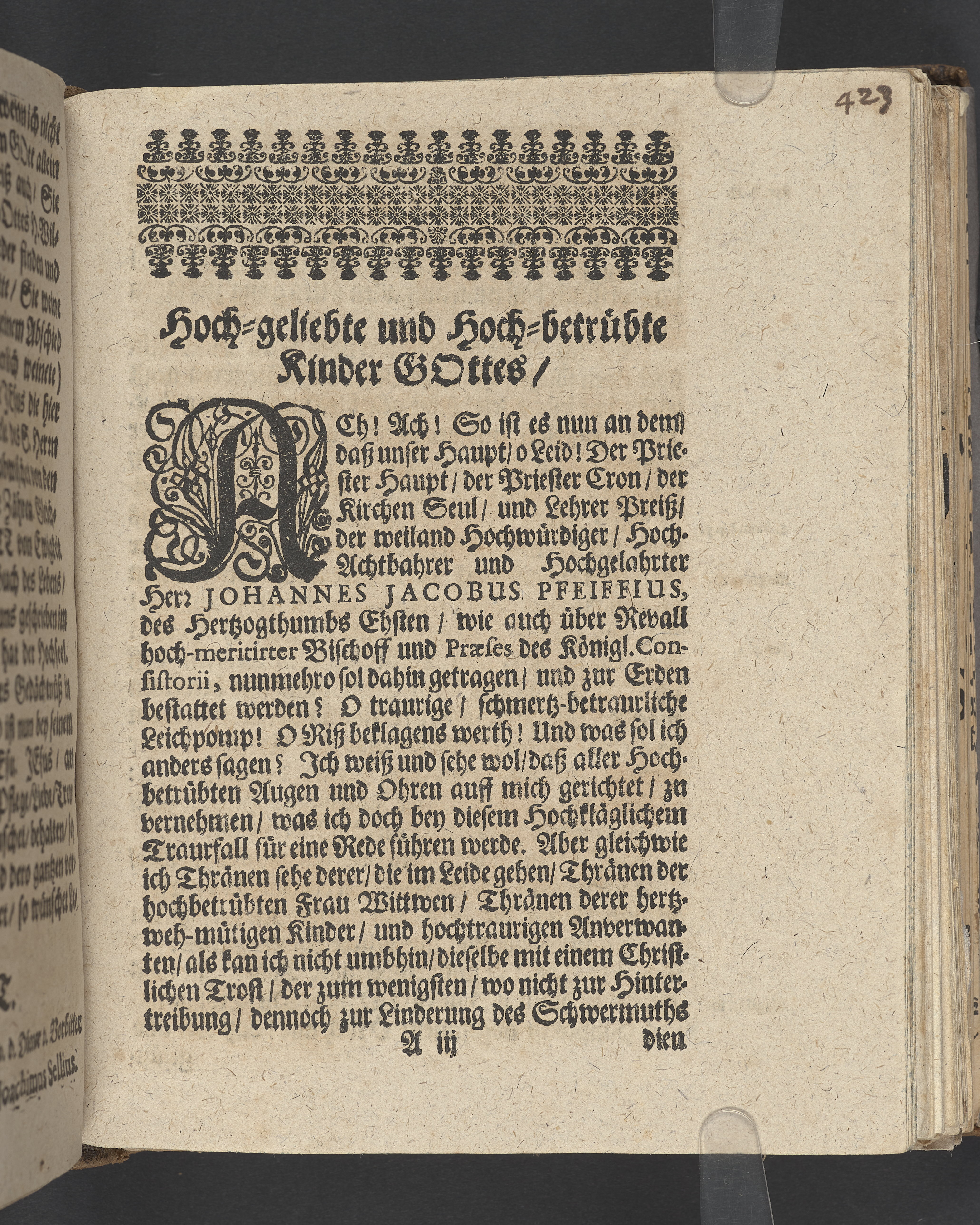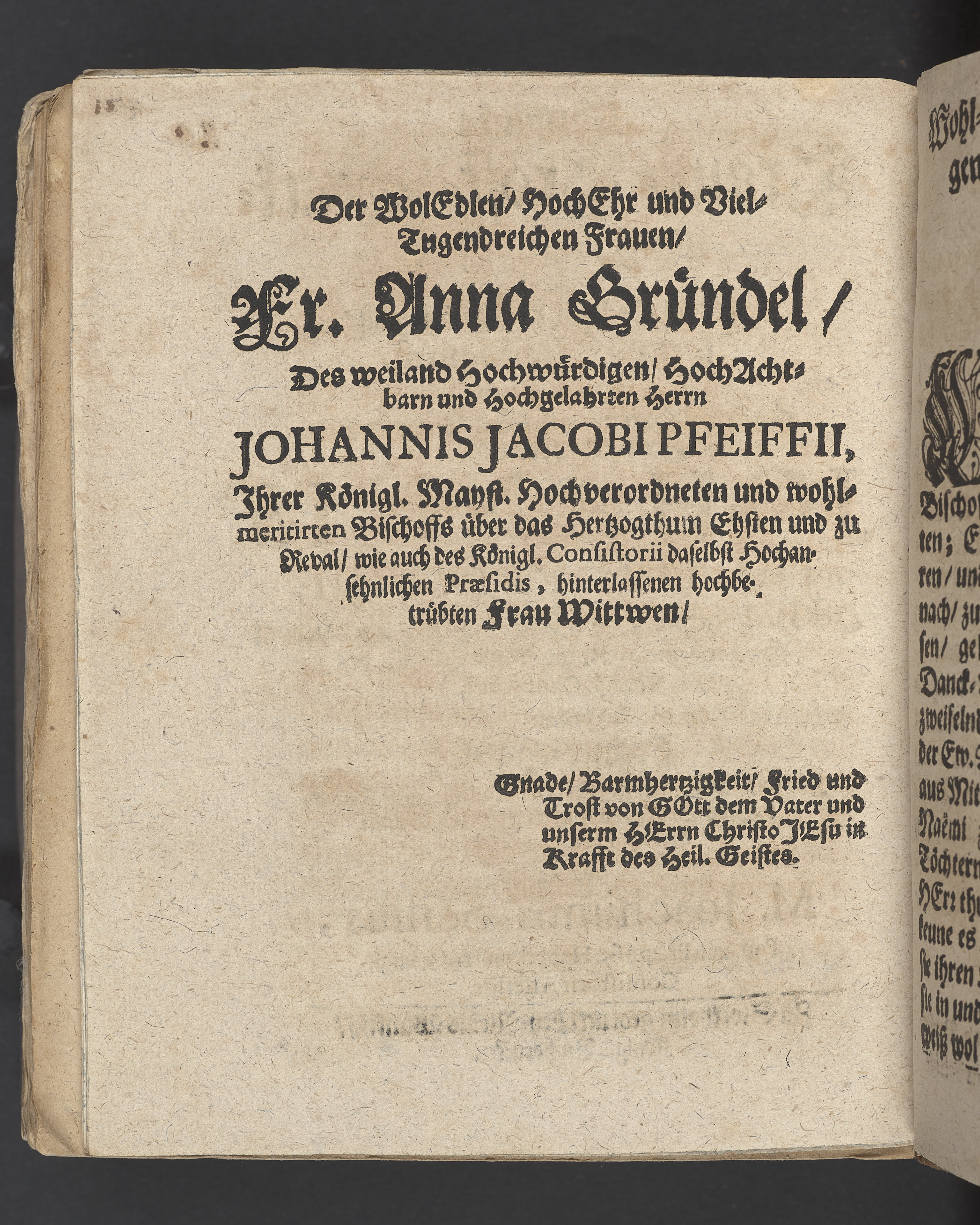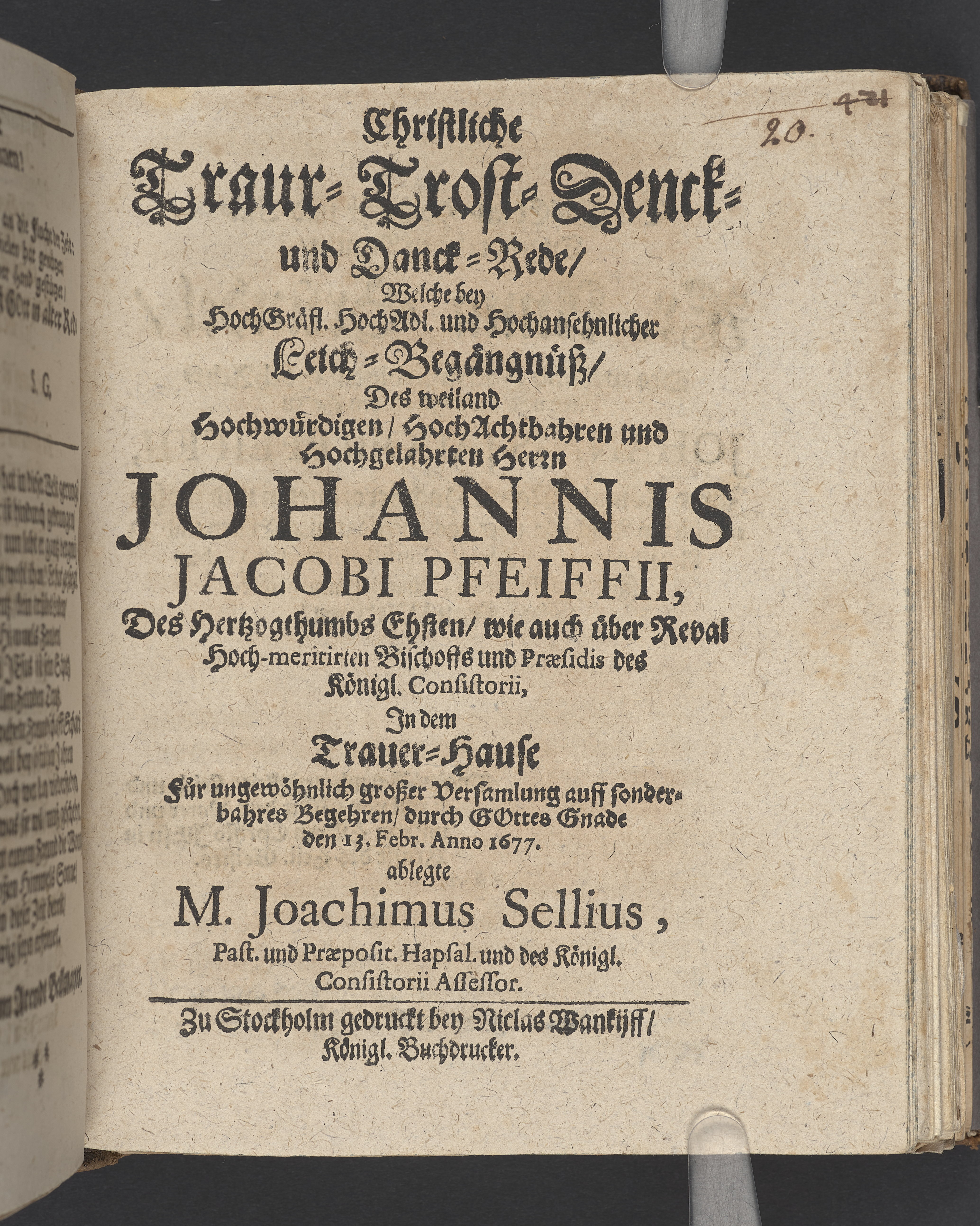 Christliche Traur- Trost- Denck- und Danck-Rede, welche bey ... Johannis Jacobi Pfeiffii, des Hertzogthumbs Ehsten ... in dem Trauer-Hause ... den 13 febr. anno 1677. ablegte M. Joachimus Sellius ... Zu Stockholm gedruckt bey Niclas Wankijff, königl. Buchdrucker.
