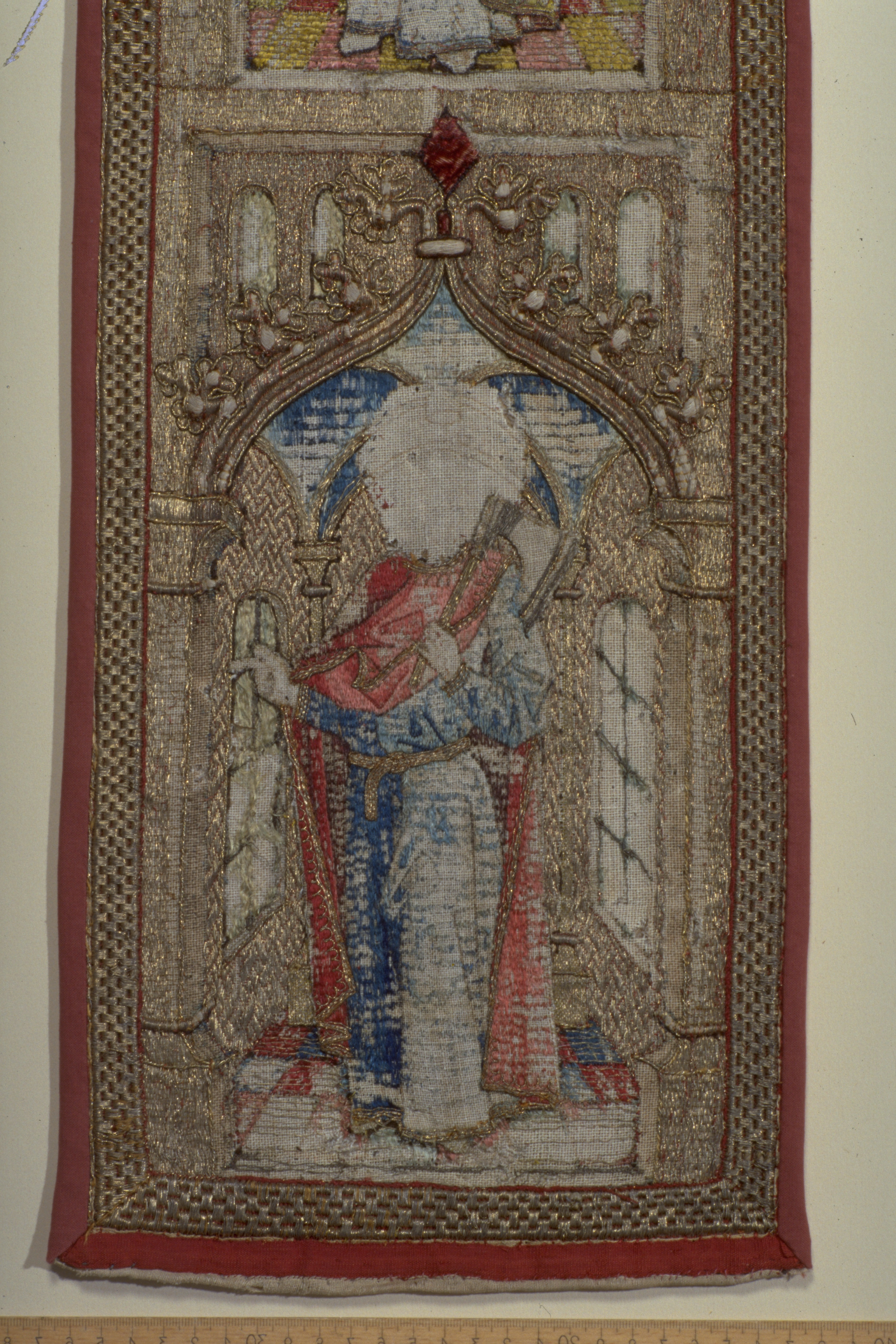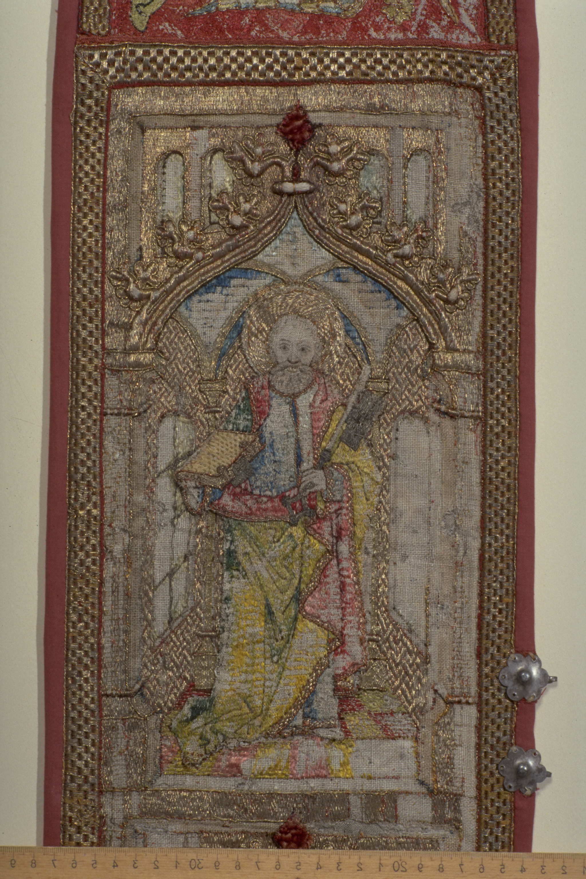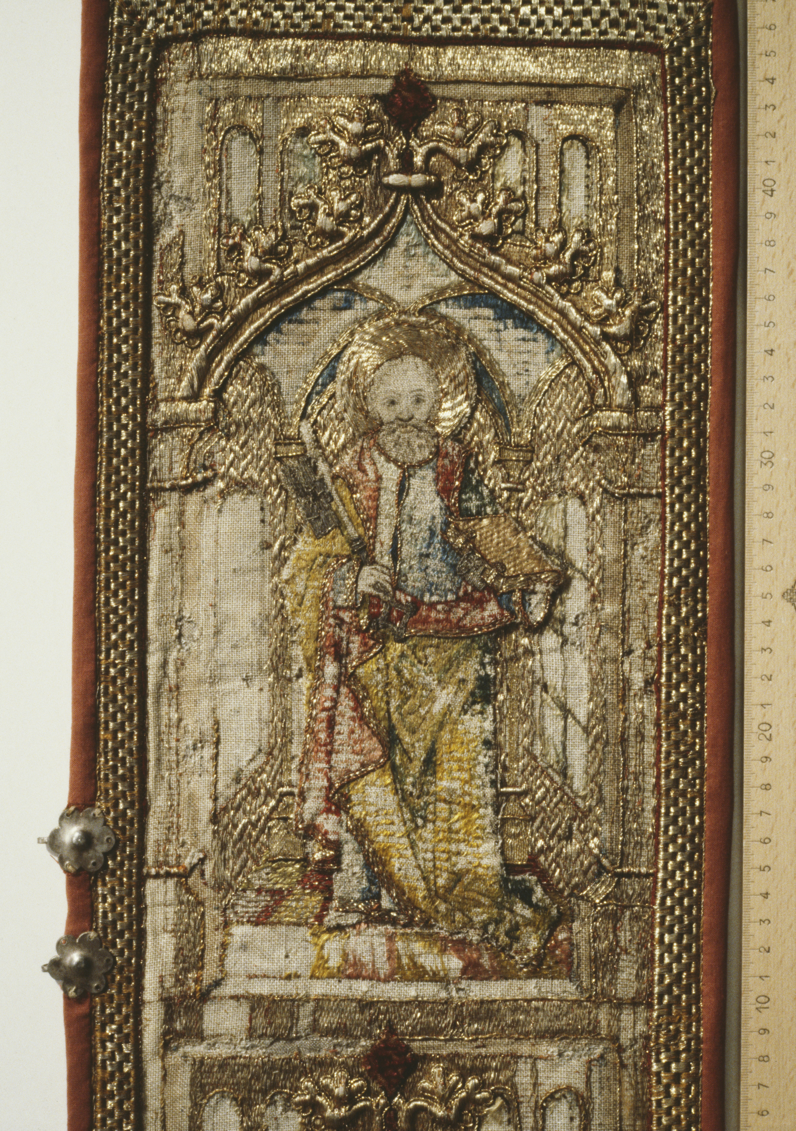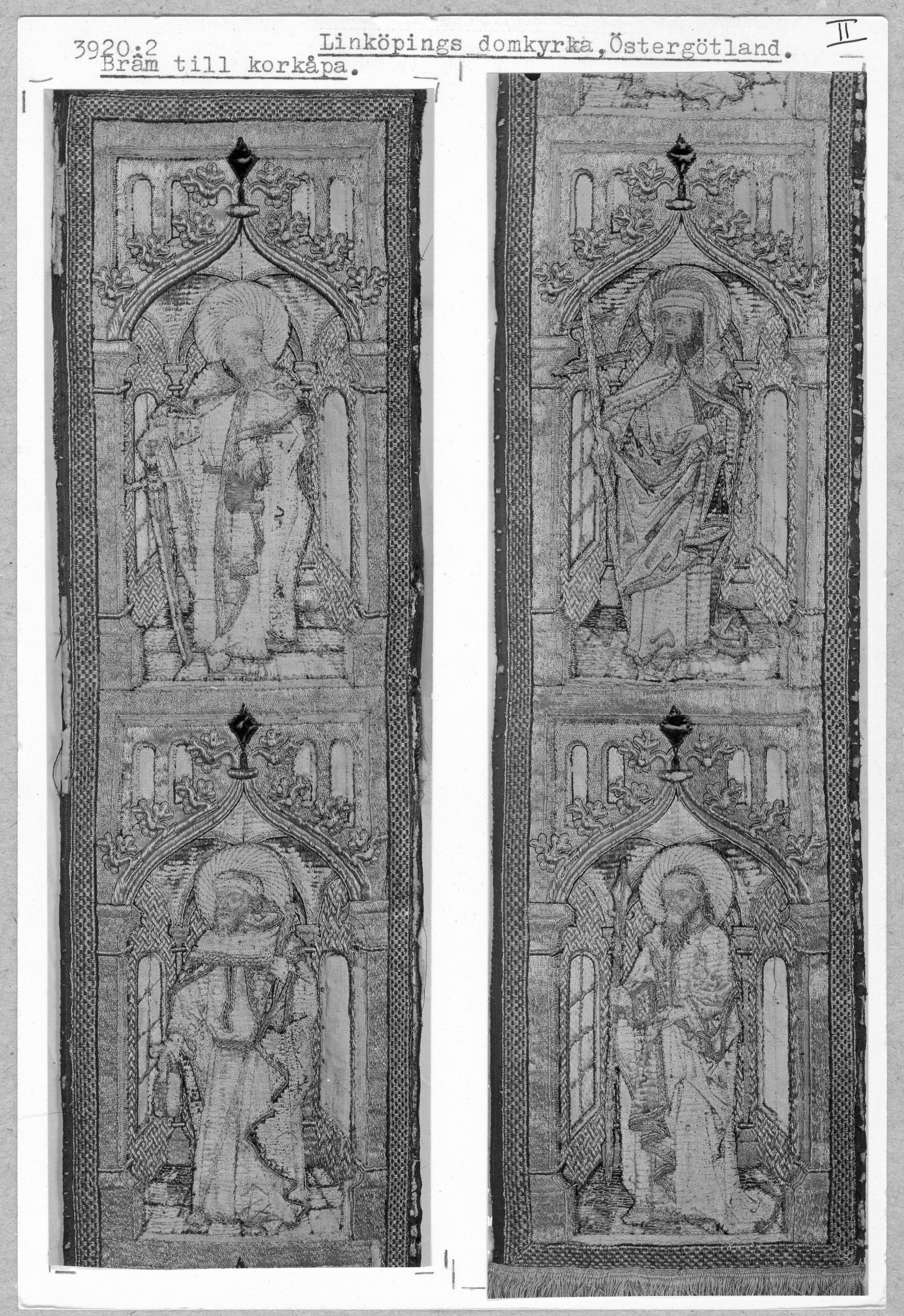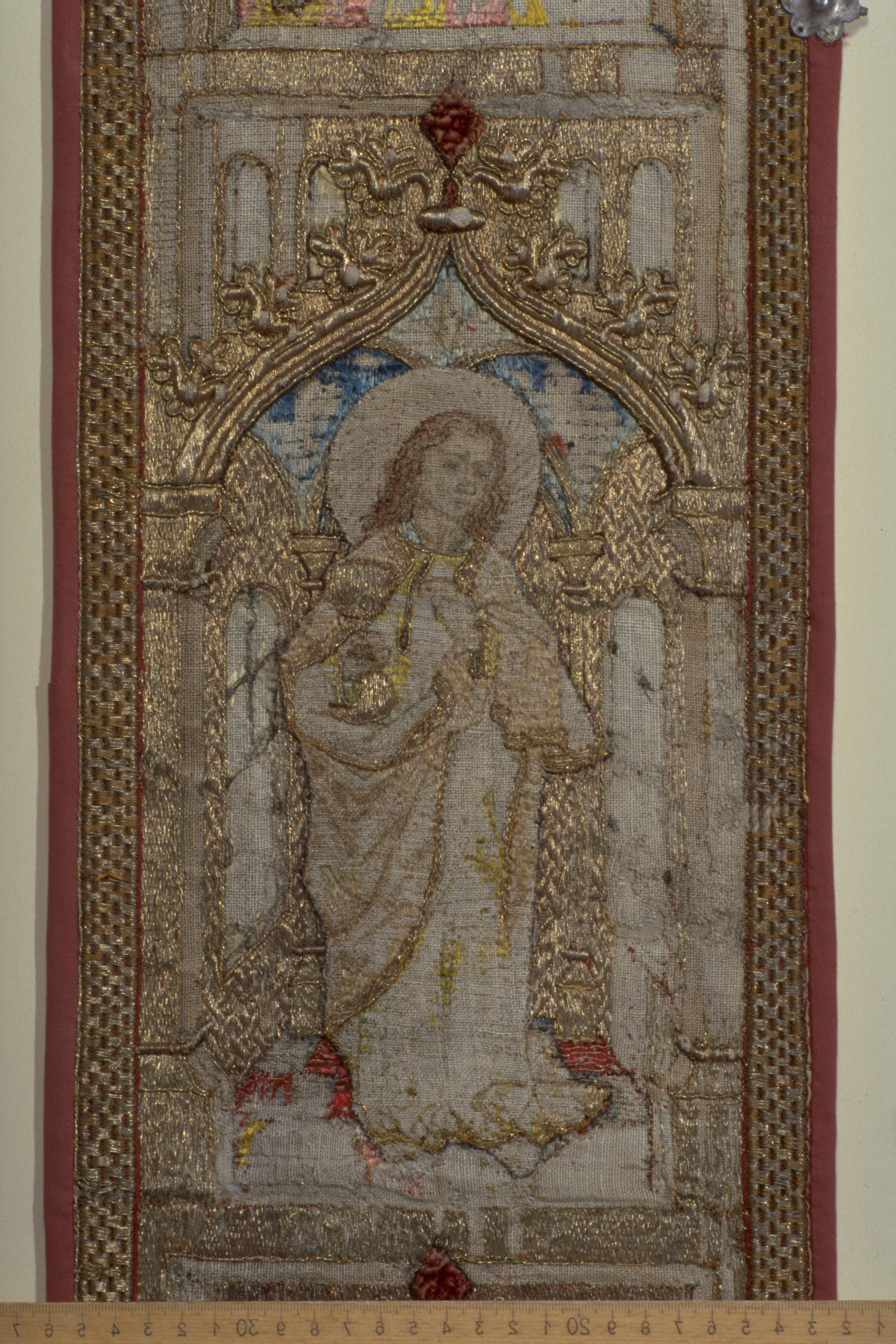Figurbroderi i guld och silke på lärft, Herman van den Lyndens verkstad, Lübeck. I nacken mellan brämen guld och silkebroderi med musicerande änglar samt knäppklaff med IHS i Vadstenaarbete. Deponerad i SHM 1868.