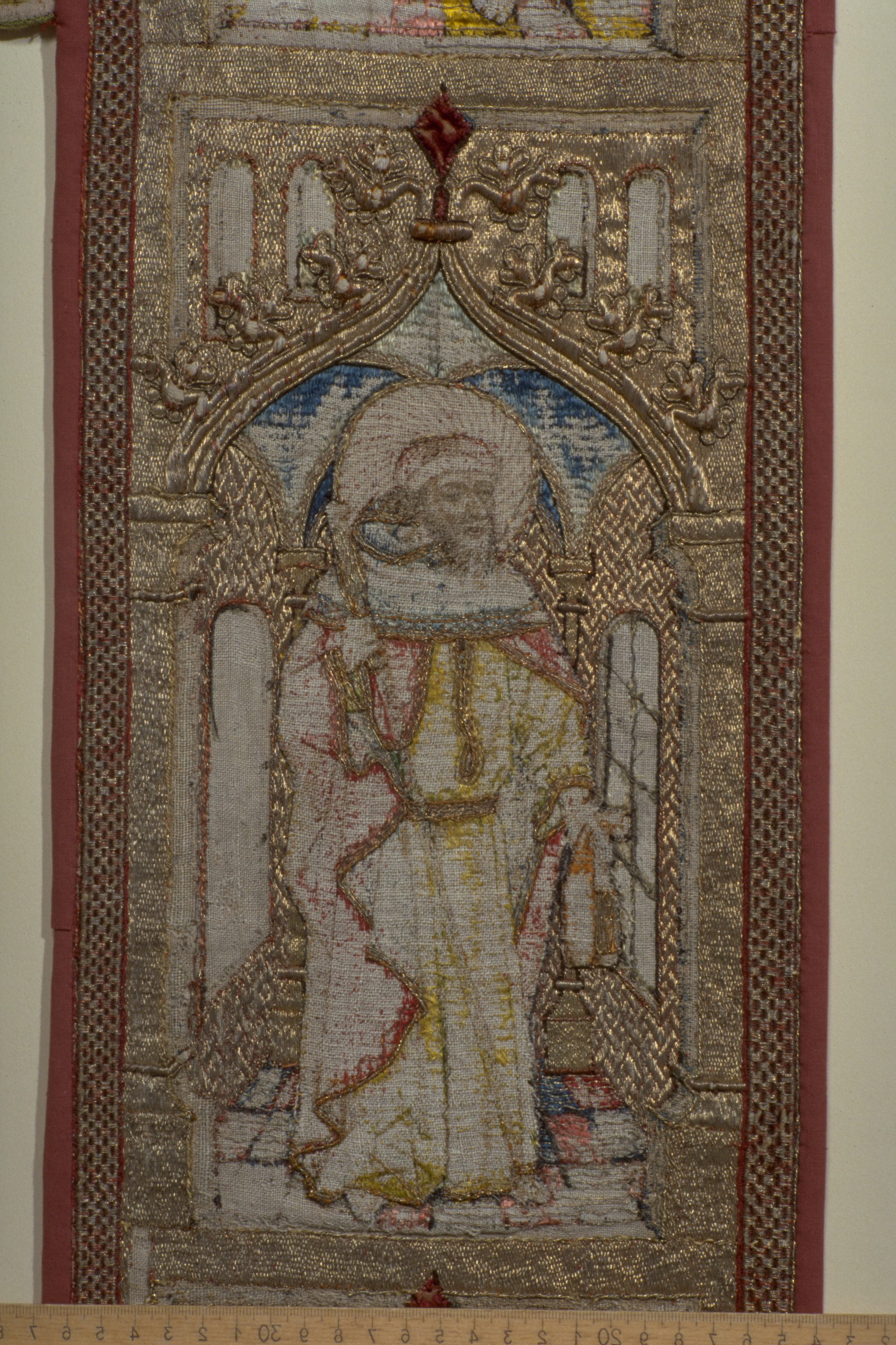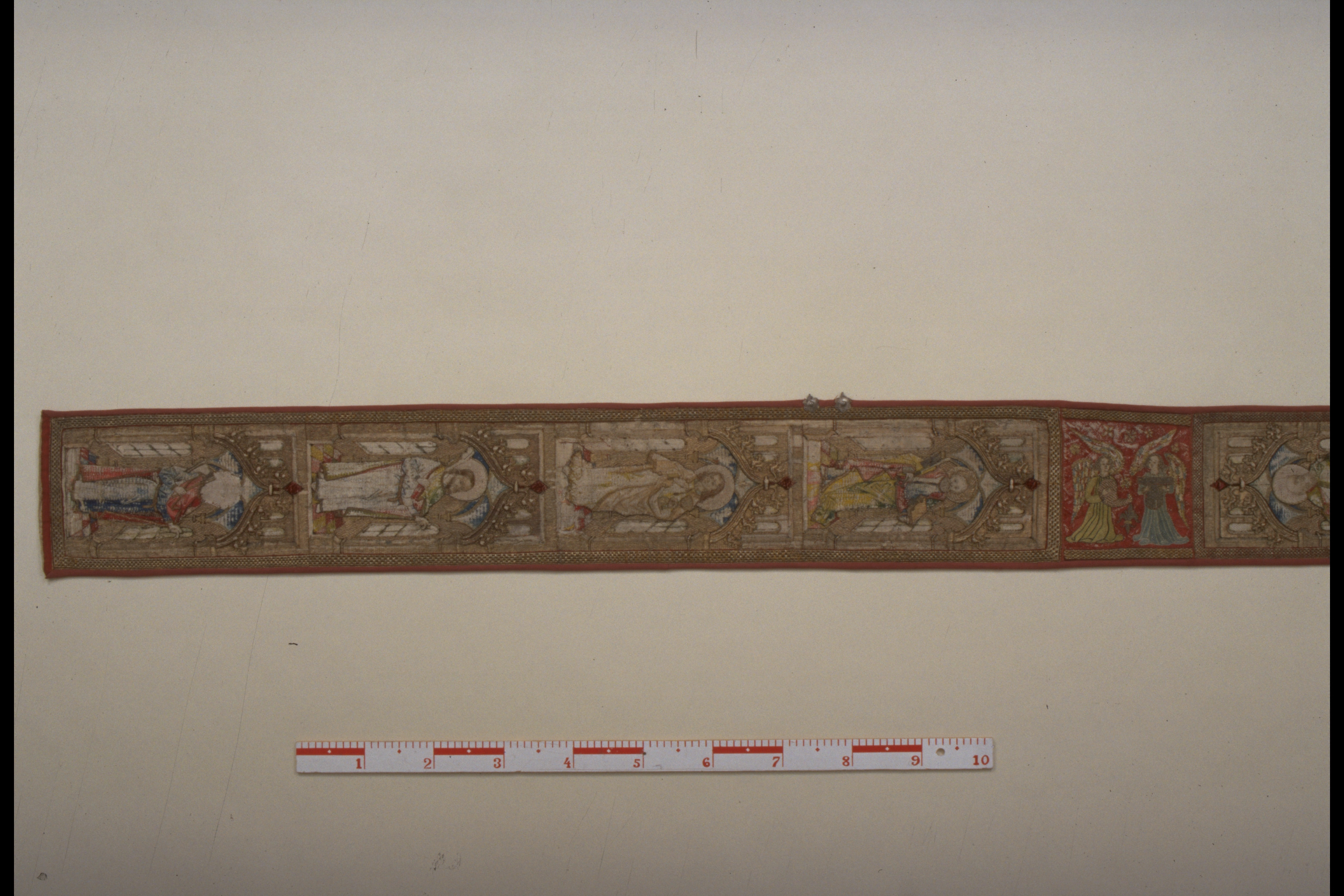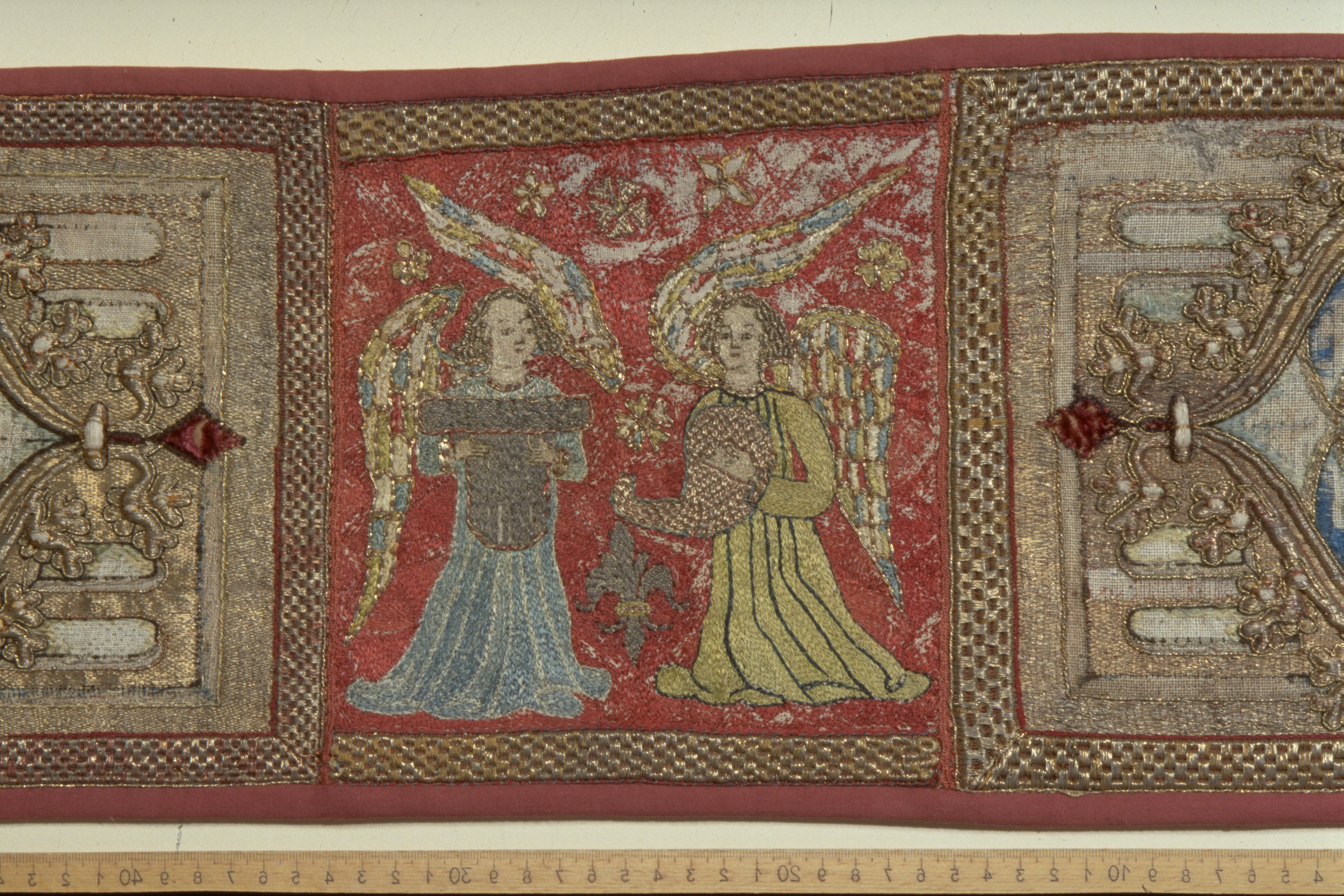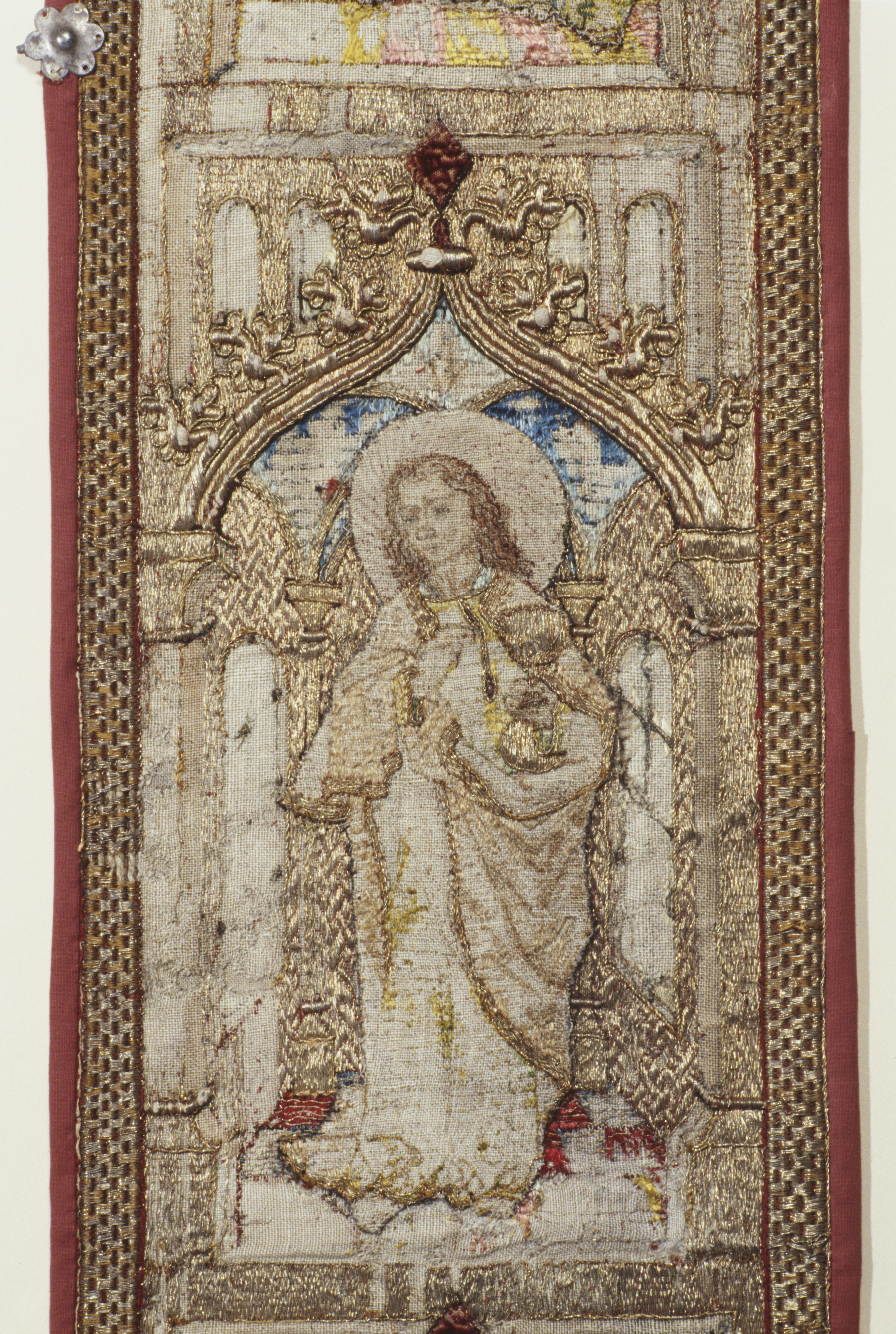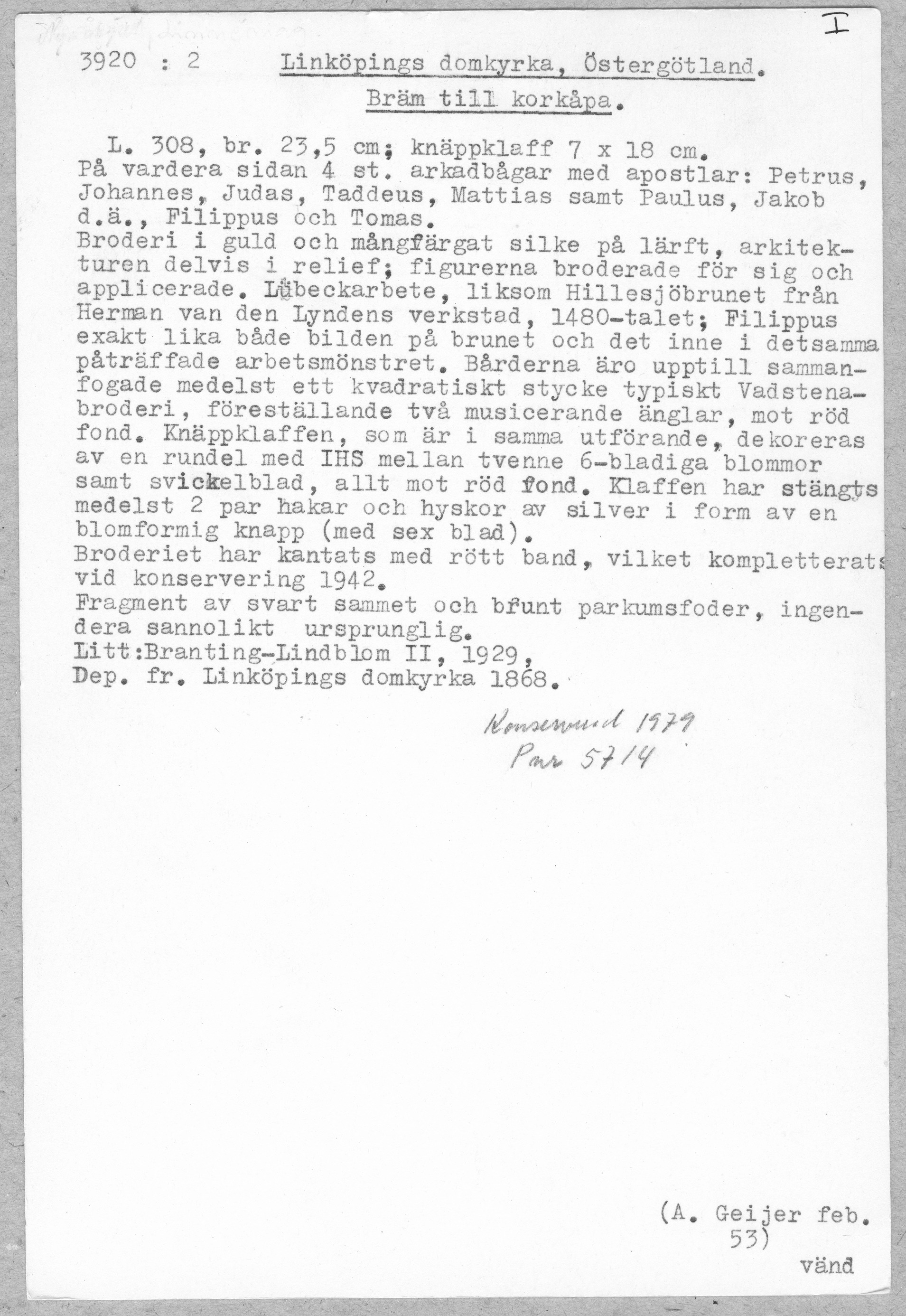 Figurbroderi i guld och silke på lärft, Herman van den Lyndens verkstad, Lübeck. I nacken mellan brämen guld och silkebroderi med musicerande änglar samt knäppklaff med IHS i Vadstenaarbete. Deponerad i SHM 1868.