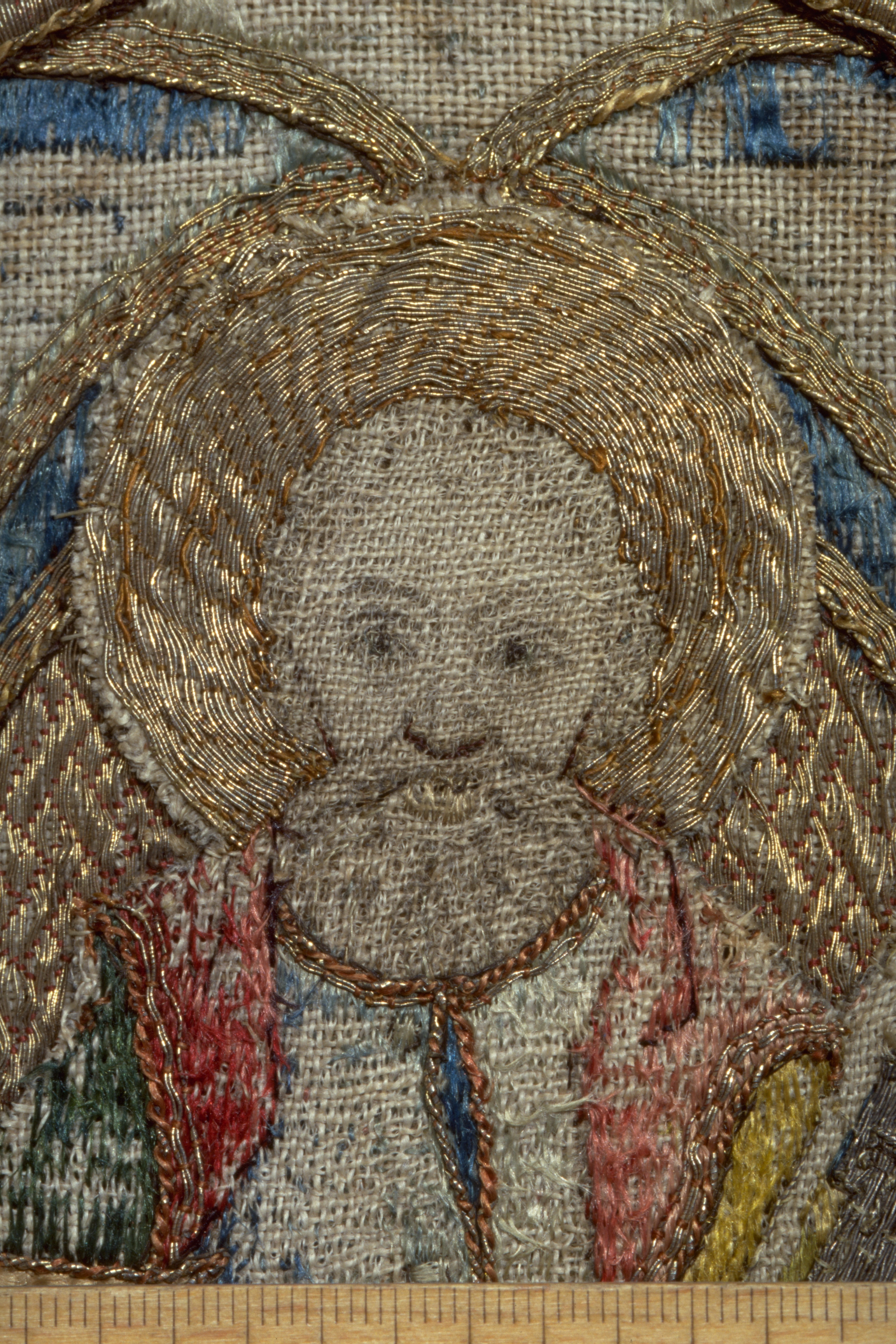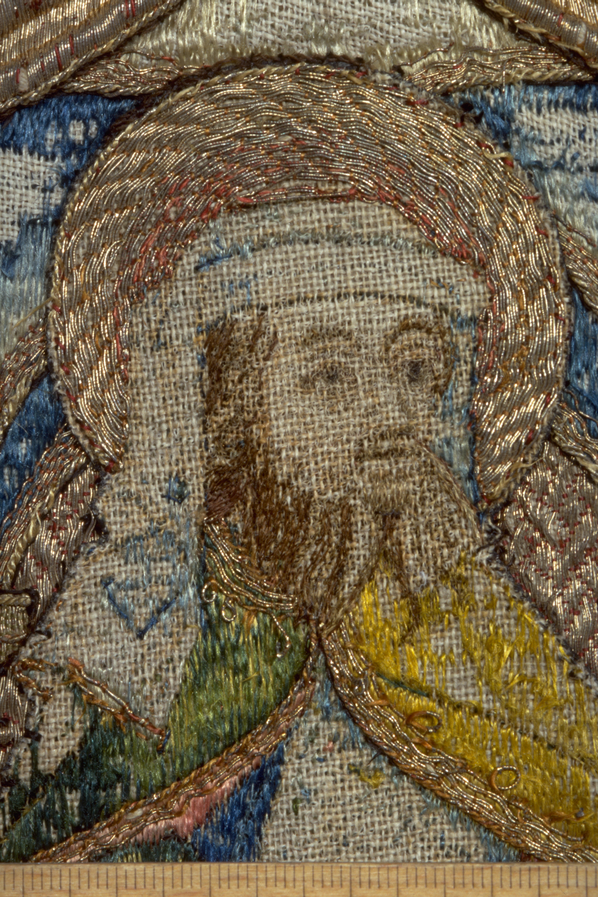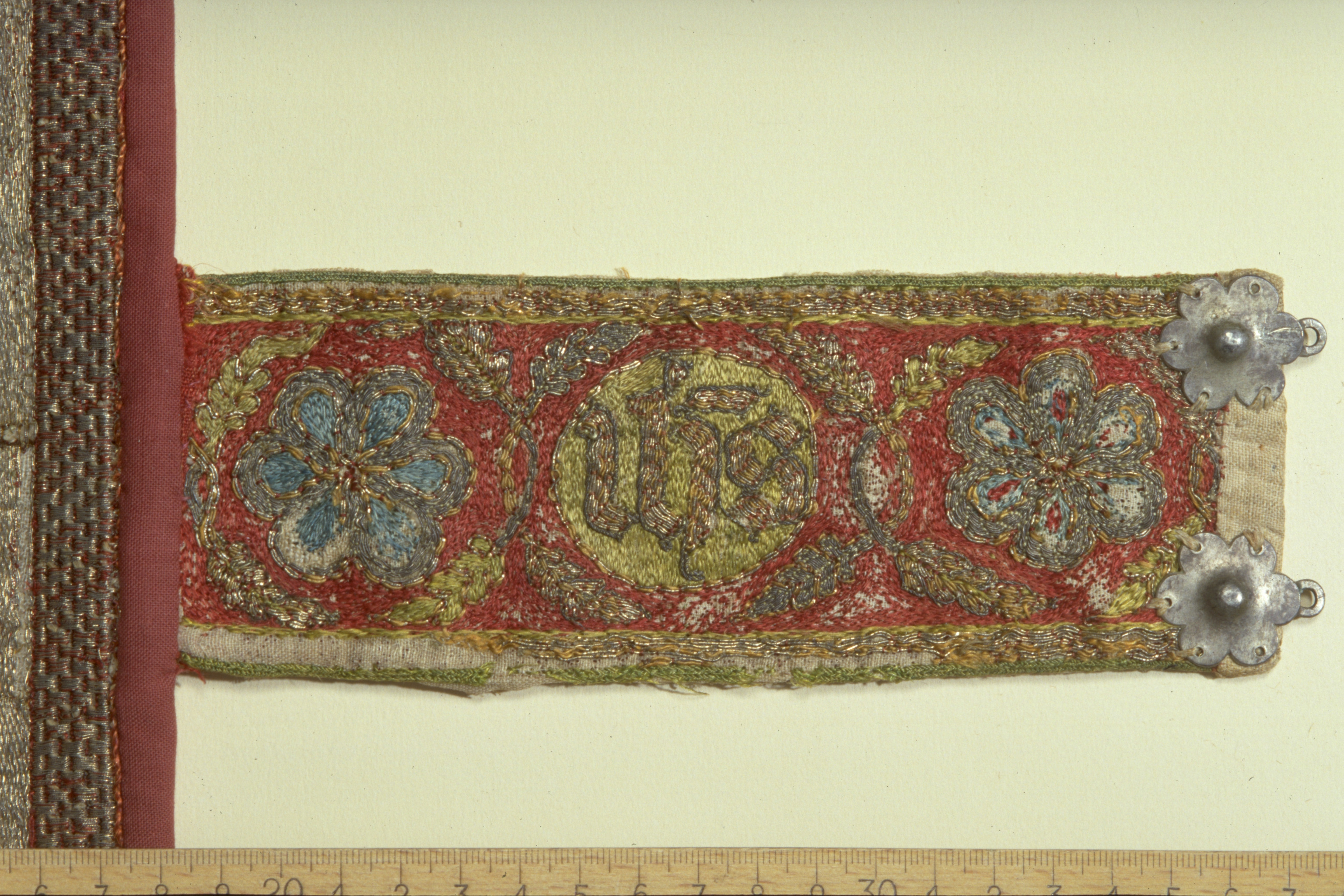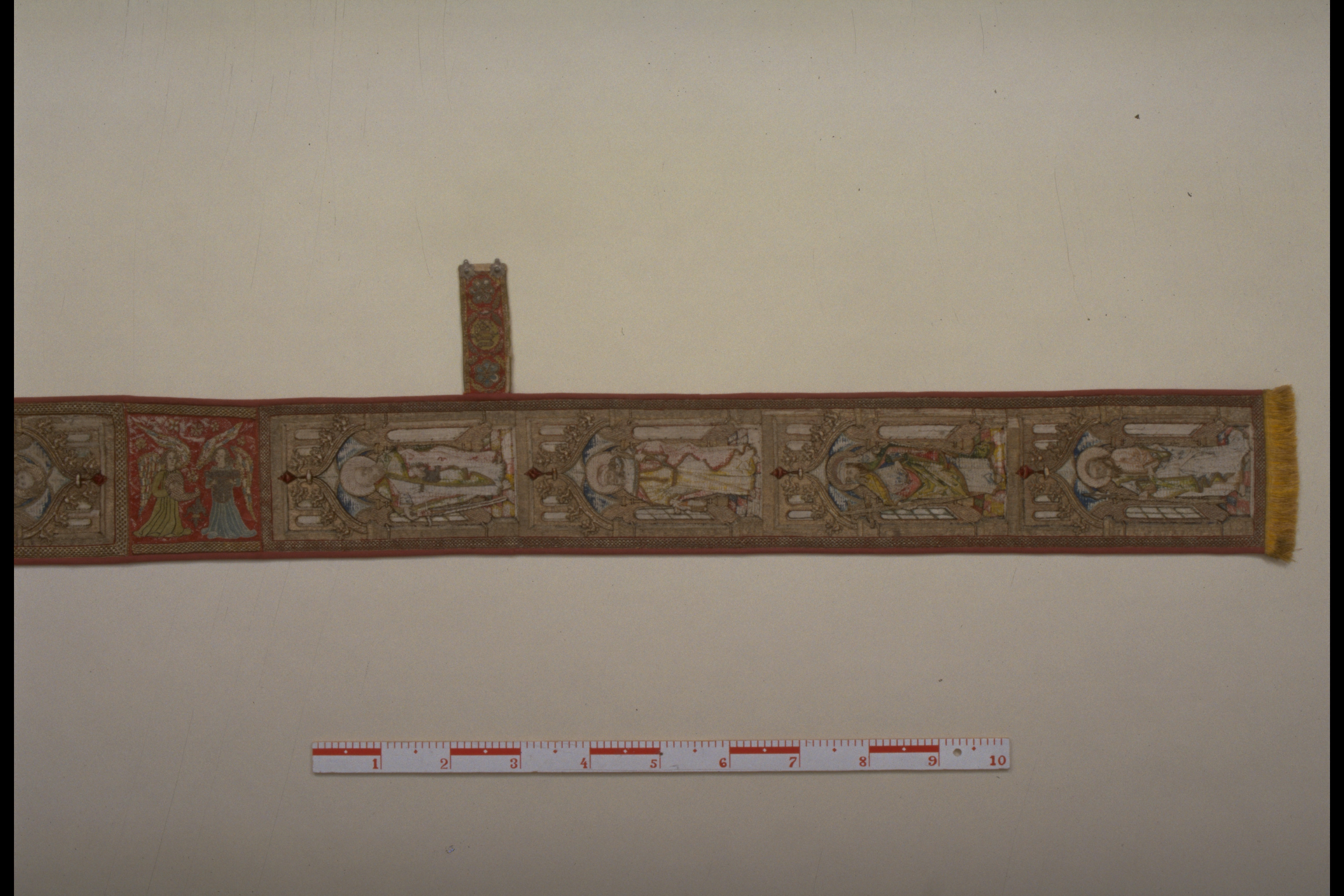 Figurbroderi i guld och silke på lärft, Herman van den Lyndens verkstad, Lübeck. I nacken mellan brämen guld och silkebroderi med musicerande änglar samt knäppklaff med IHS i Vadstenaarbete. Deponerad i SHM 1868.