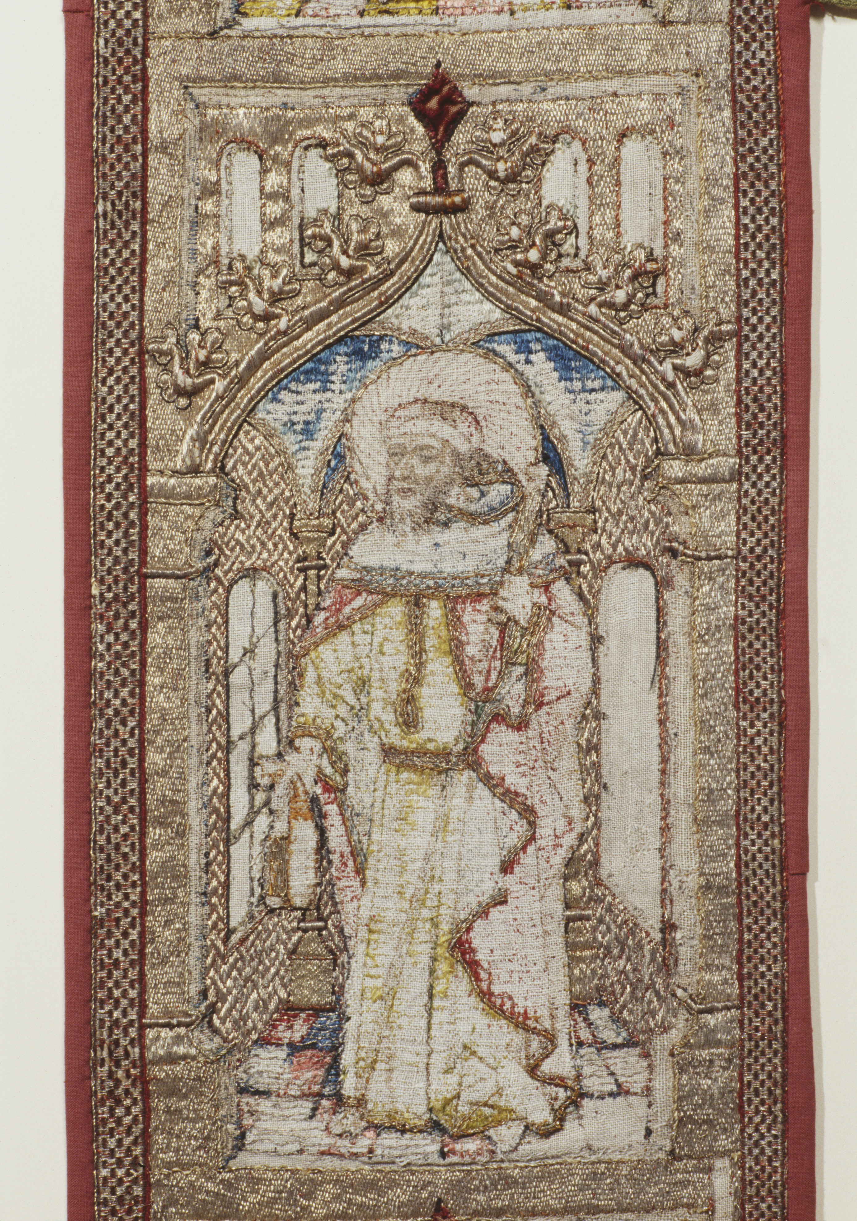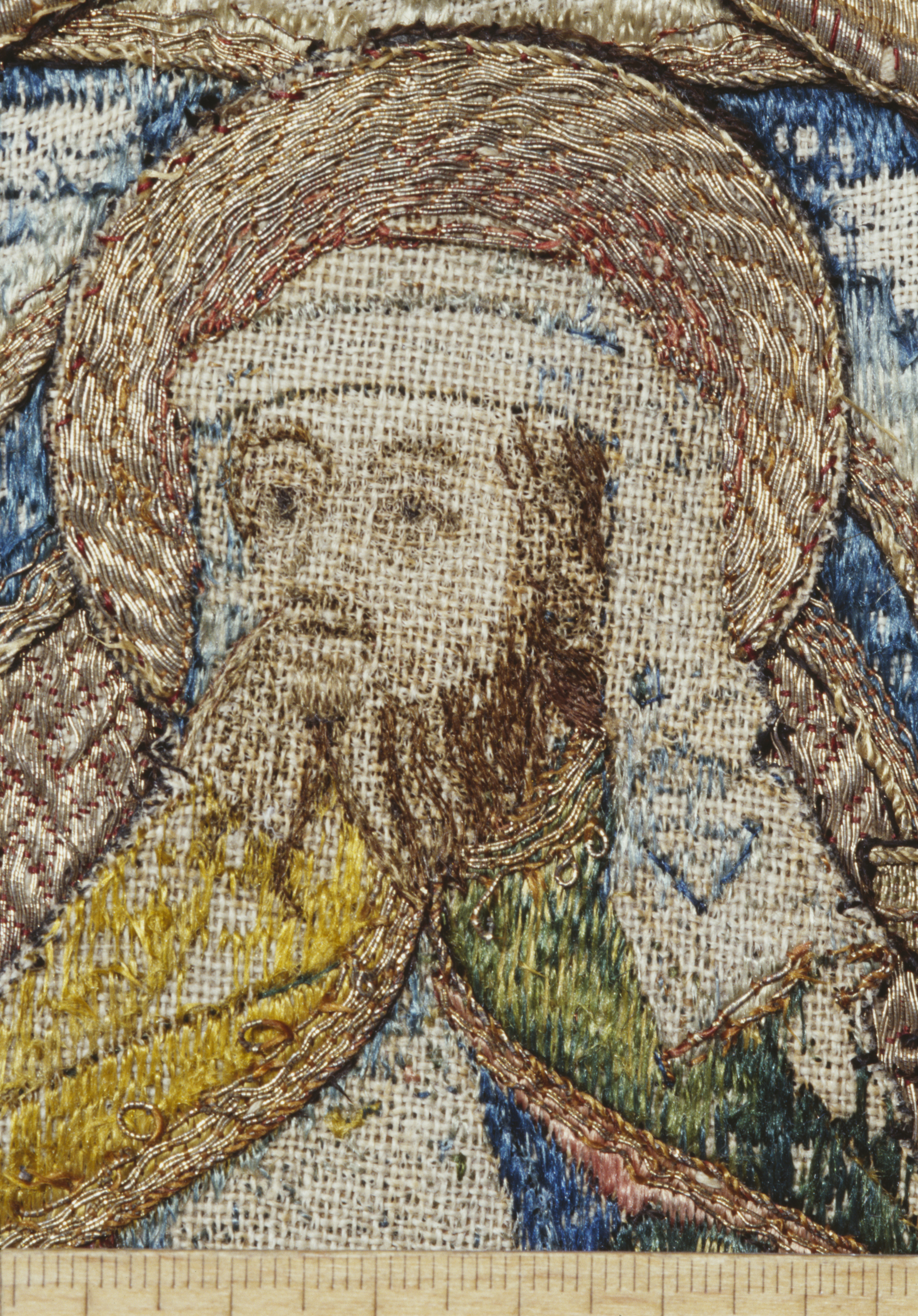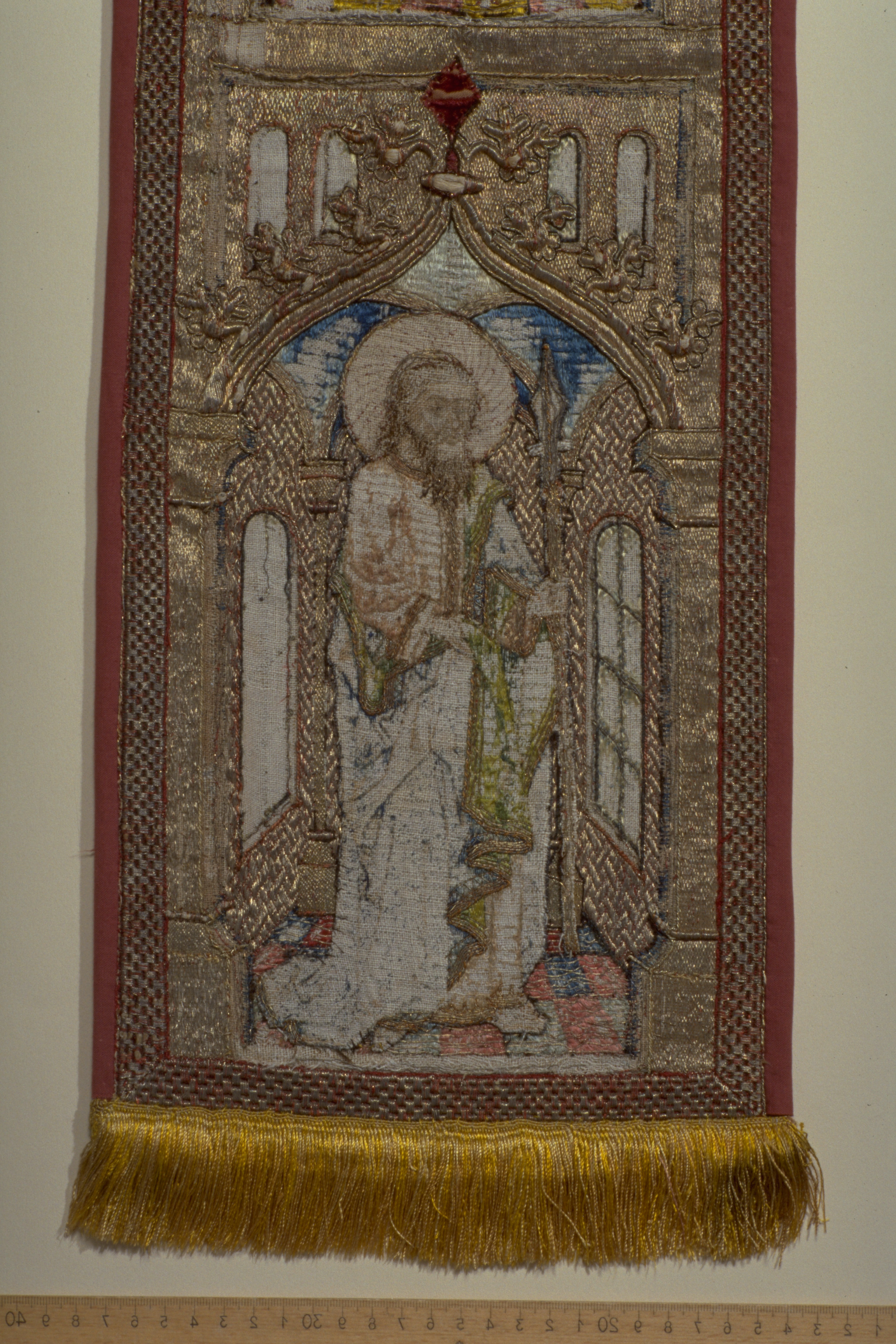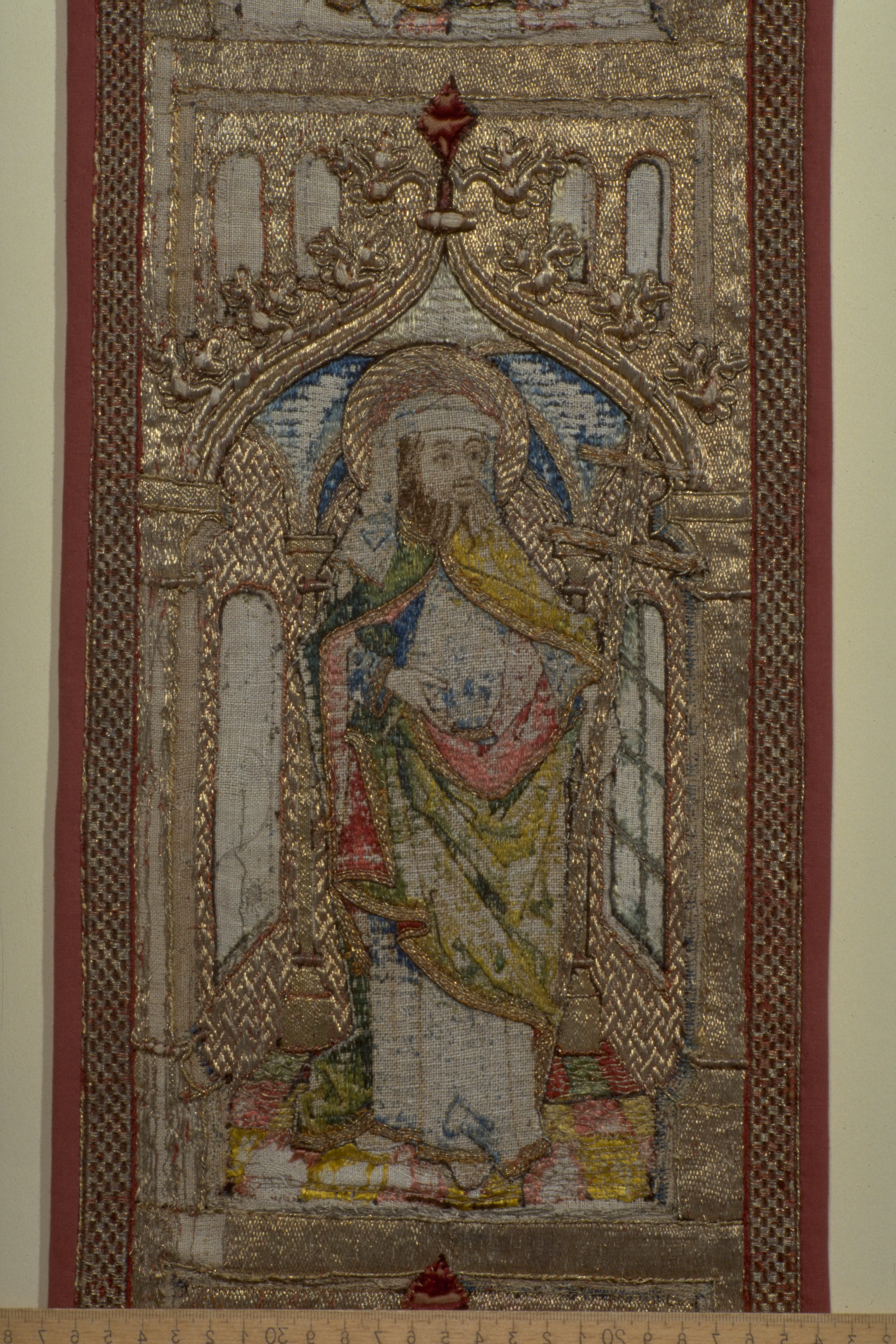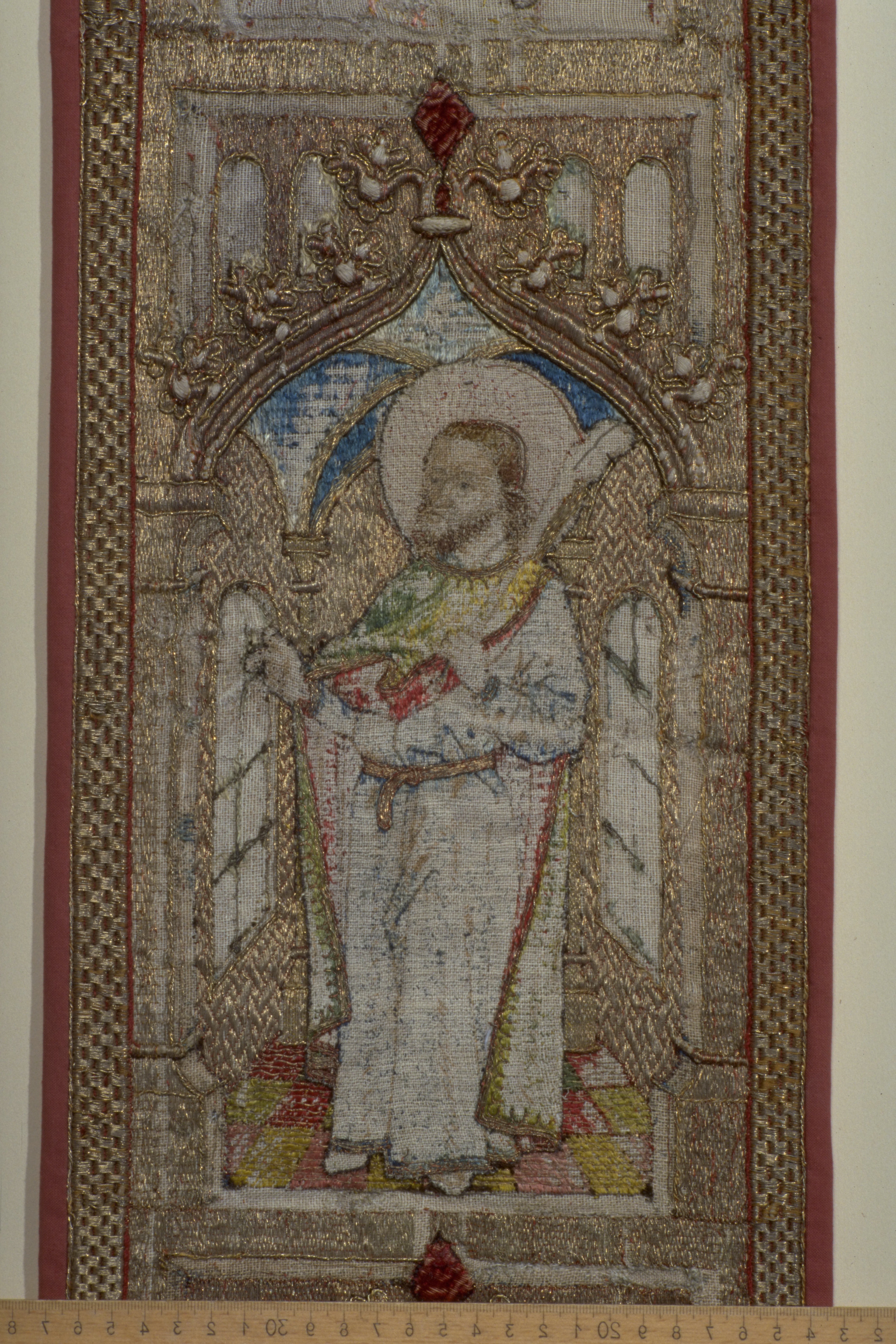 Figurbroderi i guld och silke på lärft, Herman van den Lyndens verkstad, Lübeck. I nacken mellan brämen guld och silkebroderi med musicerande änglar samt knäppklaff med IHS i Vadstenaarbete. Deponerad i SHM 1868.