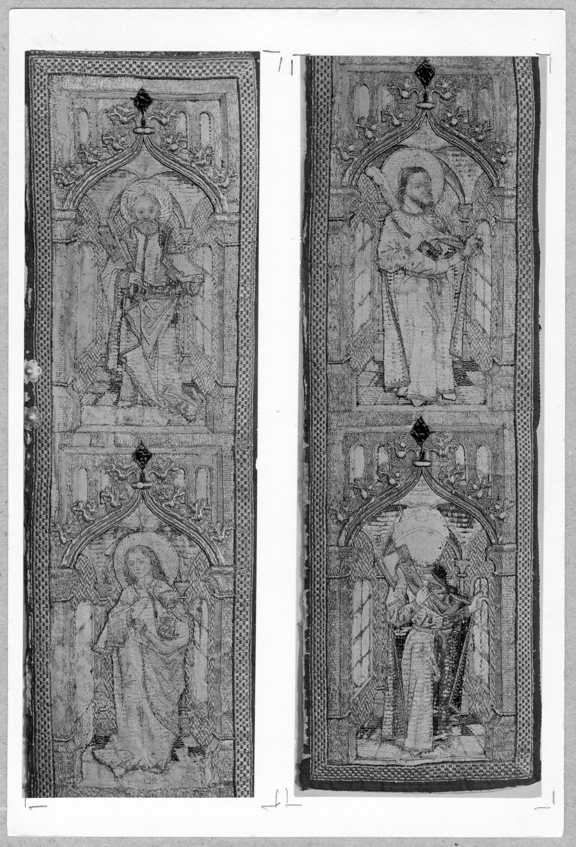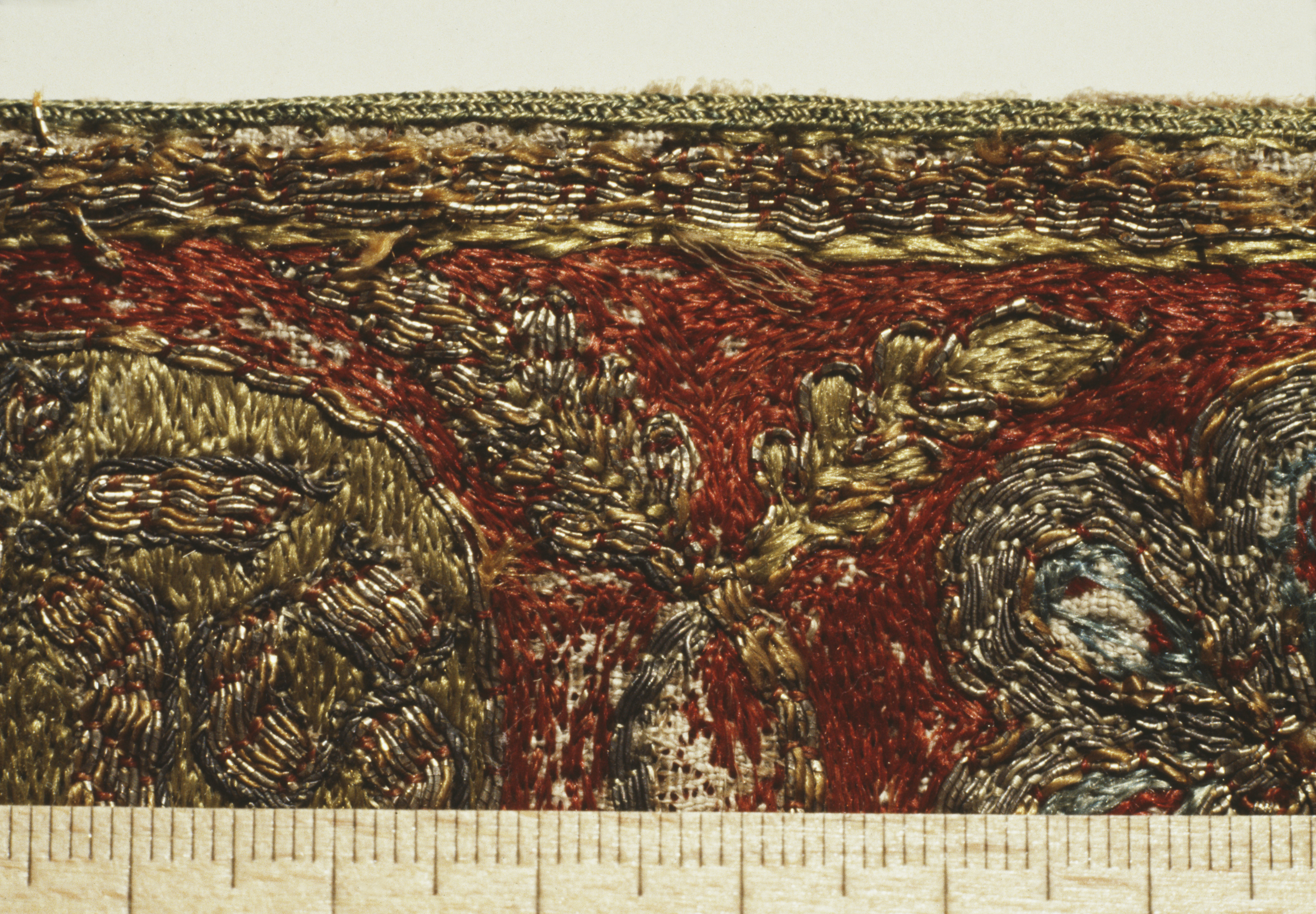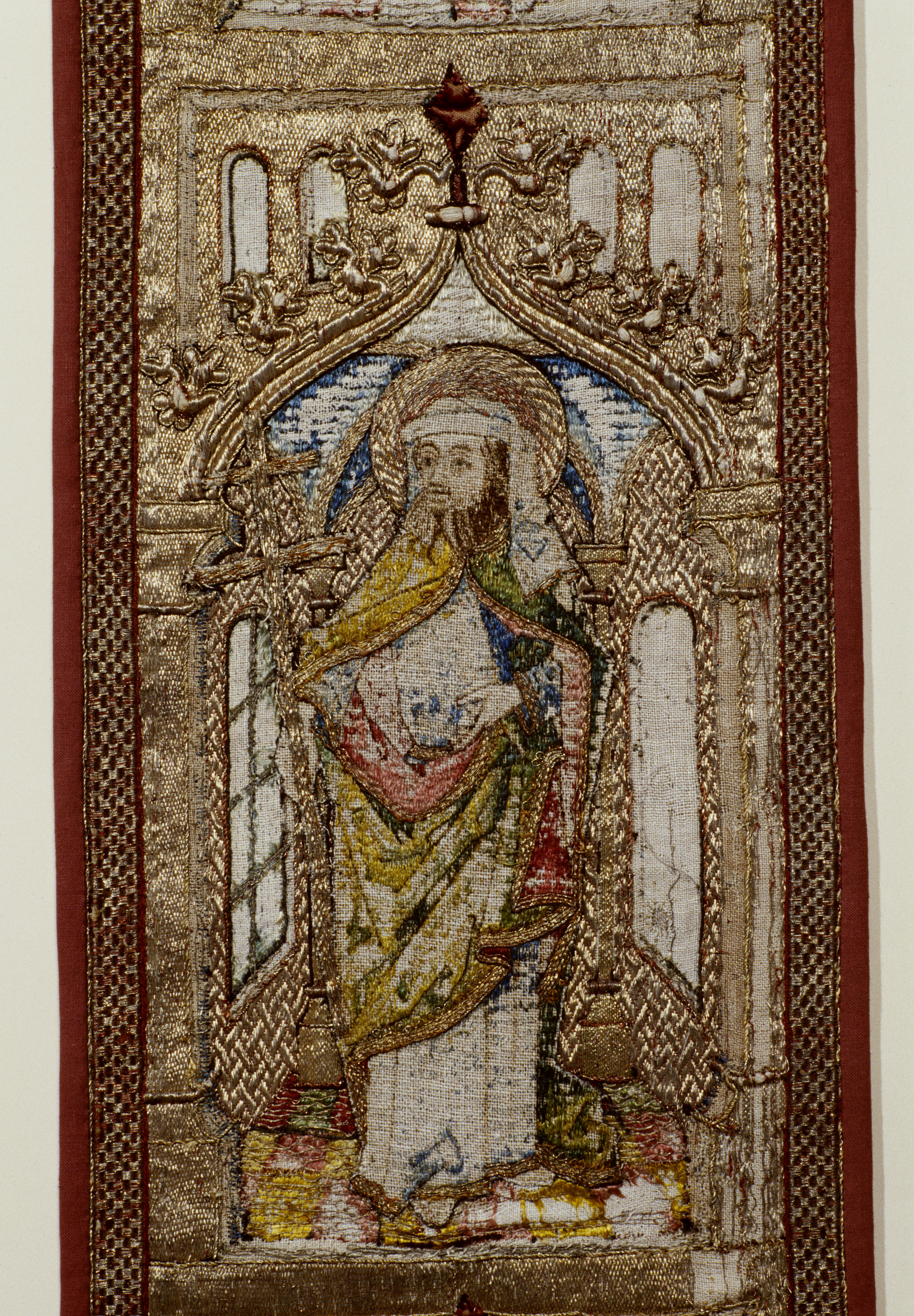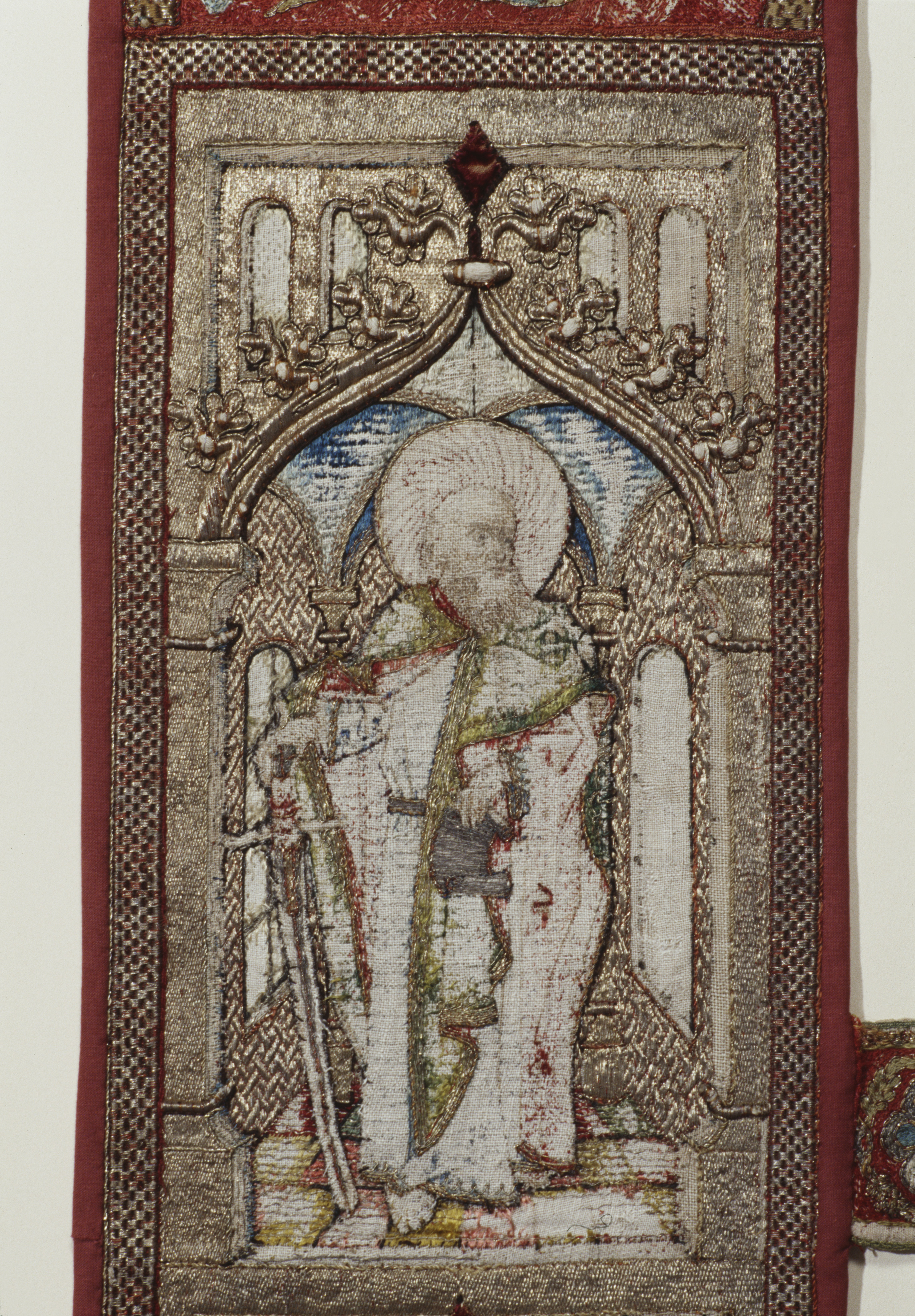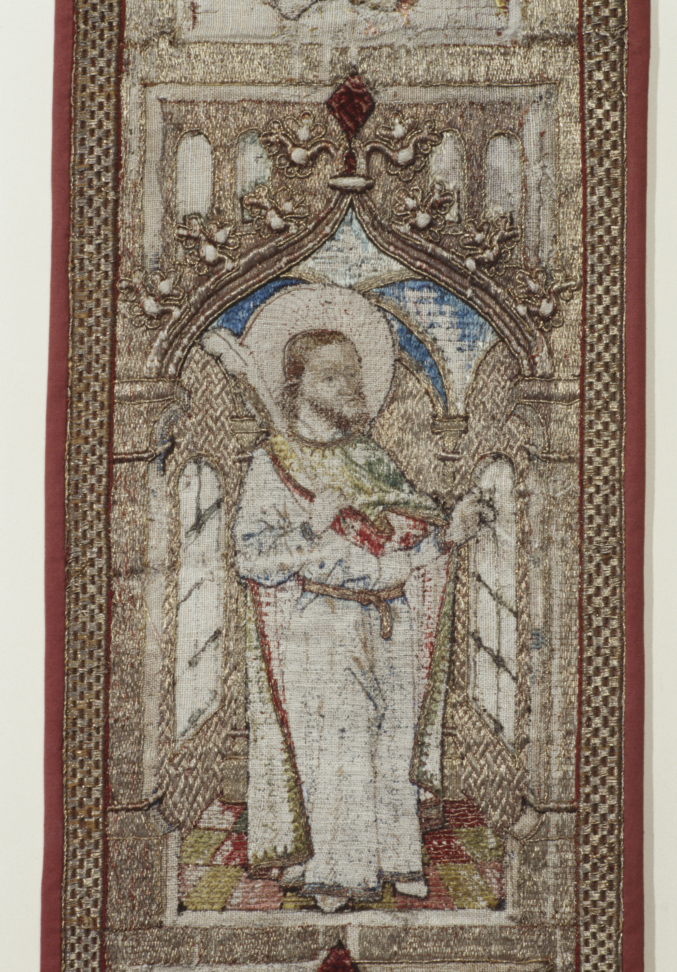Figurbroderi i guld och silke på lärft, Herman van den Lyndens verkstad, Lübeck. I nacken mellan brämen guld och silkebroderi med musicerande änglar samt knäppklaff med IHS i Vadstenaarbete. Deponerad i SHM 1868.