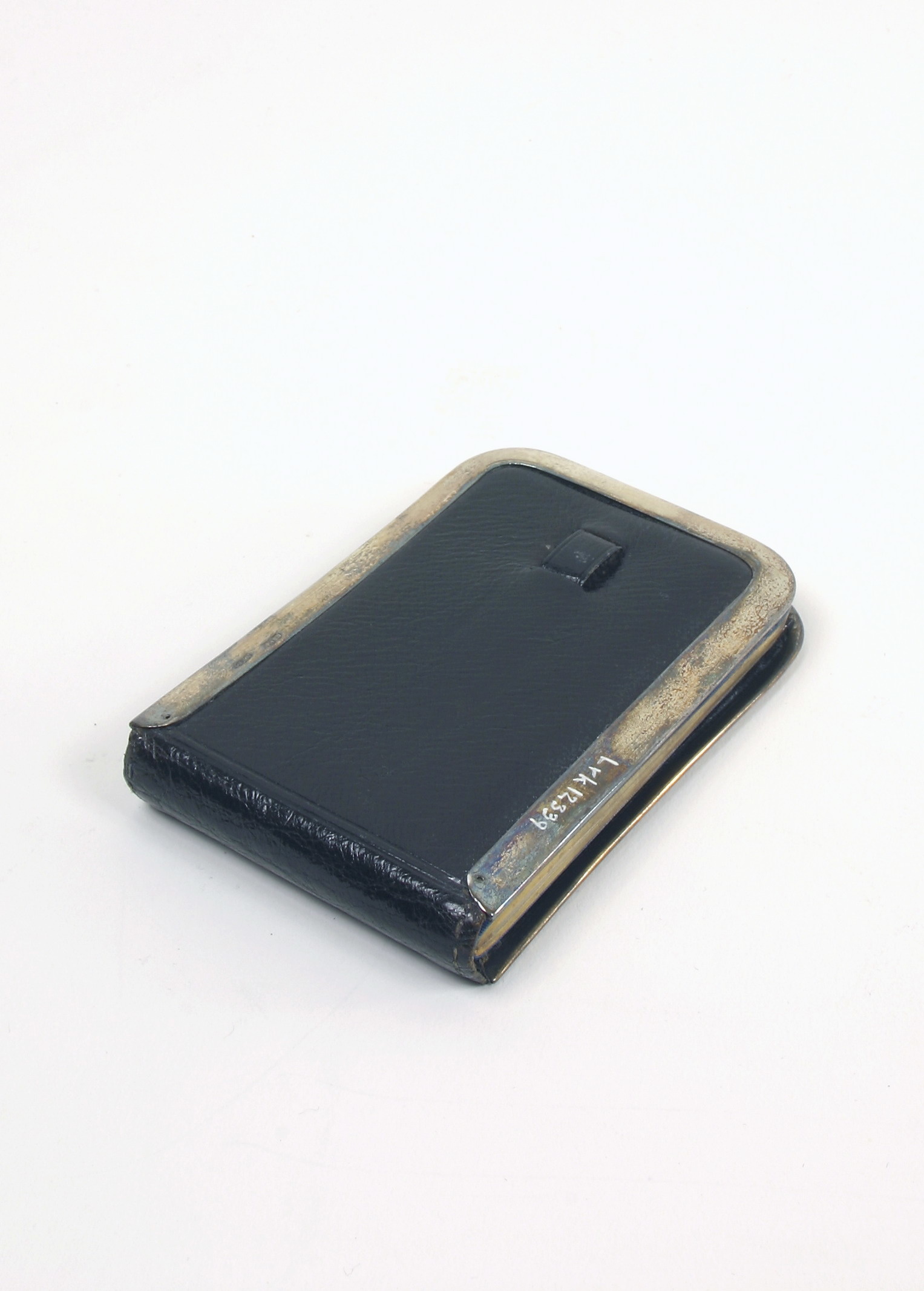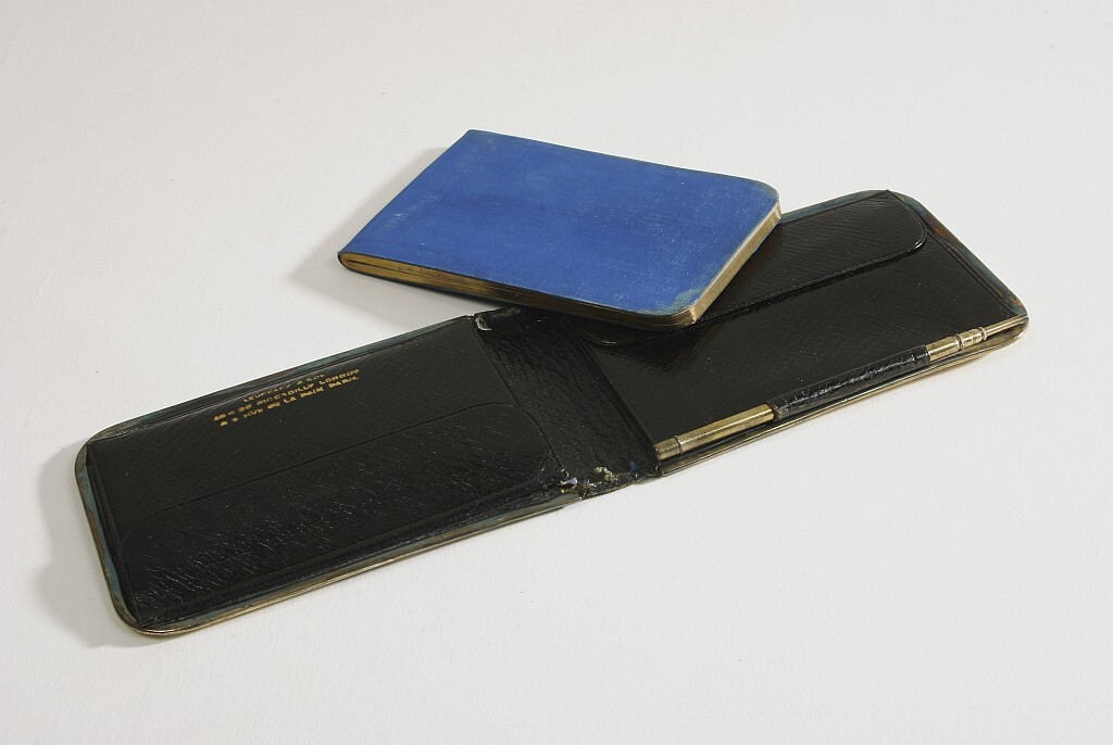 Fodral av svart läder, dubbelvikt med silverskoning runt kanterna. Stämplar: TET, två lejon, A, Victoria, (London 1876). På ena sidan hälla. Invändigt två, mot varandra ställda fack med litet övervikt lock samt foder av ljusbrunt kalvskinn. På det ena firmanamn med guldbokstäver: "LEUCHARS & SON // 36 . (?) 39 PICADILLY LONDON // 2 RUE DE LA PAIX PARIS". Vid ena kanten lång hälla för penna. Penna, 12 mm lång, diam: 4 mm, för blyertsstift, av mässing nedtill profilerad med tunna littrade kanter. Bakre delen 6 mm lång, och avskruvbar med gängad tapp. Pennan ihålig inuti. Firmanamn: "S. MORDAN & CO". Notationsblock, rektangulärt 105 mm långt, 68 mm brett med guldsnitt. Pärmarna klädda med kungsblått rips. Blanka blad. På insidan av ena pärmen skrivet med blyerts: "Gustaf" (Gustav V namnteckning). Ur resenecessär, begagnad av Gustaf V som kronprins. Gåva 1951 av Gustaf V:s arvingar genom K. Hovmarskalksämbetet.