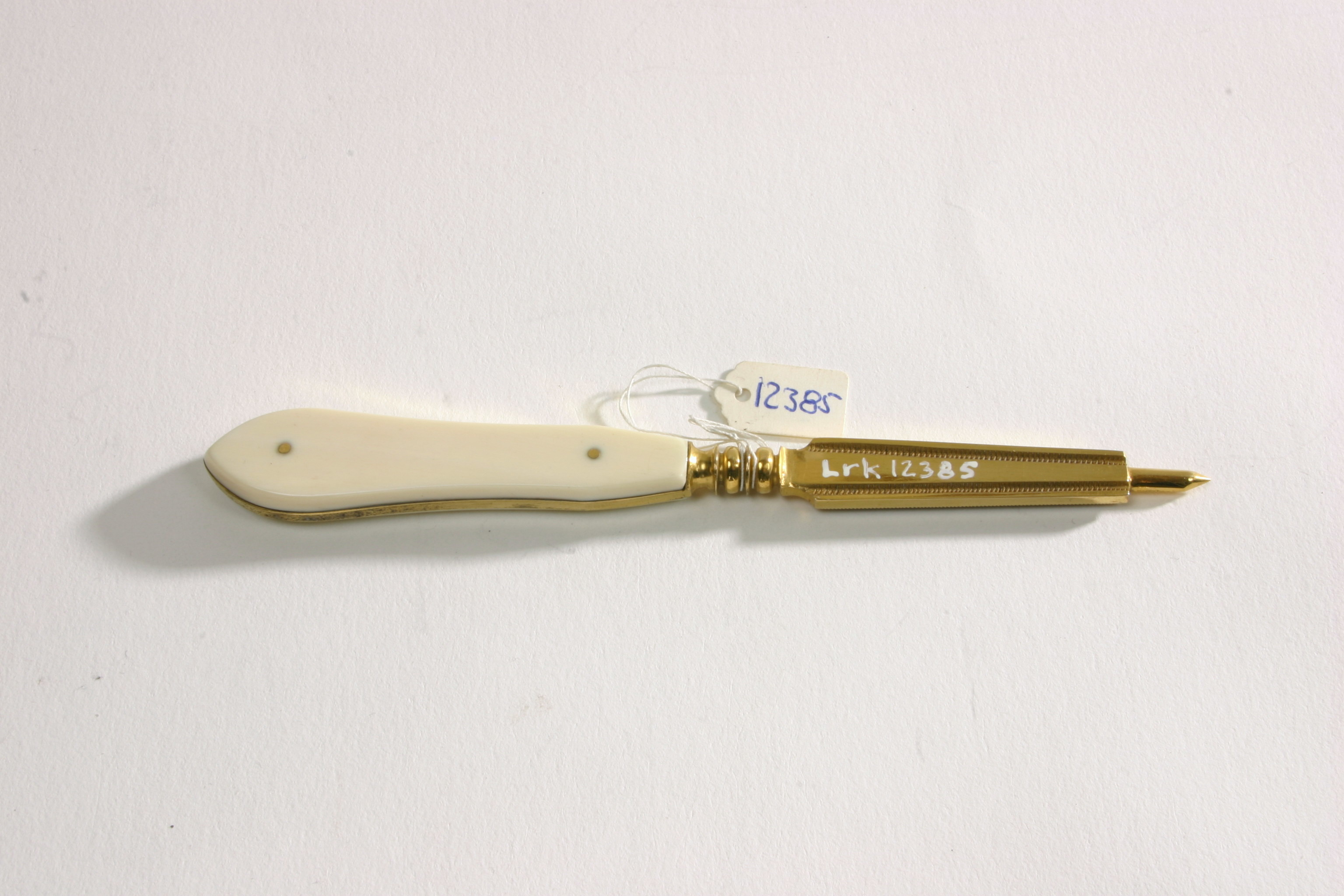 Nagelfil med skaft av elfenben i form av två släta plattor fästade genom tången med två små genomgående mässingsnitar. Skaftet till sin kontur utdraget droppformat. Fil av förgyllt stål med profilerad holk och fyrsidigt tvärsnitt. Ena sidan täckt med täta räfflor, andra sidan slät med två smala räfflade spår utmed kanterna. Filen tvärt avskuren framtill, varifrån utgår en 12mm lång spets, plan på ena sidan välvd på andra.