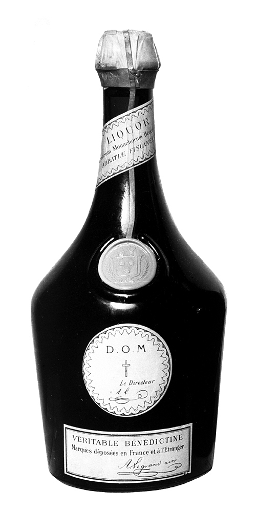 MUNKLIKÖR (Véritable Bénédictine), två helbuteljer Buteljer av grönt glas. Låga, vida, omvänt koniska, med sluttande indragen skuldra och något insvängd lång smal hals, kring vars mynning en utstående stavformig kant (s. k. stärkring); bottnen konisk. På buteljerna i relief, nedtill på skuldran mellan två kors: BÉNÉDICTINE samt på bottens undersida "X 92" och "E"; på skuldran inom en upptill öppen stavformig ring ett rött lacksigill med ett s. k. andligt vapen med tre mitror i nedtill konturerad rektangulär sköld mellan två palmkvistar samt med en mitra och en abbotstav som sköldhållare; dessutom fyra vita etiketter med text i svart, en rund och en liggande rektangulär nedanför sigillet, på motsatta sidan en liggande rektangulär samt på halsen en snett liggande rektangulär. Kapsyl av vitt pergament, nedre kanten omsluten av en bred blyring, varpå inslaget: VÉRITABLE BÉNÉDICTINE; vid ringen fastlött ett smalt blyband, gående upp över kapsylen samt med ena änden nedlöpande under lacksigillet; ovanpå kapsyl och band ett otydligt rött lacksigill. Höjd: 27,5.; diameter: 12,2 cm. Anm: En av buteljerna med endast litet innehåll (den sista Walther von Hallwyl drack av) ; halsmynningen här överdragen med brun hartsmassa. Inköpta av Walther von Hallwyl något av åren 1865-1917.