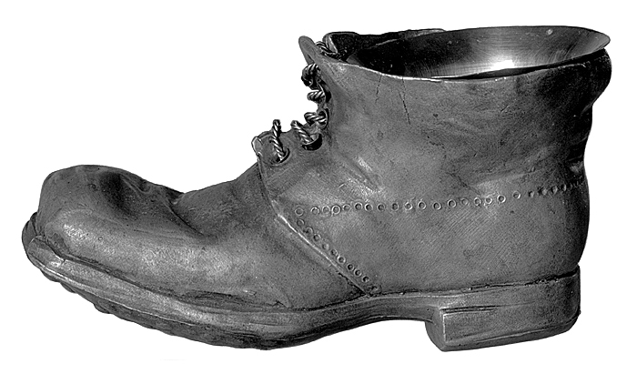 ASKKOPP. Av bly, gjuten, med bägare av förgylld mässing. I form av en snörkänga (vänster). Höjd: 8,9 cm.; längd: 18 cm.; bredd: 6,5 cm. Bägare, höjd: 7,5 cm.; diameter: 7,8 cm. Från omkring 1880. Inköpt av Wilhelmina von Hallwyl i Bon Marché Maison Aristide Boucicaut, Paris, den 17-22 September 1886 under en resa i Frankrike