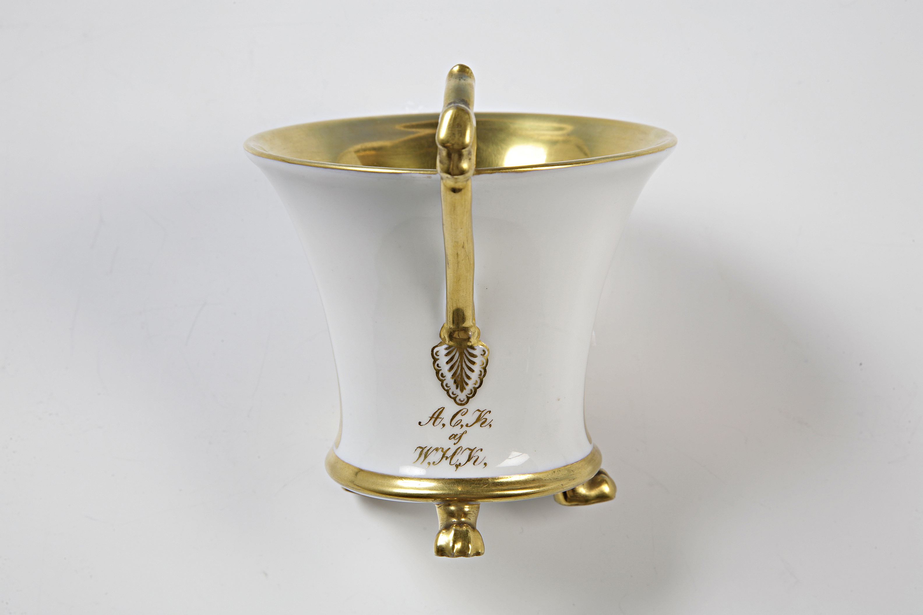 Kopp med utsvängd bredd och på tre tassfötter med fat. Dekor med vy av Stockholm sedd från Mälaren. Nedanför henkeln fäste står skrivet A C K, AF W H K vilket läses som Anna Catharina Kempe af Wilhelm Heinrich Kempe. Koppen var en gåva från Wilhelm Kempe till sin svägerska Anna Catharina Kempe. Wilhelm Heinemann, tysk porslinsmålare som e.u. bosatte sig i Stockholm omkr. 1830 där han utförde utmärkta prydnadsmålningar på s.k. paradkoppar, vaser, porträtt, landskap etc. Hans arbeten var mycket eftersökta. Han lämnade Stockholm ca 1841. Gåva till Johanna Kempe, f. Wallis under 1870- talets förra hälft från hennes mans brorsdotter Johanna Maria Kempe.