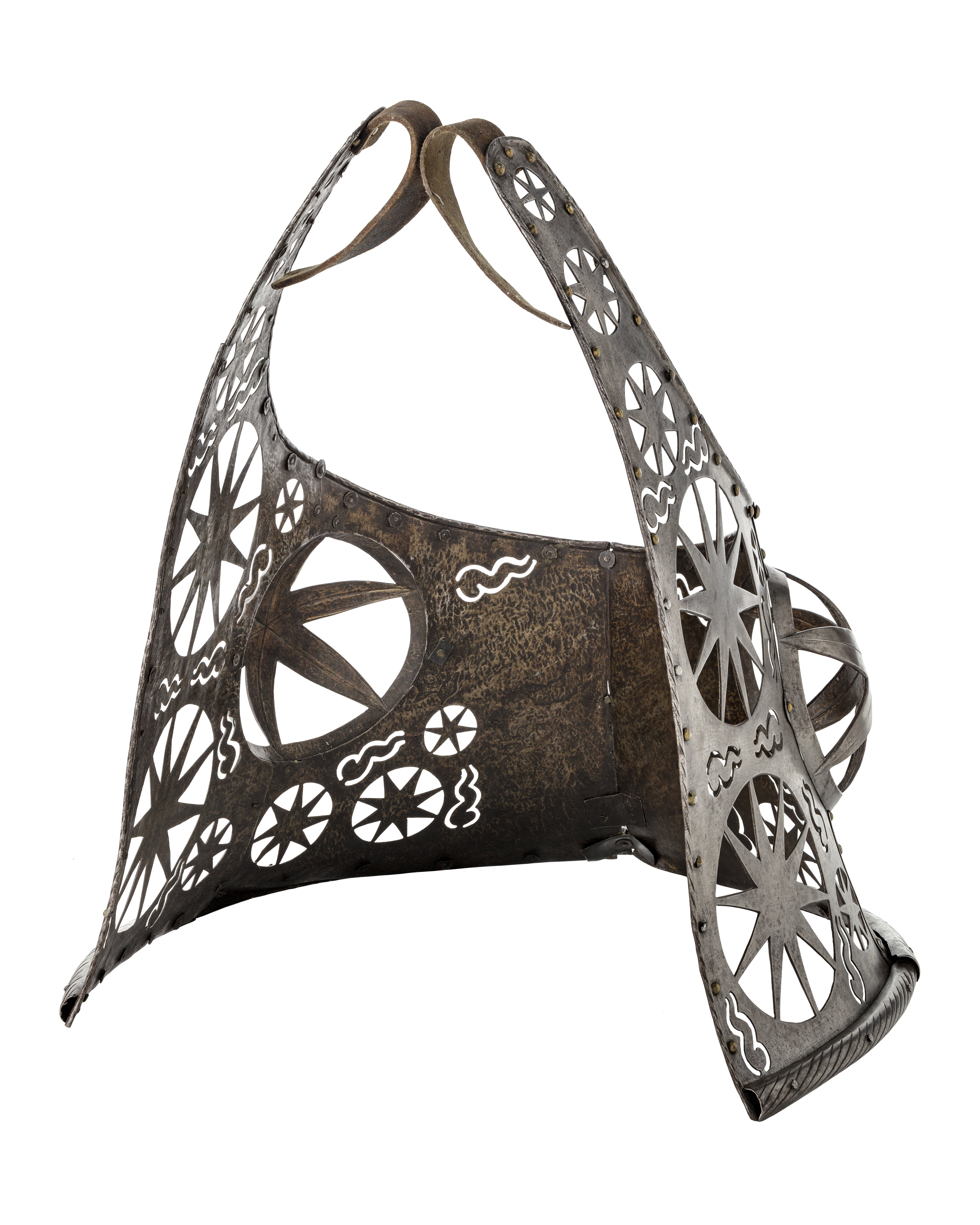 Huvudbetäckning genombruten med stjärnmönster. Manpansar i 11 delar, bogpansar, ländpansar.