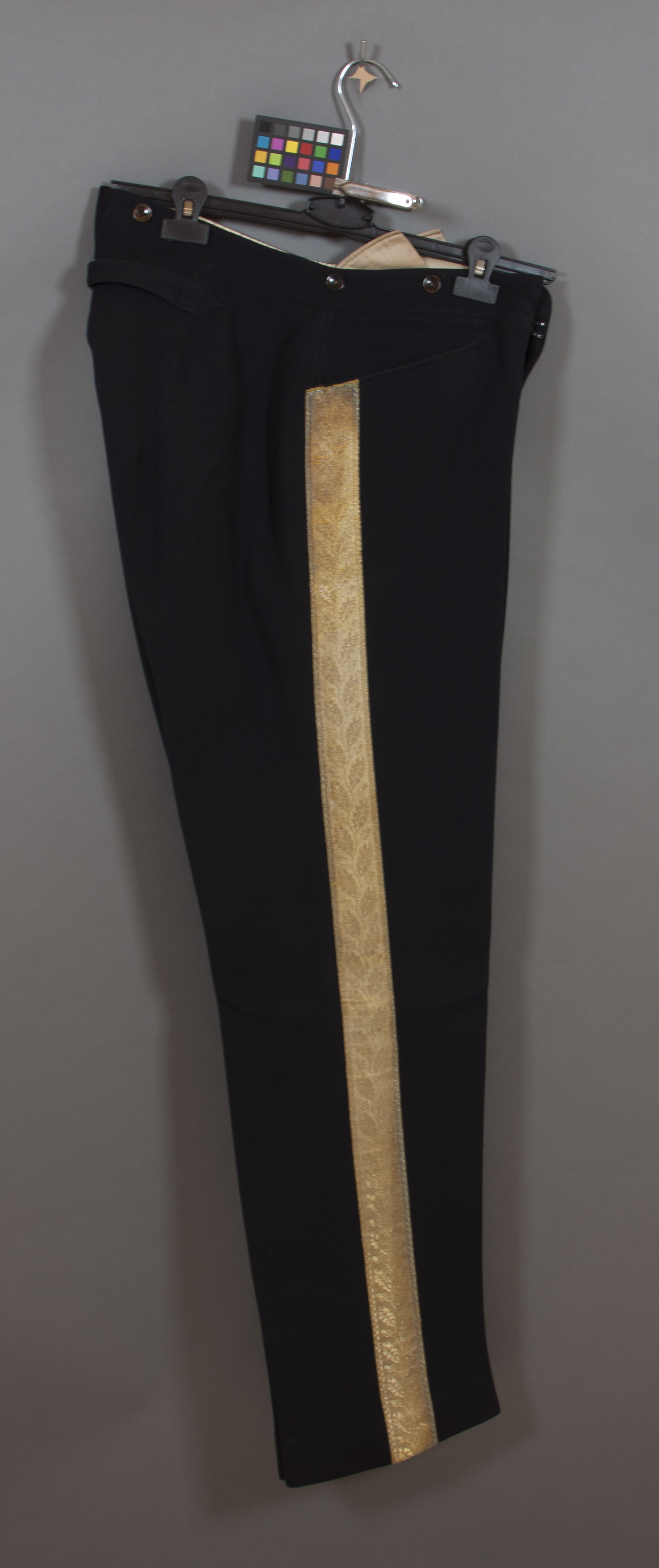Byxor av mörkblått kläde. Gylf med sex knappar av mörkbrunt horn, d: 13 mm. Linning med åtta knappar likadana, d: 16 mm. I baksömmen infälld kil av kläde, därnedanför spänntampar med svartlackerad sölja med bokstäver: "C.H.R.". Horisontella sidfickor.Utmed sidsömmarna guldgalon, b: 47 mm. Foder i linningen av vitt tunt ylle med smala, röda, ljusblå och bruna ränder. Fickor av naturfärgad bomull. L: 1125 mm, linning: 37 mm, midja: 840 mm, benvidd: 440 mm.