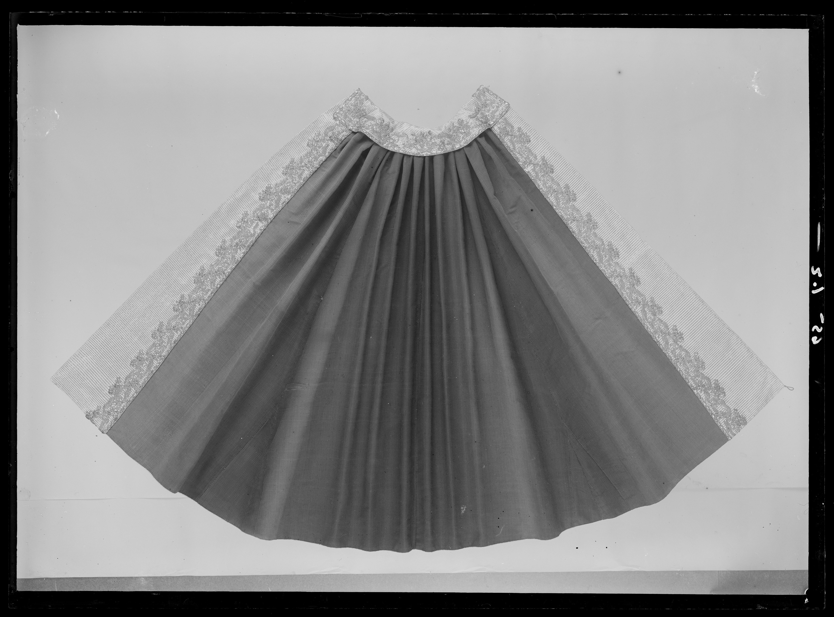 Sydd av raka 4 st delar som rynkats mot halsen och försetts med två kilar i vardera sidsöm. Slag och krage är av samma tyg som västen och dekorerade med emalj-och paljett broderier. Kragen är trådrak i framkanten och svagt rundskuren med söm mitt bak.Slagen är nedsydda i hela sin längd och kragens vikning är nedfästad för att kragen ska ligga ned. Tyget är en brun tidigare rödare ev purpur? färgad oskuren miniatyrsammet, vilken var vanlig i herrdräkter vid denna tid. Slag och krage i randigt kraftigt diagonalvävt sidentyg med mönsterinslag i silvertråd och rosafärgad metalltråd. Vådbredd på sammeten ca 55 cm. Kappan kunde knäppas fast i jackan och två spänntampar. För detta finns fästade ca 5-6 cm från framkanten. Tampen som knäpps på höger sida har två knapphål. I framkantens hörn sitter en tvinnad snodd. Krage och slag är försedda med broderier. Små blommor i rosa metallfolie, tätt lagda små guldpaljetter. I kanten två vågformade paljettslingor som korsar varandra, fälten som bildas är omväxlande i rosa och blå metallfolie. Baktill på kappan finns två mycket små slarvigt tränsade hål, nära kragsömmen. Dessutom en ögla mitt bak ca 12 cm från framkanten. Foder i satinvävt ljust, "ventre de biche" färgat siden. Vådbredd ca 55 cm. På höger sida finns en innerficka med liggande fickstolpe och ett lodrätt knapphål samt en liten platt klädd knapp. Fodret i kappan är tillskuret av raka tygstycken som fått ökad vidd nedtill med hjälp av kilar. Två kilar på höger sida och tre kilar på vänster.