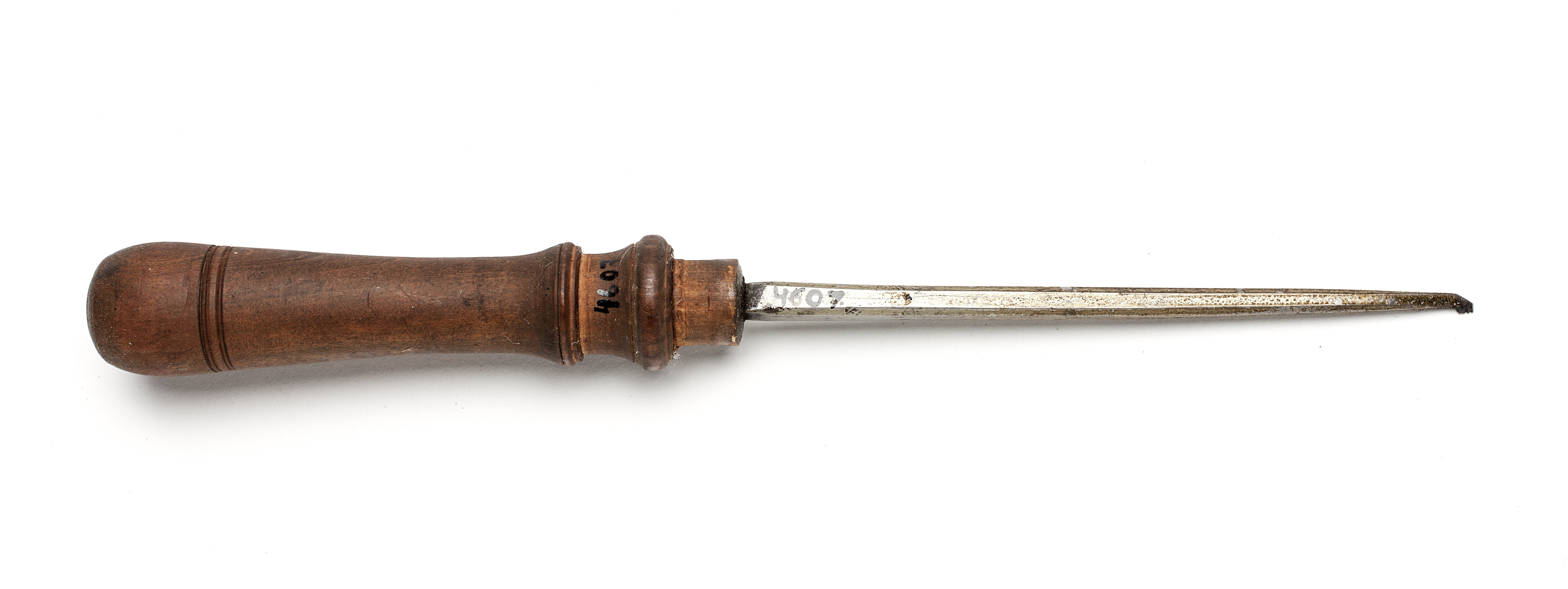 Klinga med åttsidig genomskärning. Stämplat på klingan: "1" och "9" (frakturstil) Vinkelställd, fyrtandad egg. Svarvat skaft av päronträ, med två vulster nedtill ("rydboholmstyp").