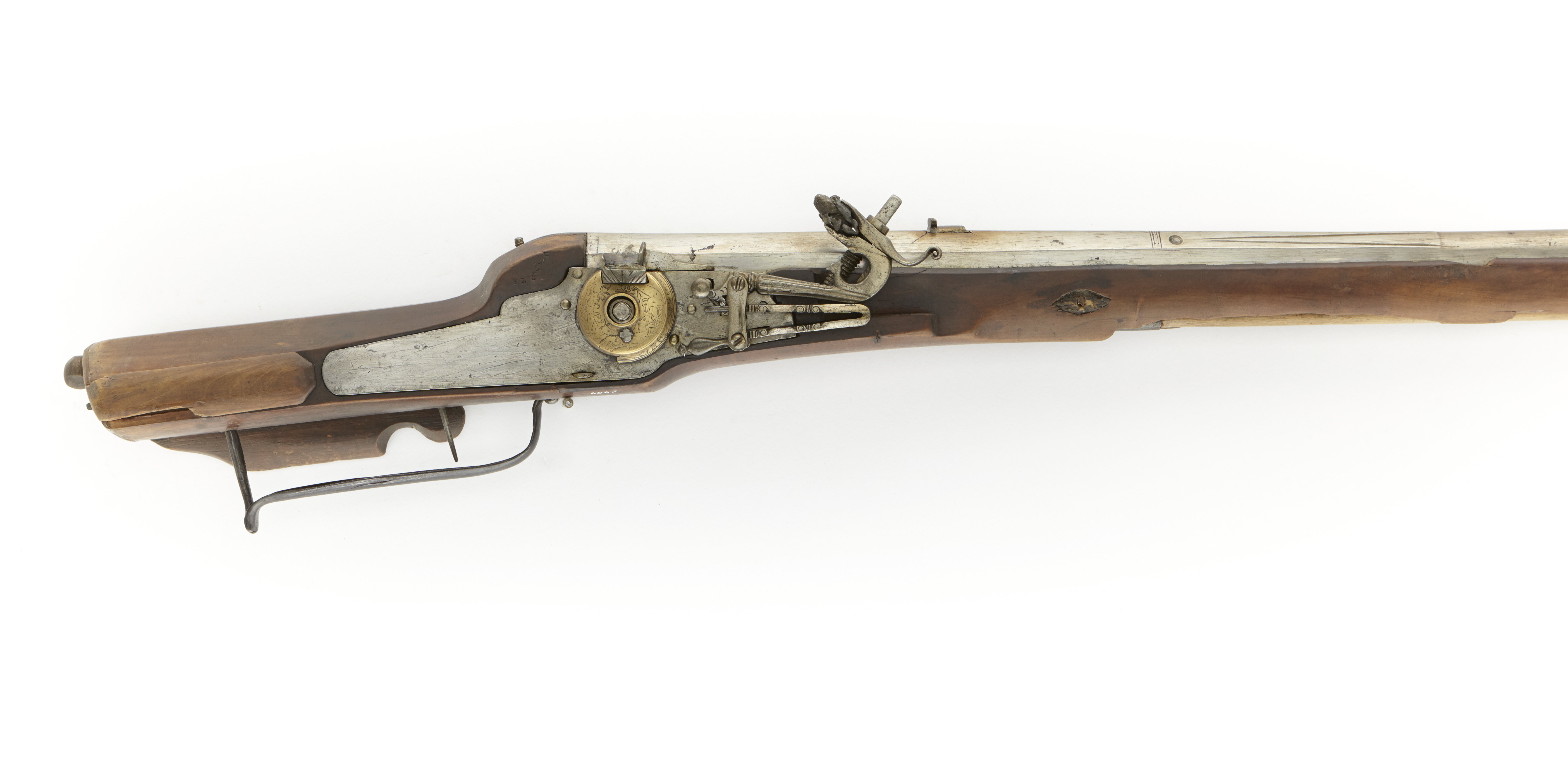 Rund, över kammaren åttkantig tornpipa av stål. Slätborrad. Ståndsikte av stål med från vardera hörnet utgående, graverade linjer. Knoppkorn av mässing. Tre piphäften. Hjullås. Blånerat låsbleck av tysk typ - bakåt avsmalnande genom två fall. Kullrig hjulkapsel av mässing med graverad dekor. Låg, vertikal krutskärm. Hane med lös överkäke. Plan, omvänt c-formig hals. Kort fingergrepp. Hel stock av brunt trä. Tysk kolvtyp. Bakplåt och stödkula av horn. Två låsskruvar med runda hjorthornsbrickor. Tre pipstift - ej ursprungliga med rombiska hjorthornsbrickor. Näsband och rörka av horn. Trågformig varbygel, s.k. holsteinsk. Tillbehör: Laddstock med doppsko av ben. Svavelkis i blymantel. Märkt: 328 ovanför låsblecket, stanstyp 5376. Rött lacksigill på kolvens undersida: E Rosenkrantz. 1710 års inventarium p. 12, rum II: "31-328-1 D:o (Hacke) med blanck pijpa och messingz puckla öfr. Hiulet på låsen...."