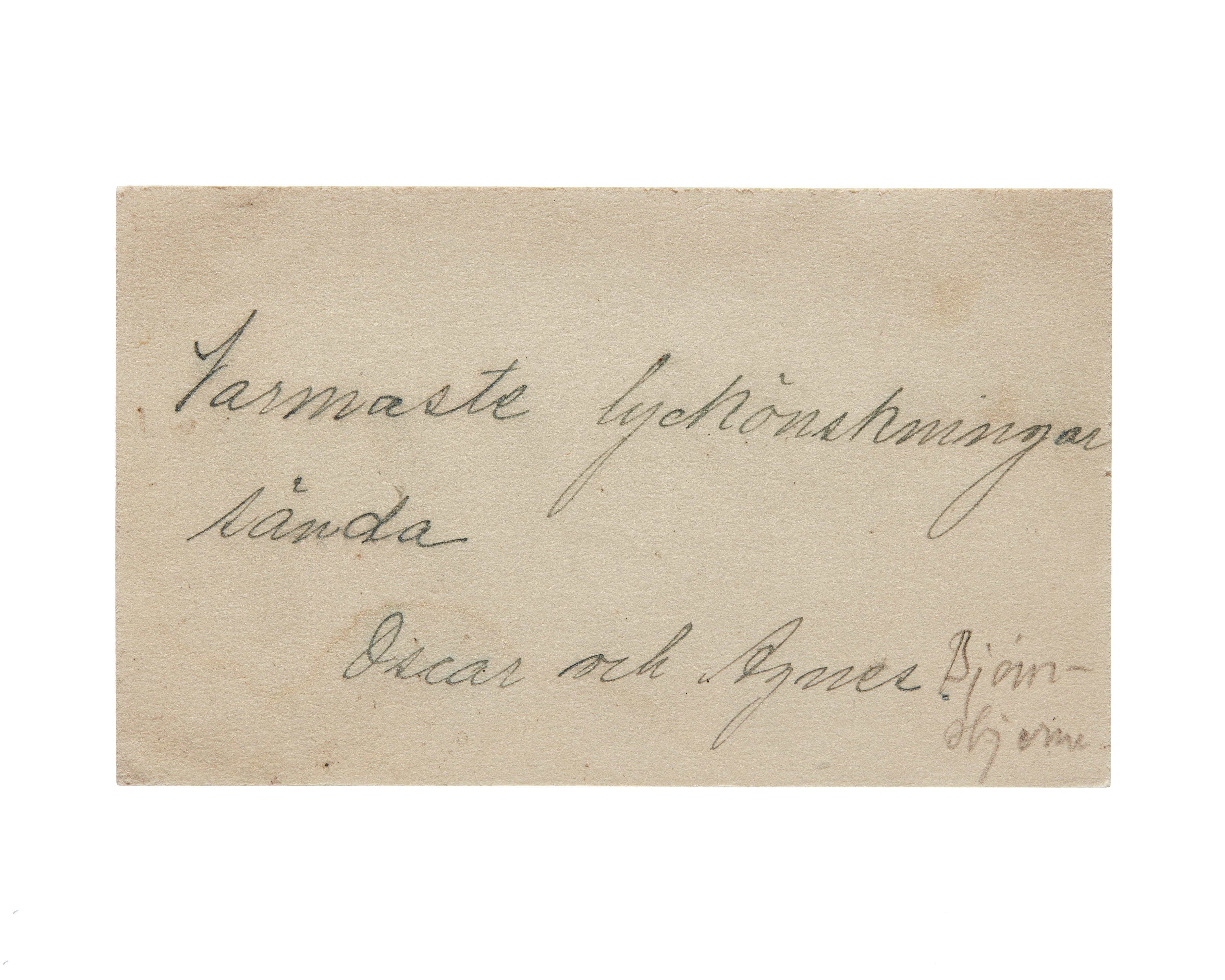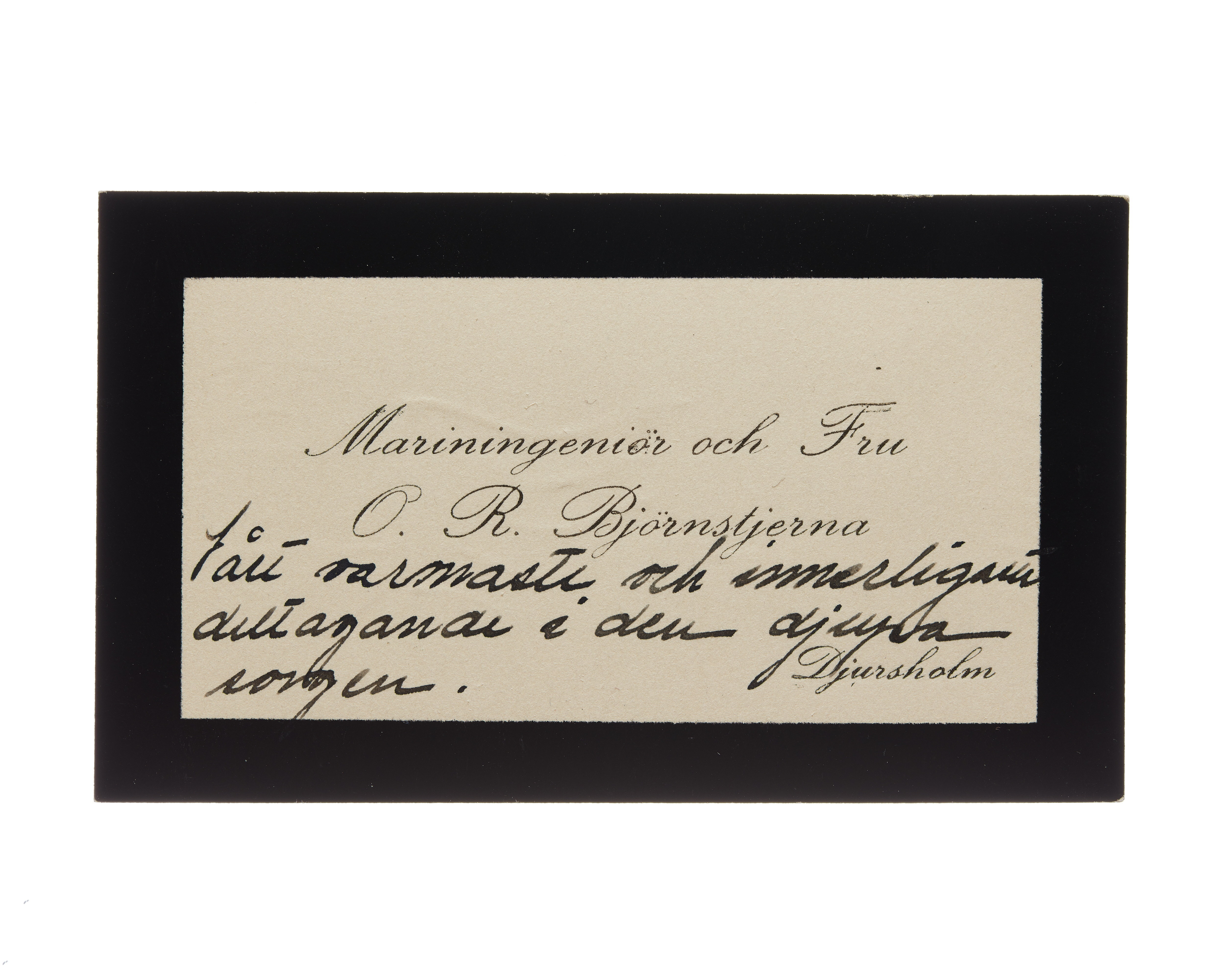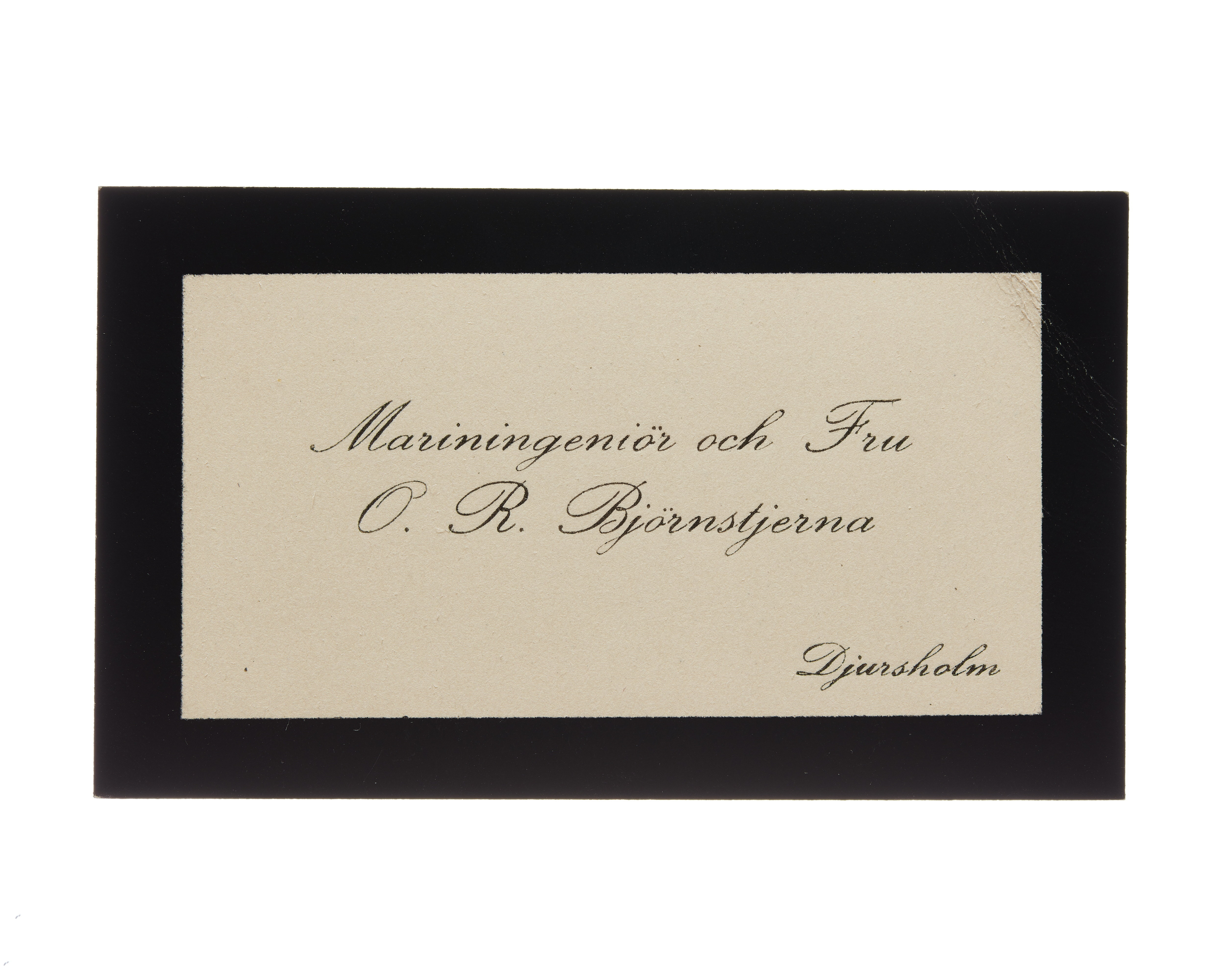 Elva visitkort från Mariningenjör Oscar Roger Magnus Theodor Björnstjerna och Fru Agnes Björnstjerna. Första kortet daterat 1.10.1919, Handskrift "Varmaste lyckönskningar sända, Oscar och Agnes Björnstjerna". Andra kortet daterat 1919, adress (nedra kortet) Björnsäter, Odinvägen, Djursholm, Sveavägen, vikt i övre högra hörnet. Tredje kortet daterat 1920, vikt i övre högra hörnet, Adress (nedre högra hörnet) Djursholm samt sorgkant. Fjärde kortet daterat 1921, sorgkant, handskrift (nedanför namnet). Femte kortet daterat 1924. Sjätte kortet är utan datum, vikt i övre högra hörnet. Sjunde kortet daterat 1921, vikt i övre högra hörnet. Åttonde kortet daterat 1922, vikt i övre högra hörnet. Nionde kortet daterat 1923, vikt i övre högra hörnet. Tionde kortet daterat 1925, sorgkant, vikt i övre högra hörnet. Elfte kortet daterat 1927, vikt i övre högra hörnet.