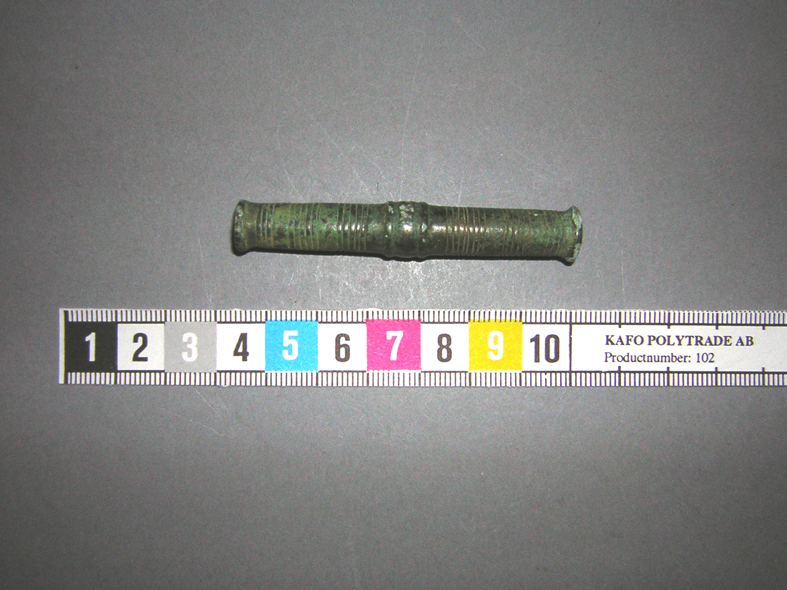 Rör av brons, trind och med runt hål. Utsidan är ornerad med upphöjda ränder och med grupper av fina, fördjupade linjer.