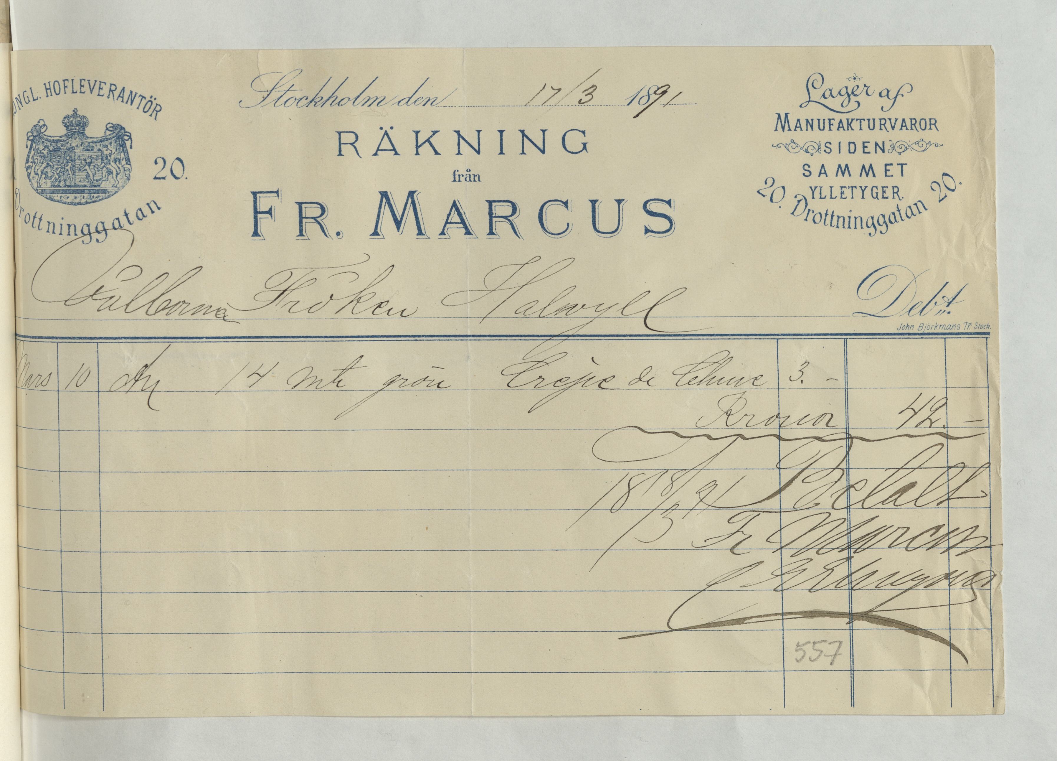 Kvitto från Fr. Marcus, Manufakturvaror siden, sammet och ylletyg, på 42Kr. Betald och kvitterad, Stockholm 17 mars 1891.