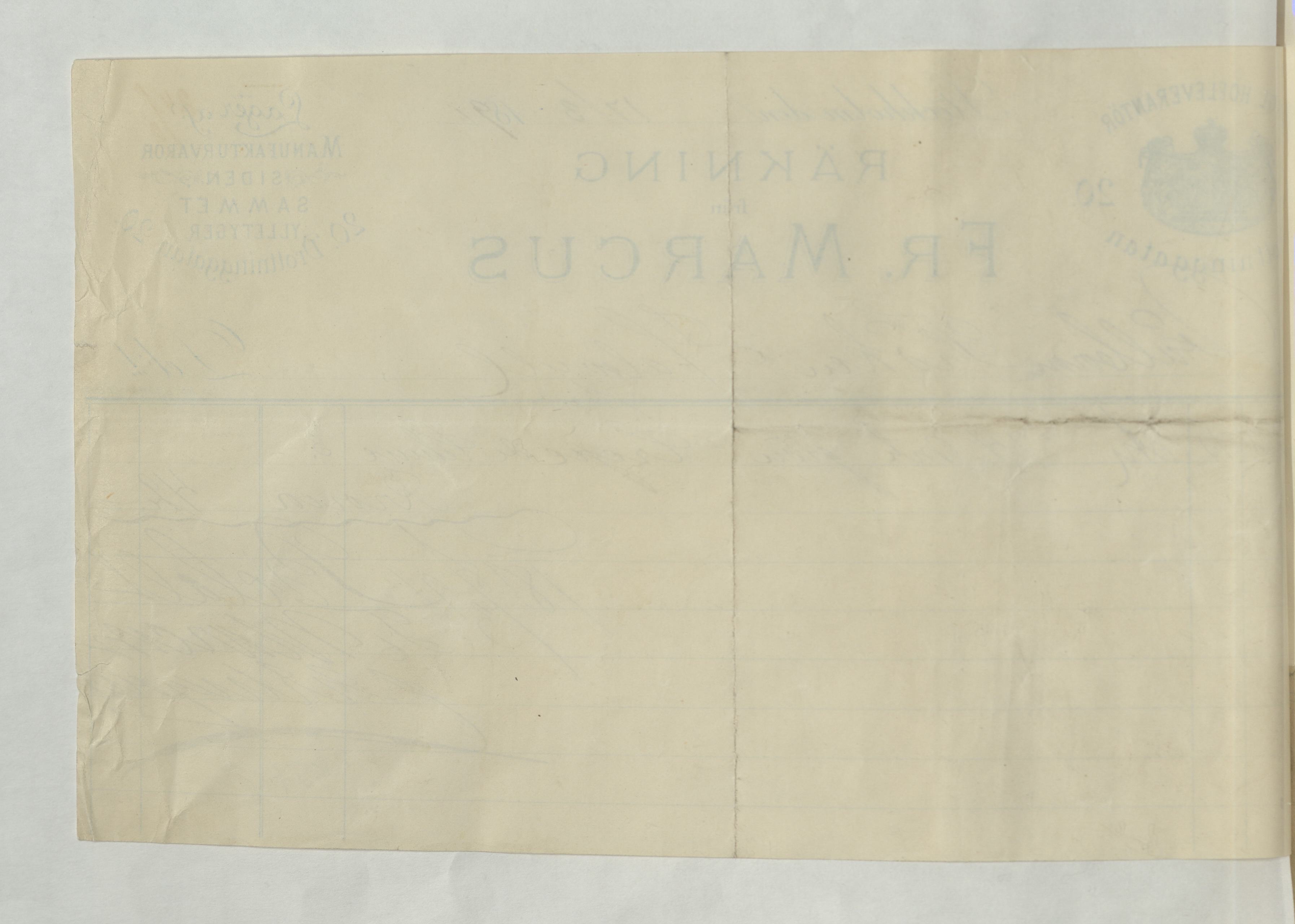 Kvitto från Fr. Marcus, Manufakturvaror siden, sammet och ylletyg, 1891